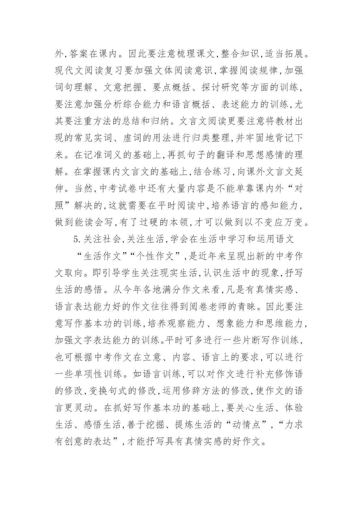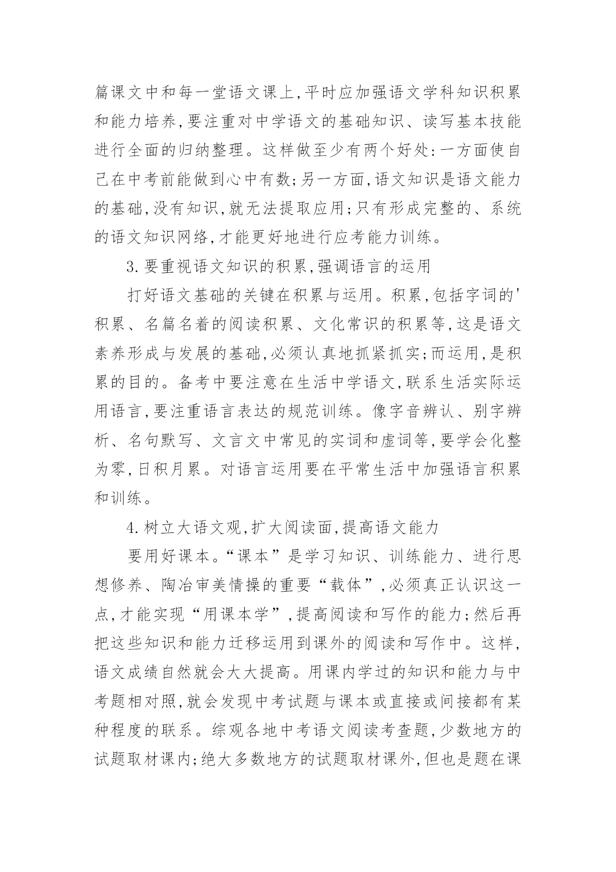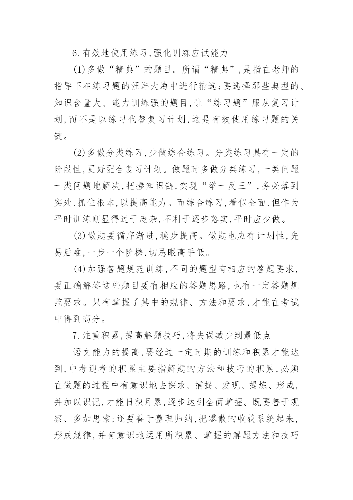 中考语文复习的备考建议09年中考语文复习备考建议每年教育部都要对各地中考试题进行分析评价,一方面加强了对各地中考试卷命题的指导,另一方面也加强了交流,使各地中考命题互相借鉴,共同提高,相信2009年的各地的中考命题将在2008年中考试卷的基础上“稳中求新、稳中求变、稳中求进”,不断完善,进一步贯彻“国家课程标准”的精神,积极有力推动新课程改革和语文教学改革。通过对2008年各地中考语文试题的分析,我们在2009年中考语文备考过程中,值得注意以下几个问题:1.进一步认真学习课程标准和各地中考命题说明,做到备考有的放矢《中考考试说明》源于《课程标准》。《教学大纲》是编写课本、学习、考试、评价的“法规”,《中考考试说明》又从考试的角度作了一些规定。中考命题是遵纲守本的,必须逐步学习,明晰、准确地把握中考语文考试的范围和内容,减少盲目性。中考试卷的总体布局已基本趋于稳定,各个试题的测试目标、立意、设问角度以及答案、评分标准等等,都是专家们精心设计的。一份中考试卷涉及教学观念、教学方法、学习要点、学习方法以及测量评价等诸多领域,犹如一座“微缩景园”,值得我们认真地加以研究。2.学会分类整理,形成科学的知识网络语文学科不同其他学科,我们所学的知识都散见于每一篇课文中和每一堂语文课上,平时应加强语文学科知识积累和能力培养,要注重对中学语文的基础知识、读写基本技能进行全面的归纳整理。这样做至少有两个好处:一方面使自己在中考前能做到心中有数;另一方面,语文知识是语文能力的基础,没有知识,就无法提取应用;只有形成完整的、系统的语文知识网络,才能更好地进行应考能力训练。3.要重视语文知识的积累,强调语言的运用打好语文基础的关键在积累与运用。积累,包括字词的'积累、名篇名着的阅读积累、文化常识的积累等,这是语文素养形成与发展的基础,必须认真地抓紧抓实;而运用,是积累的目的。备考中要注意在生活中学语文,联系生活实际运用语言,要注重语言表达的规范训练。像字音辨认、别字辨析、名句默写、文言文中常见的实词和虚词等,要学会化整为零,日积月累。对语言运用要在平常生活中加强语言积累和训练。4.树立大语文观,扩大阅读面,提高语文能力要用好课本。“课本”是学习知识、训练能力、进行思想修养、陶冶审美情操的重要“载体”,必须真正认识这一点,才能实现“用课本学”,提高阅读和写作的能力;然后再把这些知识和能力迁移运用到课外的阅读和写作中。这样,语文成绩自然就会大大提高。用课内学过的知识和能力与中考题相对照,就会发现中考试题与课本或直接或间接都有某种程度的联系。综观各地中考语文阅读考查题,少数地方的试题取材课内;绝大多数地方的试题取材课外,但也是题在课外,答案在课内。因此要注意梳理课文,整合知识,适当拓展。现代文阅读复习要加强文体阅读意识,掌握阅读规律,加强词句理解、文意把握、要点概括、探讨研究等方面的训练,要注意加强分析综合能力和语言概括、表述能力的训练,尤其要注重方法的总结和归纳。文言文阅读更要注意将教材出现的常见实词、虚词的用法进行归类整理,并牢固地背记下来。在记准词义的基础上,再抓句子的翻译和思想感情的理解。在掌握课内文言文的基础上,结合练习,向课外文言文延伸。当然,中考试卷中还有大量内容是不能单靠课内外“对照”解决的,这就需要在平时阅读中,培养语言的感知能力,做到能读会写,有了过硬的本领,才可以做到以不变应万变。5.关注社会,关注生活,学会在生活中学习和运用语文“生活作文”“个性作文”,是近年来呈现出新的中考作文取向。即引导学生关注现实生活,认识生活中的现象,抒写生活的感悟。从今年各地满分作文来看,凡是有真情实感、语言表达能力好的作文往往得到阅卷老师的青睐。因此要注意写作基本功的训练,培养观察能力、想象能力和思维能力,加强文字表达能力的训练。平时可多进行一些片断写作训练,也可根据中考作文在立意、内容、语言上的要求,可以进行一些单项性训练。如语言训练,可以对作文进行补充修饰语的修改,变换句式的修改,运用修辞方法的修改,使作文的语言更灵动。在抓好写作基本功的基础上,要关心生活、体验生活、感悟生活,善于挖掘、提炼生活的“动情点”,“力求有创意的表达”,才能抒写具有真情实感的好作文。6.有效地使用练习,强化训练应试能力(1)多做“精典”的题目。所谓“精典”,是指在老师的指导下在练习题的汪洋大海中进行精选;要选择那些典型的、知识含量大、能力训练强的题目,让“练习题”服从复习计划,而不是以练习代替复习计划,这是有效使用练习题的关键。(2)多做分类练习,少做综合练习。分类练习具有一定的阶段性,更好配合复习计划。做题时多做分类练习,一类问题一类问题地解决,把握知识链,实现“举一反三”,务必落到实处,抓住根本,以提高能力。而综合练习,看似全面,但作为平时训练则显得过于庞杂,不利于逐