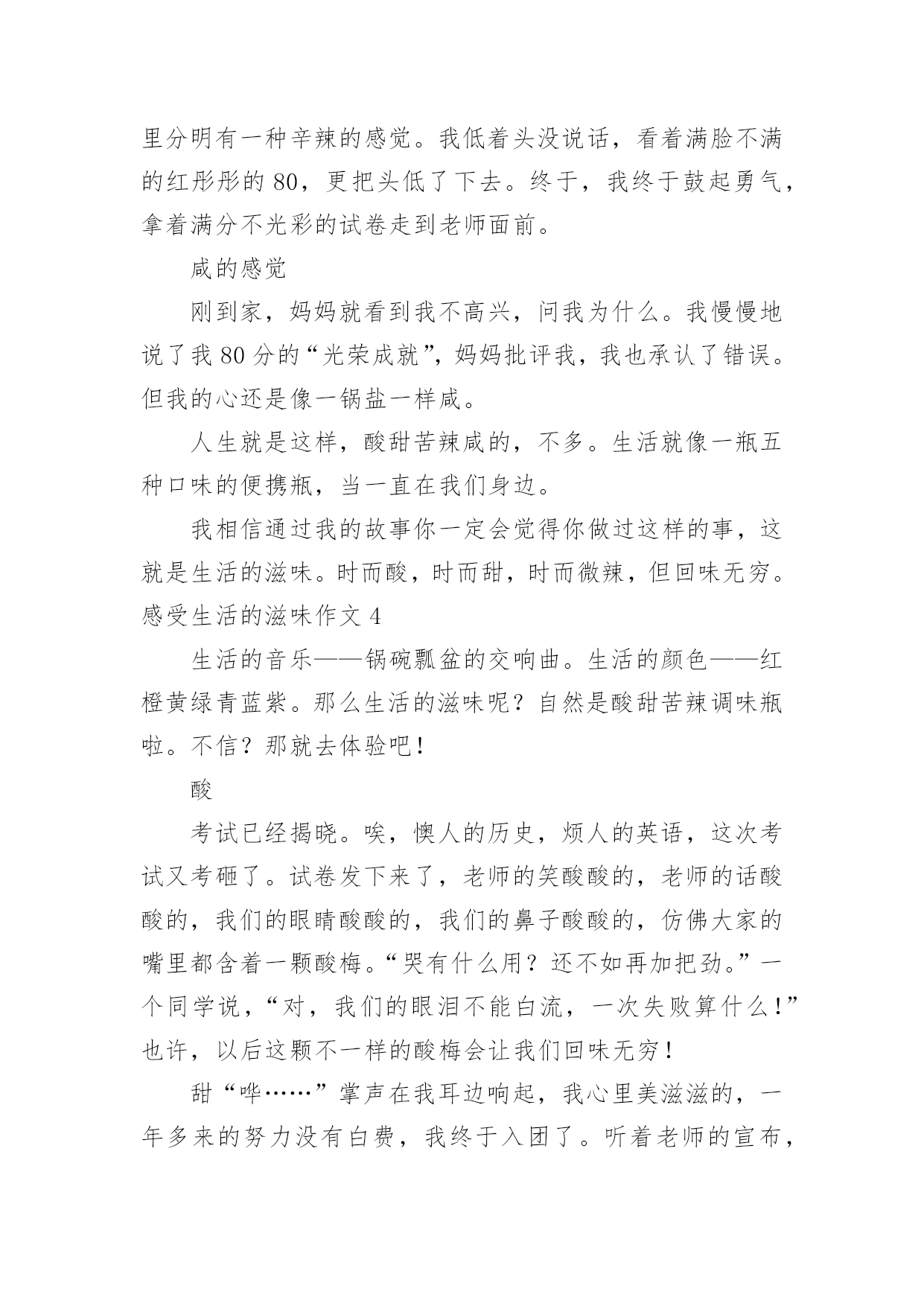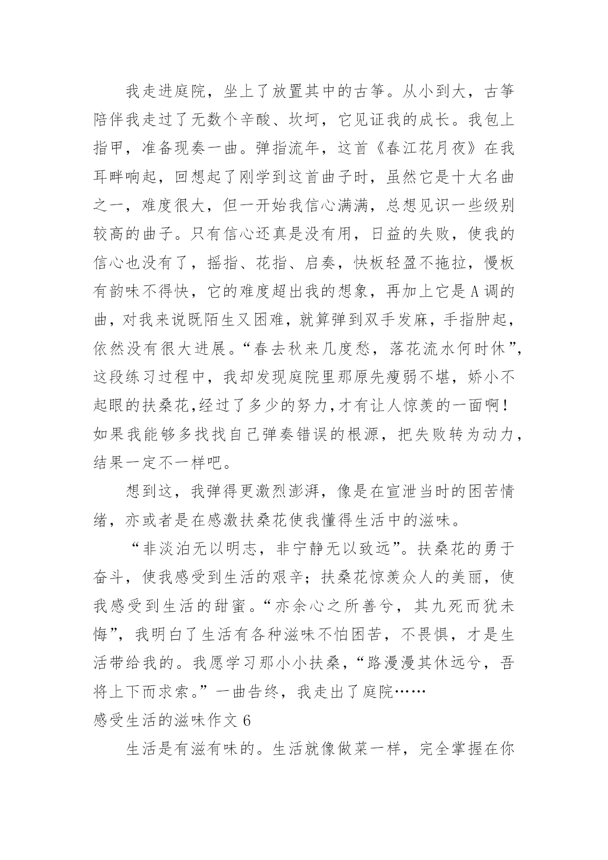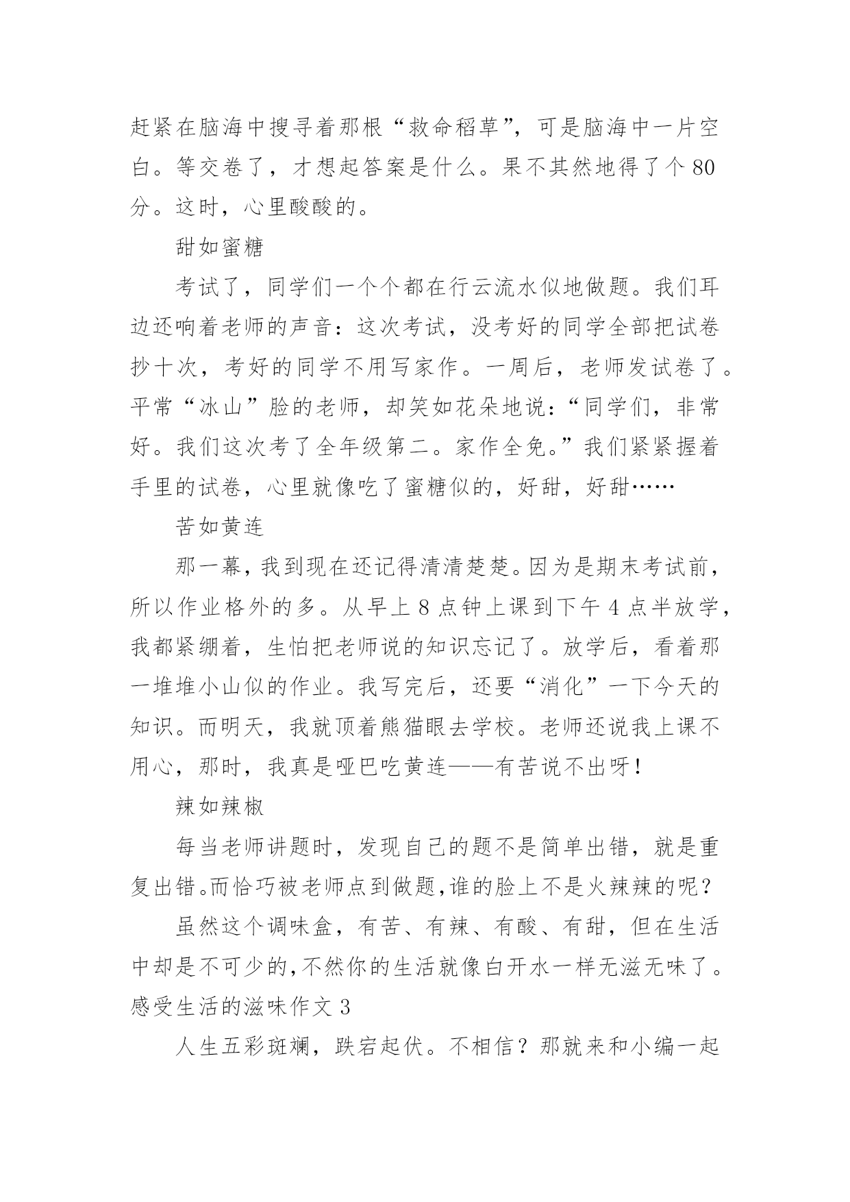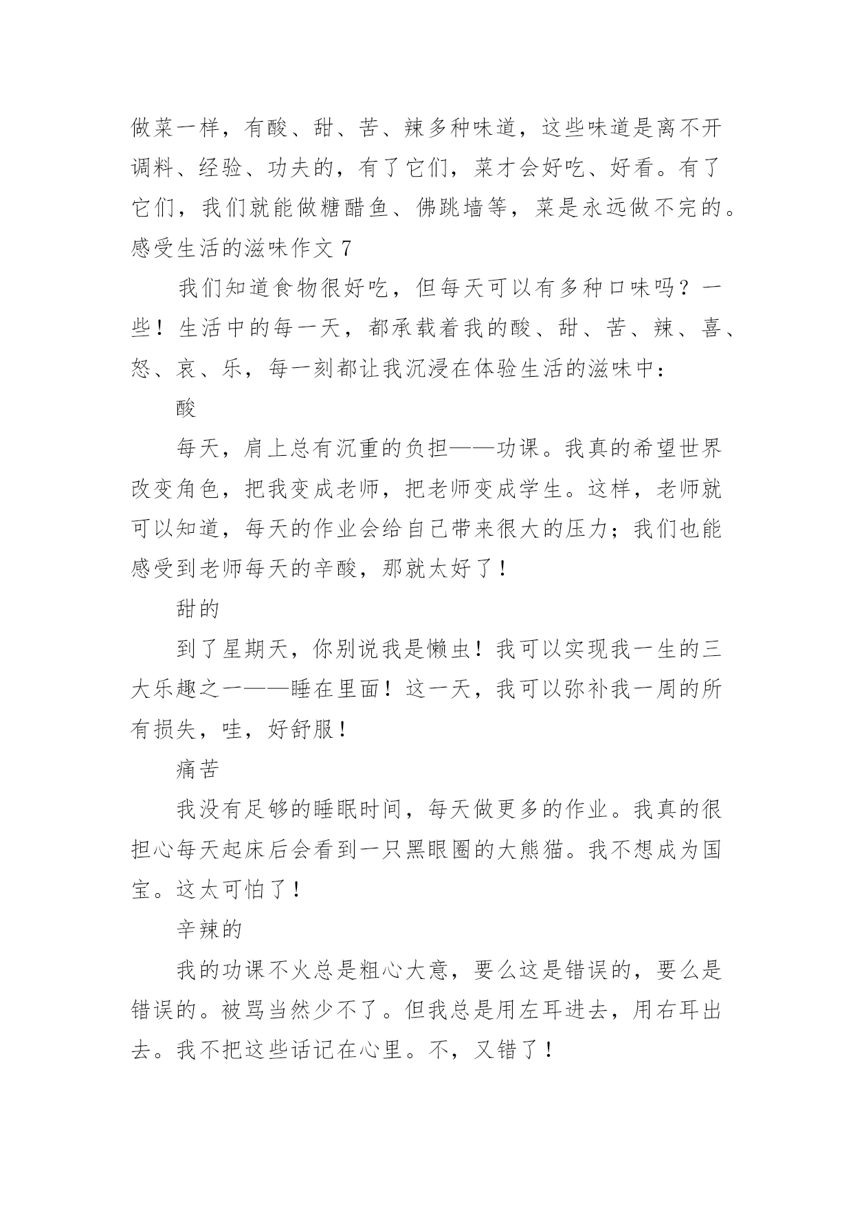感受生活的滋味作文感受生活的滋味作文(9篇)在学习、工作乃至生活中,许多人都写过作文吧,作文是人们以书面形式表情达意的言语活动。作文的注意事项有许多,你确定会写吗?下面是小编为大家收集的感受生活的滋味作文,希望对大家有所帮助。感受生活的滋味作文1“问渠哪得清如许?惟有源头活水来。”一句简简单单,但又意境丰富的诗句,让我体会到了读书奥秘与乐趣所在。读书的滋味是甜的。从小父母就给我讲很多童话故事,如《卖火柴的小女孩》、《皇帝的新装》等等。在我的记忆里,我童年是美好浪漫的,因为我生活在书的世界里。小时候读的第一本书是《钢铁是怎样炼成的》,当时因为我太小,还是不太理解书中所塑造的人物形象,只觉得保尔是个大英雄,大男子汉,每一次一翻开这本书就甜甜地哭了。读书的滋味真甜!读书的滋味是酸的。小时候读得第二本书便是《红楼梦》了,我记得,每次读到它,都会鼻涕一把泪一把,为书中的人物所感动、悲伤,觉得她们太惨了,也感叹自己没有生活在那个大观园里。读书的滋味真酸!读书的滋味是辣的。小时候读的第三本书便是《骆驼祥子》。初读时,觉得祥子的人生好凄惨,从一个自食其力,强壮的青年人,经过一系列的人情变故,变成了一个没有人情味的行尸走肉,老舍先生神奇的笔下,生动地刻画了这一人物,批判现实社会,不给好人出路!读完后,我心觉得辣辣的,为什么现实社会总是那么不近人意!读书的感觉真辣!读书的滋味是咸的。小时候读的第四本书便是刘墉的《萤窗小语》,这本书让我读懂了,人生在世,挫折总是会有的,那就是要靠你去凭着自己的毅力去克服它,成为生活的勇者。书中的一个个小困难,就像是让我进行了一番激烈的冒险,品尝到了人生的滋味。读书的滋味真咸啊。读书的滋味或甜,或咸,或辣,或酸,因为有了这些味道,才使得我们的读书充满了快乐与幸福。也希望自己能够通过这么多滋味,真正能达到“会当凌绝顶,一览众山小”的境界!这就是我的读书滋味。感受生活的滋味作文2生活的滋味就像调味盒,有酸、有甜、有苦、有辣,让我们在生活中过得有滋有味,在成长的道路留下一件件难忘的脚印。今天,我来分享一下我成长道路上的脚印吧!酸如柠檬说起酸的滋味,相信在座的同学肯定不陌生吧。还记得有一次考试时,题正是我之前复习时看过的一道阅读题。我赶紧在脑海中搜寻着那根“救命稻草”,可是脑海中一片空白。等交卷了,才想起答案是什么。果不其然地得了个80分。这时,心里酸酸的。甜如蜜糖考试了,同学们一个个都在行云流水似地做题。我们耳边还响着老师的声音:这次考试,没考好的同学全部把试卷抄十次,考好的同学不用写家作。一周后,老师发试卷了。平常“冰山”脸的老师,却笑如花朵地说:“同学们,非常好。我们这次考了全年级第二。家作全免。”我们紧紧握着手里的试卷,心里就像吃了蜜糖似的,好甜,好甜……苦如黄连那一幕,我到现在还记得清清楚楚。因为是期末考试前,所以作业格外的多。从早上8点钟上课到下午4点半放学,我都紧绷着,生怕把老师说的知识忘记了。放学后,看着那一堆堆小山似的作业。我写完后,还要“消化”一下今天的知识。而明天,我就顶着熊猫眼去学校。老师还说我上课不用心,那时,我真是哑巴吃黄连——有苦说不出呀!辣如辣椒每当老师讲题时,发现自己的题不是简单出错,就是重复出错。而恰巧被老师点到做题,谁的脸上不是火辣辣的呢?虽然这个调味盒,有苦、有辣、有酸、有甜,但在生活中却是不可少的,不然你的生活就像白开水一样无滋无味了。感受生活的滋味作文3人生五彩斑斓,跌宕起伏。不相信?那就来和小编一起体验吧!感觉酸唉,又是这个讨厌的数学练习。我挠了挠头皮,沉浸在写作中。啊!我不小心把“5”写成了“3”,我该怎么办?怎么办——我向铅笔盒姐姐伸出手,准备向胶带哥求助。啊!如果我不带怎么办?怎么做?我用手臂刺伤了同一个人,他听懂了我的“哑语”并借给了我。唉,没有东西真的很难处理。我心里酸酸的,下定决心要摆脱这个坏毛病。甜蜜的喜悦一天,我刚开始数学课,老师说:“现在我把早考的数学计算卷发过来,大家一定要认真改正错误。”听完这话,二愣了愣,心想:这次考试考不好怎么办?我应该再次受到批评。当同学把试卷递到我手上时,我吓得连眼睛都闭上了,但我睁开眼睛一个缝隙,眼底印的是一个鲜红的100,我高兴得差点跳了起来。醒来。可惜,这是一堂课,但我的心却像吃蜜一样甜。苦涩的味道有甜味,当然少不了苦味。学习和生活的味道都是苦的。周五下午,老师布置了很多作业:4个好词好句,第6课语文课外作业,数学卷子,英语课外作业练习题——真是苦啊!这一天什么时候结束!麻辣体验今天我们又参加了数学考试。下午刚发完试卷,刚听完,“哇,考的真好!”我就知道是同一个陈泽磊在嘲讽我,话里分明有一种辛辣的感觉。我低着头没说话,看着满脸不满的红彤彤的80,更把头低了下去。终于,我终于鼓起勇气,拿着满分不光彩的试卷走到老师面前。咸的感觉