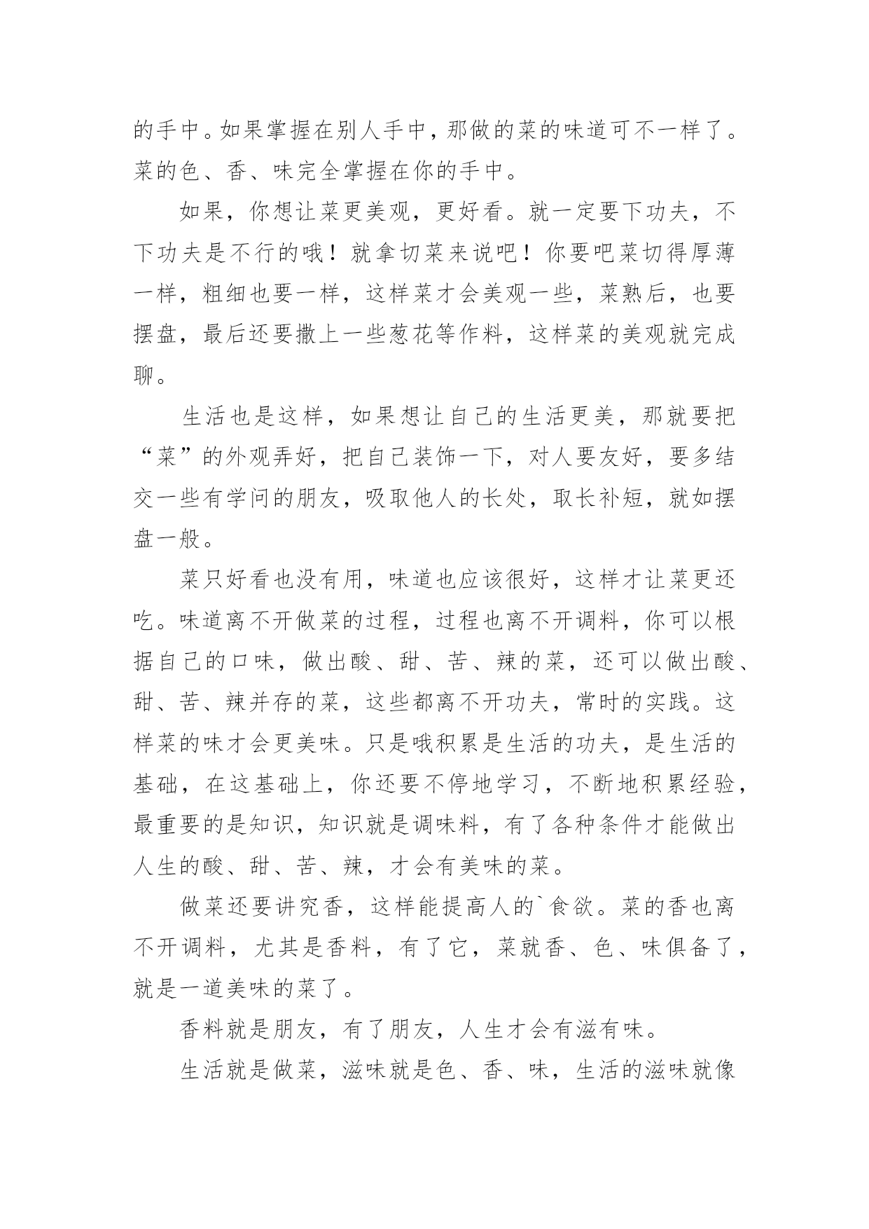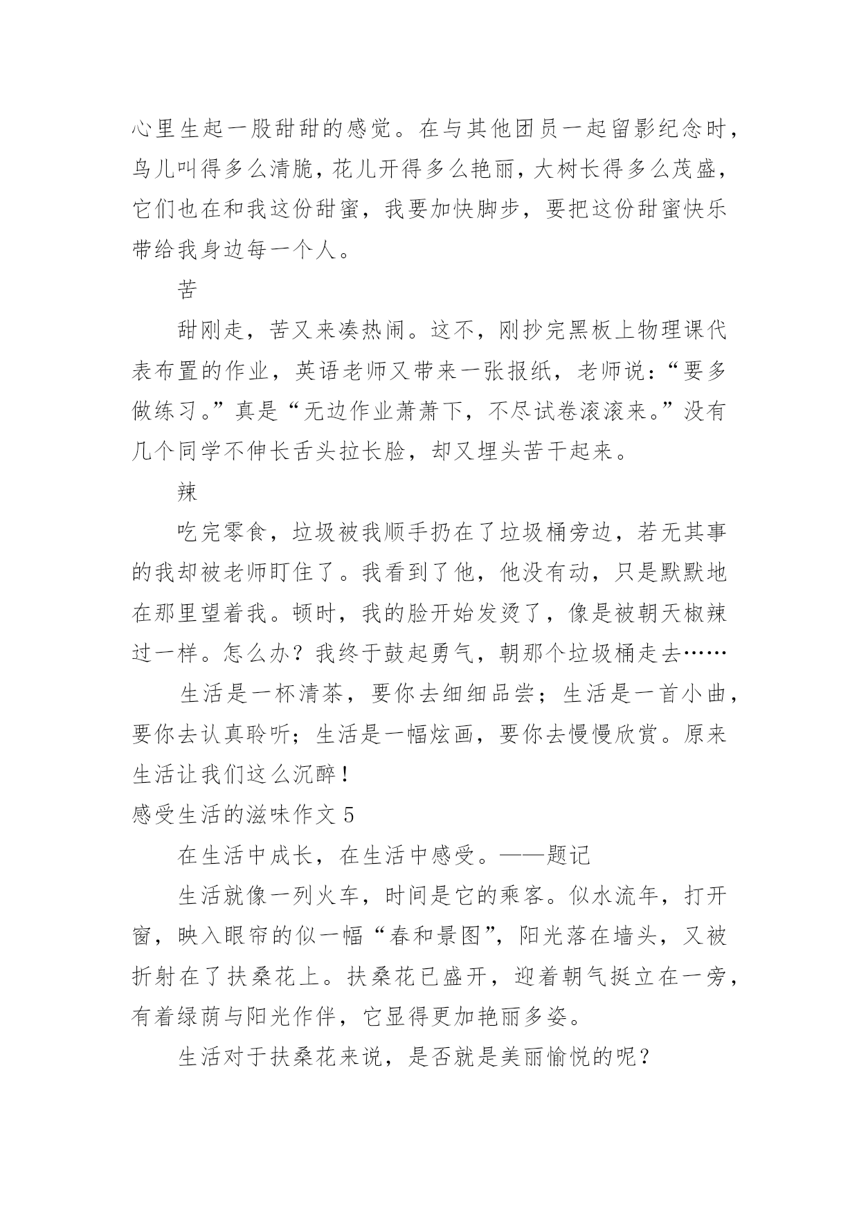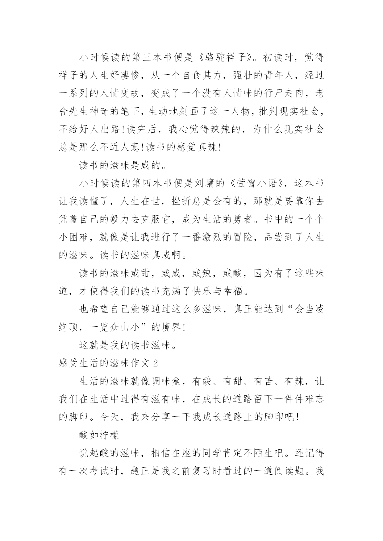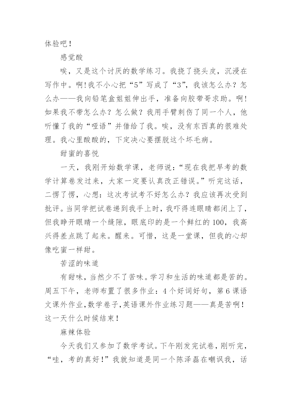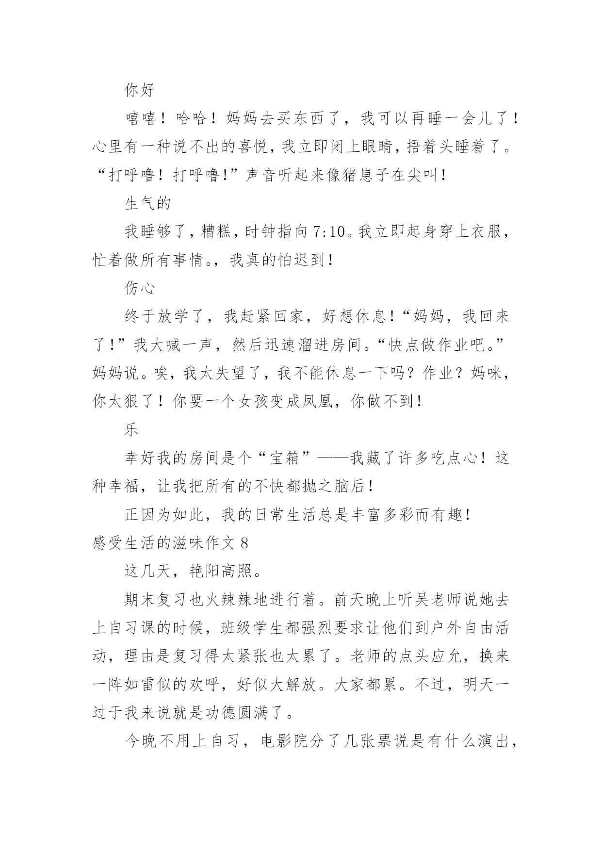 感受生活的滋味作文感受生活的滋味作文(9篇)在学习、工作乃至生活中,许多人都写过作文吧,作文是人们以书面形式表情达意的言语活动。作文的注意事项有许多,你确定会写吗?下面是小编为大家收集的感受生活的滋味作文,希望对大家有所帮助。感受生活的滋味作文1“问渠哪得清如许?惟有源头活水来。”一句简简单单,但又意境丰富的诗句,让我体会到了读书奥秘与乐趣所在。读书的滋味是甜的。从小父母就给我讲很多童话故事,如《卖火柴的小女孩》、《皇帝的新装》等等。在我的记忆里,我童年是美好浪漫的,因为我生活在书的世界里。小时候读的第一本书是《钢铁是怎样炼成的》,当时因为我太小,还是不太理解书中所塑造的人物形象,只觉得保尔是个大英雄,大男子汉,每一次一翻开这本书就甜甜地哭了。读书的滋味真甜!读书的滋味是酸的。小时候读得第二本书便是《红楼梦》了,我记得,每次读到它,都会鼻涕一把泪一把,为书中的人物所感动、悲伤,觉得她们太惨了,也感叹自己没有生活在那个大观园里。读书的滋味真酸!读书的滋味是辣的。小时候读的第三本书便是《骆驼祥子》。初读时,觉得祥子的人生好凄惨,从一个自食其力,强壮的青年人,经过一系列的人情变故,变成了一个没有人情味的行尸走肉,老舍先生神奇的笔下,生动地刻画了这一人物,批判现实社会,不给好人出路!读完后,我心觉得辣辣的,为什么现实社会总是那么不近人意!读书的感觉真辣!读书的滋味是咸的。小时候读的第四本书便是刘墉的《萤窗小语》,这本书让我读懂了,人生在世,挫折总是会有的,那就是要靠你去凭着自己的毅力去克服它,成为生活的勇者。书中的一个个小困难,就像是让我进行了一番激烈的冒险,品尝到了人生的滋味。读书的滋味真咸啊。读书的滋味或甜,或咸,或辣,或酸,因为有了这些味道,才使得我们的读书充满了快乐与幸福。也希望自己能够通过这么多滋味,真正能达到“会当凌绝顶,一览众山小”的境界!这就是我的读书滋味。感受生活的滋味作文2生活的滋味就像调味盒,有酸、有甜、有苦、有辣,让我们在生活中过得有滋有味,在成长的道路留下一件件难忘的脚印。今天,我来分享一下我成长道路上的脚印吧!酸如柠檬说起酸的滋味,相信在座的同学肯定不陌生吧。还记得有一次考试时,题正是我之前复习时看过的一道阅读题。我赶紧在脑海中搜寻着那根“救命稻草”,可是脑海中一片空白。等交卷了,才想起答案是什么。果不其然地得了个80分。这时,心里酸酸的。甜如蜜糖考试了,同学们一个个都在行云流水似地做题。我们耳边还响着老师的声音:这次考试,没考好的同学全部把试卷抄十次,考好的同学不用写家作。一周后,老师发试卷了。平常“冰山”脸的老师,却笑如花朵地说:“同学们,非常好。我们这次考了全年级第二。家作全免。”我们紧紧握着手里的试卷,心里就像吃了蜜糖似的,好甜,好甜……苦如黄连那一幕,我到现在还记得清清楚楚。因为是期末考试前,所以作业格外的多。从早上8点钟上课到下午4点半放学,我都紧绷着,生怕把老师说的知识忘记了。放学后,看着那一堆堆小山似的作业。我写完后,还要“消化”一下今天的知识。而明天,我就顶着熊猫眼去学校。老师还说我上课不用心,那时,我真是哑巴吃黄连——有苦说不出呀!辣如辣椒每当老师讲题时,发现自己的题不是简单出错,就是重复出错。而恰巧被老师点到做题,谁的脸上不是火辣辣的呢?虽然这个调味盒,有苦、有辣、有酸、有甜,但在生活中却是不可少的,不然你的生活就像白开水一样无滋无味了。感受生活的滋味作文3人生五彩斑斓,跌宕起伏。不相信?那就来和小编一起体验吧!感觉酸唉,又是这个讨厌的数学练习。我挠了挠头皮,沉浸在写作中。啊!我不小心把“5”写成了“3”,我该怎么办?怎么办——我向铅笔盒姐姐伸出手,准备向胶带哥求助。啊!如果我不带怎么办?怎么做?我用手臂刺伤了同一个人,他听懂了我的“哑语”并借给了我。唉,没有东西真的很难处理。我心里酸酸的,下定决心要摆脱这个坏毛病。甜蜜的喜悦一天,我刚开始数学课,老师说:“现在我把早考的数学计算卷发过来,大家一定要认真改正错误。”听完这话,二愣了愣,心想:这次考试考不好怎么办?我应该再次受到批评。当同学把试卷递到我手上时,我吓得连眼睛都闭上了,但我睁开眼睛一个缝隙,眼底印的是一个鲜红的100,我高兴得差点跳了起来。醒来。可惜,这是一堂课,但我的心却像吃蜜一样甜。苦涩的味道有甜味,当然少不了苦味。学习和生活的味道都是苦的。周五下午,老师布置了很多作业:4个好词好句,第6课语文课外作业,数学卷子,英语课外作业练习题——真是苦啊!这一天什么时候结束!麻辣体验今天我们又参加了数学考试。下午刚发完试卷,刚听完,“哇,考的真好!”我就知道是同一个陈泽磊在嘲讽我,话里分明有一种辛辣的感觉。我低着头没说话,看着满脸不满的红彤彤的80,更把头低了下去。终于,我终于鼓起勇气,拿着满分不光彩的试卷走到老师面前。咸的感觉
