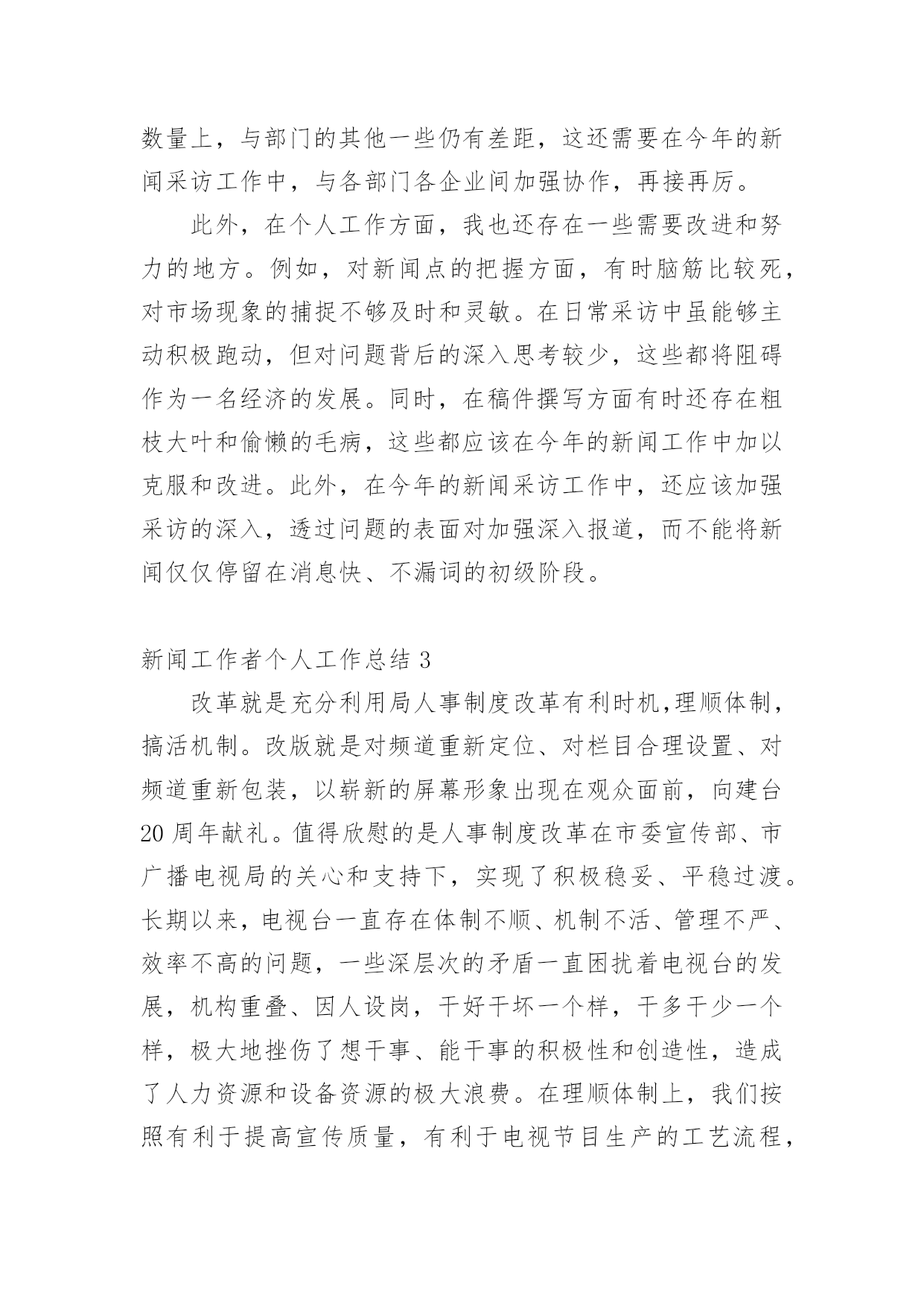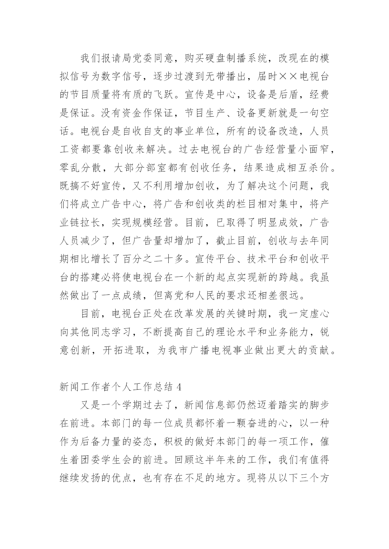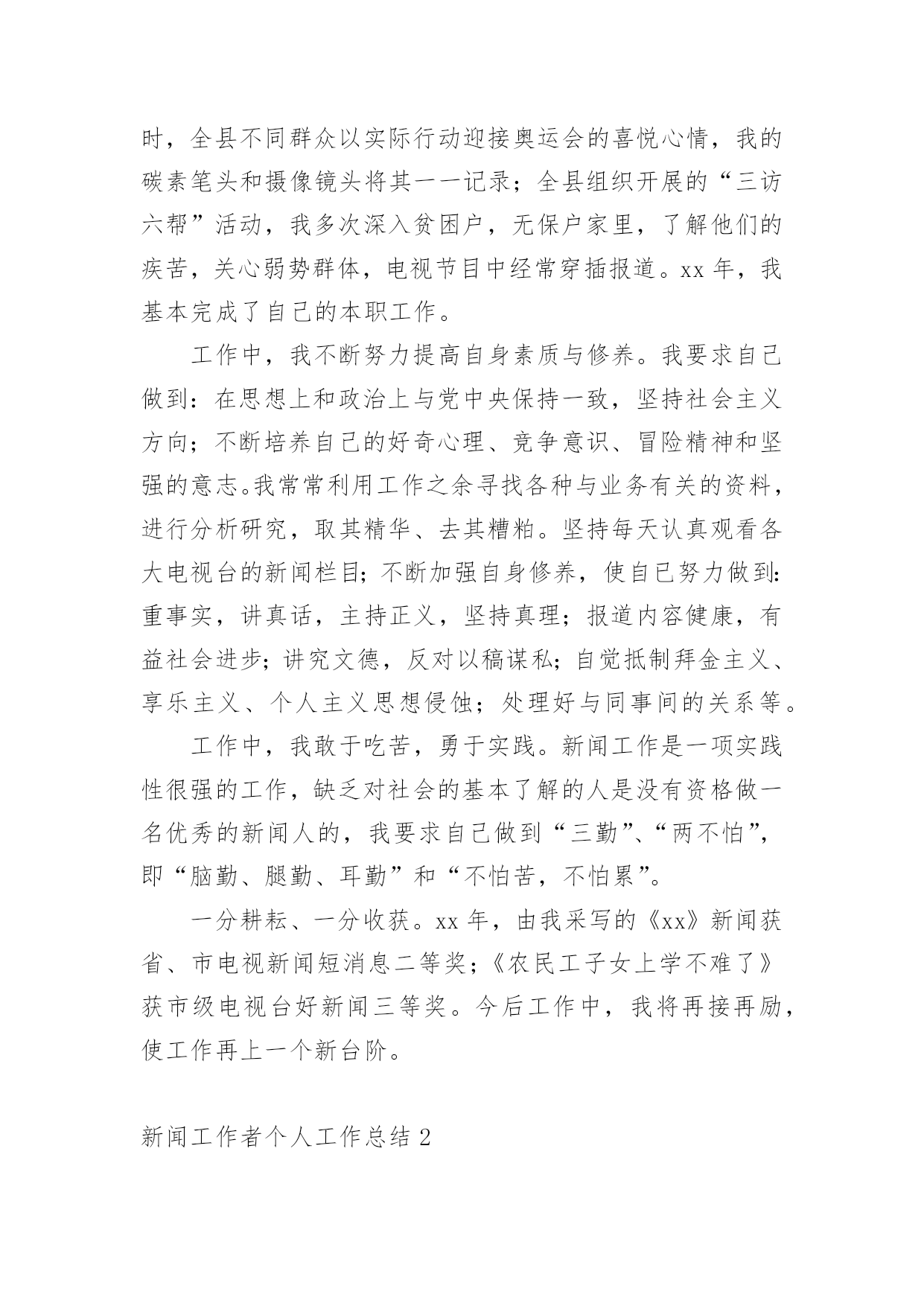 新闻工作者个人工作总结新闻工作者个人工作总结6篇总结是对某一阶段的工作、学习或思想中的经验或情况进行分析研究的书面材料,它是增长才干的一种好办法,因此,让我们写一份总结吧。总结你想好怎么写了吗?以下是小编整理的新闻工作者个人工作总结,仅供参考,大家一起来看看吧。新闻工作者个人工作总结1光阴荏苒,日月如梭,转眼间,我已是有三年半实战经验的“老新闻记者”啦,怎么是“老记者”呢,说实话,我一开始就知道记者的职业很辛苦,怕自己会坚持不下去,没想到:自己却在三年多的职业生涯中会这么顺利地走过来,并且走得还算“漂亮”。我分析了一下原因,首先与各位领导和同事们的帮助是分不开的;其次,自己目前也初步具备了作为一名记者该有的敢于吃苦,勇于实践,和不断学习提高的基本素质。xx年是国家比较坎坷艰难的一年,但却是我极速成长的一年。南方的冰雪灾害,汶川大地震,金融危机全球漫延等,时时牵动着全国人民的心,也触动着我思想的最深处,“作为新闻记者的我能干些什么呢?”“众志成城,支援灾区”“坚定信心,迎难而上”等一系列新闻小专题出自我手;奥运会时,全县不同群众以实际行动迎接奥运会的喜悦心情,我的碳素笔头和摄像镜头将其一一记录;全县组织开展的“三访六帮”活动,我多次深入贫困户,无保户家里,了解他们的疾苦,关心弱势群体,电视节目中经常穿插报道。xx年,我基本完成了自己的本职工作。工作中,我不断努力提高自身素质与修养。我要求自己做到:在思想上和政治上与党中央保持一致,坚持社会主义方向;不断培养自己的好奇心理、竞争意识、冒险精神和坚强的意志。我常常利用工作之余寻找各种与业务有关的资料,进行分析研究,取其精华、去其糟粕。坚持每天认真观看各大电视台的新闻栏目;不断加强自身修养,使自已努力做到:重事实,讲真话,主持正义,坚持真理;报道内容健康,有益社会进步;讲究文德,反对以稿谋私;自觉抵制拜金主义、享乐主义、个人主义思想侵蚀;处理好与同事间的关系等。工作中,我敢于吃苦,勇于实践。新闻工作是一项实践性很强的工作,缺乏对社会的基本了解的人是没有资格做一名优秀的新闻人的,我要求自己做到“三勤”、“两不怕”,即“脑勤、腿勤、耳勤”和“不怕苦,不怕累”。一分耕耘、一分收获。xx年,由我采写的《xx》新闻获省、市电视新闻短消息二等奖;《农民工子女上学不难了》获市级电视台好新闻三等奖。今后工作中,我将再接再励,使工作再上一个新台阶。新闻工作者个人工作总结2自从从事新闻工作以来,时间转瞬即逝。尤其是在xx年的新闻报道中,时间更是过得特别快。回顾这一年的新闻工作,我个人可谓感受良多,既学到了很多新的知识和理念,也还感到仍有很多不足之处需要改进。在这一年中,我与的和领导们,共同经历了很多新闻事件的报道和活动的组织、策划以及落实,从中体会到了团队精神的重要性,尤其在领导的部署和指点下,完成了很多意义深远的新闻报道工作。在去年的4月份,天津首届“津洽会”期间,面对本市有历以来,规模最大,品牌阵容最强的展会,积极主动的参与到会展的前期报道和各项活动中去。从3月中旬就开始为“津洽会”的前期报道开辟专栏,本人在对“津洽会”的报道中也受益匪浅。据统计,快报经济部共在“津洽会”期间跟踪报道了2xxxx篇新闻,完整、真实的记载了“津洽会”的盛况和成果。并受到市商务委和报业集团领导的好评。此外,经济部还积极参与到“津洽会”的活动中去,与“津洽会”组委会共同主办了“城市.聚焦连锁加盟”以及“天津车展评选”等多个精彩的活动。真正做到关注事实、并参与事实。我本人也从中增强了组织能力和协调配合能力,并从中对报道大型活动新闻和现场纪实有了很多的体会,增强了写作能力,对新闻有了更深刻的了解。也正是报社给了我这样的参与和学习机会。在去年7月报社为增强版面可读性和新闻的力度,鼓舞的士气,在报社的各新闻部门中间开展了当日新闻的评选活动,充分调动了的积极性。在这次活动中,在领导的指教和策划下,我的几篇稿件也有幸获奖,但回顾获奖的经历却感慨万千。其中,狗不理在海外遭遇抢注的报道,功夫在于平日于口内的积极联系和多新闻的不懈追踪。而探秘商场假货内幕的稿件,获奖原因主要是能够生动、深刻的.挖掘行业内幕。该稿件报道后,也引起了市商业部门、市工商局等部门的高度重视。主管部门还特此对本市商业市场进行了更严格的强化管理。这我从中也体会到,作为一名与事实、新闻和服务社会中紧密而有益的联系。随后,我的又一篇报道,关于对本市商家向未成年人售酒的调查,也获得了好评。并且部门随后还专门开设了关注未成年人消费的专题报道。但在撰写这些新闻报道的同时,我也深刻的感受到部门领导和给予我的支持和帮助,因为受到个人能力的限制,在很多新闻报道中我也经常漏洞百出,有时还会犯错别字、语句不通等很低级的错误,如果没有领导和的把关,就不会有合格满意的报道。去年中秋节前夕,作