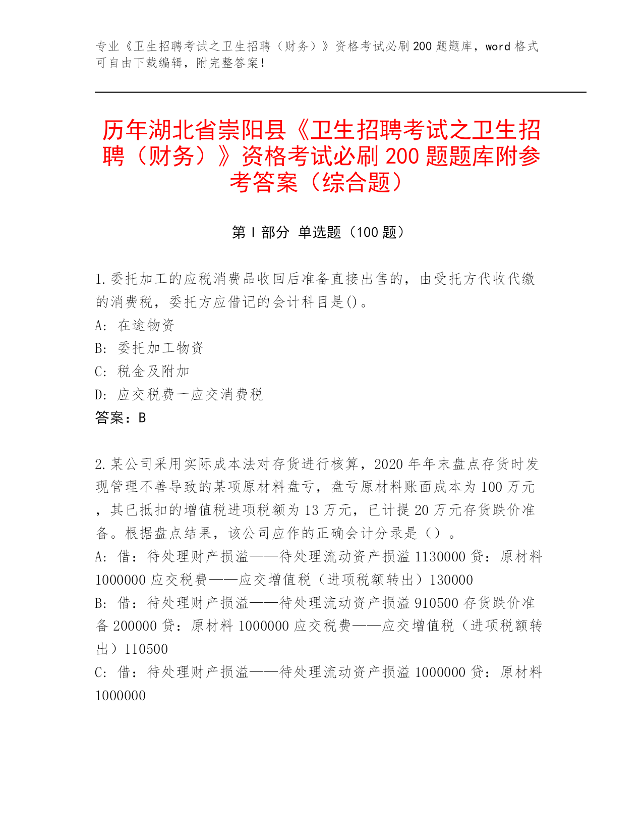 历年湖北省崇阳县《卫生招聘考试之卫生招聘(财务)》资格考试必刷200题题库附参考答案(综合题)