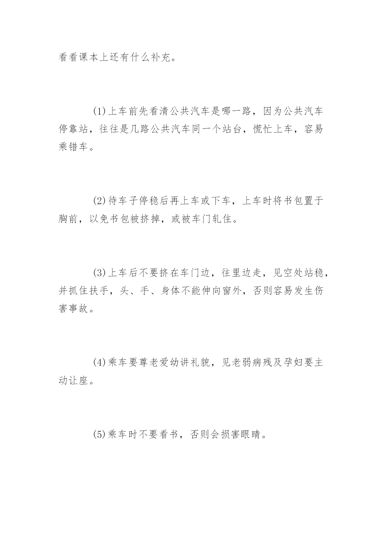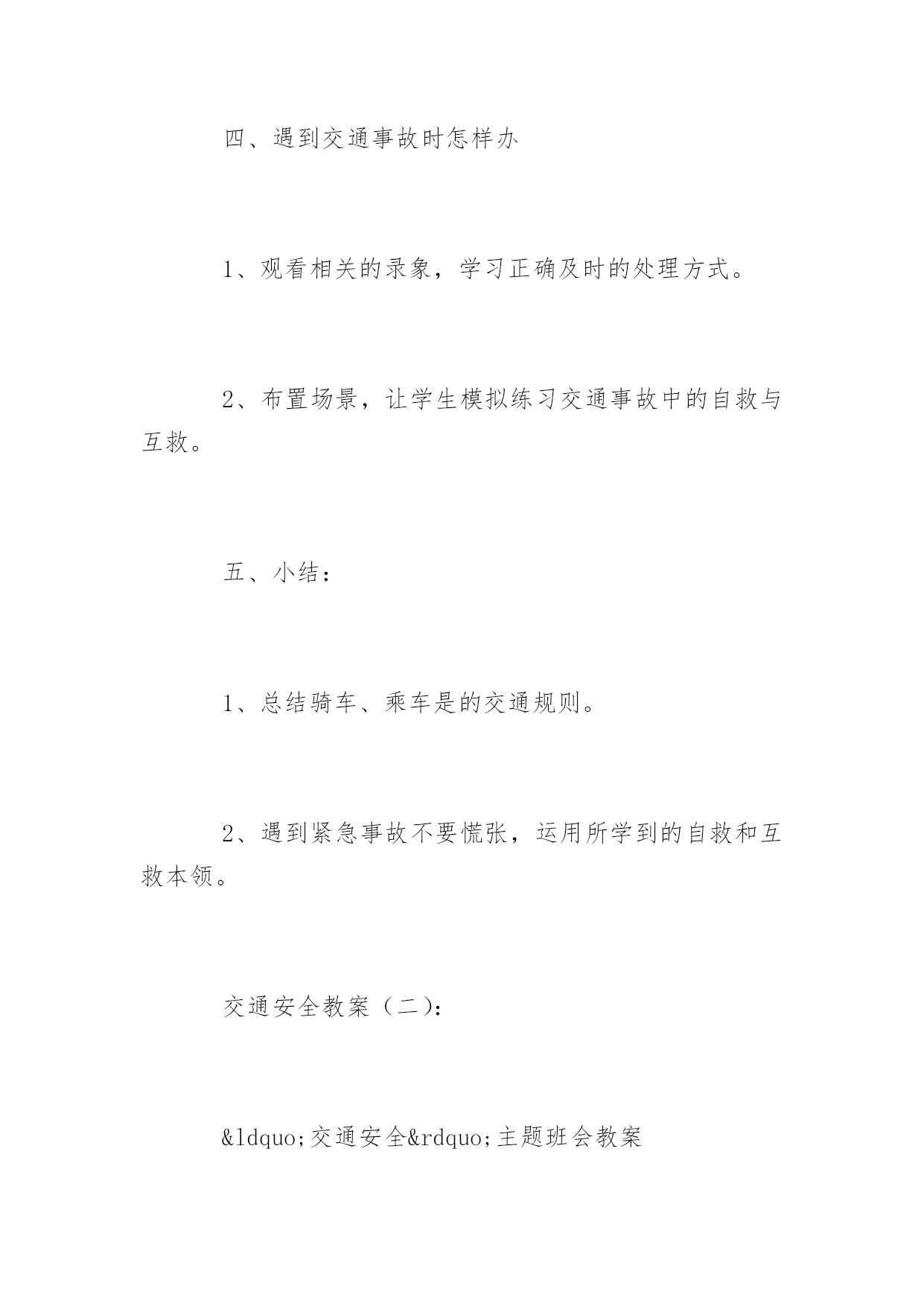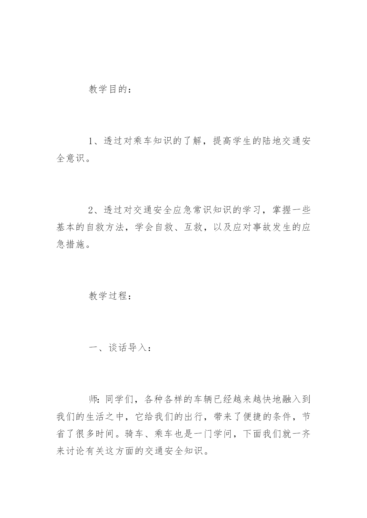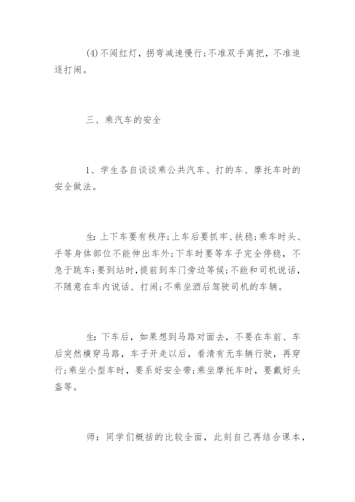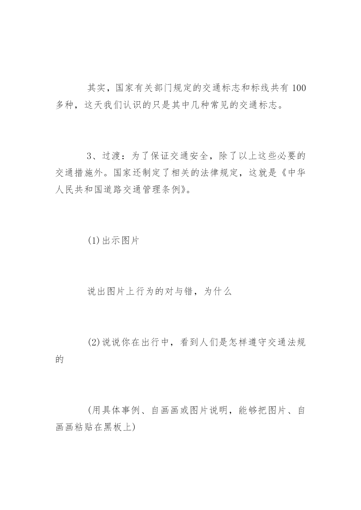 交通安全教案交通安全教案交通安全教案(一):第一课时交通法规安全教育教案教学目的:1、初步认识各种交通信号、标志和标线的作用2、懂得就应自觉遵守交通法规。安全教育教案教学过程:一、导入随着交通事业的发展,道路上的车辆越来越多,交通安全问题越来越受到人们的重视。这就要求我们每个人不断提高交通法制观念,增强交通公德意识。二、新课1、认识交通警察。(1)学生自读书。(2)出示图片。(3)学生看图说说:谁是交通安全的维护者你心目中的交通警察是什么样的形象教师补充:交通警察是国家维护交通秩序和安全的武装力量,他们是交通安全的维护者,不论严寒酷暑,他们都坚守岗位,指挥着来往的车辆和行人。只有服从交通警察的指挥,才会有良好的交通秩序,才能保证车辆和行人的安全。2、认识交通标志。(1)课前,老师让同学们在出行中观察道路边的各种交通标志,能说说你们观察到了什么吗(2)出示挂图,请学生指出图中的各种交通信号、标志、标线,并说出它的作用。(3)在我们日常的出行中,当看到这些交通信号、标志和标线时,就应怎样做(4)教师归纳其实,国家有关部门规定的交通标志和标线共有100多种,这天我们认识的只是其中几种常见的交通标志。3、过渡:为了保证交通安全,除了以上这些必要的交通措施外。国家还制定了相关的法律规定,这就是《中华人民共和国道路交通管理条例》。(1)出示图片说出图片上行为的对与错,为什么(2)说说你在出行中,看到人们是怎样遵守交通法规的(用具体事例、自画画或图片说明,能够把图片、自画画粘贴在黑板上)(3)请你对着图上的资料,说一句赞扬或警示的话。(4)怎样把我们这天认识的交通标志和交通法规让更多的人都明白老师提意:用我们搜集的材料制作一期《注意交通安全》的黑板报,向更多的老师和同学宣传有关交通安全的知识。三、课堂小结1、说说你记住了哪几种交通信号、标志和标线2、学习了交通法规和各种交通信号、标志后,检查自己,并写一条警示句。第二课时乘车的安全教学目的:1、透过对乘车知识的了解,提高学生的陆地交通安全意识。2、透过对交通安全应急常识知识的学习,掌握一些基本的自救方法,学会自救、互救,以及应对事故发生的应急措施。教学过程:一、谈话导入:师:同学们,各种各样的车辆已经越来越快地融入到我们的生活之中,它给我们的出行,带来了便捷的条件,节省了很多时间。骑车、乘车也是一门学问,下面我们就一齐来讨论有关这方面的交通安全知识。二、骑自行车就应遵守的规定1、请有骑自行车经验的学生交流。2、看书上的插图,决定对错。3、教师小结:(1)未满12岁的儿童不准在马路的慢行道上骑车。(2)自行车的铃、闸齐全并有效。(3)骑车时应靠右边慢行道行驶,人行道上不准骑自行车。(4)不闯红灯,拐弯减速慢行;不准双手离把,不准追逐打闹。三、乘汽车的安全1、学生各自谈谈乘公共汽车、打的车、摩托车时的安全做法。生:上下车要有秩序;上车后要抓牢、扶稳;乘车时头、手等身体部位不能伸出车外;下车时要等车子完全停稳,不急于跳车;要到站时,提前到车门旁边等候;不能和司机说话,不随意在车内说话、打闹;不乘坐酒后驾驶司机的车辆。生:下车后,如果想到马路对面去,不要在车前、车后突然横穿马路,车子开走以后,看清有无车辆行驶,再穿行;乘坐小型车时,要系好安全带;乘坐摩托车时,要戴好头盔等。师:同学们概括的比较全面,此刻自己再结合课本,看看课本上还有什么补充。(1)上车前先看清公共汽车是哪一路,因为公共汽车停靠站,往往是几路公共汽车同一个站台,慌忙上车,容易乘错车。(2)待车子停稳后再上车或下车,上车时将书包置于胸前,以免书包被挤掉,或被车门轧住。(3)上车后不要挤在车门边,往里边走,见空处站稳,并抓住扶手,头、手、身体不能伸向窗外,否则容易发生伤害事故。(4)乘车要尊老爱幼讲礼貌,见老弱病残及孕妇要主动让座。(5)乘车时不要看书,否则会损害眼睛。四、遇到交通事故时怎样办1、观看相关的录象,学习正确及时的处理方式。2、布置场景,让学生模拟练习交通事故中的自救与互救。五、小结:1、总结骑车、乘车是的交通规则。2、遇到紧急事故不要慌张,运用所学到的自救和互救本领。交通安全教案(二):“交通安全”主题班会教案【主题班会目的】透过本次班会活动,让学生理解一次生动活泼的交通安全教育,透过逼真的画面,翔实的数据,真实地讲述,使学生在丰富多彩的活动中学习交通规则,懂得交通安全重于泰山。继续进一步搞好我校的交通安全教育,减少交通违章,杜绝交通事故。【活动准备】1、黑板上书写“安全记我心中”几个美术字。2、确定男女主持各一人。3、准备好珍惜生命