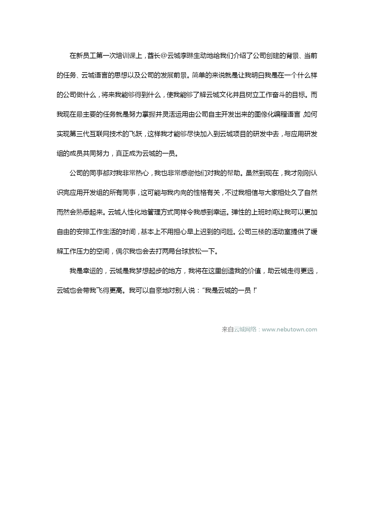 畅谈云城工作生活时光流逝,进入云城将近两个星期了,我感觉我是非常幸运的。作为今年刚刚大学毕业的毕业生,我之前没有任何的正式工作经验,所以在第一天上班的时候我心中有些忐忑。云城网络技术对我来说就像一张白纸一样,我不知道从哪动笔开始描绘我的新生活。不过我的担心很快就烟消云散----应用研发组的同事为我们这些新来的员工制定出了最新的培训计划,再加上有唐哥(唐骋然)和鹏哥(张鹏)专门帮助我解决工作上的困难,很快地使我适应了现在的工作。在新员工第一次培训课上,酋长@云城李琳生动地给我们介绍了公司创建的背景、当前的任务、云城语言的思想以及公司的发展前景。简单的来说就是让我明白我是在一个什么样的公司做什么,将来我能够得到什么,使我能够了解云城文化并且树立工作奋斗的目标。而我现在最主要的任务就是努力掌握并灵活运用由公司自主开发出来的图像化编程语言,如何实现第三代互联网技术的飞跃,这样我才能够尽快加入到云城项目的研发中去,与应用研发组的成员共同努力,真正成为云城的一员。公司的同事都对我非常热心,我也非常感谢他们对我的帮助。虽然到现在,我才刚刚认识完应用开发组的所有同事,这可能与我内向的性格有关,不过我相信与大家相处久了自然而然会熟悉起来。云城人性化地管理方式同样令我感到幸运。弹性的上班时间让我可以更加自由的安排工作生活的时间,基本上不用担心早上迟到的问题。公司三楼的活动室提供了缓解工作压力的空间,偶尔我也会去打两局台球放松一下。我是幸运的,云城是我梦想起步的地方,我将在这里创造我的价值,助云城走得更远,云城也会带我飞得更高。我可以自豪地对别人说:“我是云城的一员!”来自HYPERLINK"http://www.nebutown.com/"\t"_blank"云城网络:www.nebutown.com