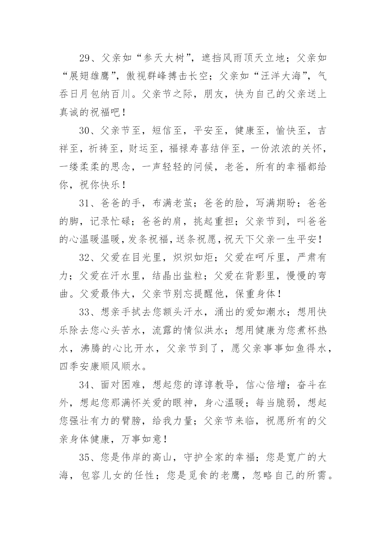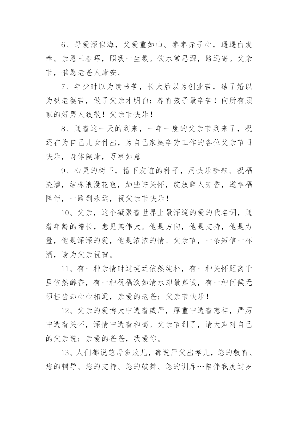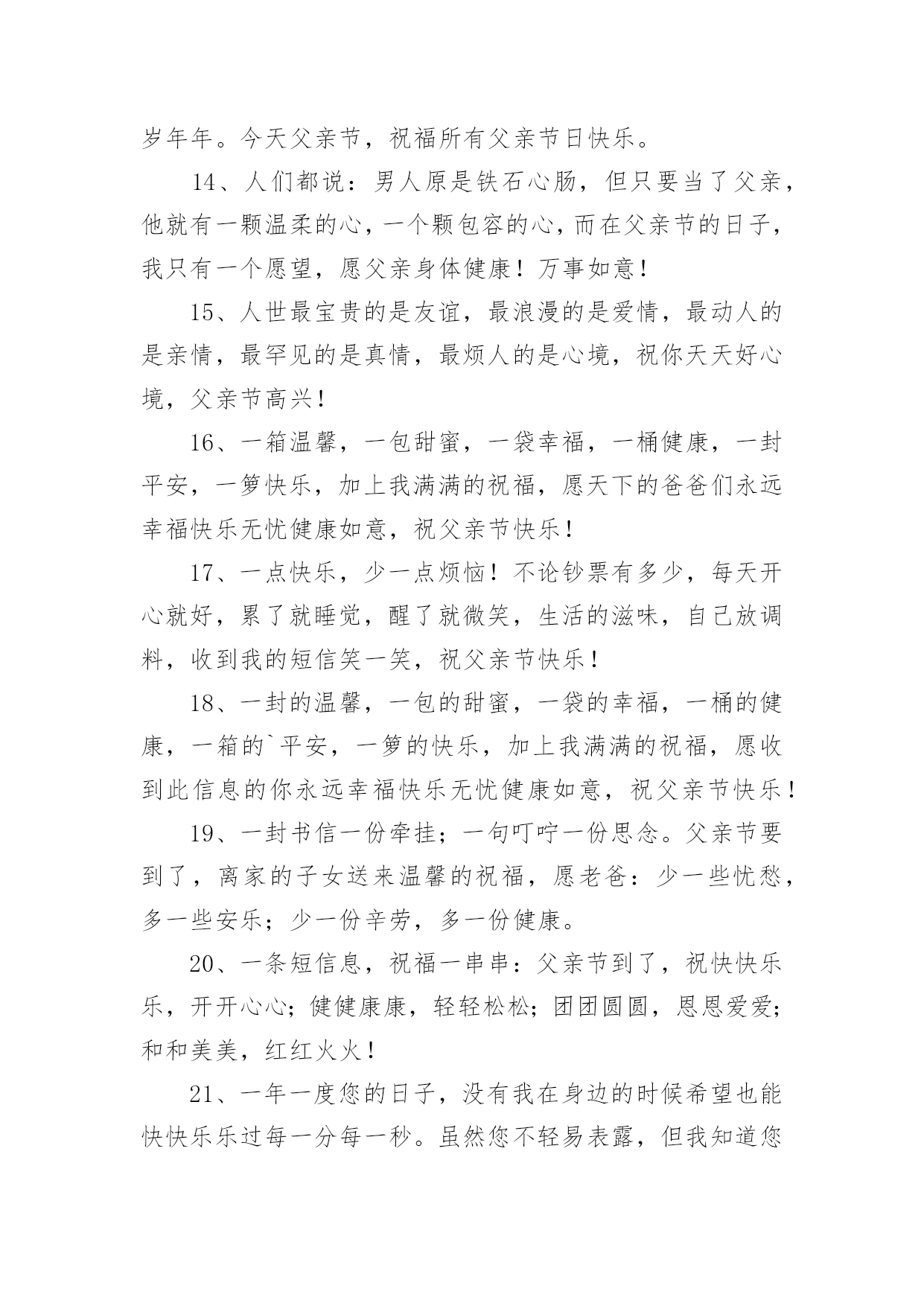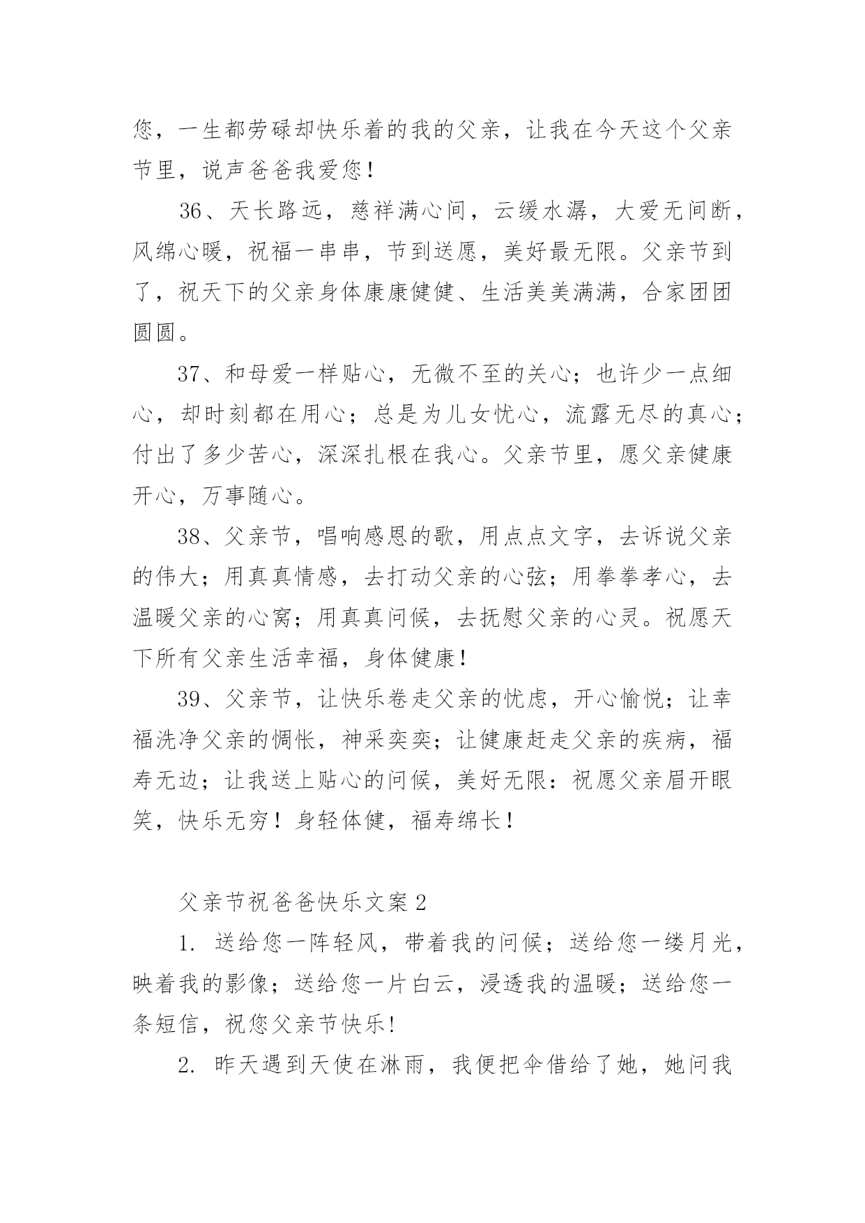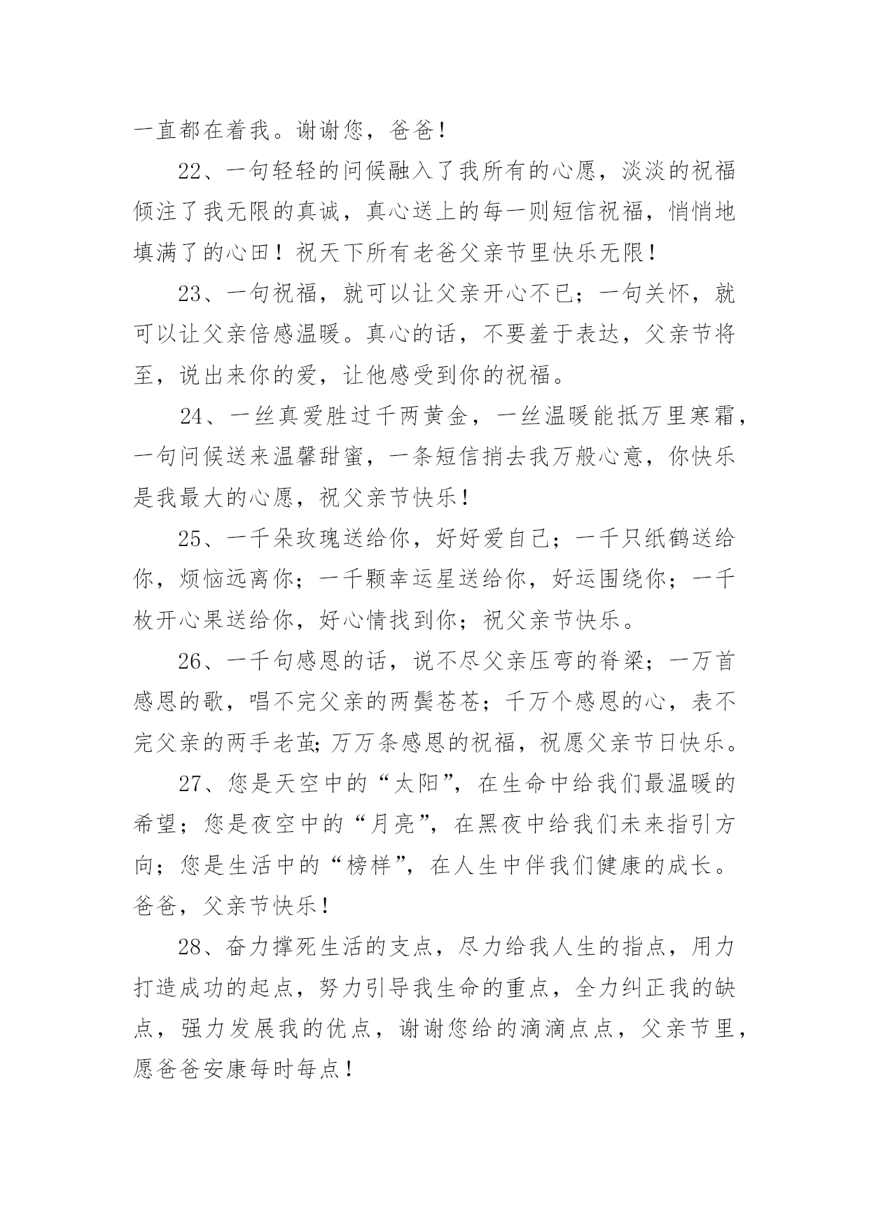 父亲节祝爸爸快乐文案无论是身处学校还是步入社会,越来越多人会在朋友圈发布文案,文案用以宣泄自己的情绪,调节心情。还在苦苦寻找优秀经典的文案吗?下面是小编为大家整理的父亲节祝爸爸快乐文案,供大家参考借鉴,希望可以帮助到有需要的朋友。父亲节祝爸爸快乐文案11、您花白的头发夹杂辛劳;您深刻的皱纹写满沧桑;您炯炯的双眼饱含沉沉爱意、殷勤期许。我不知如何表达我的感恩之心与感激之情,唯祝您父亲节快乐!2、开心的节日到,老爸你要笑,笑笑十年少,而且心情好,天热身体注意保,学会休息别辛劳,父亲节我来问个好,祝老爸永远没烦恼,天天都美好,父亲节快乐!3、您的辛劳,让我感激一生;您的教诲,让我铭记一世;您的品德,让我忆念一辈;您的关爱,让我温馨终身。亲爱的爸爸,父亲节快乐!4、父亲节,短信表达情真意切:父亲,这辈子感谢你!父亲节,短信表达温馨深情:父亲,这辈子谢恩你!谢谢你:亲爱的父亲!5、斟一杯酒,祝父亲健康长寿。敬一碗茶,祝父亲永葆青春年华。献一束花,祝父亲天天笑哈哈。唱一首歌,祝父亲年年乐呵呵。父亲节快乐!6、母爱深似海,父爱重如山。拳拳赤子心,遥遥白发牵。亲恩三春晖,照我一生暖。饮水常思源,路远寄。父亲节,惟愿老爸人康安。7、年少时以为读书苦,长大后以为创业苦,结了婚以为哄老婆苦,做了父亲才明白:养育孩子最辛苦!向所有顾家的好男人致敬!父亲节快乐!8、随着这一天的到来,一年一度的父亲节到来了,祝还在为自己儿女付出,为自己家庭辛劳工作的各位父亲节日快乐,身体健康,万事如意9、心灵的树下,播下友谊的种子,用快乐耕耘、祝福浇灌,结株浪漫花苞,加些许关怀,绽放醉人芳香,邀幸福陪伴,一路到永远,祝父亲节快乐!10、父亲,这个凝聚着世界上最深邃的爱的代名词,随着年龄的增长,愈见其伟大。他是方向,他是支持,他是力量,他是深深的爱,他是浓浓的情。父亲节,一条短信一杯酒,请为父亲祝贺。11、有一种亲情时过境迁依然纯朴,有一种关怀距离千里依然醇香,有一种祝福淡如清水却最真诚,有一种问候无须挂齿却心心相通,亲爱的老爸:父亲节快乐!12、父亲的爱博大中透着威严,厚重中透着慈祥,严厉中透着关怀,深情中透着和蔼。父亲节到了,请大声对自己的父亲说:亲爱的爸爸,我爱你。13、人们都说慈母多败儿,都说严父出孝儿,您的教育、您的辅导、您的支持、您的鼓舞、您的训斥…陪伴我度过岁岁年年。今天父亲节,祝福所有父亲节日快乐。14、人们都说:男人原是铁石心肠,但只要当了父亲,他就有一颗温柔的心,一个颗包容的心,而在父亲节的日子,我只有一个愿望,愿父亲身体健康!万事如意!15、人世最宝贵的是友谊,最浪漫的是爱情,最动人的是亲情,最罕见的是真情,最烦人的是心境,祝你天天好心境,父亲节高兴!16、一箱温馨,一包甜蜜,一袋幸福,一桶健康,一封平安,一箩快乐,加上我满满的祝福,愿天下的爸爸们永远幸福快乐无忧健康如意,祝父亲节快乐!17、一点快乐,少一点烦恼!不论钞票有多少,每天开心就好,累了就睡觉,醒了就微笑,生活的滋味,自己放调料,收到我的短信笑一笑,祝父亲节快乐!18、一封的温馨,一包的甜蜜,一袋的幸福,一桶的健康,一箱的`平安,一箩的快乐,加上我满满的祝福,愿收到此信息的你永远幸福快乐无忧健康如意,祝父亲节快乐!19、一封书信一份牵挂;一句叮咛一份思念。父亲节要到了,离家的子女送来温馨的祝福,愿老爸:少一些忧愁,多一些安乐;少一份辛劳,多一份健康。20、一条短信息,祝福一串串:父亲节到了,祝快快乐乐,开开心心;健健康康,轻轻松松;团团圆圆,恩恩爱爱;和和美美,红红火火!21、一年一度您的日子,没有我在身边的时候希望也能快快乐乐过每一分每一秒。虽然您不轻易表露,但我知道您一直都在着我。谢谢您,爸爸!22、一句轻轻的问候融入了我所有的心愿,淡淡的祝福倾注了我无限的真诚,真心送上的每一则短信祝福,悄悄地填满了的心田!祝天下所有老爸父亲节里快乐无限!23、一句祝福,就可以让父亲开心不已;一句关怀,就可以让父亲倍感温暖。真心的话,不要羞于表达,父亲节将至,说出来你的爱,让他感受到你的祝福。24、一丝真爱胜过千两黄金,一丝温暖能抵万里寒霜,一句问候送来温馨甜蜜,一条短信捎去我万般心意,你快乐是我最大的心愿,祝父亲节快乐!25、一千朵玫瑰送给你,好好爱自己;一千只纸鹤送给你,烦恼远离你;一千颗幸运星送给你,好运围绕你;一千枚开心果送给你,好心情找到你;祝父亲节快乐。26、一千句感恩的话,说不尽父亲压弯的脊梁;一万首感恩的歌,唱不完父亲的两鬓苍苍;千万个感恩的心,表不完父亲的两手老茧;万万条感恩的祝福,祝愿父亲节日快乐。27、您是天空中的“太阳”,在生命中给我们最温暖的希望;您是夜空中的“月亮”,在黑夜中给我们未来指引方向;您是生活中的“榜样”,在人生中伴我们健康的成长。爸爸,父亲节快乐!28、奋力