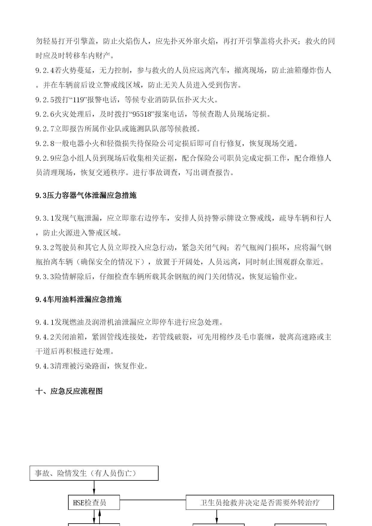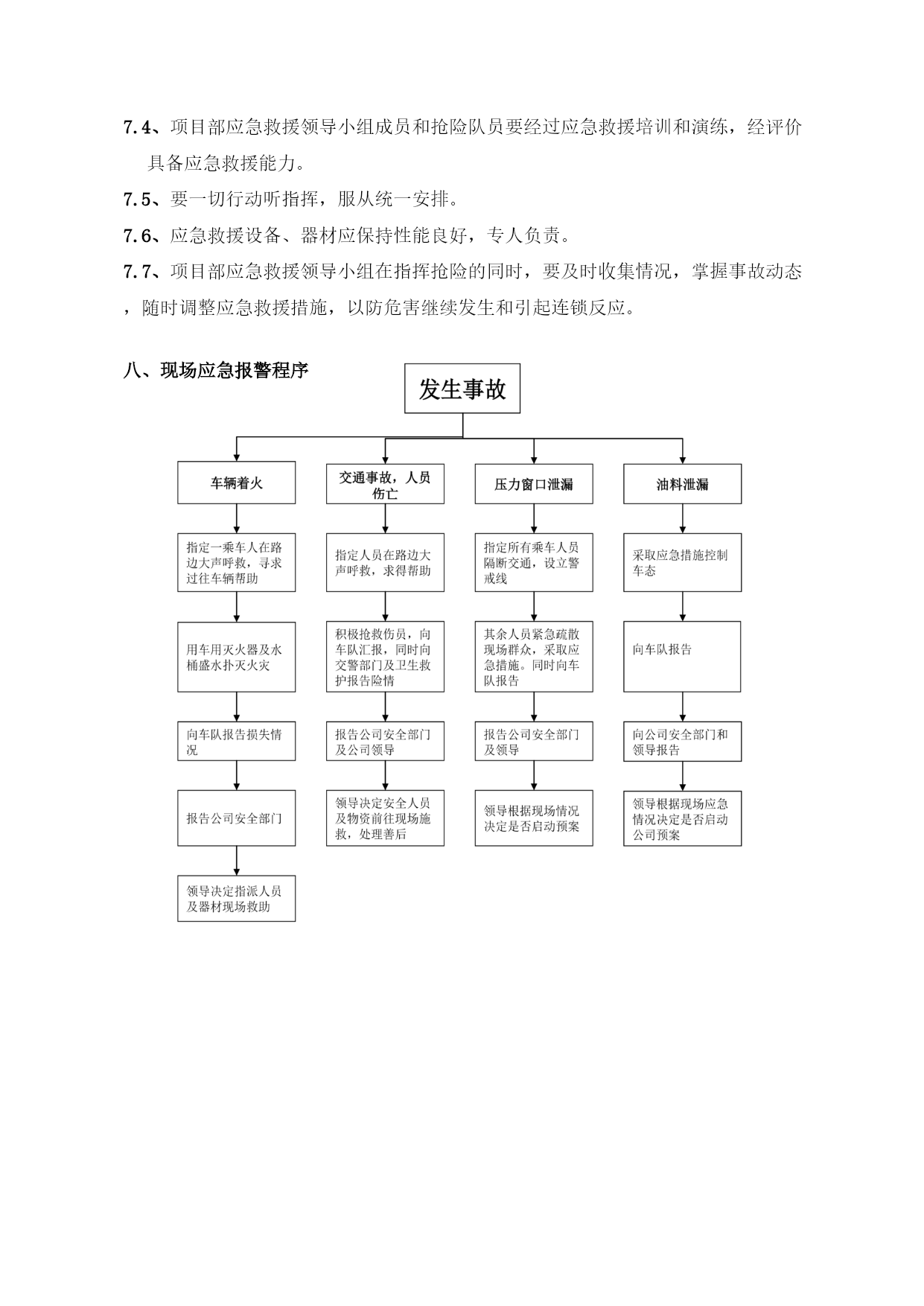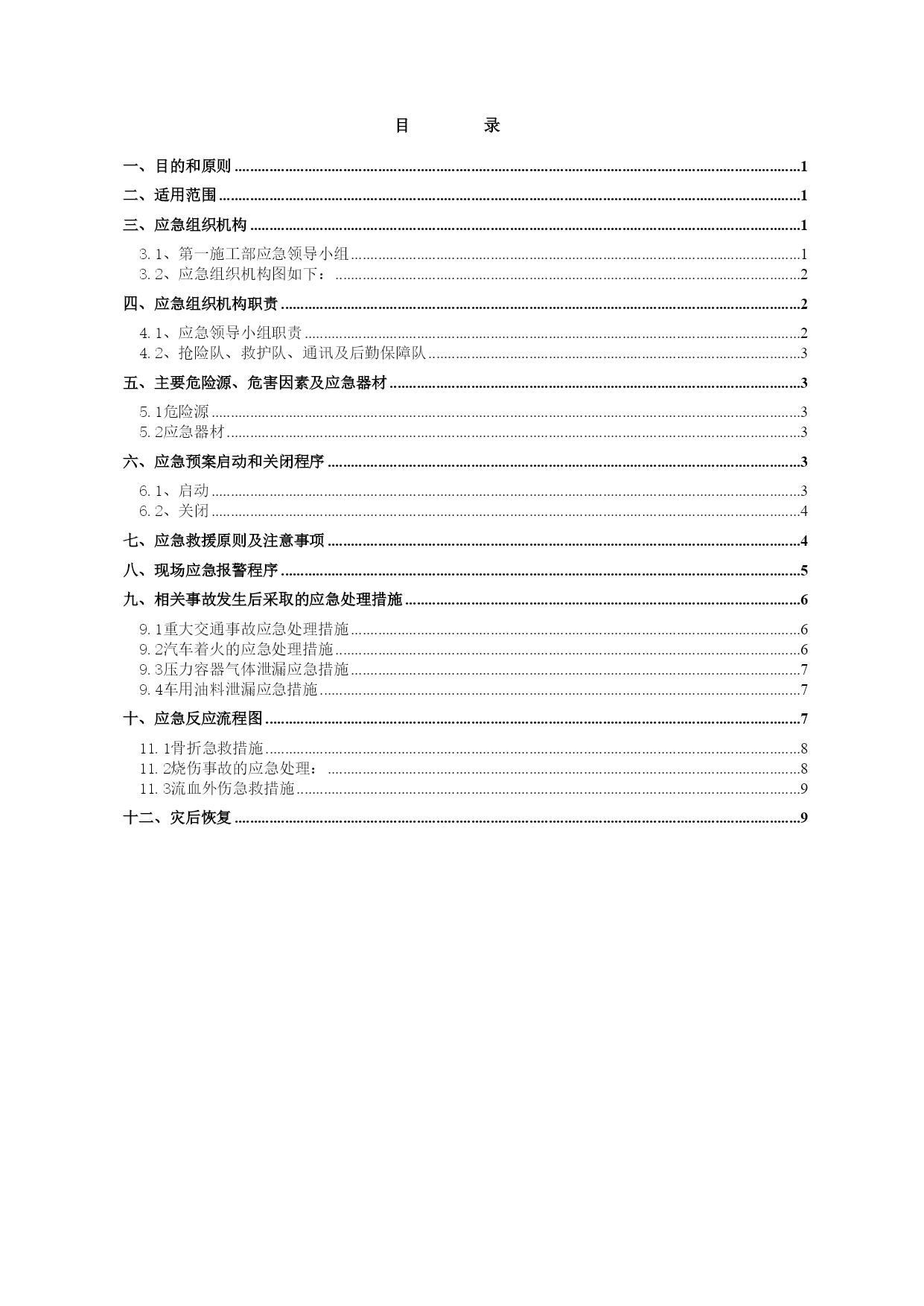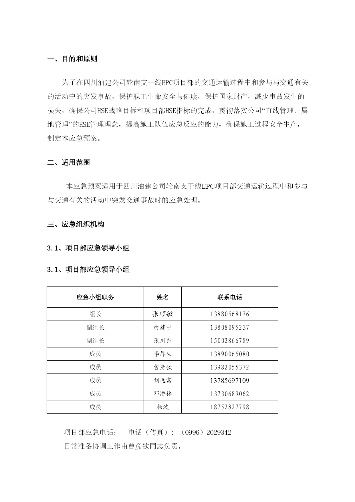 西气东输二线轮南—吐鲁番支干线工程交通安全应急预案EPC总承包商编码LN-DE-HSE-XF-0005A20110626编制状态版本日期文件状态起草人校审人批准人目录TOC\o"1-2"\h\z\uHYPERLINK\l"_Toc290066779"一、目的和原则PAGEREF_Toc290066779\h1HYPERLINK\l"_Toc290066780"二、适用范围PAGEREF_Toc290066780\h1HYPERLINK\l"_Toc290066781"三、应急组织机构PAGEREF_Toc290066781\h1HYPERLINK\l"_Toc290066782"3.1、第一施工部应急领导小组PAGEREF_Toc290066782\h1HYPERLINK\l"_Toc290066783"3.2、应急组织机构图如下:PAGEREF_Toc290066783\h2HYPERLINK\l"_Toc290066784"四、应急组织机构职责PAGEREF_Toc290066784\h2HYPERLINK\l"_Toc290066785"4.1、应急领导小组职责PAGEREF_Toc290066785\h2HYPERLINK\l"_Toc290066786"4.2、抢险队、救护队、通讯及后勤保障队PAGEREF_Toc290066786\h3HYPERLINK\l"_Toc290066787"五、主要危险源、危害因素及应急器材PAGEREF_Toc290066787\h3HYPERLINK\l"_Toc290066788"5.1危险源PAGEREF_Toc290066788\h3HYPERLINK\l"_Toc290066789"5.2应急器材PAGEREF_Toc290066789\h3HYPERLINK\l"_Toc290066790"六、应急预案启动和关闭程序PAGEREF_Toc290066790\h3HYPERLINK\l"_Toc290066791"6.1、启动PAGEREF_Toc290066791\h3HYPERLINK\l"_Toc290066792"6.2、关闭PAGEREF_Toc290066792\h4HYPERLINK\l"_Toc290066793"七、应急救援原则及注意事项PAGEREF_Toc290066793\h4HYPERLINK\l"_Toc290066794"八、现场应急报警程序PAGEREF_Toc290066794\h5HYPERLINK\l"_Toc290066795"九、相关事故发生后采取的应急处理措施PAGEREF_Toc290066795\h6HYPERLINK\l"_Toc290066796"9.1重大交通事故应急处理措施PAGEREF_Toc290066796\h6HYPERLINK\l"_Toc290066797"9.2汽车着火的应急处理措施PAGEREF_Toc290066797\h6HYPERLINK\l"_Toc290066798"9.3压力容器气体泄漏应急措施PAGEREF_Toc290066798\h7HYPERLINK\l"_Toc290066799"9.4车用油料泄漏应急措施PAGEREF_Toc290066799\h7HYPERLINK\l"_Toc290066800"十、应急反应流程图PAGEREF_Toc290066800\h7HYPERLINK\l"_Toc290066801"11.1骨折急救措施PAGEREF_Toc290066801\h8HYPERLINK\l"_Toc290066802"11.2烧伤事故的应急处理:PAGEREF_Toc290066802\h8HYPERLINK\l"_Toc290066803"11.3流血外伤急救措施PAGEREF_Toc290066803\h9HYPERLINK\l"_Toc290066804"十二、灾后恢复PAGEREF_Toc290066804\h9一、目的和原则为了在四川油建公司轮南支干线EPC项目部的交通运输过程中和参与与交通有关的活动中的突发事故,保护职工生命安全与健康,保护国家财产,减少事故发生的损失,确保公司HSE战略目标和项目部HSE指标的完成,贯