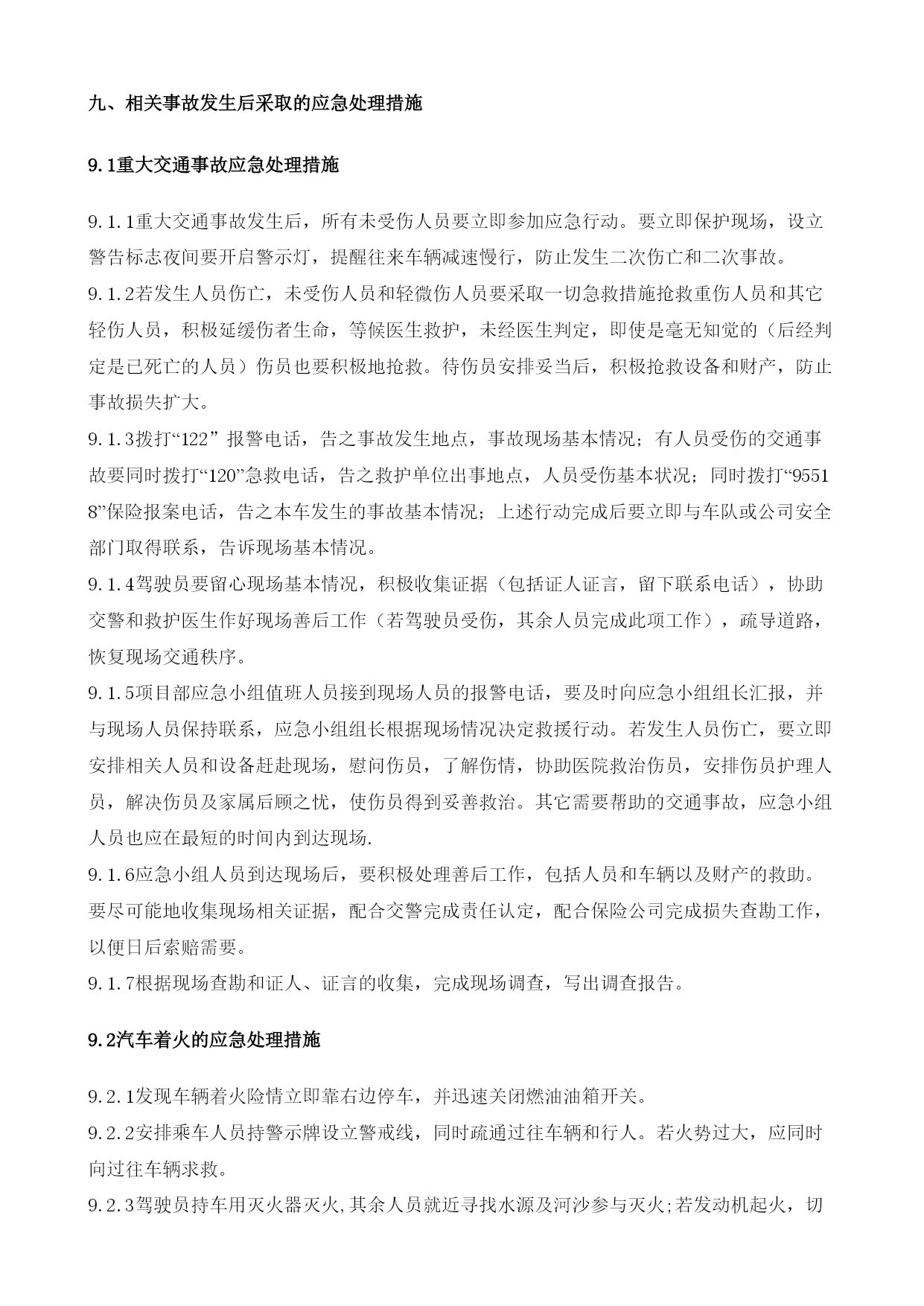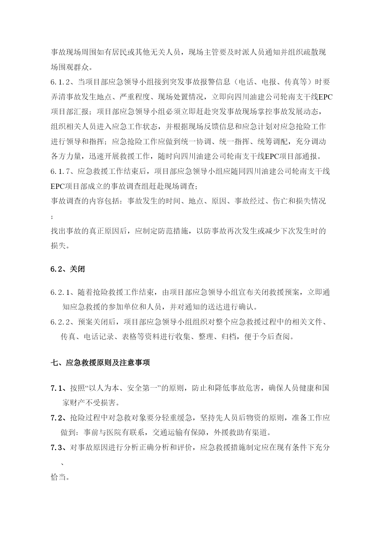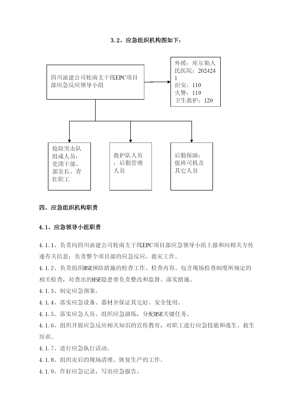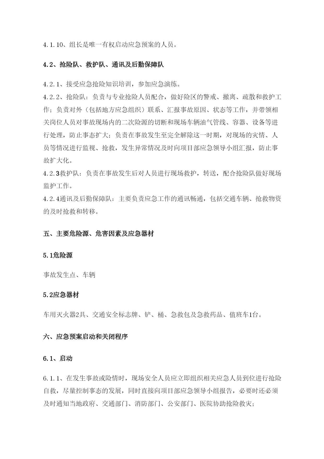 西气东输二线轮南—吐鲁番支干线工程交通安全应急预案EPC总承包商编码LN-DE-HSE-XF-0005A20110626编制状态版本日期文件状态起草人校审人批准人目录TOC\o"1-2"\h\z\uHYPERLINK\l"_Toc290066779"一、目的和原则PAGEREF_Toc290066779\h1HYPERLINK\l"_Toc290066780"二、适用范围PAGEREF_Toc290066780\h1HYPERLINK\l"_Toc290066781"三、应急组织机构PAGEREF_Toc290066781\h1HYPERLINK\l"_Toc290066782"3.1、第一施工部应急领导小组PAGEREF_Toc290066782\h1HYPERLINK\l"_Toc290066783"3.2、应急组织机构图如下:PAGEREF_Toc290066783\h2HYPERLINK\l"_Toc290066784"四、应急组织机构职责PAGEREF_Toc290066784\h2HYPERLINK\l"_Toc290066785"4.1、应急领导小组职责PAGEREF_Toc290066785\h2HYPERLINK\l"_Toc290066786"4.2、抢险队、救护队、通讯及后勤保障队PAGEREF_Toc290066786\h3HYPERLINK\l"_Toc290066787"五、主要危险源、危害因素及应急器材PAGEREF_Toc290066787\h3HYPERLINK\l"_Toc290066788"5.1危险源PAGEREF_Toc290066788\h3HYPERLINK\l"_Toc290066789"5.2应急器材PAGEREF_Toc290066789\h3HYPERLINK\l"_Toc290066790"六、应急预案启动和关闭程序PAGEREF_Toc290066790\h3HYPERLINK\l"_Toc290066791"6.1、启动PAGEREF_Toc290066791\h3HYPERLINK\l"_Toc290066792"6.2、关闭PAGEREF_Toc290066792\h4HYPERLINK\l"_Toc290066793"七、应急救援原则及注意事项PAGEREF_Toc290066793\h4HYPERLINK\l"_Toc290066794"八、现场应急报警程序PAGEREF_Toc290066794\h5HYPERLINK\l"_Toc290066795"九、相关事故发生后采取的应急处理措施PAGEREF_Toc290066795\h6HYPERLINK\l"_Toc290066796"9.1重大交通事故应急处理措施PAGEREF_Toc290066796\h6HYPERLINK\l"_Toc290066797"9.2汽车着火的应急处理措施PAGEREF_Toc290066797\h6HYPERLINK\l"_Toc290066798"9.3压力容器气体泄漏应急措施PAGEREF_Toc290066798\h7HYPERLINK\l"_Toc290066799"9.4车用油料泄漏应急措施PAGEREF_Toc290066799\h7HYPERLINK\l"_Toc290066800"十、应急反应流程图PAGEREF_Toc290066800\h7HYPERLINK\l"_Toc290066801"11.1骨折急救措施PAGEREF_Toc290066801\h8HYPERLINK\l"_Toc290066802"11.2烧伤事故的应急处理:PAGEREF_Toc290066802\h8HYPERLINK\l"_Toc290066803"11.3流血外伤急救措施PAGEREF_Toc290066803\h9HYPERLINK\l"_Toc290066804"十二、灾后恢复PAGEREF_Toc290066804\h9一、目的和原则为了在四川油建公司轮南支干线EPC项目部的交通运输过程中和参与与交通有关的活动中的突发事故,保护职工生命安全与健康,保护国家财产,减少事故发生的损失,确保公司HSE战略目标和项目部HSE指标的完成,贯