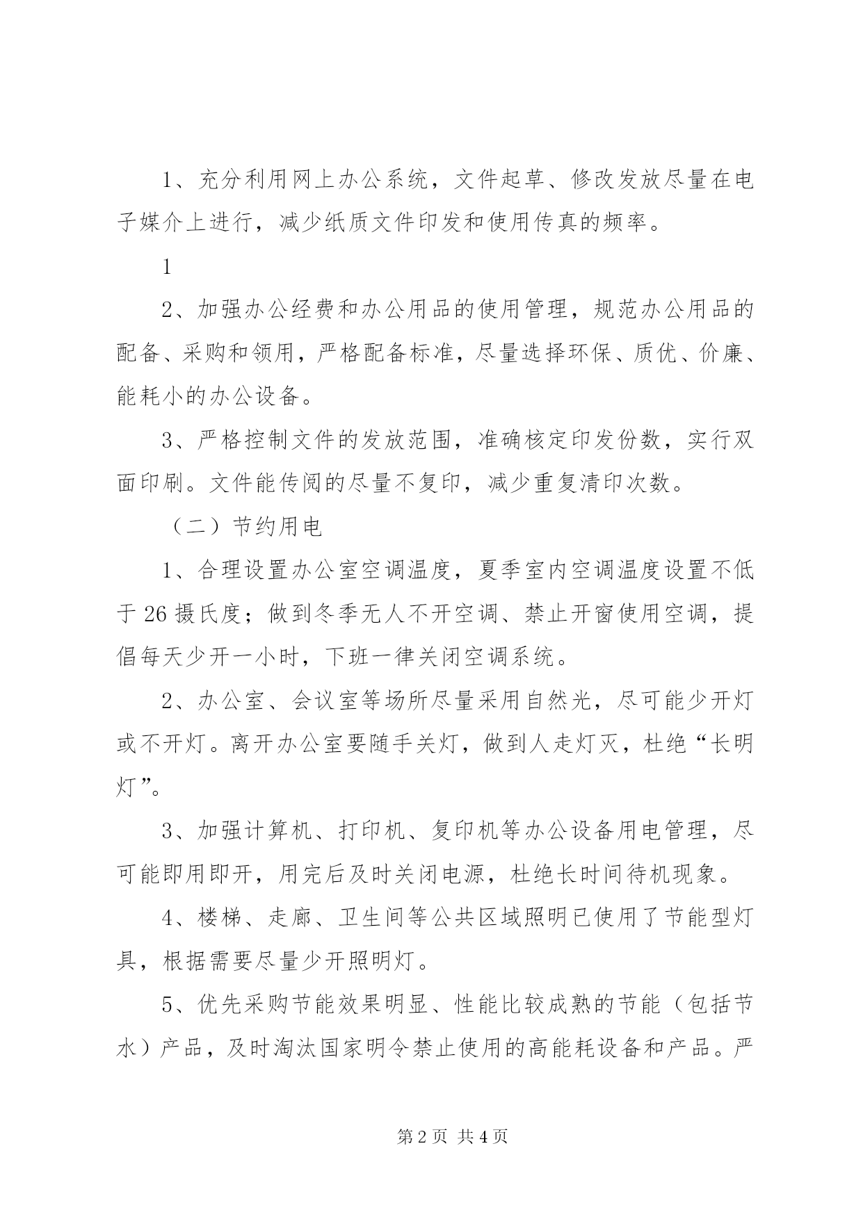第PAGE\*Arabic\*MERGEFORMAT4页共NUMPAGES\*MERGEFORMAT4页公共机构节能工作总结为推进公共机构节能工作的发展,提高能源利用效率和经济效益,我委为建设资源节约型,环境友好型和谐社会而积极参与。2016年以来,紧紧围绕“节能减排,科学发展”这一主题,采取多种形式,在全体干部中开展“培养节能环保意识,推进节能降耗工作”,广泛宣传,营造节能减排工作的良好氛围,现将有关工作总结如下一、提高认识,加强宣传节约资源,保护环境是我国的基本国策。做好公共机构节能减排工作,是贯彻落实科学发展观、构建社会主义和谐社会的重大措施,是建设资源节约型、环境友好型社会的必然选择。我委每季度召开一次节能工作会议,组织全体工作人员认真学习文件,充分认识到做好减排工作的重要性和紧迫性,切实增强责任感和使命感,把节能减排工作作为重要工作任务来抓。二、成立机构,加强领导成立了节能减排工作领导小组,由书记任组长,副书记为副组长,办公室干部蔡嘉倩为节能联络员,张丽娜和各基层团委书记任领导小组成员,负责做好本委资源节约各项工作的指导、协调、督查和考核。三、强化管理,节能降耗(一)节约办公经费1、充分利用网上办公系统,文件起草、修改发放尽量在电子媒介上进行,减少纸质文件印发和使用传真的频率。12、加强办公经费和办公用品的使用管理,规范办公用品的配备、采购和领用,严格配备标准,尽量选择环保、质优、价廉、能耗小的办公设备。3、严格控制文件的发放范围,准确核定印发份数,实行双面印刷。文件能传阅的尽量不复印,减少重复清印次数。(二)节约用电1、合理设置办公室空调温度,夏季室内空调温度设置不低于26摄氏度;做到冬季无人不开空调、禁止开窗使用空调,提倡每天少开一小时,下班一律关闭空调系统。2、办公室、会议室等场所尽量采用自然光,尽可能少开灯或不开灯。离开办公室要随手关灯,做到人走灯灭,杜绝“长明灯”。3、加强计算机、打印机、复印机等办公设备用电管理,尽可能即用即开,用完后及时关闭电源,杜绝长时间待机现象。4、楼梯、走廊、卫生间等公共区域照明已使用了节能型灯具,根据需要尽量少开照明灯。5、优先采购节能效果明显、性能比较成熟的节能(包括节水)产品,及时淘汰国家明令禁止使用的高能耗设备和产品。严格控制新增用电设备。(三)节约用水1、加强用水设备维护管理,自觉检查、处理和通知相关人员及时解决供水故障,杜绝跑、冒、漏、滴和长流水现象。禁止使用高压自来水冲洗车辆、地面。2、控制各个阀门、龙头的出水流量,在满足基本使用要求2的基础上,切实减少耗水量。(四)节约公务用车油耗1、严格执行上级规定,控制车辆编制和配备标准。优先选购国产、小排量、经济环保、手档变速的车辆。2、合理安排出车任务和行驶路线,提倡合乘车辆,减少单车出驶台次,提高使用效率;路程较近时不使用车辆。3、严格执行公务用车节假日封存停驶制度,严禁公车私用。4、坚持规范行驶、按时保养,减少车辆部件非正常损耗,努力降低车辆油耗和维修费用支出。四、贯彻落实,加强监督建立节能工作领导小组,明确专人负责,落实本委节能工作措施,不定期开展检查,对浪费资源、节能措施实施不到位的给予通报批评。今年以来,本委领导把节能工作作为一项重要工作常抓不懈,并按年初节能工作计划一项一项抓好,2016年,我委水、电、汽油和办公耗材费用得到有效控制。在今后的工作中将再接再励,使节能工作再上一个新台阶。