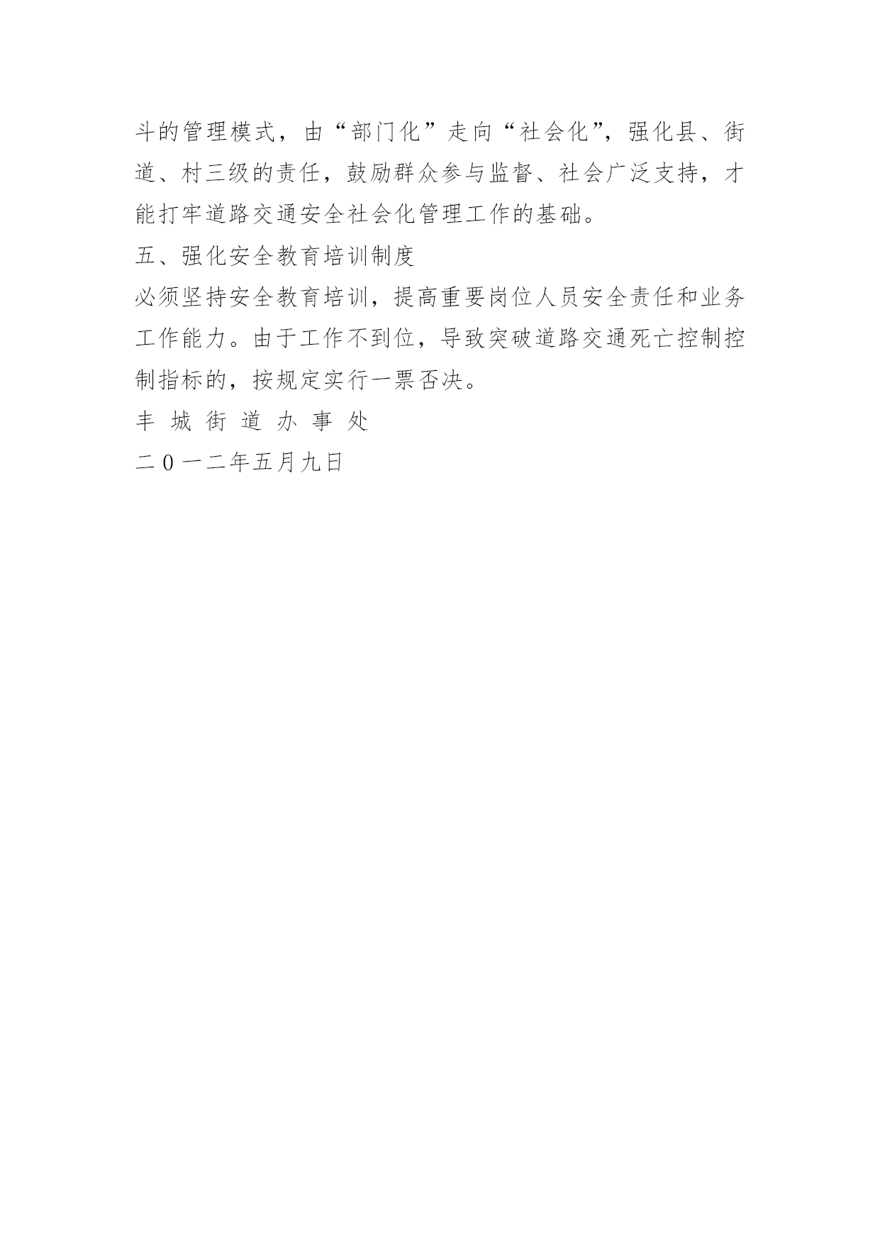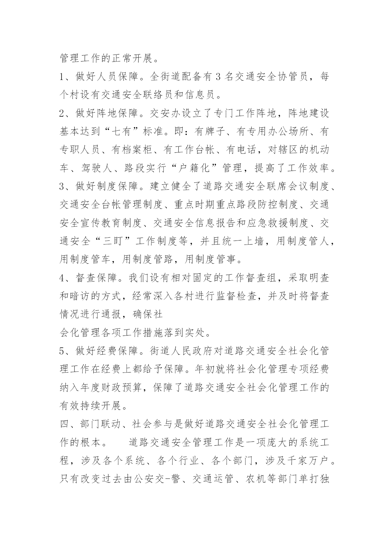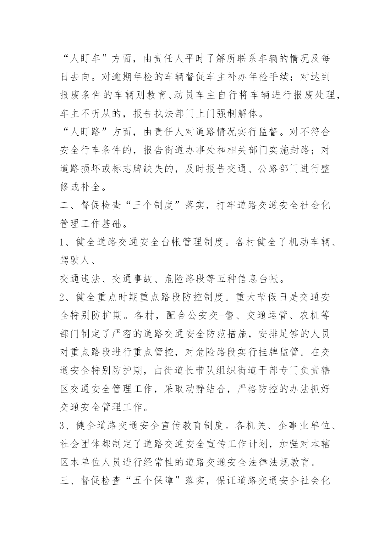 交通安全监督检查制度交通安全监督检查制度1、主管段长监督,分管副段长负责组织人员对全段车辆进行定期或不定期的检查(每月至少一次)。2、检查内容、车容、车乘员、车辆运行情况有无隐患,着重检查车辆制动灯,转向、喇叭、两侧后视镜等。3、不定期组织人员跟车监督检查了解道路情况车辆运行,驾驶员操作情况有无违章现象。4、对检查获得的信息加以分析总结提出整改意见。5、在安全学习上组织驾驶员学习提高认识。交通安全监督检查制度[篇2]近年来,我街道狠抓道路交通安全监管,全街道道路交通安全态势较为平稳。但一些客运企业、从业人员安全意识较为淡薄,源头监管、路面监控存在一些问题和隐患,严重威胁着人民群众的生命财产安全。为切实加强对全街道道路交通安全工作的领导,形成办事处统一领导,相关部门各司其职、齐抓共管、综合治理、标本兼治的工作格局,促进道路交通安全与经济社会协调发展,特制定本制度。一、督促检查“三盯”措施落实,实现村(居)道路交通安全管理工作一体化格局。“人盯人”方面,由责任人与所联系的客运驾驶人加强联系,进行交通安全宣传教育。每个月集中辖区客运驾驶人召开一次会议,进行交通安全宣传教育。“人盯车”方面,由责任人平时了解所联系车辆的情况及每日去向。对逾期年检的车辆督促车主补办年检手续;对达到报废条件的车辆则教育、动员车主自行将车辆进行报废处理,车主不听从的,报告执法部门上门强制解体。“人盯路”方面,由责任人对道路情况实行监督。对不符合安全行车条件的,报告街道办事处和相关部门实施封路;对道路损坏或标志牌缺失的,及时报告交通、公路部门进行整修或补全。二、督促检查“三个制度”落实,打牢道路交通安全社会化管理工作基础。1、健全道路交通安全台帐管理制度。各村健全了机动车辆、驾驶人、交通违法、交通事故、危险路段等五种信息台帐。2、健全重点时期重点路段防控制度。重大节假日是交通安全特别防护期。各村,配合公安交-警、交通运管、农机等部门制定了严密的道路交通安全防范措施,安排足够的人员对重点路段进行重点管控,对危险路段实行挂牌监管。在交通安全特别防护期,由街道长带队组织街道干部专门负责辖区交通安全管理工作,采取动静结合,严格防控的办法抓好交通安全管理工作。3、健全道路交通安全宣传教育制度。各机关、企事业单位、社会团体都制定了道路交通安全宣传工作计划,加强对本辖区本单位人员进行经常性的道路交通安全法律法规教育。三、督促检查“五个保障”落实,保证道路交通安全社会化管理工作的正常开展。1、做好人员保障。全街道配备有3名交通安全协管员,每个村设有交通安全联络员和信息员。2、做好阵地保障。交安办设立了专门工作阵地,阵地建设基本达到“七有”标准。即:有牌子、有专用办公场所、有专职人员、有档案柜、有工作台帐、有电话,对辖区的机动车、驾驶人、路段实行“户籍化”管理,提高了工作效率。3、做好制度保障。建立健全了道路交通安全联席会议制度、交通安全台帐管理制度、重点时期重点路段防控制度、交通安全宣传教育制度、交通安全信息报告和应急救援制度、交通安全“三盯”工作制度等,并且统一上墙,用制度管人,用制度管车,用制度管路,用制度管事。4、督查保障。我们设有相对固定的工作督查组,采取明查和暗访的方式,经常深入各村进行监督检查,并及时将督查情况进行通报,确保社会化管理各项工作措施落到实处。5、做好经费保障。街道人民政府对道路交通安全社会化管理工作在经费上都给予保障。年初就将社会化管理专项经费纳入年度财政预算,保障了道路交通安全社会化管理工作的有效持续开展。四、部门联动、社会参与是做好道路交通安全社会化管理工作的根本。道路交通安全管理工作是一项庞大的系统工程,涉及各个系统、各个行业、各个部门,涉及千家万户。只有改变过去由公安交-警、交通运管、农机等部门单打独斗的管理模式,由“部门化”走向“社会化”,强化县、街道、村三级的责任,鼓励群众参与监督、社会广泛支持,才能打牢道路交通安全社会化管理工作的基础。五、强化安全教育培训制度必须坚持安全教育培训,提高重要岗位人员安全责任和业务工作能力。由于工作不到位,导致突破道路交通死亡控制控制指标的,按规定实行一票否决。丰城街道办事处二0一二年五月九日