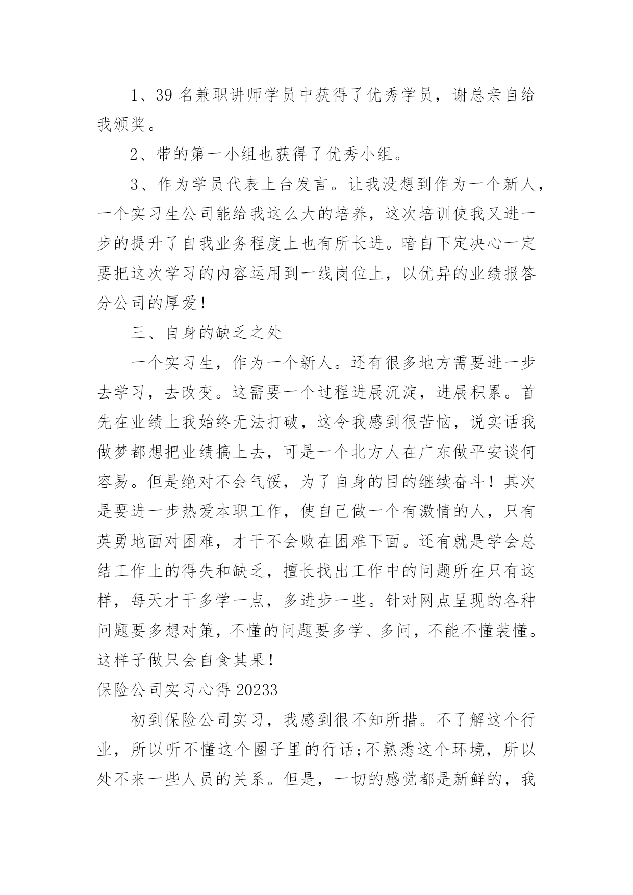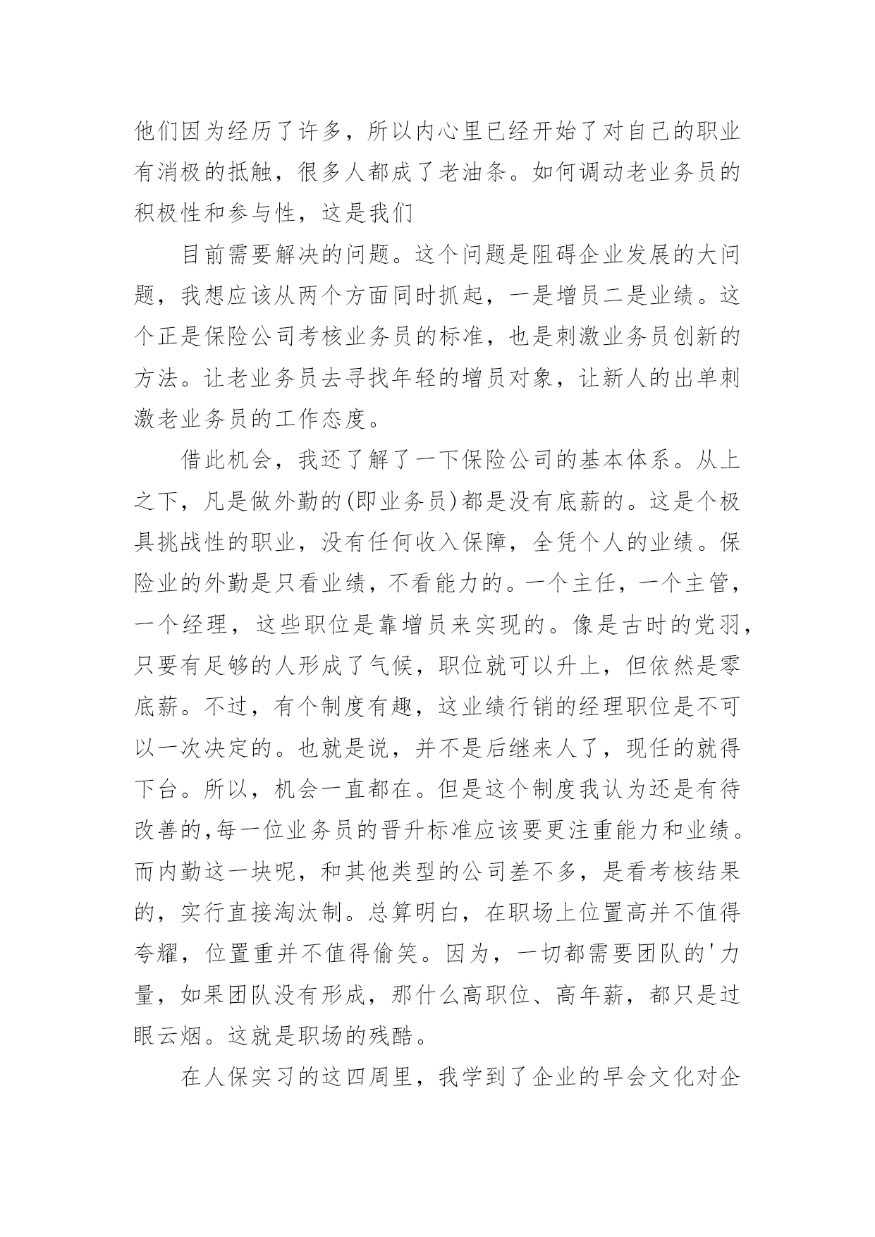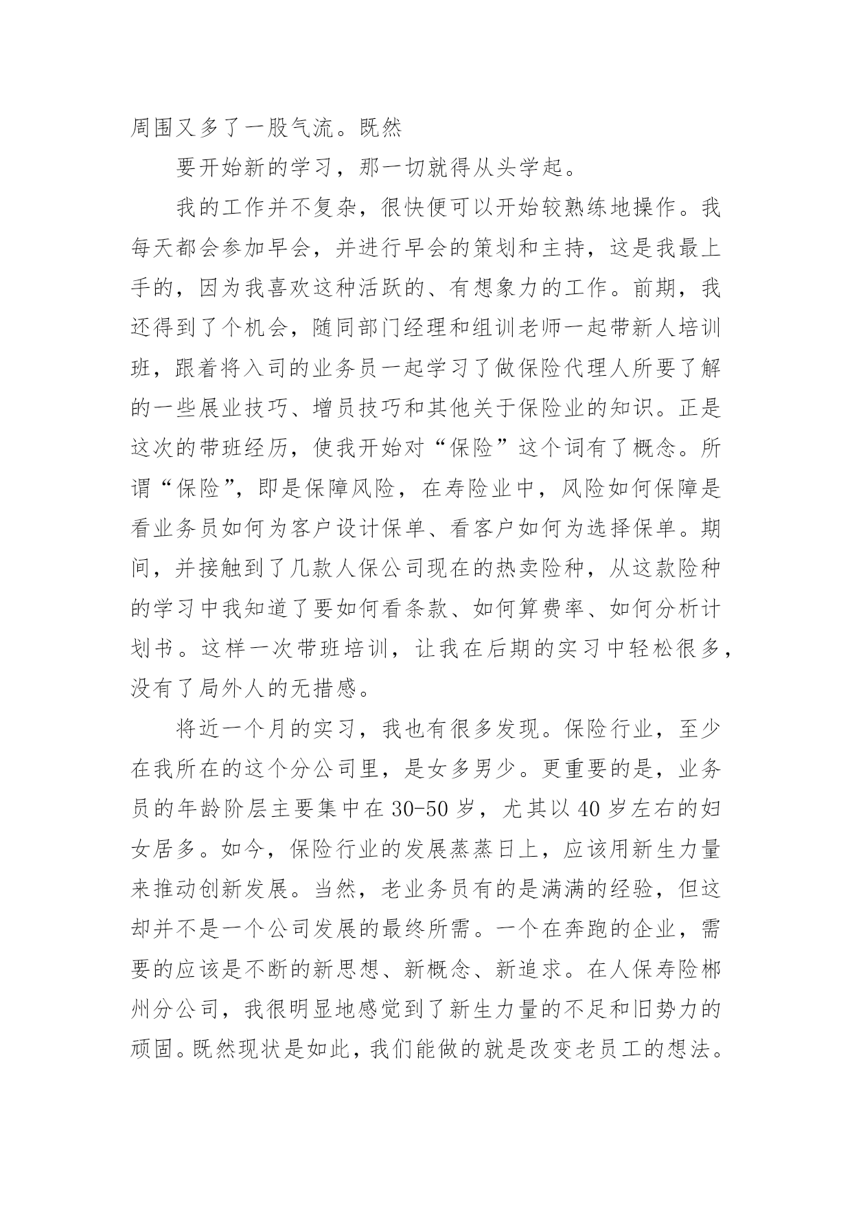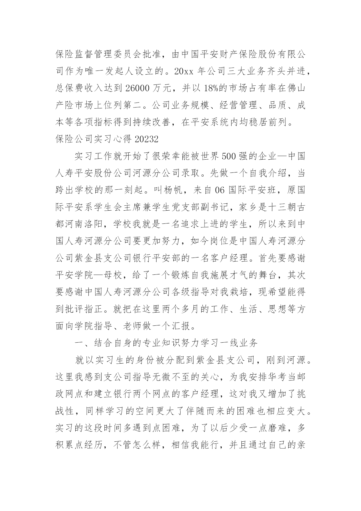 保险公司实习心得保险公司实习心得2023当我们备受启迪时,马上将其记录下来,这样可以不断更新自己的想法。那么好的心得体会都具备一些什么特点呢?下面是小编收集整理的保险公司实习心得2023,希望对大家有所帮助。保险公司实习心得20231一、前言实践是检验真理的惟一标准。在课堂上,我们学习了很多理论知识,但是如果我们在实际当中不能灵活运用,那就等于没有学。实习就是将我们在课堂上学的理论知识运用到实战中,它可以为我们提供了一个了解和熟悉工作实际的机会。只有在实际工作中,我们才可以知道工作到底是怎么一回事、自己更适合做什么、哪些知识是有用的、对自己的知识结构做哪些补充和调整、如何处理工作中的人际关系等等,这将有助于他们更全面地认识自己和了解职业,并据此科学地设计自己的职业生涯。我们怎样才能把课本上的知识灵活恰当的运用到生活、工作当中去,成为对别人对社会有用的人才?我们怎样才能适应当今飞速发展的社会,怎样才能确定自己的人生坐标,实现自己的人生价值呢?抱着这种想法,我走进了中国平安财产保险股份有限公司佛山分公司。在那里,我接受了更为有用的保险知识,而每天细致的工作和经常的培训活动,又增强了我的实战能力,使我们迈出了成功的一步。我感觉,在“中国平安”为期两个月的实习中,我学到的知识很多。“我今天学到了什么内容,我今天解决了什么问题;我今天得到了什么启事,我打算在今后如何使用;我首先要充分认识自己,进而不断地去改造自己;我应善于发挥自己的长处,又敢于接受批评弥补不足”------这就是我对自己实习的态度。感谢中国平安保险公司给我提供了这样一个机会。二、公司简介中国平安保险(集团)股份有限公司是中国第一家以保险为核心的,融证券、信托、银行、资产管理、企业年金等多元金融业务为一体的紧密、高效、多元的综合金融服务集团。公司成立于1988年,总部位于深圳。截至20xx年12月31日,集团总资产为人民币3,197.06亿元,权益总额为人民币335.22亿元。20xx年1月9日,公司市值超过1,000亿港元,跨入国际大型金融保险机构行列。20xx年,中国平安保险(集团)股份有限公司名列福布斯全球20xx强企业第539名、中国入围企业第10名(唯一入围的中资保险企业),20xx中国最具生命力百强企业排名第一,是超速成长的典范企业。中国平安是中国金融保险业中第一家引入外资的企业,拥有完善的治理架构,国际化、专业化的管理团队,公司控股设立中国平安人寿保险股份有限公司、中国平安财产保险股份有限公司、平安养老保险股份有限公司、平安资产管理有限责任公司、平安健康保险股份有限公司,并控股中国平安保险海外(控股)有限公司、平安信托投资有限责任公司。平安信托依法控股平安银行有限责任公司、平安证券有限责任公司。财产保险是中国平安保险集团长期以来经营和发展的基础自1988年成立以来,中国平安产险业务规模逐年攀升,业务发展稳健;在产品开发方面不断创新,目前经营的`险种包括机动车辆保险、财产保险、飞机保险、家庭财产保险、建筑工程险、公众责任保险、医疗事故责任保险等主险127个,附加险200个。近年适时开发推出了个人抵押贷款房屋保险、律师责任保险、会计师责任保险、医师责任保险、公司董事及高级职员责任保险、国内贸易短期信用保险、外派劳务人员履约保证保险、旅行平安意外伤害保险等70多个符合市场需求的新险种。嵌镶于珠江三角洲腹地的佛山,历史悠久,人杰地灵,曾是中国“四大名镇”之一;曾有过商业鼎盛,街市繁华的辉煌;曾有过“南国陶都”、“南国红豆”的美誉。有禅城、顺德、南海、三水、高明五区,其中顺德区和南海区分列20xx中国经济最发达十强县(市)第一和第六位。佛山正以无愧于祖国重托的自信和豪迈,走向繁荣,走向民主,走向文明,走向现代化。中国平安财产保险股份有限公司佛山分公司是经中国保险监督管理委员会批准,由中国平安财产保险股份有限公司作为唯一发起人设立的。20xx年公司三大业务齐头并进,总保费收入达到26000万元,并以18%的市场占有率在佛山产险市场上位列第二。公司业务规模、经营管理、品质、成本等各项指标得到持续改善,在平安系统内均稳居前列。保险公司实习心得20232实习工作就开始了很荣幸能被世界500强的企业—中国人寿平安股份公司河源分公司录取。先做一个自我介绍,当跨出学校的那一刻起。叫杨帆,来自06国际平安班,原国际平安系学生会主席兼学生党支部副书记,家乡是十三朝古都河南洛阳,学校我就是一名追求上进的学生,所以来到中国人寿河源分公司要更加努力,如今岗位是中国人寿河源分公司紫金县支公司银行平安部的一名客户经理。首先要感谢平安学院—母校,给了一个锻炼自我施展才气的舞台,其次要感谢中国人寿河源分公司各级指导对我栽培,现希望能得到批评指正。就把在这里两个多月的工作、生活、思想等方面向学院指