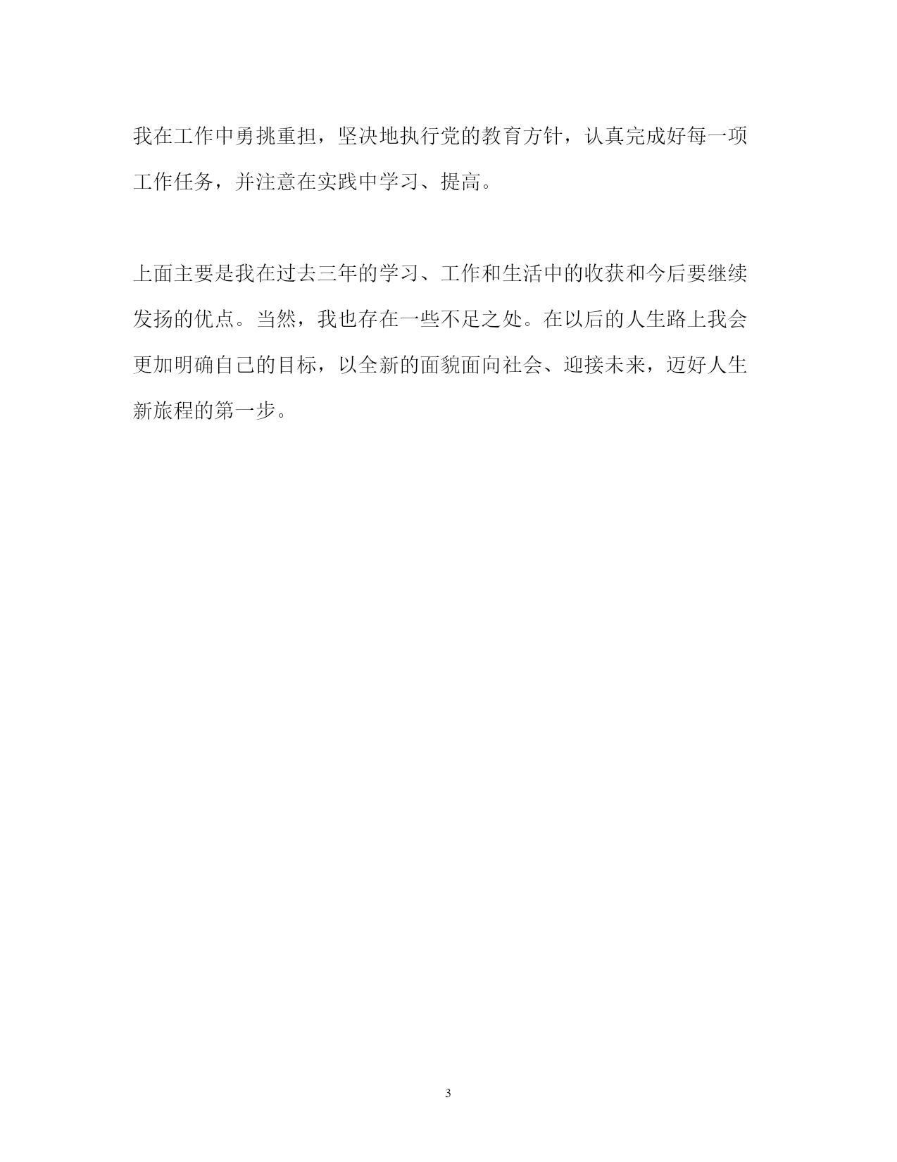 此资料由网络收集而来,如有侵权请告知上传者立即删除。资料共分享,我们负责传递知识。PAGEPAGE3硕士研究生应届毕业生自我评价硕士研究生应届毕业生自我评价自成为一名硕士研究生以来,这三年我的学习、工作和生活充实而有意义,收获很多,成长很快。我在政治上、思想上一直积极要求进步。进入XX大学后,通过参加业余党校和入党积极分子培训班的学习,我对建设有中国特色的社会主义理论和党的基本路线有了较深刻的认识,树立了坚定的主义信念,并光荣的加入了中国党。经过党组织1年预备期的考察,如期转为正式党员。我决心要做一名合格的、模范的党员,在学习、工作、思想上起带头作用,特别是在政治上起先锋模范作用。自入党以来,我时刻以党员的标准严格要求自己,拥护党的纲领,执行党的决议,履行党员的义务,遵守党的纪律,在群众中树立了一个党员的良好形象。我被评为XX大学年度优秀党员,我觉得这是党组织对我工作的承认,同时也是对我的鞭策,促使我不断完善自己,更加努力地工作,能为祖国和人民做出更大的贡献。我参加了XX大学研究生干部学校的培训,通过学习和讨论《xxx文选》、听取各种讲座以及其它丰富多彩的活动,我不但提高了理论水平,而且锻炼了各方面的.能力,并应用所学到的知识,积极配合学校开展研究生工作,为学校的建设做出自己应有的贡献。作为学生我从不放松学习,在第一年,我修完了导师指定的各门研究生课程,总学分达到了研究生培养计划的要求,成绩优秀。另外我还参加了教学实习,带本专业本科生的遗传毒理学实验课,以及协助本科班的毕业生完成毕业论文。后来进入实验室工作,广泛查阅了国内外相关的文献资料,从准备实验材料、摸索实验方法到完成实验设计都投入了大量的劳动。认真完成了毕业论文的写作,并顺利通过了硕士论文答辩。在学习和科研工作之余,我还热心社会工作,积极为同学服务。上研究生后我主动承担起临时班长的职务,在新生入学的一系列工作中充分发挥自己“老生”的优势,热情周到地为同学服务。尽管学业和科研任务繁重,但为了配合院学生工作组老师做好学生工作,我服从组织安排,在团学联中担任学生工作助理。高度的责任心和使命感促使我在工作中勇挑重担,坚决地执行党的教育方针,认真完成好每一项工作任务,并注意在实践中学习、提高。上面主要是我在过去三年的学习、工作和生活中的收获和今后要继续发扬的优点。当然,我也存在一些不足之处。在以后的人生路上我会更加明确自己的目标,以全新的面貌面向社会、迎接未来,迈好人生新旅程的第一步。