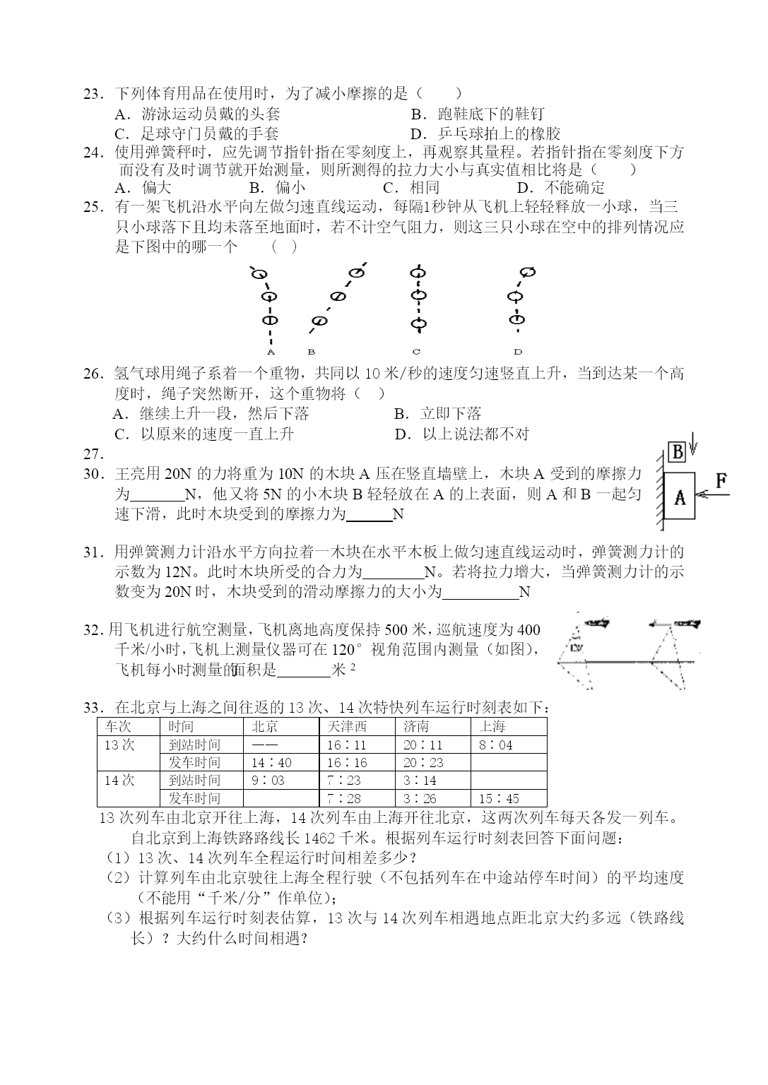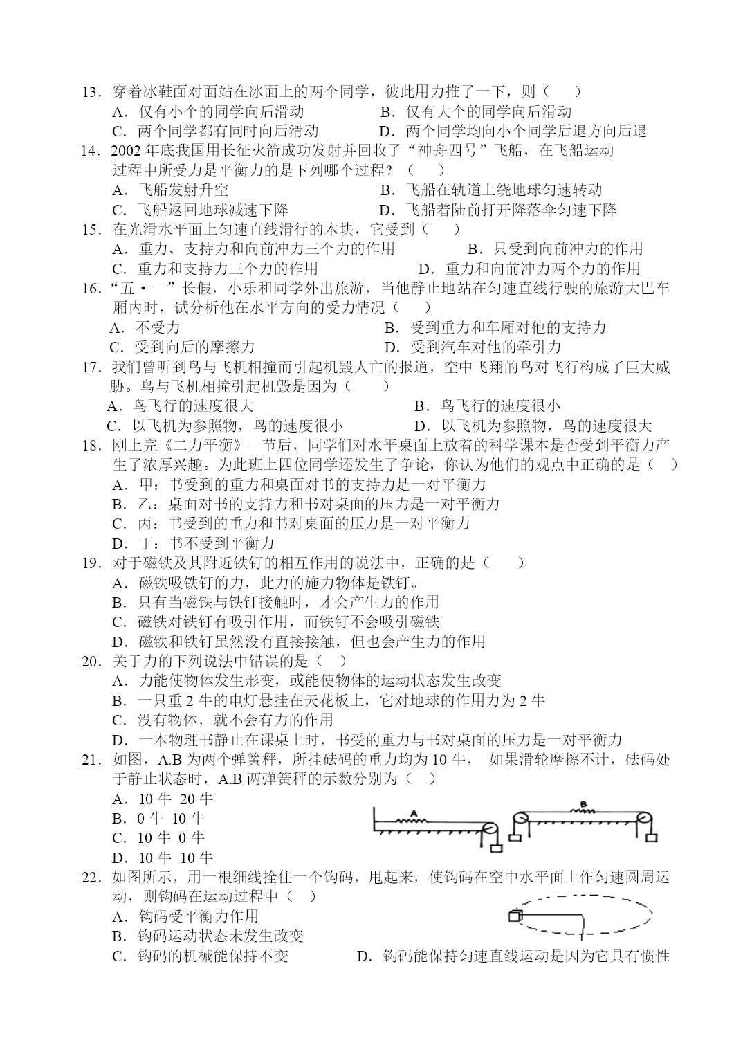 总复习2运动和力(2)1.下列体育用品在使用时,为了减小摩擦的是()A.游泳运动员戴的头套B.跑鞋底下的鞋钉C.足球守门员戴的手套D.乒乓球拍上的橡胶2.球运动员把足球踢向空中(如图)若不计空气阻力,则下列各图能正确表示足球在空中飞行时的受力情况的是(G表示重力,F表示脚对球的作用力)()3.人站在匀速上升的电梯上,下列的几对力中,哪一对是平衡力?()A.人的重力与电梯对人的支持力B.人对电梯的压力与电梯对人的支持力C.电梯的重力与电梯对人的支持力D.电梯的重力与电梯对地球的吸引力4.一个杯子放在水平桌面上,处于静止,下列各对力中属于平衡力的是()A.杯子受到的重力和杯子对桌面的压力B.杯子受到的重力和桌面对杯子的支持力C.杯子对桌面的压力和桌子受到的重力D.杯子对桌面压力和桌面对杯子的支持力5.一只黄岩蜜桔的重力大约为()A.0.05NB.0.5NC.5ND.50N6.此时此刻,也许你有点紧张,请务必冷静,静坐片刻,放松自己。首先请分析你现在的受力情况()A.只受到重力B.只受到支持力C.所受的合力为零D.受到摩擦作用7.下列事实中,最能说明力能改变物体运动状态的是:()A.人坐在软席沙发上B.跳伞运动员在空中沿竖直方向匀速下落C.足球运动员用头把飞来的足球顶回去D.用力压气球,气球被压扁8.当运动员杨帆同学举着杠铃站立不动时,班上的甲、乙、丙、丁四位同学为杠铃此时所受到的一对平衡力发生了争论,你认为他们的观点中正确的是()A.甲:杠铃受到杨帆的支持力和杠铃对杨帆的压力B.乙:杠铃受到杨帆的支持力和杠铃的重力C.丙:杠铃对杨帆的压力和杠铃的重力D.丁:杠铃的重力和杨帆对地面的支持力9.我国古代有位诗人乘船远眺,两岸风光尽收眼底,他深有感触,写下了动人的词句:“满眼风光多闪灼,看山恰似走来迎,……”。诗人选取的参照物是()A.山B.水C.风D.船10.在下列对物体的运动描述中,以地球为参照物的是()A.太阳东升西落B.行驶的车中乘客看路边的树木向后退C.月亮在云中穿行D.坐地日行八万能里,巡天遥看一千河11.关于力的描述中,下列说法正确的是()A.力是物体对物体作用B.力是使物体运动的原因C.某同学将铅球推出去,人对球有力的作用,但球对人没有作用力D.物体受到的力越大,其运动的速度越快12.售票员和乘客都坐在一辆行驶的汽车上,他们均以对方为参照物,下面正确说法()A.售票员认为汽车是运动的B.售票员认为乘客是运动的C.乘客认为售票员是运动的D.乘客认为车是静止的13.穿着冰鞋面对面站在冰面上的两个同学,彼此用力推了一下,则()A.仅有小个的同学向后滑动B.仅有大个的同学向后滑动C.两个同学都有同时向后滑动D.两个同学均向小个同学后退方向后退14.2002年底我国用长征火箭成功发射并回收了“神舟四号”飞船,在飞船运动过程中所受力是平衡力的是下列哪个过程?()A.飞船发射升空B.飞船在轨道上绕地球匀速转动C.飞船返回地球减速下降D.飞船着陆前打开降落伞匀速下降15.在光滑水平面上匀速直线滑行的木块,它受到()A.重力、支持力和向前冲力三个力的作用B.只受到向前冲力的作用C.重力和支持力三个力的作用D.重力和向前冲力两个力的作用16.“五·一”长假,小乐和同学外出旅游,当他静止地站在匀速直线行驶的旅游大巴车厢内时,试分析他在水平方向的受力情况()A.不受力B.受到重力和车厢对他的支持力C.受到向后的摩擦力D.受到汽车对他的牵引力17.我们曾听到鸟与飞机相撞而引起机毁人亡的报道,空中飞翔的鸟对飞行构成了巨大威胁。鸟与飞机相撞引起机毁是因为()A.鸟飞行的速度很大B.鸟飞行的速度很小C.以飞机为参照物,鸟的速度很小D.以飞机为参照物,鸟的速度很大18.刚上完《二力平衡》一节后,同学们对水平桌面上放着的科学课本是否受到平衡力产生了浓厚兴趣。为此班上四位同学还发生了争论,你认为他们的观点中正确的是()A.甲:书受到的重力和桌面对书的支持力是一对平衡力B.乙:桌面对书的支持力和书对桌面的压力是一对平衡力C.丙:书受到的重力和书对桌面的压力是一对平衡力D.丁:书不受到平衡力19.对于磁铁及其附近铁钉的相互作用的说法中,正确的是()A.磁铁吸铁钉的力,此力的施力物体是铁钉。B.只有当磁铁与铁钉接触时,才会产生力的作用C.磁铁对铁钉有吸引作用,而铁钉不会吸引磁铁D.磁铁和铁钉虽然没有直接接触,但也会产生力的作用20.关于力的下列说法中错误的是()A.力能使物体发生形变,或能使物体的运动状态发生改变B.一只重2牛的电灯悬挂在天花板上,它对地球的作用力为2牛C.没有物体,就不会