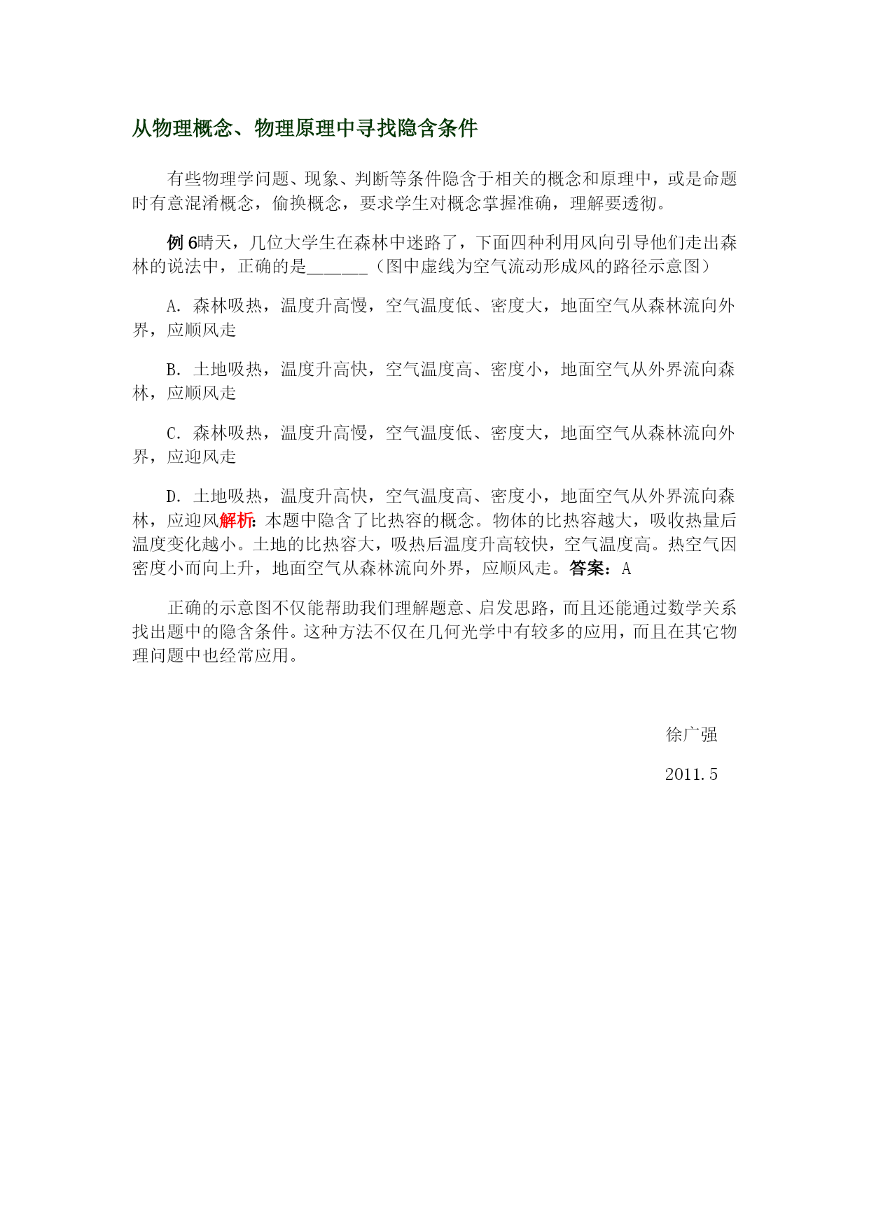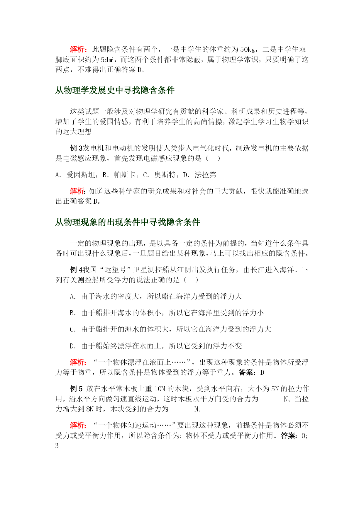 中考物理解题方法讲座专题讲座一挖掘题目中的隐含条件挖掘物理题中隐含条件的途径和方法,对物理学试题题型进行归类分析。这是解好物理题,必须要有的能力。在解物理习题时,经常会遇到这种情况,有些解题的必要条件,题中并为明确给出,而是隐含在字里行间。充分挖掘隐含条件,明确题目要求,采用合适方法,选择正确答案,是解好这类题的关键。这一讲就如何挖掘试题中的隐含条件,提高解题能力作一例析。从关键词中挖掘隐含条件在物理题中,常见的关键用语有:表现为极值条件的用语,如“最大”、“最小”、“至少”、“刚好”等,它们均隐含着某些物理量可取特殊值;表现为理想化模型的用语,如“理想滑轮”、“轻质杠杆”、“光滑水平面”等,扣住关键用语,挖掘隐含条件,能使解题灵感顿生。例1一个物体在平衡力的作用下,在光滑水平面上做匀速直线运动,当这对平衡力突然消失,则物体将()A.立刻停止运动;B.运动速度越来越快;C.速度减慢,最后停止;D.仍作匀速直线运动解析:题中“光滑水平面”为关键词。光滑水平面意味着物体不受摩擦力的作用。题目中的物体待平衡力消失后,将不再受力的作用,因此仍要保持匀速直线运动(牛顿第一定律)。答案:D从物理学常识中找隐含条件有些题目几乎没有条件,但仔细研究就会发现条件其实全部隐含于物理常识中,这就要求学生根据题意进行发散性思维,努力挖掘相关知识,在条件不足的情况下,根据常识假设适当的条件和数据以弥补题中明确给出的已知条件的不足。例2一个中学生对地面的压强大约是()A.10Pa;B.100Pa;C.1000Pa;D.10000Pa解析:此题隐含条件有两个,一是中学生的体重约为50kg,二是中学生双脚底面积约为5dm2,而这两个条件都非常隐蔽,属于物理学常识,只要明确了这两点,不难得出正确答案D。从物理学发展史中寻找隐含条件这类试题一般涉及对物理学研究有贡献的科学家、科研成果和历史进程等,增加了学生的爱国情感,有利于培养学生的高尚情操,激起学生学习生物学知识的远大理想。例3发电机和电动机的发明使人类步入电气化时代,制造发电机的主要依据是电磁感应现象,首先发现电磁感应现象的是()A.爱因斯坦;B.帕斯卡;C.奥斯特;D.法拉第解析:知道这些科学家的研究成果和对社会的巨大贡献,很快就能准确地选出正确答案D。从物理现象的出现条件中寻找隐含条件一定的物理现象的出现,是以具备一定的条件为前提的,当知道什么条件具备时可出现什么现象后,一旦题目给出某种现象,马上可以找出相应的隐含条件。例4我国“远望号”卫星测控船从江阴出发执行任务,由长江进入海洋。下列有关测控船所受浮力的说法正确的是()A.由于海水的密度大,所以船在海洋力受到的浮力大B.由于船排开海水的体积小,所以它在海洋里受到的浮力小C.由于船排开的海水的体积大,所以它在海洋力受到的浮力大D.由于船始终漂浮在水面上,所以它受到的浮力不变解析:“一个物体漂浮在液面上……”,出现这种现象的条件是物体所受浮力等于物重,所以隐含条件是物体受到的浮力等于重力。答案:D例5放在水平常木板上重10N的木块,受到水平向右,大小为5N的拉力作用,沿水平方向做匀速直线运动,这时木板水平方向受的合力为_______N。当拉力增大到8N时,木块受到的合力为_______N。解析:“一个物体匀速运动……”要出现这种现象,前提条件是物体必须不受力或受平衡力作用,所以隐含条件为:物体不受力或受平衡力作用。答案:0;3从物理概念、物理原理中寻找隐含条件有些物理学问题、现象、判断等条件隐含于相关的概念和原理中,或是命题时有意混淆概念,偷换概念,要求学生对概念掌握准确,理解要透彻。例6晴天,几位大学生在森林中迷路了,下面四种利用风向引导他们走出森林的说法中,正确的是_______(图中虚线为空气流动形成风的路径示意图)A.森林吸热,温度升高慢,空气温度低、密度大,地面空气从森林流向外界,应顺风走B.土地吸热,温度升高快,空气温度高、密度小,地面空气从外界流向森林,应顺风走C.森林吸热,温度升高慢,空气温度低、密度大,地面空气从森林流向外界,应迎风走D.土地吸热,温度升高快,空气温度高、密度小,地面空气从外界流向森林,应迎风解析:本题中隐含了比热容的概念。物体的比热容越大,吸收热量后温度变化越小。土地的比热容大,吸热后温度升高较快,空气温度高。热空气因密度小而向上升,地面空气从森林流向外界,应顺风走。答案:A正确的示意图不仅能帮助我们理解题意、启发思路,而且还能通过数学关系找出题中的隐含条件。这种方法不仅在几何光学中有较多的应用,而且在其它物理问题中也经常应用。徐广强2011.5