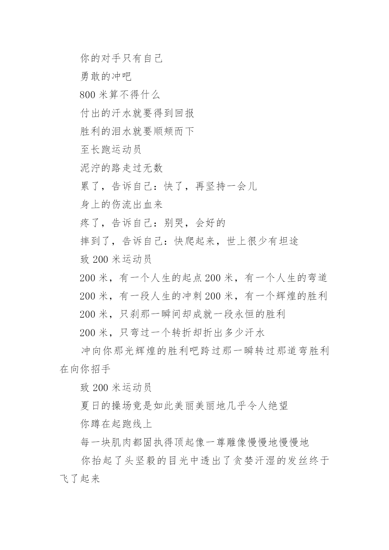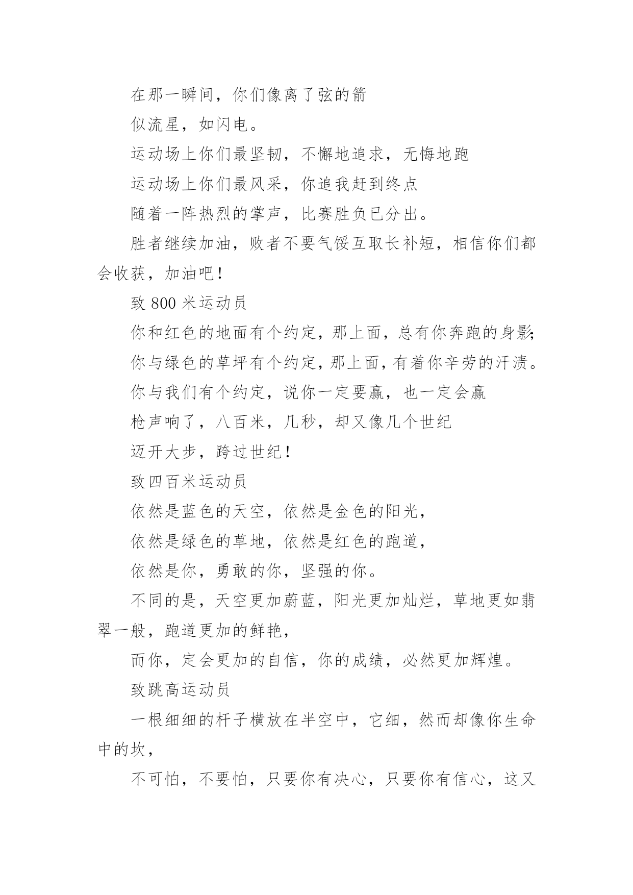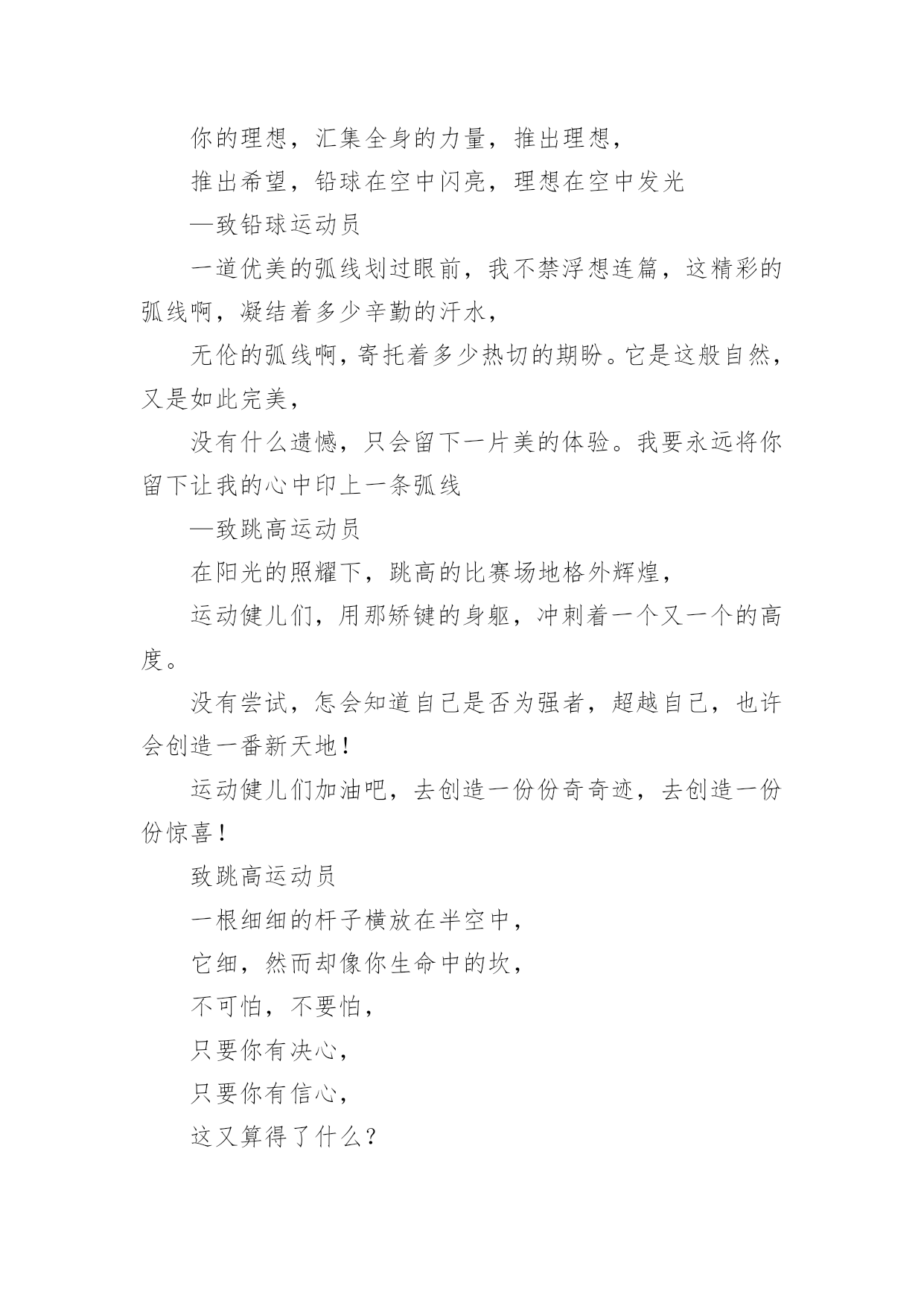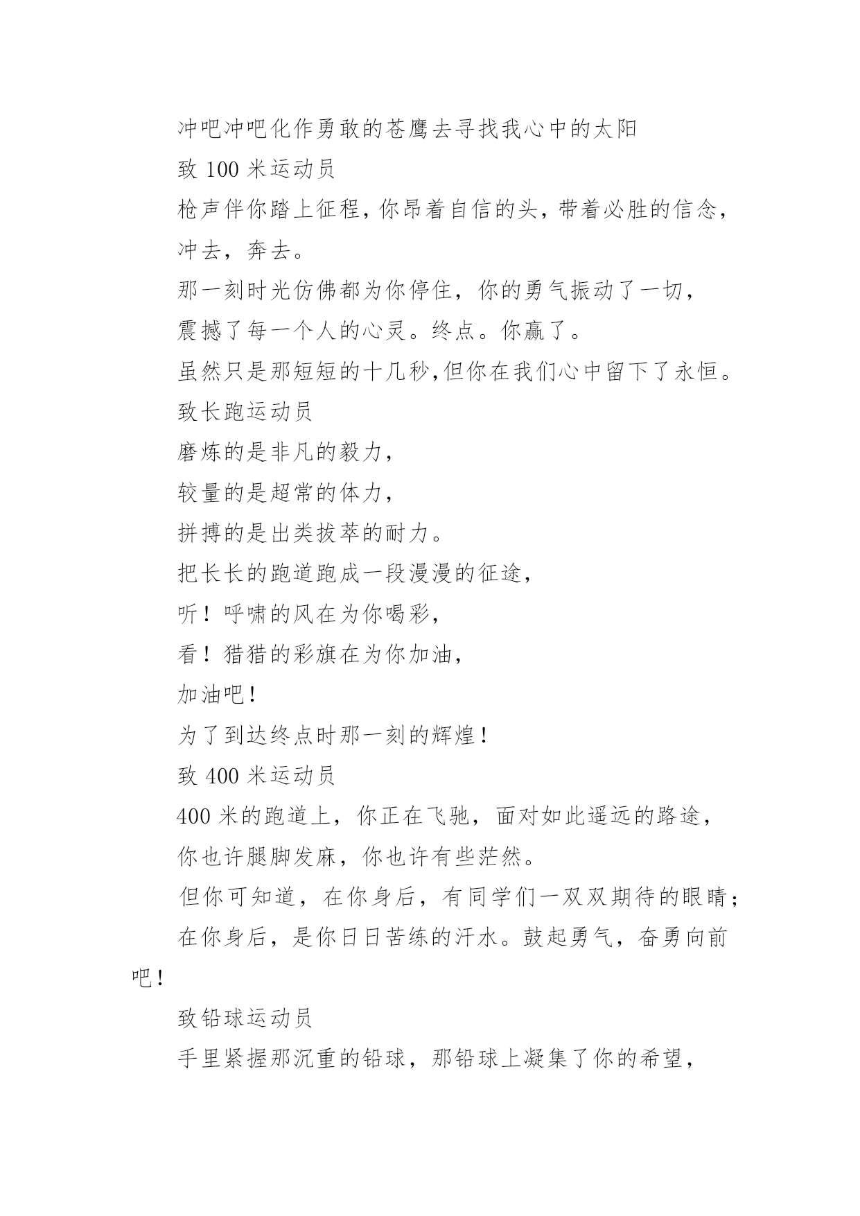小学的运动会广播稿如果你是学校广播站的播音员,肯定会知道广播前都会预先做好广播稿,广播稿写得好才会有好的节目效果,那么你有了解过广播稿吗?下面是小编为大家收集的小学的运动会广播稿,希望对大家有所帮助。小学的运动会广播稿1至200米运动员百米跑道虽不长,运动健儿志高扬。摸拳擦掌跃欲试,分秒必争勇夺魁。实验学校有勇女,巾帼岂将须眉让。古有木兰冲杀场,今有郎萍跑百米。立志创新校记录,勇夺奥运第一枚。至800米运动员迎接你的,是800米跑道等待你的,是漫漫征途勇敢的冲吧,勇士们不要畏惧对手的强大你的对手只有自己勇敢的冲吧800米算不得什么付出的汗水就要得到回报胜利的泪水就要顺颊而下至长跑运动员泥泞的路走过无数累了,告诉自己:快了,再坚持一会儿身上的伤流出血来疼了,告诉自己:别哭,会好的摔到了,告诉自己:快爬起来,世上很少有坦途致200米运动员200米,有一个人生的起点200米,有一个人生的弯道200米,有一段人生的冲刺200米,有一个辉煌的胜利200米,只刹那一瞬间却成就一段永恒的胜利200米,只弯过一个转折却折出多少汗水冲向你那光辉煌的胜利吧跨过那一瞬转过那道弯胜利在向你招手致200米运动员夏日的操场竟是如此美丽美丽地几乎令人绝望你蹲在起跑线上每一块肌肉都固执得顶起像一尊雕像慢慢地慢慢地你抬起了头坚毅的目光中透出了贪婪汗湿的发丝终于飞了起来冲吧冲吧化作勇敢的苍鹰去寻找我心中的太阳致100米运动员枪声伴你踏上征程,你昂着自信的头,带着必胜的信念,冲去,奔去。那一刻时光仿佛都为你停住,你的勇气振动了一切,震撼了每一个人的心灵。终点。你赢了。虽然只是那短短的十几秒,但你在我们心中留下了永恒。致长跑运动员磨炼的是非凡的毅力,较量的是超常的体力,拼搏的是出类拔萃的耐力。把长长的跑道跑成一段漫漫的征途,听!呼啸的风在为你喝彩,看!猎猎的彩旗在为你加油,加油吧!为了到达终点时那一刻的辉煌!致400米运动员400米的跑道上,你正在飞驰,面对如此遥远的路途,你也许腿脚发麻,你也许有些茫然。但你可知道,在你身后,有同学们一双双期待的眼睛;在你身后,是你日日苦练的汗水。鼓起勇气,奋勇向前吧!致铅球运动员手里紧握那沉重的铅球,那铅球上凝集了你的希望,你的理想,汇集全身的力量,推出理想,推出希望,铅球在空中闪亮,理想在空中发光—致铅球运动员一道优美的弧线划过眼前,我不禁浮想连篇,这精彩的弧线啊,凝结着多少辛勤的汗水,无伦的弧线啊,寄托着多少热切的期盼。它是这般自然,又是如此完美,没有什么遗憾,只会留下一片美的体验。我要永远将你留下让我的心中印上一条弧线—致跳高运动员在阳光的照耀下,跳高的比赛场地格外辉煌,运动健儿们,用那矫键的身躯,冲刺着一个又一个的高度。没有尝试,怎会知道自己是否为强者,超越自己,也许会创造一番新天地!运动健儿们加油吧,去创造一份份奇奇迹,去创造一份份惊喜!致跳高运动员一根细细的杆子横放在半空中,它细,然而却像你生命中的坎,不可怕,不要怕,只要你有决心,只要你有信心,这又算得了什么?没有经历过坎坷就不会有成功的喜悦,一次次的战胜,一次次的超越自己,加油吧,努力跳过这挡在你前面的坎。去燃烧你的青春!致跳远运动员离弦箭似的助跑,蚂蚱似的起跳,空中的走步表演,引起阵阵惊叹,落地的瞬间,你触到了沙的柔软,不管怎样,荣誉永远属于你。致跳远运动员蚂蚱似的起跳,空中的走步表演,引起阵阵惊叹,落地的瞬间,你触到了沙的柔软,不管怎样,荣誉永远属于你。致1500米运动员你是否感到,烈日的照射,那是烈日对你的祝福你是否感到,彩旗的摇摆,那是彩旗对你的呐喊人们的注视,那是人们对你的希望祝福在你身边,呐喊在你耳边希望在你心中致长跑运动员在那一瞬间,你们像离了弦的箭似流星,如闪电。运动场上你们最坚韧,不懈地追求,无悔地跑运动场上你们最风采,你追我赶到终点随着一阵热烈的掌声,比赛胜负已分出。胜者继续加油,败者不要气馁互取长补短,相信你们都会收获,加油吧!致800米运动员你和红色的地面有个约定,那上面,总有你奔跑的身影;你与绿色的草坪有个约定,那上面,有着你辛劳的汗渍。你与我们有个约定,说你一定要赢,也一定会赢枪声响了,八百米,几秒,却又像几个世纪迈开大步,跨过世纪!致四百米运动员依然是蓝色的天空,依然是金色的阳光,依然是绿色的草地,依然是红色的跑道,依然是你,勇敢的你,坚强的你。不同的是,天空更加蔚蓝,阳光更加灿烂,草地更如翡翠一般,跑道更加的鲜艳,而你,定会更加的自信,你的成绩,必然更加辉煌。致跳高运动员一根细细的杆子横放在半空中,它细,然而却像你生命中的坎,不可怕,不要怕,只要你有决心,只要你有信心,这又算得了什么?没有经历过坎坷就不会有成功的喜悦,一次次的战胜,一次次的超越自己,加油吧,努力跳过这挡在你前面的坎。去燃烧你的青春!致跳远运动员蚂蚱似的起跳,空中的