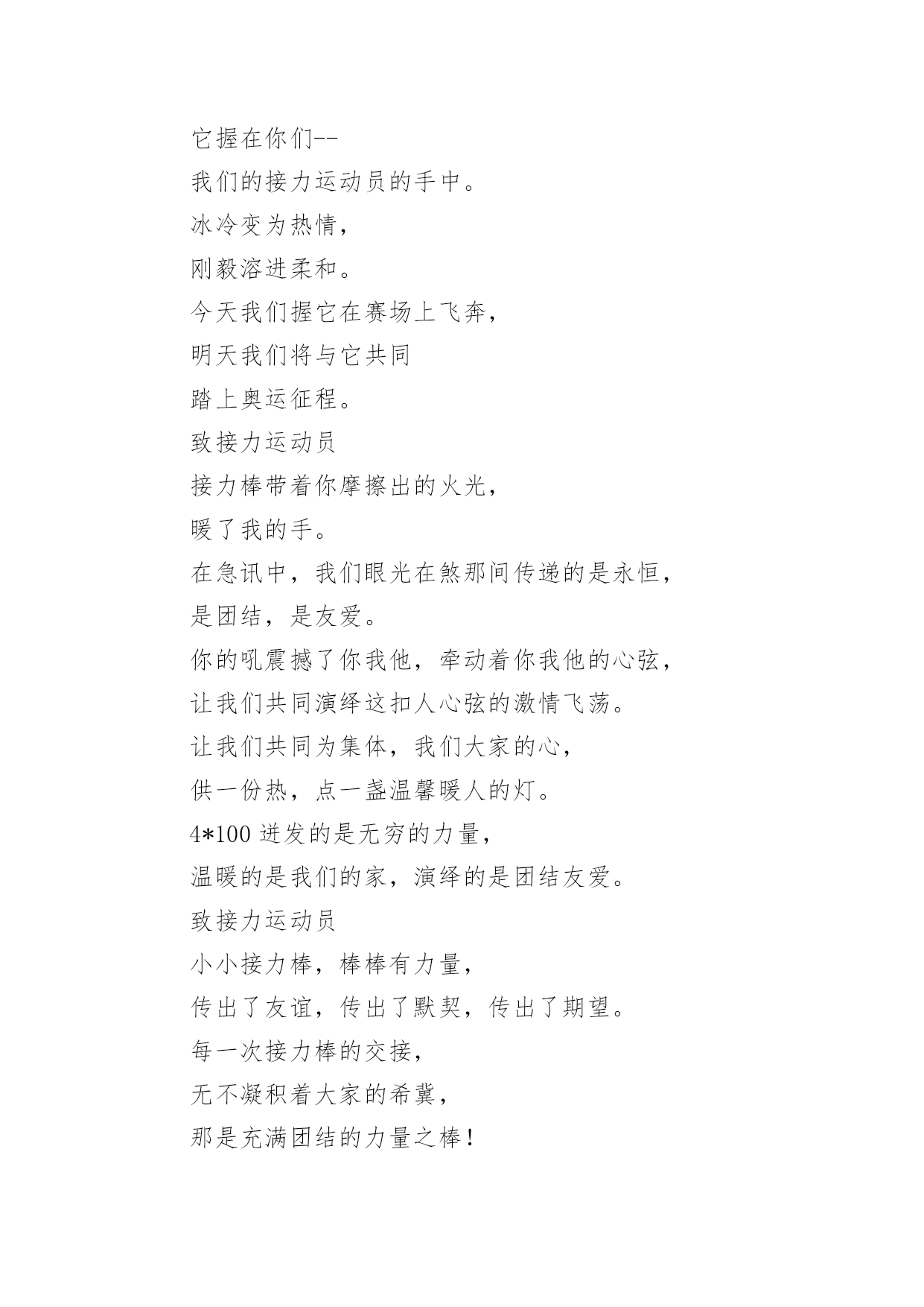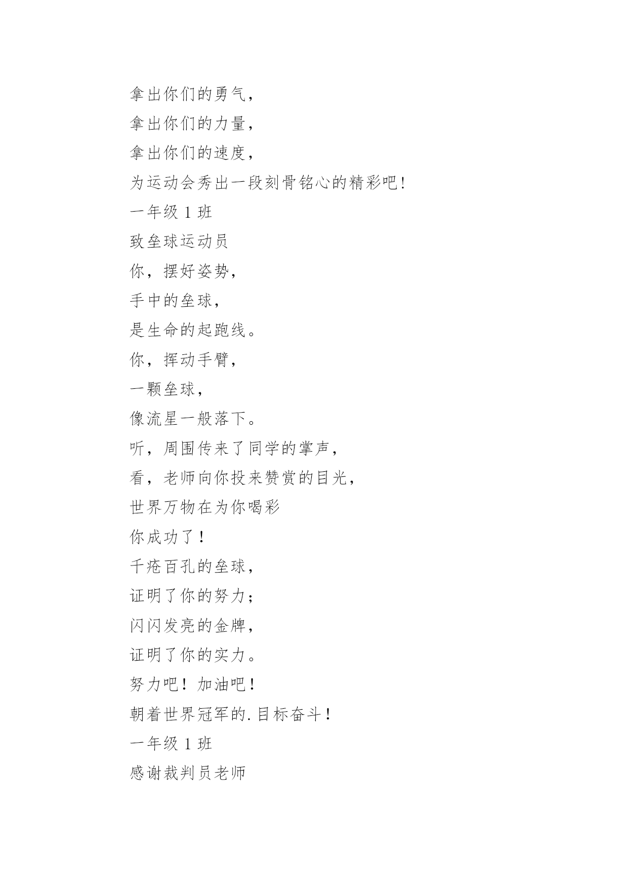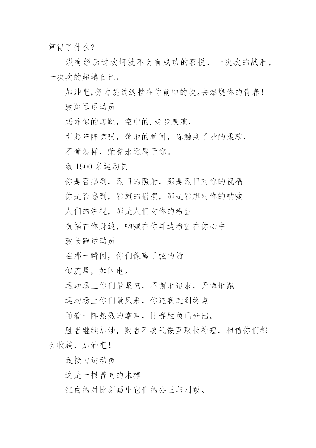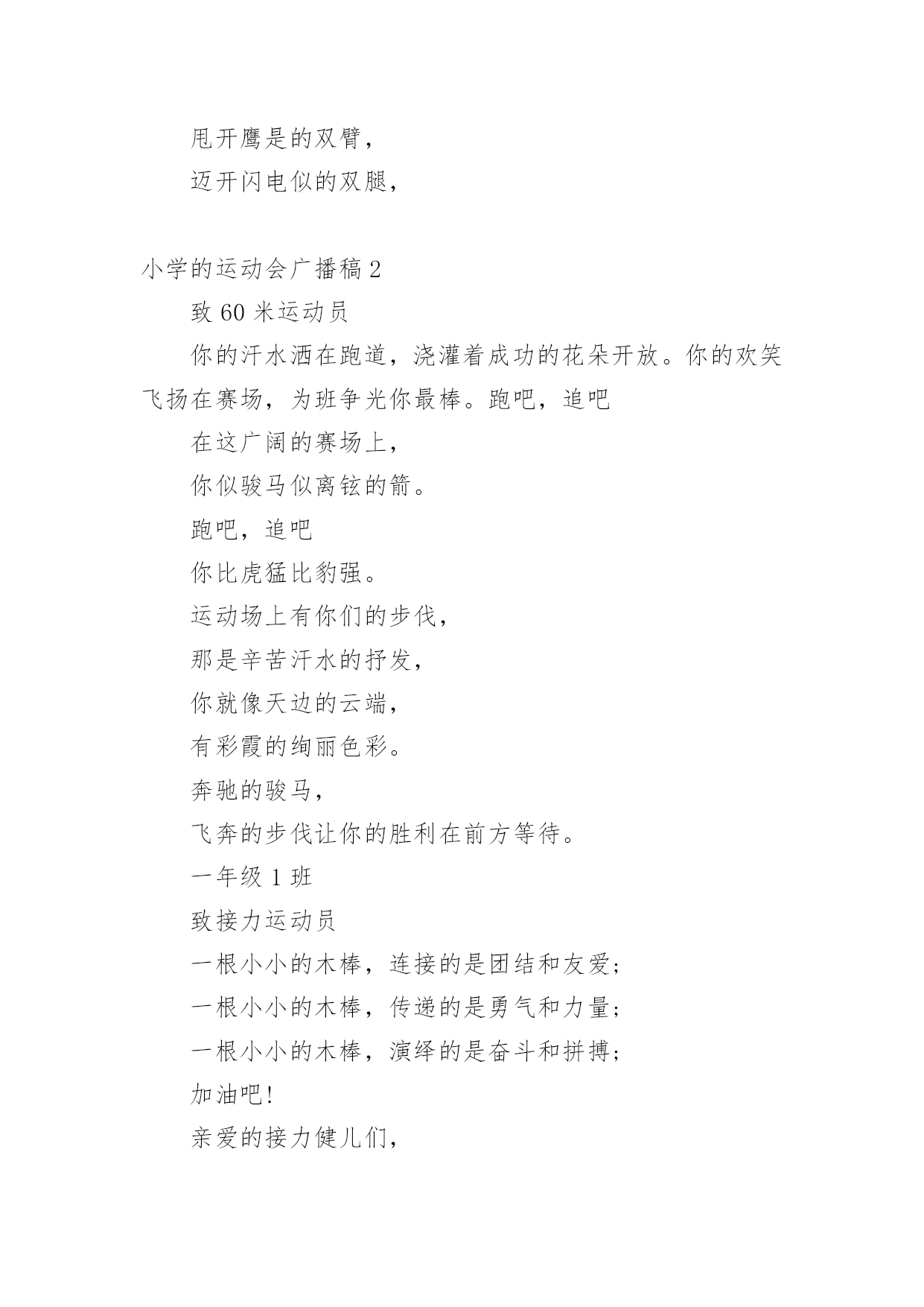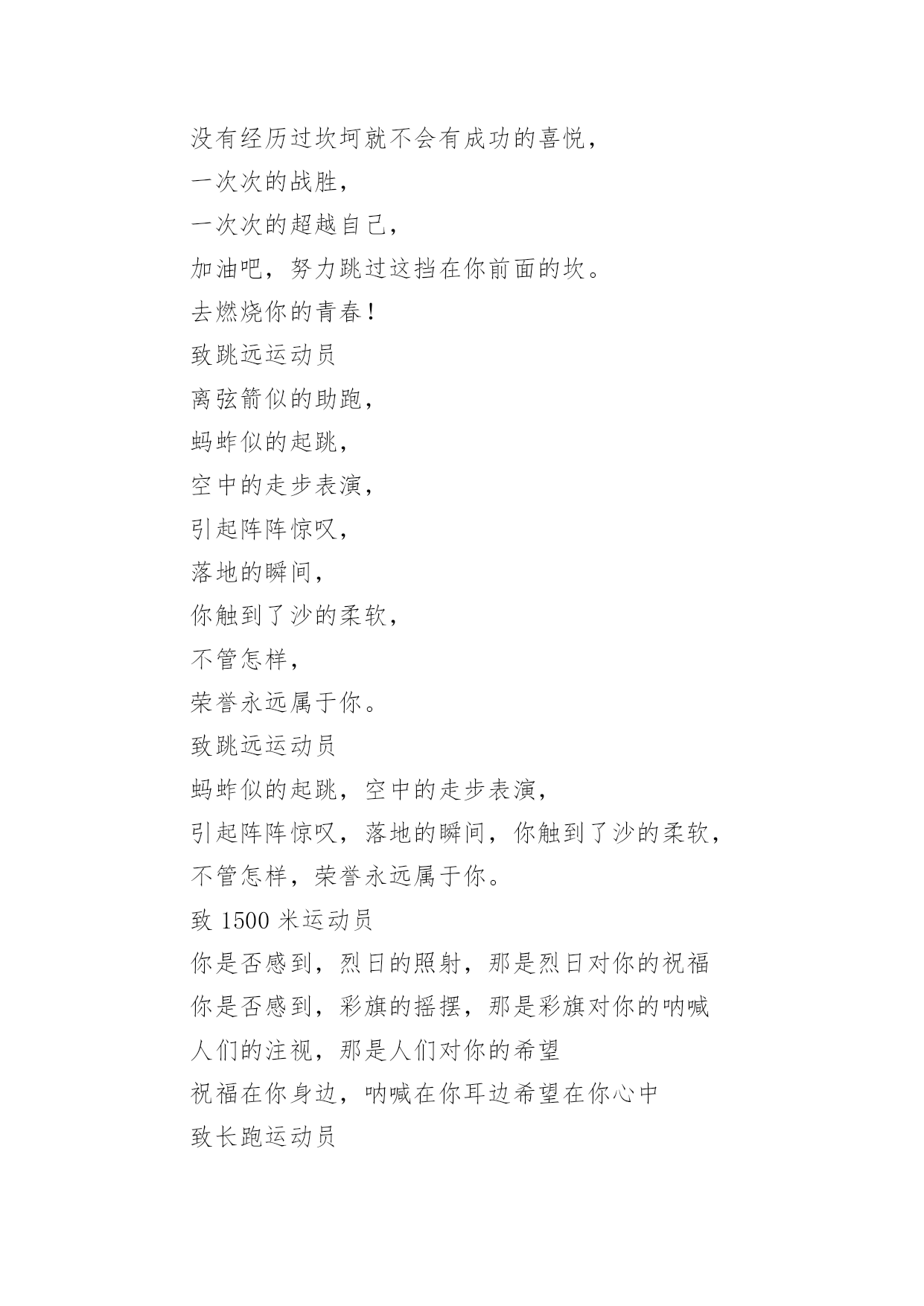 小学的运动会广播稿如果你是学校广播站的播音员,肯定会知道广播前都会预先做好广播稿,广播稿写得好才会有好的节目效果,那么你有了解过广播稿吗?下面是小编为大家收集的小学的运动会广播稿,希望对大家有所帮助。小学的运动会广播稿1至200米运动员百米跑道虽不长,运动健儿志高扬。摸拳擦掌跃欲试,分秒必争勇夺魁。实验学校有勇女,巾帼岂将须眉让。古有木兰冲杀场,今有郎萍跑百米。立志创新校记录,勇夺奥运第一枚。至800米运动员迎接你的,是800米跑道等待你的,是漫漫征途勇敢的冲吧,勇士们不要畏惧对手的强大你的对手只有自己勇敢的冲吧800米算不得什么付出的汗水就要得到回报胜利的泪水就要顺颊而下至长跑运动员泥泞的路走过无数累了,告诉自己:快了,再坚持一会儿身上的伤流出血来疼了,告诉自己:别哭,会好的摔到了,告诉自己:快爬起来,世上很少有坦途致200米运动员200米,有一个人生的起点200米,有一个人生的弯道200米,有一段人生的冲刺200米,有一个辉煌的胜利200米,只刹那一瞬间却成就一段永恒的胜利200米,只弯过一个转折却折出多少汗水冲向你那光辉煌的胜利吧跨过那一瞬转过那道弯胜利在向你招手致200米运动员夏日的操场竟是如此美丽美丽地几乎令人绝望你蹲在起跑线上每一块肌肉都固执得顶起像一尊雕像慢慢地慢慢地你抬起了头坚毅的目光中透出了贪婪汗湿的发丝终于飞了起来冲吧冲吧化作勇敢的苍鹰去寻找我心中的太阳致100米运动员枪声伴你踏上征程,你昂着自信的头,带着必胜的信念,冲去,奔去。那一刻时光仿佛都为你停住,你的勇气振动了一切,震撼了每一个人的心灵。终点。你赢了。虽然只是那短短的十几秒,但你在我们心中留下了永恒。致长跑运动员磨炼的是非凡的毅力,较量的是超常的体力,拼搏的是出类拔萃的耐力。把长长的跑道跑成一段漫漫的征途,听!呼啸的风在为你喝彩,看!猎猎的彩旗在为你加油,加油吧!为了到达终点时那一刻的辉煌!致400米运动员400米的跑道上,你正在飞驰,面对如此遥远的路途,你也许腿脚发麻,你也许有些茫然。但你可知道,在你身后,有同学们一双双期待的眼睛;在你身后,是你日日苦练的汗水。鼓起勇气,奋勇向前吧!致铅球运动员手里紧握那沉重的铅球,那铅球上凝集了你的希望,你的理想,汇集全身的力量,推出理想,推出希望,铅球在空中闪亮,理想在空中发光—致铅球运动员一道优美的弧线划过眼前,我不禁浮想连篇,这精彩的弧线啊,凝结着多少辛勤的汗水,无伦的弧线啊,寄托着多少热切的期盼。它是这般自然,又是如此完美,没有什么遗憾,只会留下一片美的体验。我要永远将你留下让我的心中印上一条弧线—致跳高运动员在阳光的照耀下,跳高的比赛场地格外辉煌,运动健儿们,用那矫键的身躯,冲刺着一个又一个的高度。没有尝试,怎会知道自己是否为强者,超越自己,也许会创造一番新天地!运动健儿们加油吧,去创造一份份奇奇迹,去创造一份份惊喜!致跳高运动员一根细细的杆子横放在半空中,它细,然而却像你生命中的坎,不可怕,不要怕,只要你有决心,只要你有信心,这又算得了什么?没有经历过坎坷就不会有成功的喜悦,一次次的战胜,一次次的超越自己,加油吧,努力跳过这挡在你前面的坎。去燃烧你的青春!致跳远运动员离弦箭似的助跑,蚂蚱似的起跳,空中的走步表演,引起阵阵惊叹,落地的瞬间,你触到了沙的柔软,不管怎样,荣誉永远属于你。致跳远运动员蚂蚱似的起跳,空中的走步表演,引起阵阵惊叹,落地的瞬间,你触到了沙的柔软,不管怎样,荣誉永远属于你。致1500米运动员你是否感到,烈日的照射,那是烈日对你的祝福你是否感到,彩旗的摇摆,那是彩旗对你的呐喊人们的注视,那是人们对你的希望祝福在你身边,呐喊在你耳边希望在你心中致长跑运动员在那一瞬间,你们像离了弦的箭似流星,如闪电。运动场上你们最坚韧,不懈地追求,无悔地跑运动场上你们最风采,你追我赶到终点随着一阵热烈的掌声,比赛胜负已分出。胜者继续加油,败者不要气馁互取长补短,相信你们都会收获,加油吧!致800米运动员你和红色的地面有个约定,那上面,总有你奔跑的身影;你与绿色的草坪有个约定,那上面,有着你辛劳的汗渍。你与我们有个约定,说你一定要赢,也一定会赢枪声响了,八百米,几秒,却又像几个世纪迈开大步,跨过世纪!致四百米运动员依然是蓝色的天空,依然是金色的阳光,依然是绿色的草地,依然是红色的跑道,依然是你,勇敢的你,坚强的你。不同的是,天空更加蔚蓝,阳光更加灿烂,草地更如翡翠一般,跑道更加的鲜艳,而你,定会更加的自信,你的成绩,必然更加辉煌。致跳高运动员一根细细的杆子横放在半空中,它细,然而却像你生命中的坎,不可怕,不要怕,只要你有决心,只要你有信心,这又算得了什么?没有经历过坎坷就不会有成功的喜悦,一次次的战胜,一次次的超越自己,加油吧,努力跳过这挡在你前面的坎。去燃烧你的青春!致跳远运动员蚂蚱似的起跳,空中的