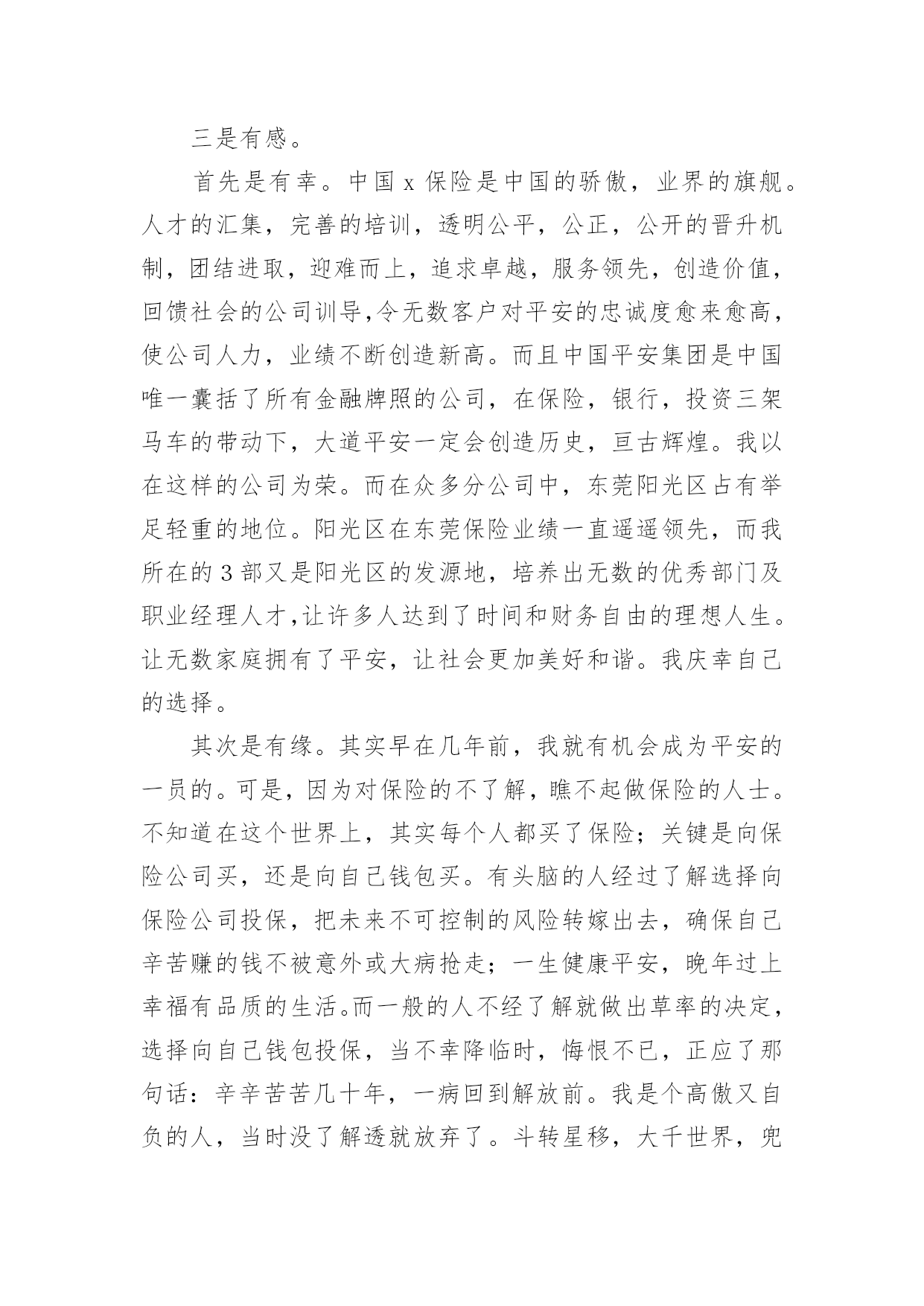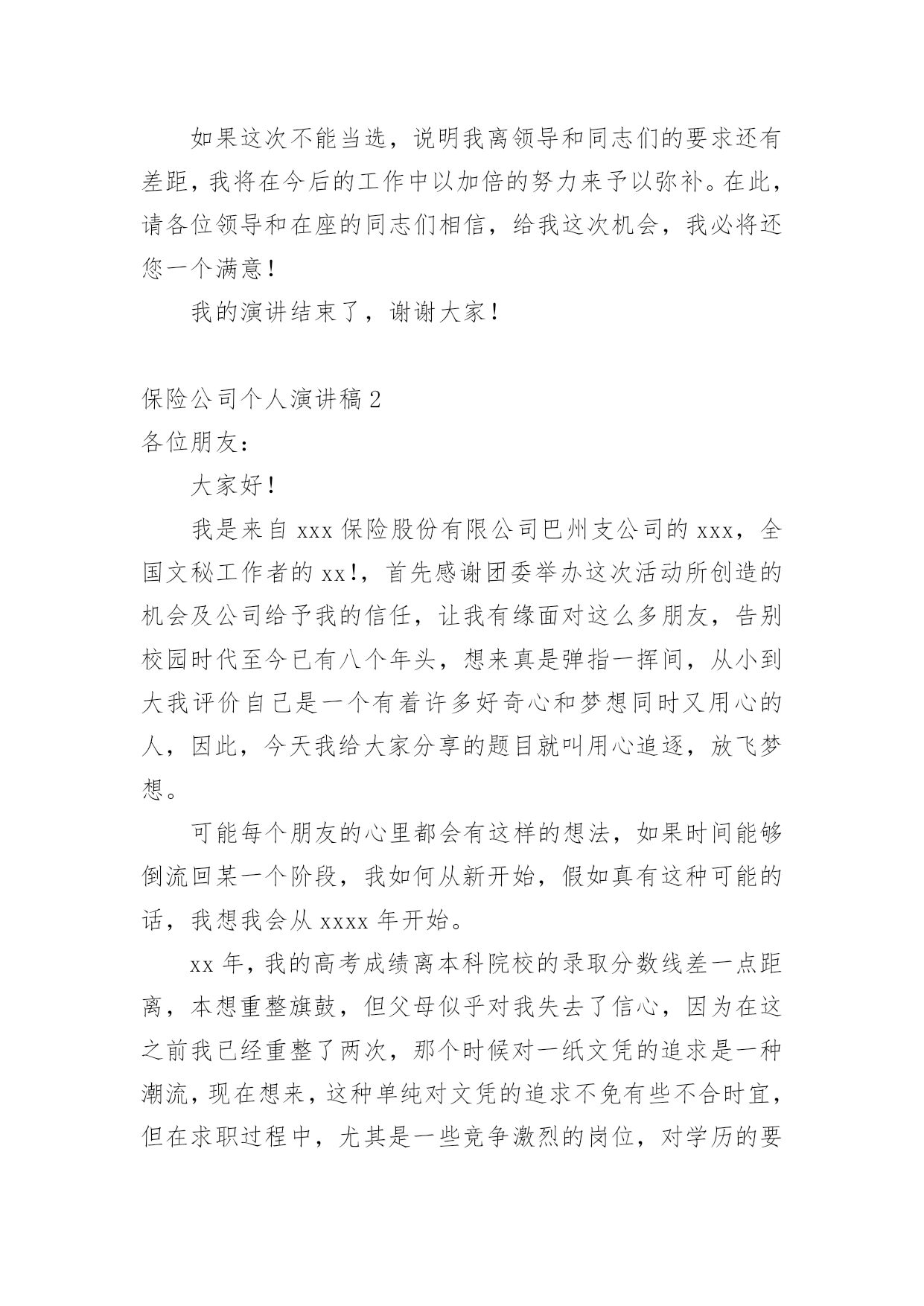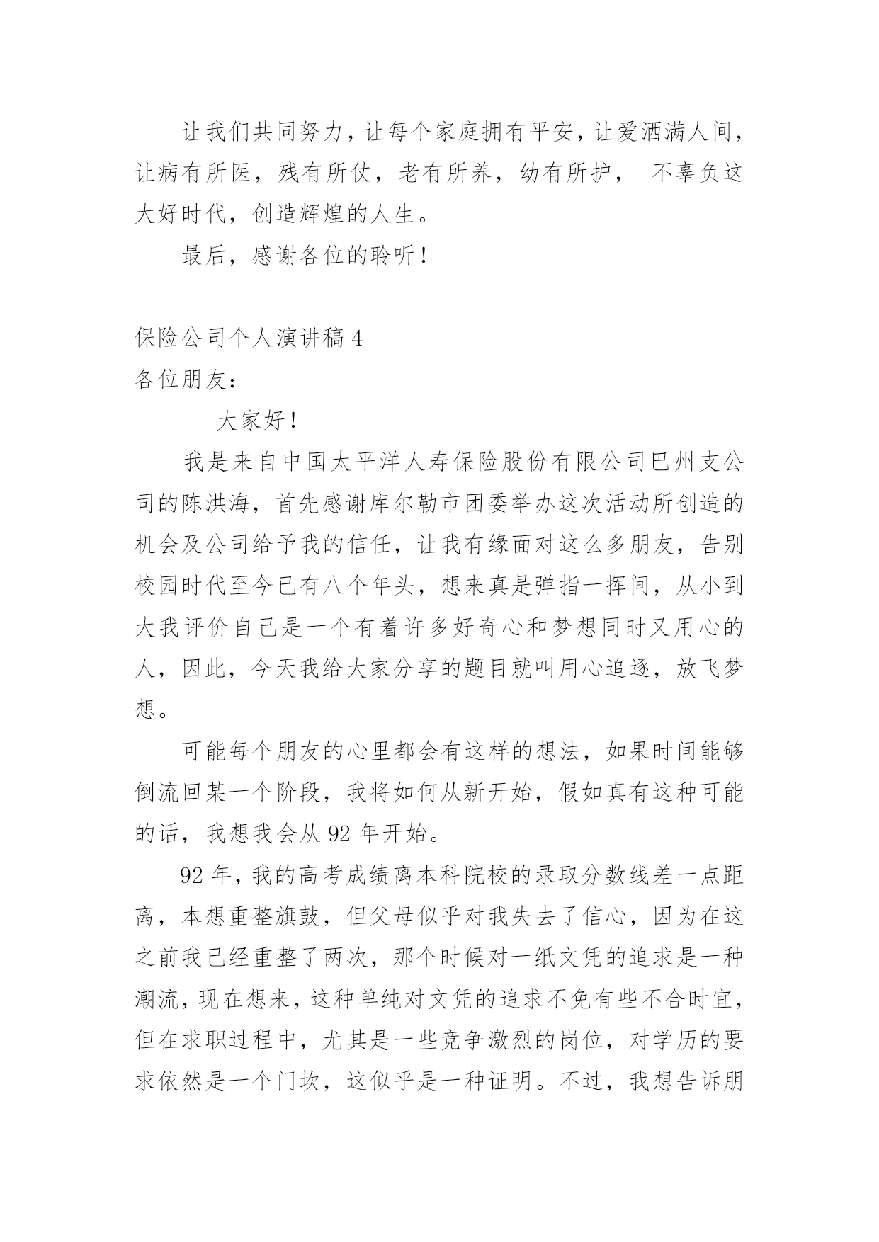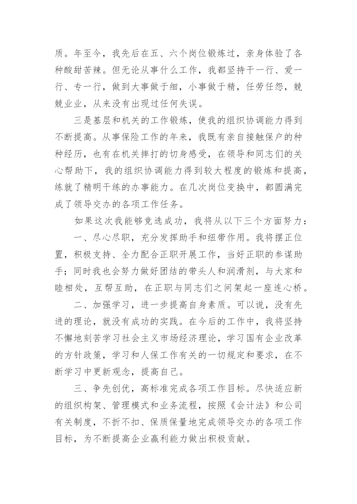 保险公司个人演讲稿通过对演讲稿语言的推究可以提高语言的表现力,增强语言的感染力。在快速变化和不断变革的新时代,我们使用上演讲稿的情况与日俱增,大家知道演讲稿的格式吗?以下是小编帮大家整理的保险公司个人演讲稿,仅供参考,大家一起来看看吧。保险公司个人演讲稿1各位领导、同志们:大家好!我叫,今年岁,大专文化程度,年月份调入人保--支公司工作,先后担任出纳、会计、财务科长等职务,年调入市公司审计处工作,现任副科级审计员。今天,我竞争的岗位是财务中心主任助理或营销管理部副经理。参加这次竞选,我感到具备以下三个条件:一是对保险业务的浓厚兴趣,使我积累了比较丰富的业务知识。兴趣是最好的老师。多年来,我基本上都在财务会计岗位工作。但由于对保险业务的爱好,我始终坚持自我加压,一刻也没有放松业务学习。先后自学了财务、统计和审计等相关的业务知识,并撰写了大量的学习笔记,业务基础得到不断巩固和提高。二是多年的.工作实践,使我养成了爱岗敬业的良好品质。年至今,我先后在五、六个岗位锻炼过,亲身体验了各种酸甜苦辣。但无论从事什么工作,我都坚持干一行、爱一行、专一行,做到大事做于细,小事做于精,任劳任怨,兢兢业业,从来没有出现过任何失误。三是基层和机关的工作锻炼,使我的组织协调能力得到不断提高。从事保险工作的年来,我既有亲自接触保户的种种经历,也有在机关摔打的切身感受,在领导和同志们的关心帮助下,我的组织协调能力得到较大程度的锻炼和提高,练就了精明干练的办事能力。在几次岗位变换中,都圆满完成了领导交办的各项工作任务。如果这次我能够竞选成功,我将从以下三个方面努力:一、尽心尽职,充分发挥助手和纽带作用。我将摆正位置,积极支持、全力配合正职开展工作,当好正职的参谋助手;同时我也会努力做好团结的带头人和润滑剂,与大家和睦相处,互帮互助,在正职与同志们之间架起一座连心桥。二、加强学习,进一步提高自身素质。可以说,没有先进的理论,就没有成功的实践。在今后的工作中,我将坚持不懈地刻苦学习社会主义市场经济理论,学习国有企业改革的方针政策,学习和人保工作有关的一切规定和要求,在不断学习中更新观念,提高自己。三、争先创优,高标准完成各项工作目标。尽快适应新的组织构架、管理模式和业务流程,按照《会计法》和公司有关制度,不折不扣、保质保量地完成领导交办的各项工作目标,为不断提高企业赢利能力做出积极贡献。如果这次不能当选,说明我离领导和同志们的要求还有差距,我将在今后的工作中以加倍的努力来予以弥补。在此,请各位领导和在座的同志们相信,给我这次机会,我必将还您一个满意!我的演讲结束了,谢谢大家!保险公司个人演讲稿2各位朋友:大家好!我是来自xxx保险股份有限公司巴州支公司的xxx,全国文秘工作者的xx!,首先感谢团委举办这次活动所创造的机会及公司给予我的信任,让我有缘面对这么多朋友,告别校园时代至今已有八个年头,想来真是弹指一挥间,从小到大我评价自己是一个有着许多好奇心和梦想同时又用心的人,因此,今天我给大家分享的题目就叫用心追逐,放飞梦想。可能每个朋友的心里都会有这样的想法,如果时间能够倒流回某一个阶段,我如何从新开始,假如真有这种可能的话,我想我会从xxxx年开始。xx年,我的高考成绩离本科院校的录取分数线差一点距离,本想重整旗鼓,但父母似乎对我失去了信心,因为在这之前我已经重整了两次,那个时候对一纸文凭的追求是一种潮流,现在想来,这种单纯对文凭的追求不免有些不合时宜,但在求职过程中,尤其是一些竞争激烈的岗位,对学历的要求依然是一个门坎,这似乎是一种证明。不过,我想告诉朋友们的是最好的证明是在现实中去用心成长,在不断成长的过程中去触摸你的梦想,一纸文凭可能是一份职业的叩门砖,而生活的大门却要我们用心灵来开启。95年大学毕业,因为客观原因,我和同学们没有机会进入当时梦寐以求的塔石化炼油厂,不过,幸运的是另外一扇大门向我们打开——南疆一座新成立的股份制小炼油厂,仰望厂区上方的灿烂星空,心情是那样激动,毕竟,我可以养活自己了,和第一次找到工作的朋友们一样,心情简单而又快乐。在这里,我用心珍惜每一个实践机会,因为用心,我全身心地带领工友废寝忘食地安装设备、起草开工方案、绘画工艺流程图纸、进行员工理论培训,因为用心,厂领导给予了我更多的信任和支持,从最初的一名普通工人到车间主管,从工艺技术员到生产技术部部长。因为用心,平凡而单调的生活显得多姿多彩,空旷的戈壁滩赋予了我个性上的一种从容和豁达。一年半后,为了选择另外一种生活,我辞职离开炼油厂,回到了库尔勒。当时我的心情就像李白在《进酒》中所写到的那样,"天生我材必有用,千金散尽还复来",然而现实生活并没有我想象的那样顺利,由于自己高不成,低不就的心态,近一个月的时间里,我都在家里当"马大嫂",以缓释我心中的一种愧疚感,当母亲给我零用钱的