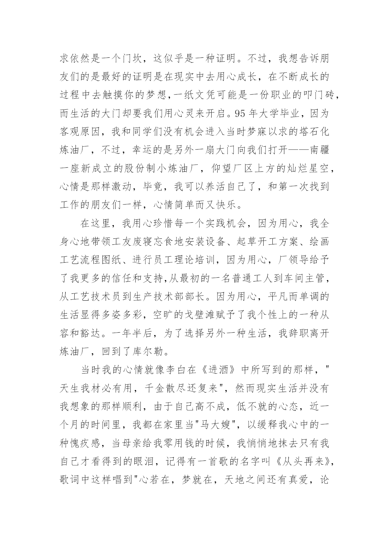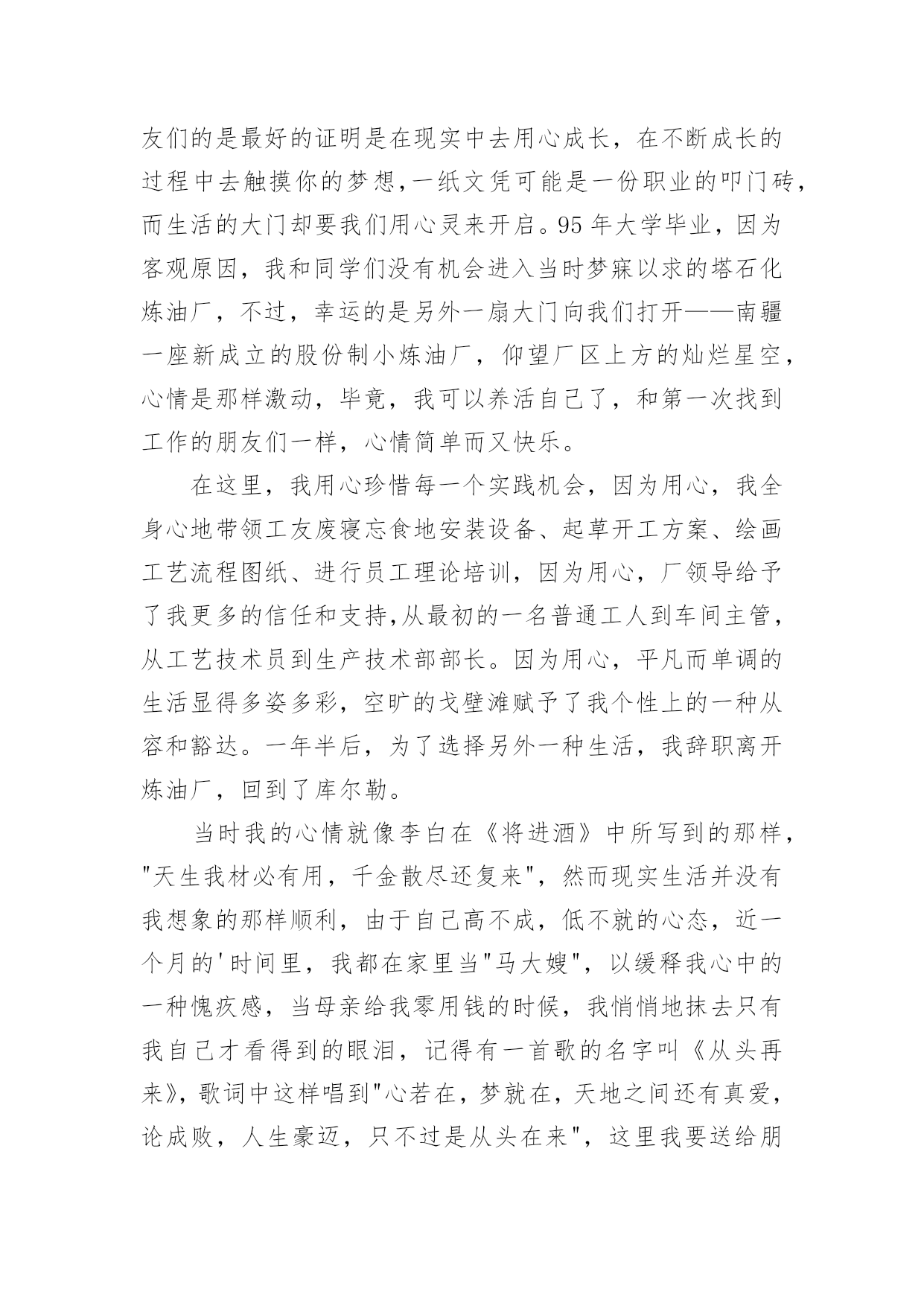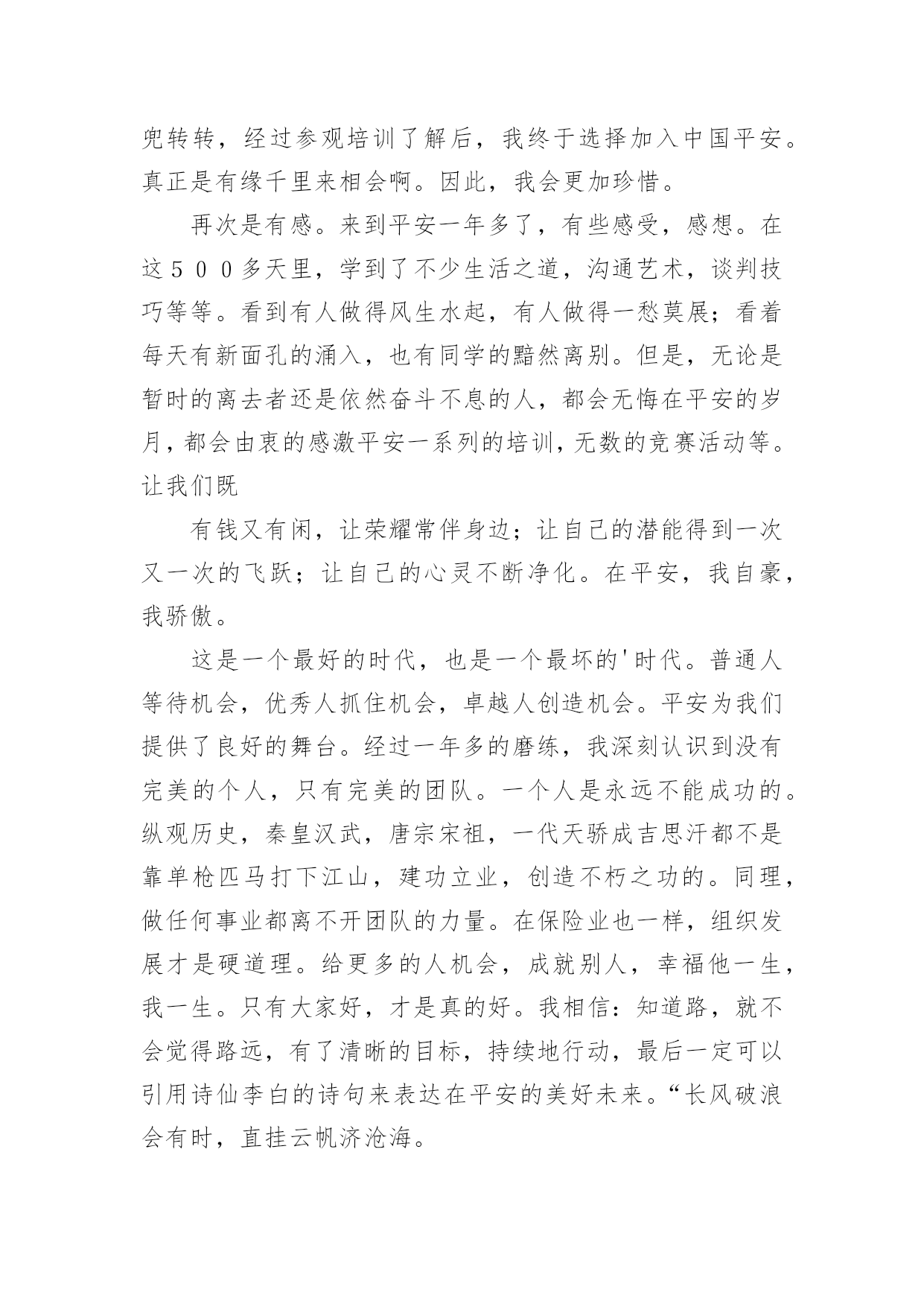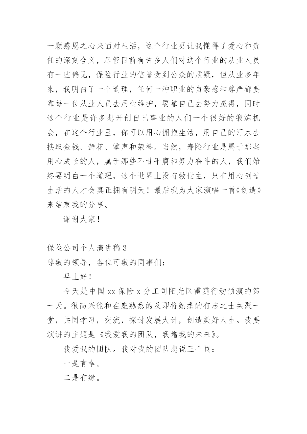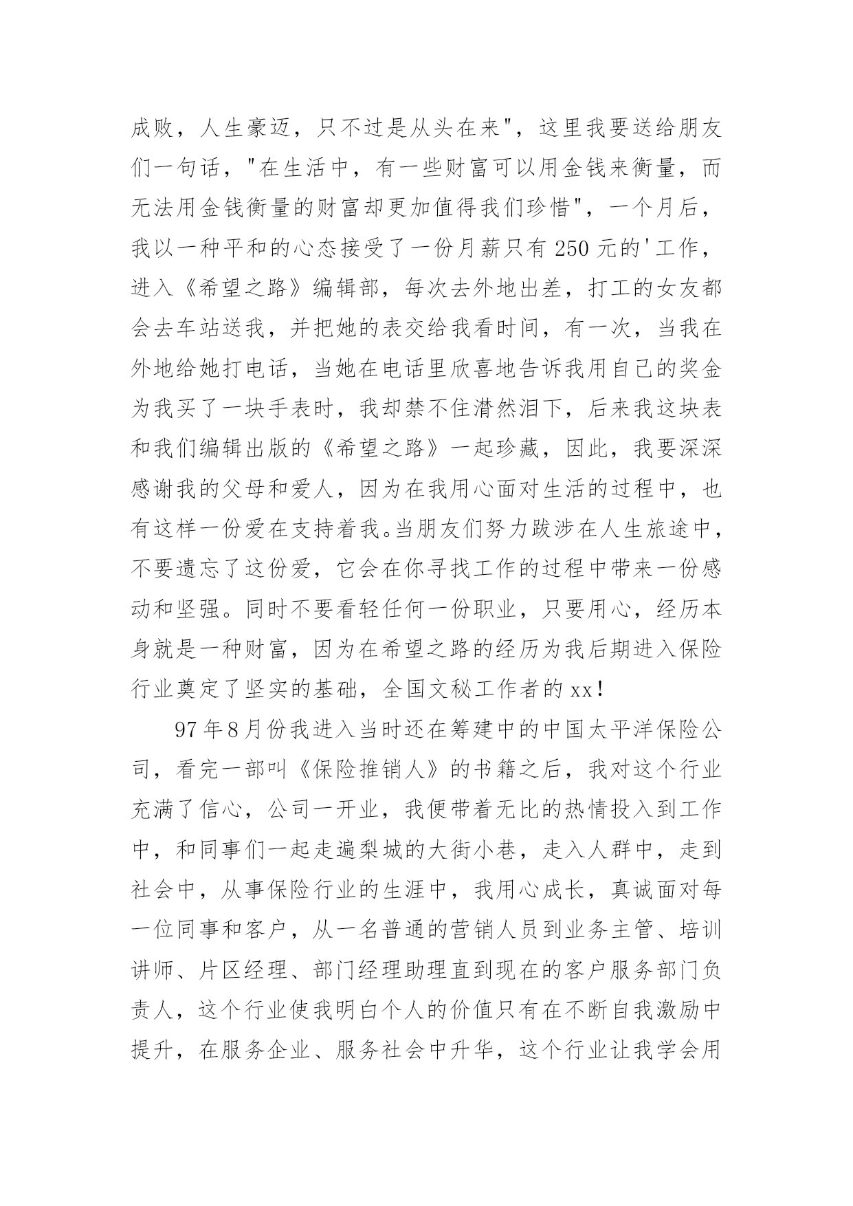保险公司个人演讲稿通过对演讲稿语言的推究可以提高语言的表现力,增强语言的感染力。在快速变化和不断变革的新时代,我们使用上演讲稿的情况与日俱增,大家知道演讲稿的格式吗?以下是小编帮大家整理的保险公司个人演讲稿,仅供参考,大家一起来看看吧。保险公司个人演讲稿1各位领导、同志们:大家好!我叫,今年岁,大专文化程度,年月份调入人保--支公司工作,先后担任出纳、会计、财务科长等职务,年调入市公司审计处工作,现任副科级审计员。今天,我竞争的岗位是财务中心主任助理或营销管理部副经理。参加这次竞选,我感到具备以下三个条件:一是对保险业务的浓厚兴趣,使我积累了比较丰富的业务知识。兴趣是最好的老师。多年来,我基本上都在财务会计岗位工作。但由于对保险业务的爱好,我始终坚持自我加压,一刻也没有放松业务学习。先后自学了财务、统计和审计等相关的业务知识,并撰写了大量的学习笔记,业务基础得到不断巩固和提高。二是多年的.工作实践,使我养成了爱岗敬业的良好品质。年至今,我先后在五、六个岗位锻炼过,亲身体验了各种酸甜苦辣。但无论从事什么工作,我都坚持干一行、爱一行、专一行,做到大事做于细,小事做于精,任劳任怨,兢兢业业,从来没有出现过任何失误。三是基层和机关的工作锻炼,使我的组织协调能力得到不断提高。从事保险工作的年来,我既有亲自接触保户的种种经历,也有在机关摔打的切身感受,在领导和同志们的关心帮助下,我的组织协调能力得到较大程度的锻炼和提高,练就了精明干练的办事能力。在几次岗位变换中,都圆满完成了领导交办的各项工作任务。如果这次我能够竞选成功,我将从以下三个方面努力:一、尽心尽职,充分发挥助手和纽带作用。我将摆正位置,积极支持、全力配合正职开展工作,当好正职的参谋助手;同时我也会努力做好团结的带头人和润滑剂,与大家和睦相处,互帮互助,在正职与同志们之间架起一座连心桥。二、加强学习,进一步提高自身素质。可以说,没有先进的理论,就没有成功的实践。在今后的工作中,我将坚持不懈地刻苦学习社会主义市场经济理论,学习国有企业改革的方针政策,学习和人保工作有关的一切规定和要求,在不断学习中更新观念,提高自己。三、争先创优,高标准完成各项工作目标。尽快适应新的组织构架、管理模式和业务流程,按照《会计法》和公司有关制度,不折不扣、保质保量地完成领导交办的各项工作目标,为不断提高企业赢利能力做出积极贡献。如果这次不能当选,说明我离领导和同志们的要求还有差距,我将在今后的工作中以加倍的努力来予以弥补。在此,请各位领导和在座的同志们相信,给我这次机会,我必将还您一个满意!我的演讲结束了,谢谢大家!保险公司个人演讲稿2各位朋友:大家好!我是来自xxx保险股份有限公司巴州支公司的xxx,全国文秘工作者的xx!,首先感谢团委举办这次活动所创造的机会及公司给予我的信任,让我有缘面对这么多朋友,告别校园时代至今已有八个年头,想来真是弹指一挥间,从小到大我评价自己是一个有着许多好奇心和梦想同时又用心的人,因此,今天我给大家分享的题目就叫用心追逐,放飞梦想。可能每个朋友的心里都会有这样的想法,如果时间能够倒流回某一个阶段,我如何从新开始,假如真有这种可能的话,我想我会从xxxx年开始。xx年,我的高考成绩离本科院校的录取分数线差一点距离,本想重整旗鼓,但父母似乎对我失去了信心,因为在这之前我已经重整了两次,那个时候对一纸文凭的追求是一种潮流,现在想来,这种单纯对文凭的追求不免有些不合时宜,但在求职过程中,尤其是一些竞争激烈的岗位,对学历的要求依然是一个门坎,这似乎是一种证明。不过,我想告诉朋友们的是最好的证明是在现实中去用心成长,在不断成长的过程中去触摸你的梦想,一纸文凭可能是一份职业的叩门砖,而生活的大门却要我们用心灵来开启。95年大学毕业,因为客观原因,我和同学们没有机会进入当时梦寐以求的塔石化炼油厂,不过,幸运的是另外一扇大门向我们打开——南疆一座新成立的股份制小炼油厂,仰望厂区上方的灿烂星空,心情是那样激动,毕竟,我可以养活自己了,和第一次找到工作的朋友们一样,心情简单而又快乐。在这里,我用心珍惜每一个实践机会,因为用心,我全身心地带领工友废寝忘食地安装设备、起草开工方案、绘画工艺流程图纸、进行员工理论培训,因为用心,厂领导给予了我更多的信任和支持,从最初的一名普通工人到车间主管,从工艺技术员到生产技术部部长。因为用心,平凡而单调的生活显得多姿多彩,空旷的戈壁滩赋予了我个性上的一种从容和豁达。一年半后,为了选择另外一种生活,我辞职离开炼油厂,回到了库尔勒。当时我的心情就像李白在《进酒》中所写到的那样,"天生我材必有用,千金散尽还复来",然而现实生活并没有我想象的那样顺利,由于自己高不成,低不就的心态,近一个月的时间里,我都在家里当"马大嫂",以缓释我心中的一种愧疚感,当母亲给我零用钱的