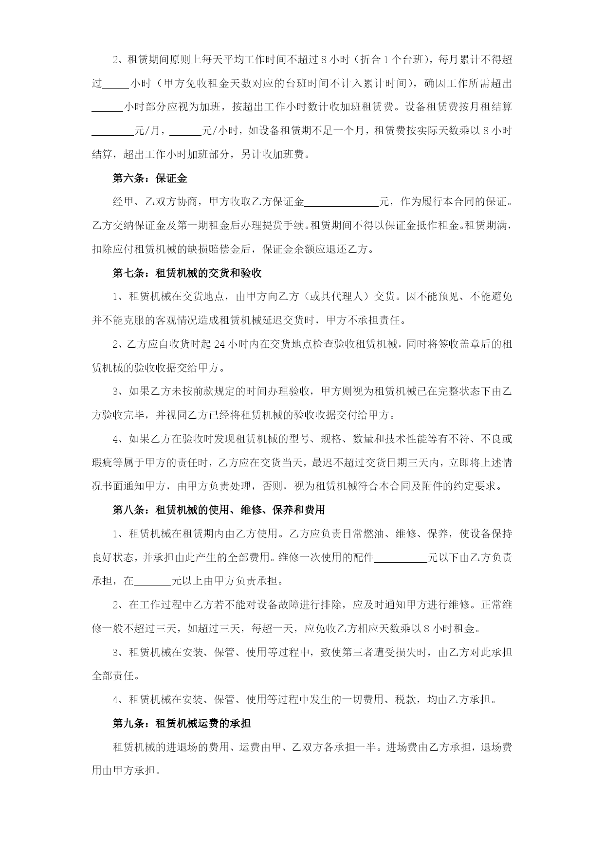 机械租赁合同签订日期:__________________________________合同编号:____________________________承租方:(以下简称乙方)___________________________________________________出租方:(以下简称甲方)___________________________________________________根据《合同法》的有关规定,按照平等互利的原则,为明确甲、乙双方的权利义务,经双方协商一致,特签订本合同。第一条:租赁机械的名称:_______________________________________________________规格:_____________________型号:_____________________数量:_____________________使用地点:___________________________________________________。第二条:甲方为租赁机械配备操作手___________名,其每人工资___________元/月,由______方负责承担,并负责安排操作手的食宿,其食宿费用也由___________方负责承担。第三条:租赁期限自________年________月________日至________年________月________日止,如需继续租用,应在本合同期满前五日内,重新签订合同。第四条:租赁机械的所有权1、在租赁期间,合同附件所列租赁机械的所有权属于甲方。乙方对租赁机械只有使用权,没有所有权。2、在租赁期间,乙方如对租赁机械进行改善或者增设他物,必须征得甲方的书面同意。3、在租赁期间,乙方如将租赁机械转租给第三人,必须征得甲方书面同意。第五条:租金的计算和支付1、自________年________月________日至________年________月________日止,租赁期满,乙方将设备完好交给甲方办理退场手续,若乙方继续使用,应在本合同期满前五日内重新签定续租合同。2、租赁期间原则上每天平均工作时间不超过8小时(折合1个台班),每月累计不得超过_____小时(甲方免收租金天数对应的台班时间不计入累计时间),确因工作所需超出______小时部分应视为加班,按超出工作小时数计收加班租赁费。设备租赁费按月租结算________元/月,______元/小时,如设备租赁期不足一个月,租赁费按实际天数乘以8小时结算,超出工作小时加班部分,另计收加班费。第六条:保证金经甲、乙双方协商,甲方收取乙方保证金______________元,作为履行本合同的保证。乙方交纳保证金及第一期租金后办理提货手续。租赁期间不得以保证金抵作租金。租赁期满,扣除应付租赁机械的缺损赔偿金后,保证金余额应退还乙方。第七条:租赁机械的交货和验收1、租赁机械在交货地点,由甲方向乙方(或其代理人)交货。因不能预见、不能避免并不能克服的客观情况造成租赁机械延迟交货时,甲方不承担责任。2、乙方应自收货时起24小时内在交货地点检查验收租赁机械,同时将签收盖章后的租赁机械的验收收据交给甲方。3、如果乙方未按前款规定的时间办理验收,甲方则视为租赁机械已在完整状态下由乙方验收完毕,并视同乙方已经将租赁机械的验收收据交付给甲方。4、如果乙方在验收时发现租赁机械的型号、规格、数量和技术性能等有不符、不良或瑕疵等属于甲方的责任时,乙方应在交货当天,最迟不超过交货日期三天内,立即将上述情况书面通知甲方,由甲方负责处理,否则,视为租赁机械符合本合同及附件的约定要求。第八条:租赁机械的使用、维修、保养和费用1、租赁机械在租赁期内由乙方使用。乙方应负责日常燃油、维修、保养,使设备保持良好状态,并承担由此产生的全部费用。维修一次使用的配件__________元以下由乙方负责承担,在_______元以上由甲方负责承担。2、在工作过程中乙方若不能对设备故障进行排除,应及时通知甲方进行维修。正常维修一般不超过三天,如超过三天,每超一天,应免收乙方相应天数乘以8小时租金。3、租赁机械在安装、保管、使用等过程中,致使第三者遭受损失时,由乙方对此承担全部责任。4、租赁机械在安装、保管、使用等过程中发生的一切费用、税款,均由乙方承担。第九条:租赁机械运费的承担租赁机械的进退场的费用、运费由甲、乙双方各承担一半。进场费由乙方承担,退场费用由甲方承担。第十条:租赁机械的毁损和灭失1、乙方承担在租赁期内发生的租赁机械的毁损(正常损耗不在此限)和灭失的风险。2、在租赁机械发生毁损或灭失时,乙方应立即通知甲方,甲方有权选择下列方式之一,由乙方负责处理