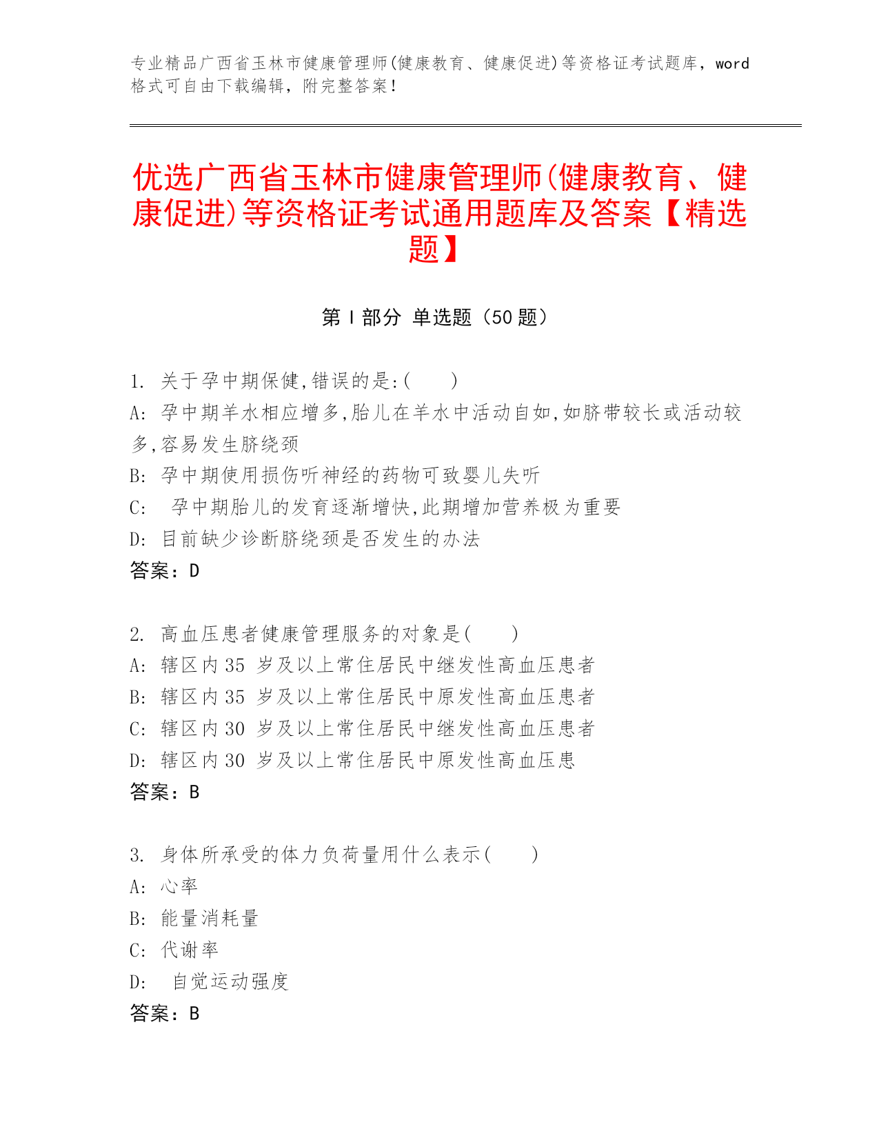优选广西省玉林市健康管理师(健康教育、健康促进)等资格证考试通用题库及答案【精选题】