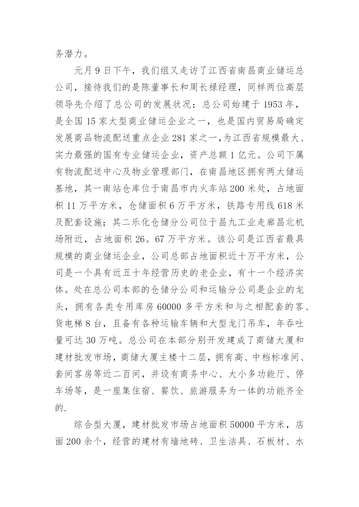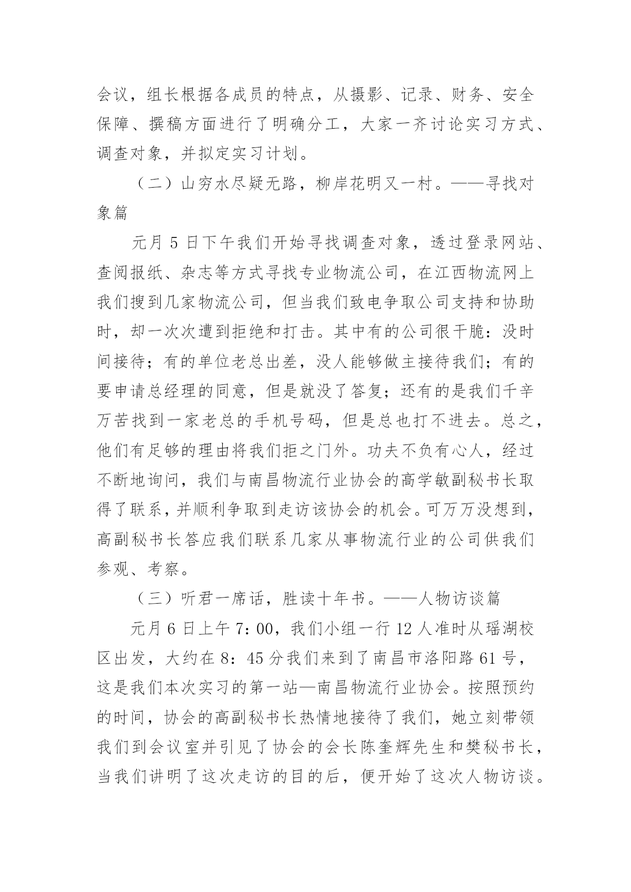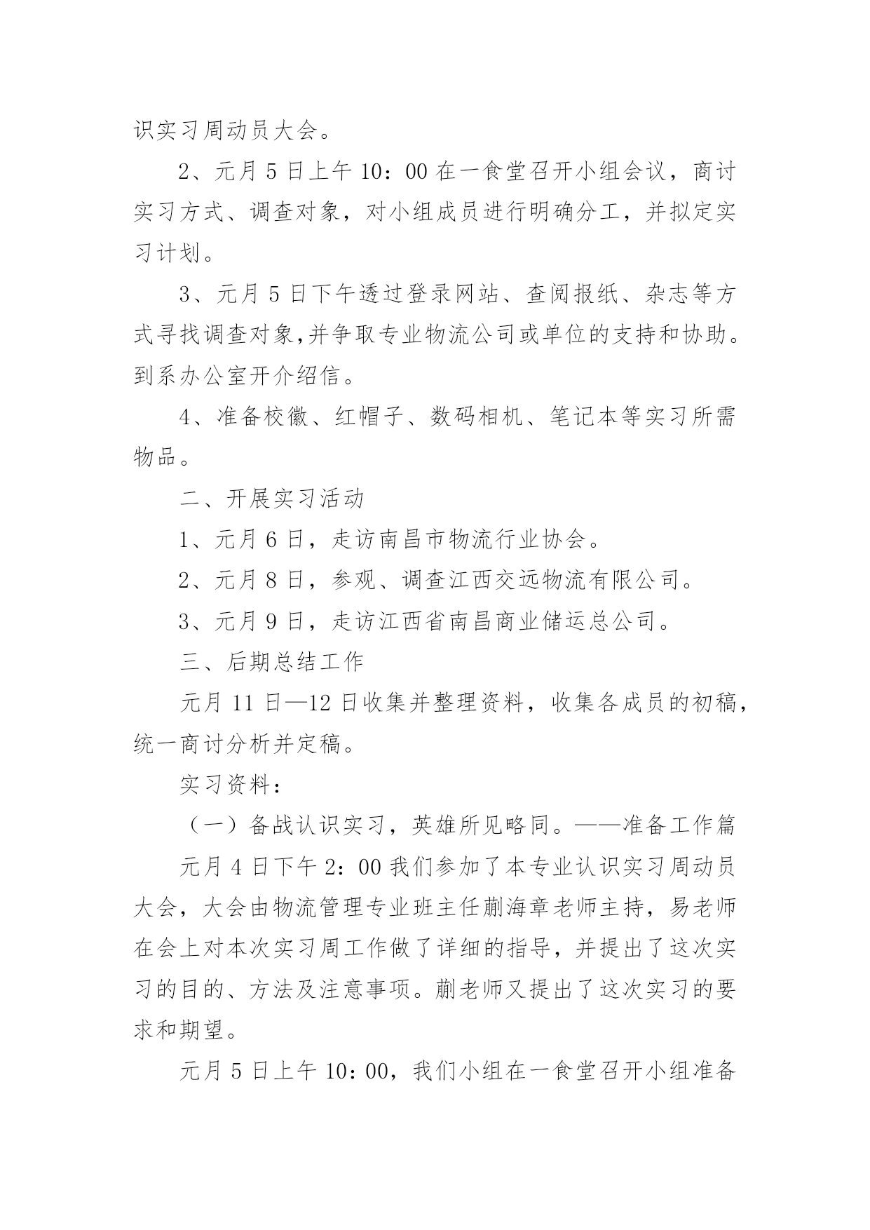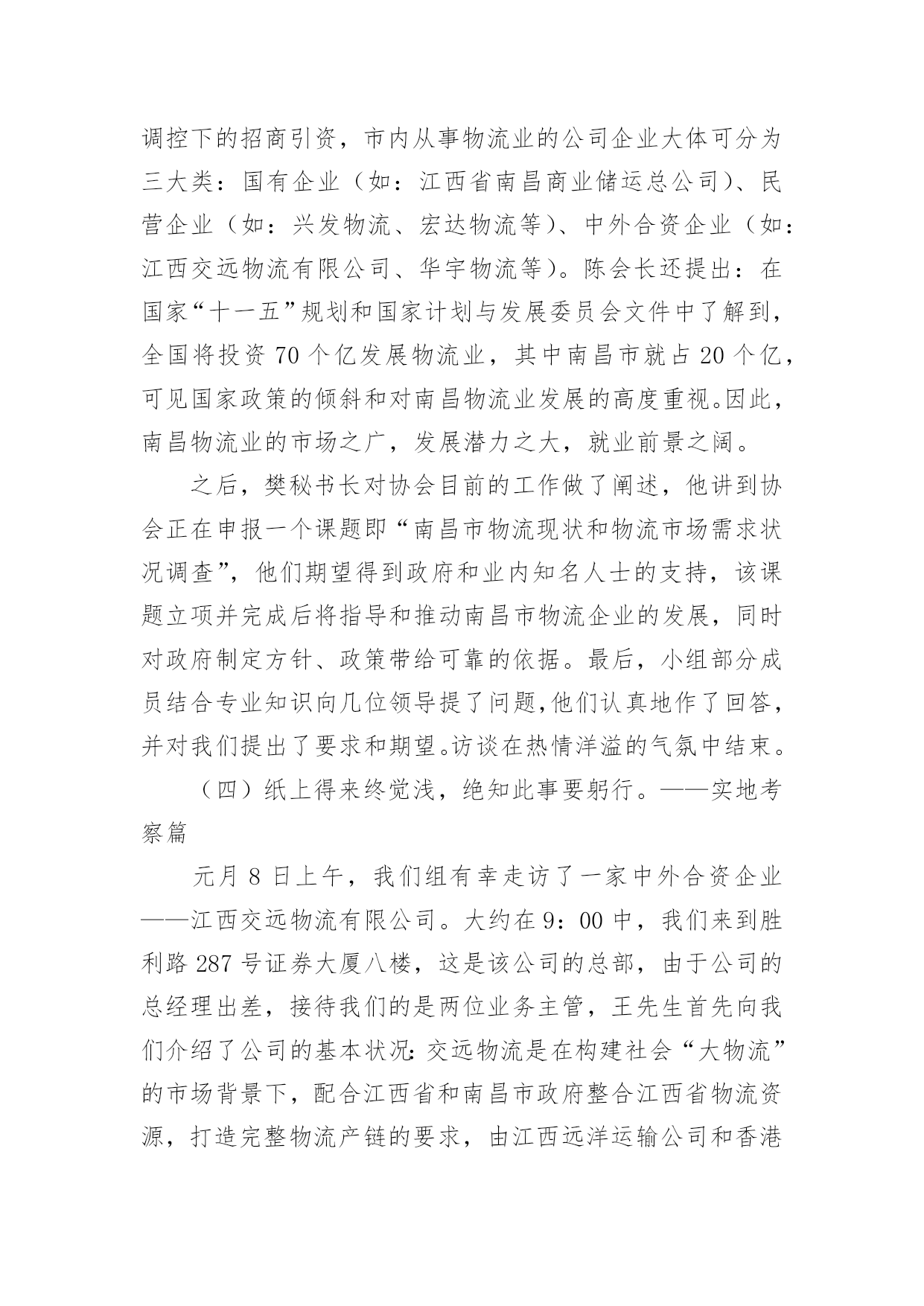 物流专业实习报告优秀物流专业实习报告优秀随着个人的素质不断提高,需要使用报告的情况越来越多,不同的报告内容同样也是不同的。那么,报告到底怎么写才合适呢?以下是小编为大家整理的物流专业实习报告优秀,希望对大家有所帮助。物流专业实习报告优秀1实习目的:选取身边的企业单位为对象,联系课上所学理论,采用实地考察跟踪其物流全过程的方法,对南昌物流业发展现状进行初步了解。培养实际调研潜力,尝试检验所学知识,并从实际中进一步学习了解物流的内涵与外延。实习方式:采用实地调研的方式,具体采用了应对面的访谈了解、过程跟踪调查和侧面行为观察的方式。出动全组成员合理分工,每人负责不一样侧面的资料,协同合作,调查后群众讨论分析,并总结出实习报告。实习时间:20xx年元月5日—元月12日实习地点:xx省南昌市实习步骤:一、前期准备工作1、元月4日下午2:00在北—B104教室参加本专业认识实习周动员大会。2、元月5日上午10:00在一食堂召开小组会议,商讨实习方式、调查对象,对小组成员进行明确分工,并拟定实习计划。3、元月5日下午透过登录网站、查阅报纸、杂志等方式寻找调查对象,并争取专业物流公司或单位的支持和协助。到系办公室开介绍信。4、准备校徽、红帽子、数码相机、笔记本等实习所需物品。二、开展实习活动1、元月6日,走访南昌市物流行业协会。2、元月8日,参观、调查江西交远物流有限公司。3、元月9日,走访江西省南昌商业储运总公司。三、后期总结工作元月11日—12日收集并整理资料,收集各成员的初稿,统一商讨分析并定稿。实习资料:(一)备战认识实习,英雄所见略同。——准备工作篇元月4日下午2:00我们参加了本专业认识实习周动员大会,大会由物流管理专业班主任蒯海章老师主持,易老师在会上对本次实习周工作做了详细的指导,并提出了这次实习的目的、方法及注意事项。蒯老师又提出了这次实习的要求和期望。元月5日上午10:00,我们小组在一食堂召开小组准备会议,组长根据各成员的特点,从摄影、记录、财务、安全保障、撰稿方面进行了明确分工,大家一齐讨论实习方式、调查对象,并拟定实习计划。(二)山穷水尽疑无路,柳岸花明又一村。——寻找对象篇元月5日下午我们开始寻找调查对象,透过登录网站、查阅报纸、杂志等方式寻找专业物流公司,在江西物流网上我们搜到几家物流公司,但当我们致电争取公司支持和协助时,却一次次遭到拒绝和打击。其中有的公司很干脆:没时间接待;有的单位老总出差,没人能够做主接待我们;有的要申请总经理的同意,但是就没了答复;还有的是我们千辛万苦找到一家老总的手机号码,但是总也打不进去。总之,他们有足够的理由将我们拒之门外。功夫不负有心人,经过不断地询问,我们与南昌物流行业协会的高学敏副秘书长取得了联系,并顺利争取到走访该协会的机会。可万万没想到,高副秘书长答应我们联系几家从事物流行业的公司供我们参观、考察。(三)听君一席话,胜读十年书。——人物访谈篇元月6日上午7:00,我们小组一行12人准时从瑶湖校区出发,大约在8:45分我们来到了南昌市洛阳路61号,这是我们本次实习的第一站—南昌物流行业协会。按照预约的时间,协会的高副秘书长热情地接待了我们,她立刻带领我们到会议室并引见了协会的会长陈奎辉先生和樊秘书长,当我们讲明了这次走访的目的后,便开始了这次人物访谈。首先陈会长向我们讲述了其协会成长的历程。随着市场经济的迅速发展、社会化大生产个性是工业化初步实现。使得产品极大的丰富,产品的超多交换、运输与仓储成为必然。各种各样物资的流动与日俱增,越来越受到人们的关注。江西省省委省政府认识到作为新的经济增长点的现代物流业必然成为江西经济发展的基础产业。江西经济要率先在中部地区崛起,需要充分发挥其区位优势。省委省政府也给予了四条、八项优惠政策。由于江西位于中国中东部,与中国经济最活跃的三个区域(长江三角洲、珠江三角洲、闽东南三角洲)紧密相连。在这些区域经济结构梯度转型期以及西部大开发战略中。江西将扮演重要的主角。潜在无限的商机,海内外商贾云集,纷纷把目光注视在江西这片红土地上。省政府果断提出自我的发展思路和战略构想。并投入超多资金建设好省内四小时经济圈、省外八小时经济圈。对接长珠闽、溶入全球化。栽好梧桐树、引来金凤凰。短短几年时间江西经济发生了翻天覆地的变化。江西物流业也正是在这样的环境下应运而生。政府对物流业发展的高度重视,对该协会成立给予了大力支持,同时五家从事物流行业的公司是该协会的发起单位。大约经过一年多的酝酿与筹备,协会于20xx年11月份正式成立。之后,陈会长对南昌市的物流现状进行了分析,他指出南昌市的物流业还处在一个低层次的发展阶段,与其他地区相比相对滞后,目前物流业发展停留在仓储和运输两大方面。但是其发展速度极快。随着一些民营企业的兴起,政府调控下的招商引资,市内从事物流业