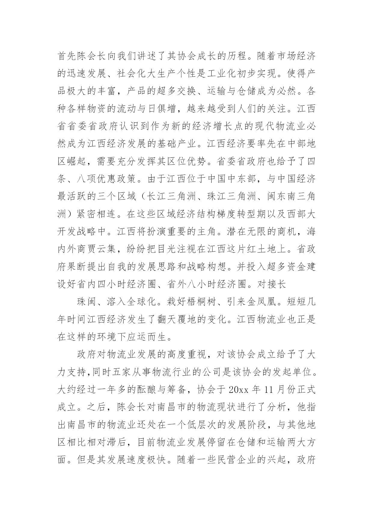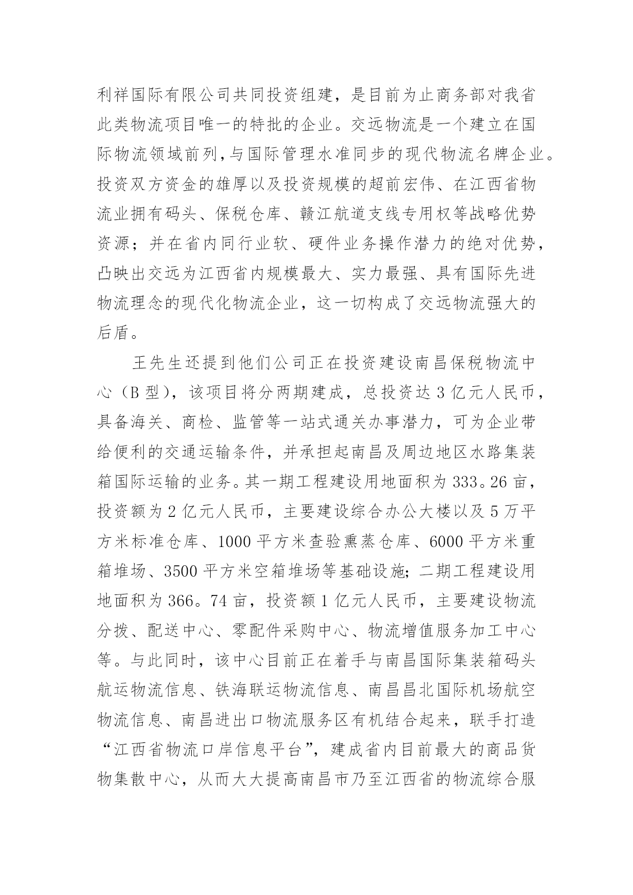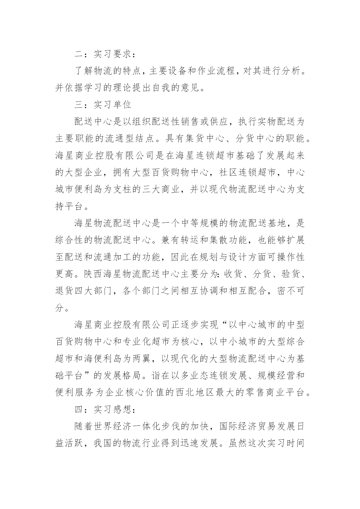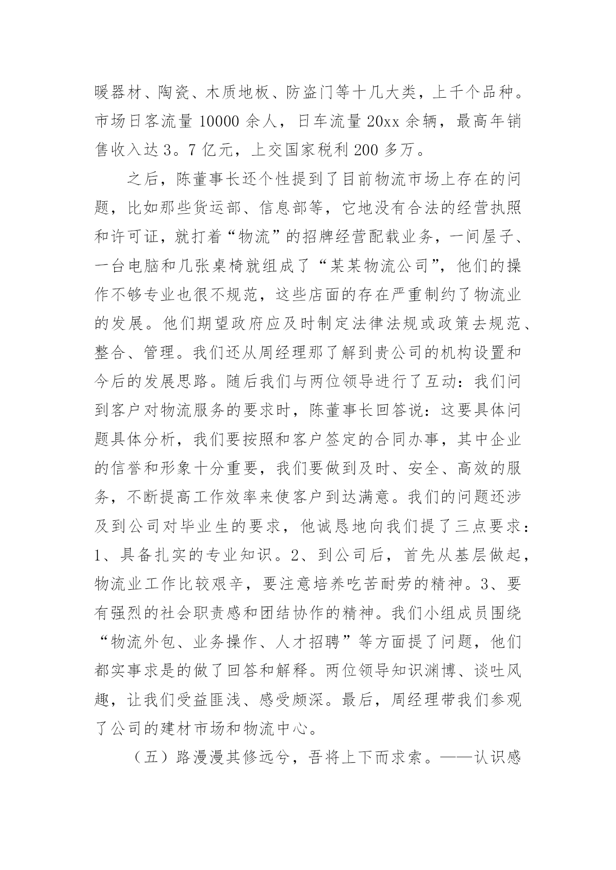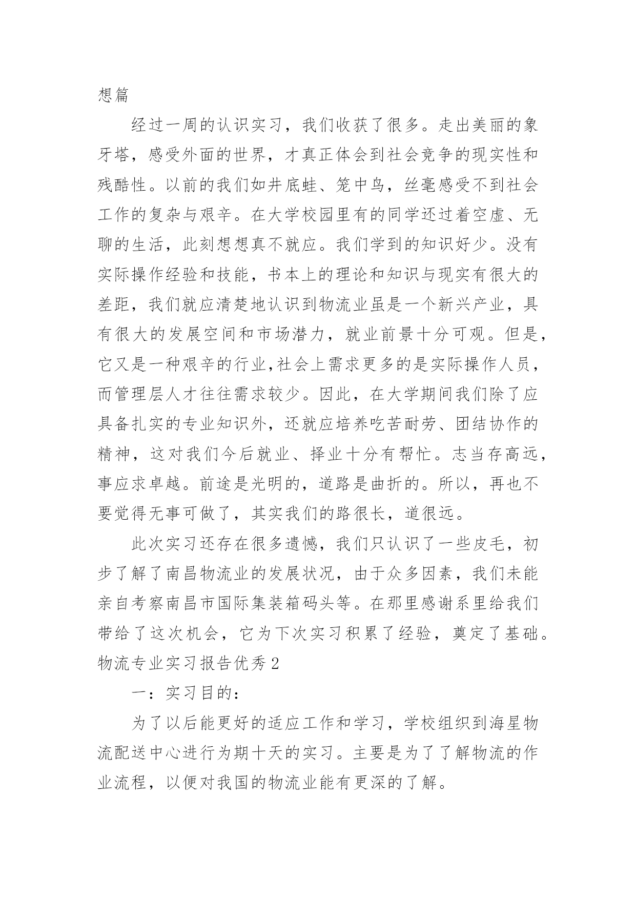 物流专业实习报告优秀物流专业实习报告优秀随着个人的素质不断提高,需要使用报告的情况越来越多,不同的报告内容同样也是不同的。那么,报告到底怎么写才合适呢?以下是小编为大家整理的物流专业实习报告优秀,希望对大家有所帮助。物流专业实习报告优秀1实习目的:选取身边的企业单位为对象,联系课上所学理论,采用实地考察跟踪其物流全过程的方法,对南昌物流业发展现状进行初步了解。培养实际调研潜力,尝试检验所学知识,并从实际中进一步学习了解物流的内涵与外延。实习方式:采用实地调研的方式,具体采用了应对面的访谈了解、过程跟踪调查和侧面行为观察的方式。出动全组成员合理分工,每人负责不一样侧面的资料,协同合作,调查后群众讨论分析,并总结出实习报告。实习时间:20xx年元月5日—元月12日实习地点:xx省南昌市实习步骤:一、前期准备工作1、元月4日下午2:00在北—B104教室参加本专业认识实习周动员大会。2、元月5日上午10:00在一食堂召开小组会议,商讨实习方式、调查对象,对小组成员进行明确分工,并拟定实习计划。3、元月5日下午透过登录网站、查阅报纸、杂志等方式寻找调查对象,并争取专业物流公司或单位的支持和协助。到系办公室开介绍信。4、准备校徽、红帽子、数码相机、笔记本等实习所需物品。二、开展实习活动1、元月6日,走访南昌市物流行业协会。2、元月8日,参观、调查江西交远物流有限公司。3、元月9日,走访江西省南昌商业储运总公司。三、后期总结工作元月11日—12日收集并整理资料,收集各成员的初稿,统一商讨分析并定稿。实习资料:(一)备战认识实习,英雄所见略同。——准备工作篇元月4日下午2:00我们参加了本专业认识实习周动员大会,大会由物流管理专业班主任蒯海章老师主持,易老师在会上对本次实习周工作做了详细的指导,并提出了这次实习的目的、方法及注意事项。蒯老师又提出了这次实习的要求和期望。元月5日上午10:00,我们小组在一食堂召开小组准备会议,组长根据各成员的特点,从摄影、记录、财务、安全保障、撰稿方面进行了明确分工,大家一齐讨论实习方式、调查对象,并拟定实习计划。(二)山穷水尽疑无路,柳岸花明又一村。——寻找对象篇元月5日下午我们开始寻找调查对象,透过登录网站、查阅报纸、杂志等方式寻找专业物流公司,在江西物流网上我们搜到几家物流公司,但当我们致电争取公司支持和协助时,却一次次遭到拒绝和打击。其中有的公司很干脆:没时间接待;有的单位老总出差,没人能够做主接待我们;有的要申请总经理的同意,但是就没了答复;还有的是我们千辛万苦找到一家老总的手机号码,但是总也打不进去。总之,他们有足够的理由将我们拒之门外。功夫不负有心人,经过不断地询问,我们与南昌物流行业协会的高学敏副秘书长取得了联系,并顺利争取到走访该协会的机会。可万万没想到,高副秘书长答应我们联系几家从事物流行业的公司供我们参观、考察。(三)听君一席话,胜读十年书。——人物访谈篇元月6日上午7:00,我们小组一行12人准时从瑶湖校区出发,大约在8:45分我们来到了南昌市洛阳路61号,这是我们本次实习的第一站—南昌物流行业协会。按照预约的时间,协会的高副秘书长热情地接待了我们,她立刻带领我们到会议室并引见了协会的会长陈奎辉先生和樊秘书长,当我们讲明了这次走访的目的后,便开始了这次人物访谈。首先陈会长向我们讲述了其协会成长的历程。随着市场经济的迅速发展、社会化大生产个性是工业化初步实现。使得产品极大的丰富,产品的超多交换、运输与仓储成为必然。各种各样物资的流动与日俱增,越来越受到人们的关注。江西省省委省政府认识到作为新的经济增长点的现代物流业必然成为江西经济发展的基础产业。江西经济要率先在中部地区崛起,需要充分发挥其区位优势。省委省政府也给予了四条、八项优惠政策。由于江西位于中国中东部,与中国经济最活跃的三个区域(长江三角洲、珠江三角洲、闽东南三角洲)紧密相连。在这些区域经济结构梯度转型期以及西部大开发战略中。江西将扮演重要的主角。潜在无限的商机,海内外商贾云集,纷纷把目光注视在江西这片红土地上。省政府果断提出自我的发展思路和战略构想。并投入超多资金建设好省内四小时经济圈、省外八小时经济圈。对接长珠闽、溶入全球化。栽好梧桐树、引来金凤凰。短短几年时间江西经济发生了翻天覆地的变化。江西物流业也正是在这样的环境下应运而生。政府对物流业发展的高度重视,对该协会成立给予了大力支持,同时五家从事物流行业的公司是该协会的发起单位。大约经过一年多的酝酿与筹备,协会于20xx年11月份正式成立。之后,陈会长对南昌市的物流现状进行了分析,他指出南昌市的物流业还处在一个低层次的发展阶段,与其他地区相比相对滞后,目前物流业发展停留在仓储和运输两大方面。但是其发展速度极快。随着一些民营企业的兴起,政府调控下的招商引资,市内从事物流业
