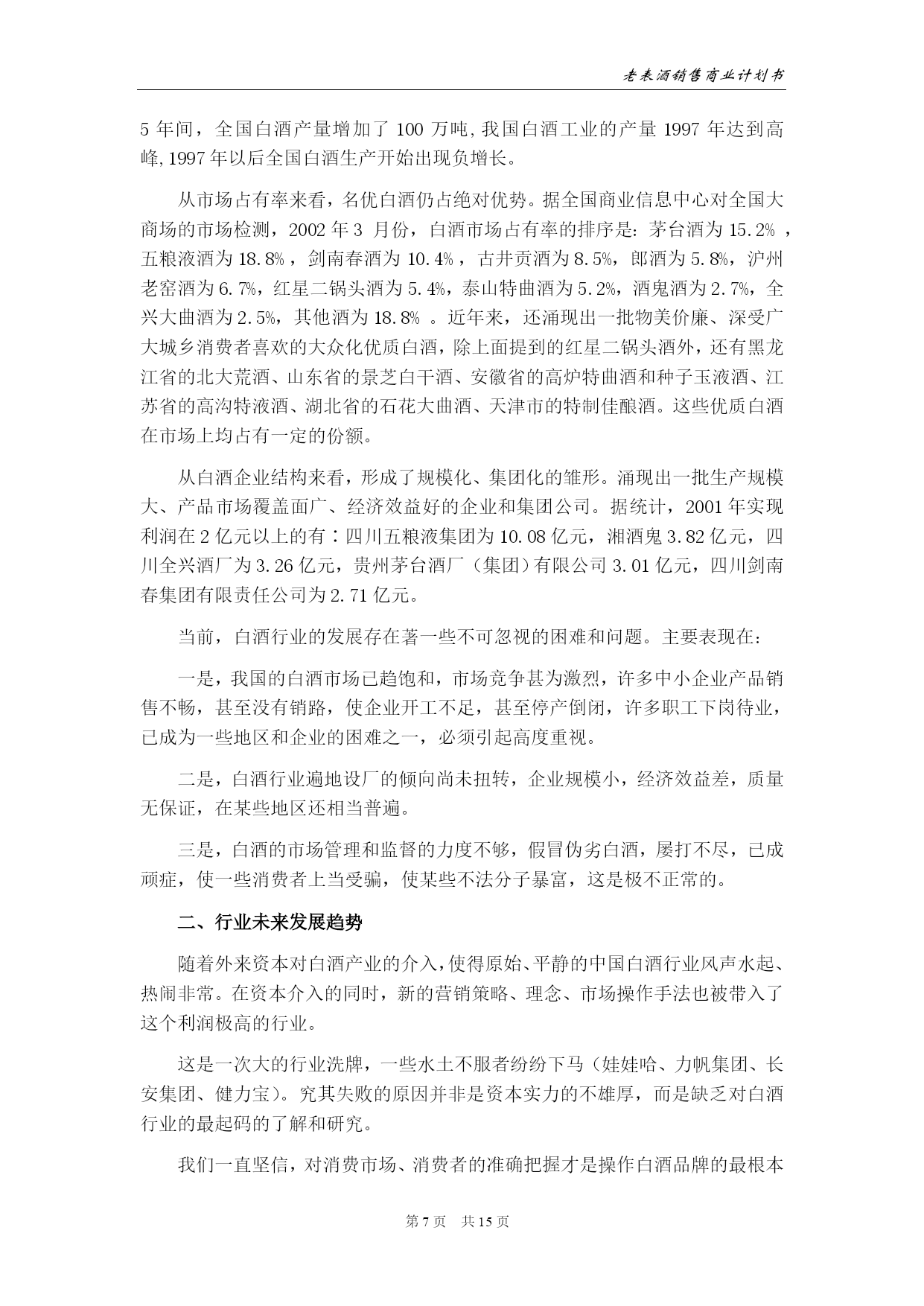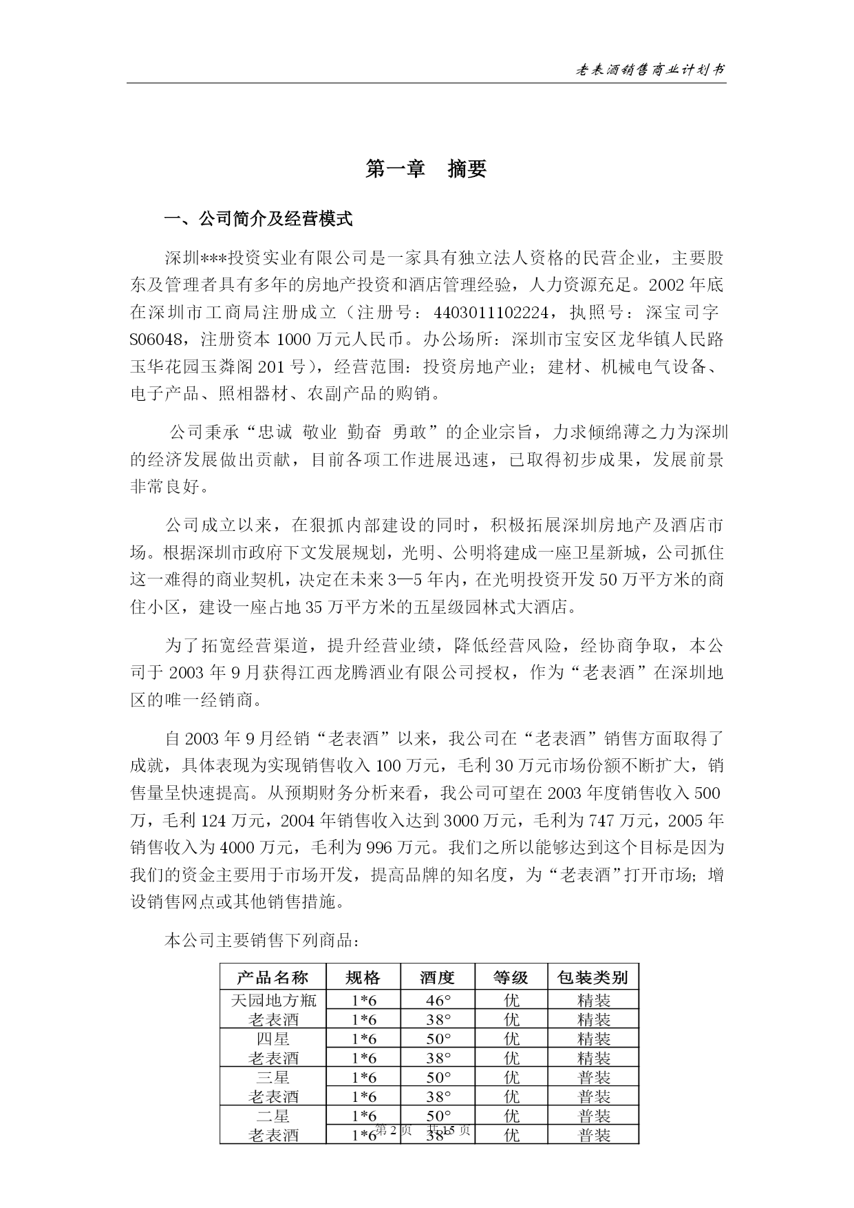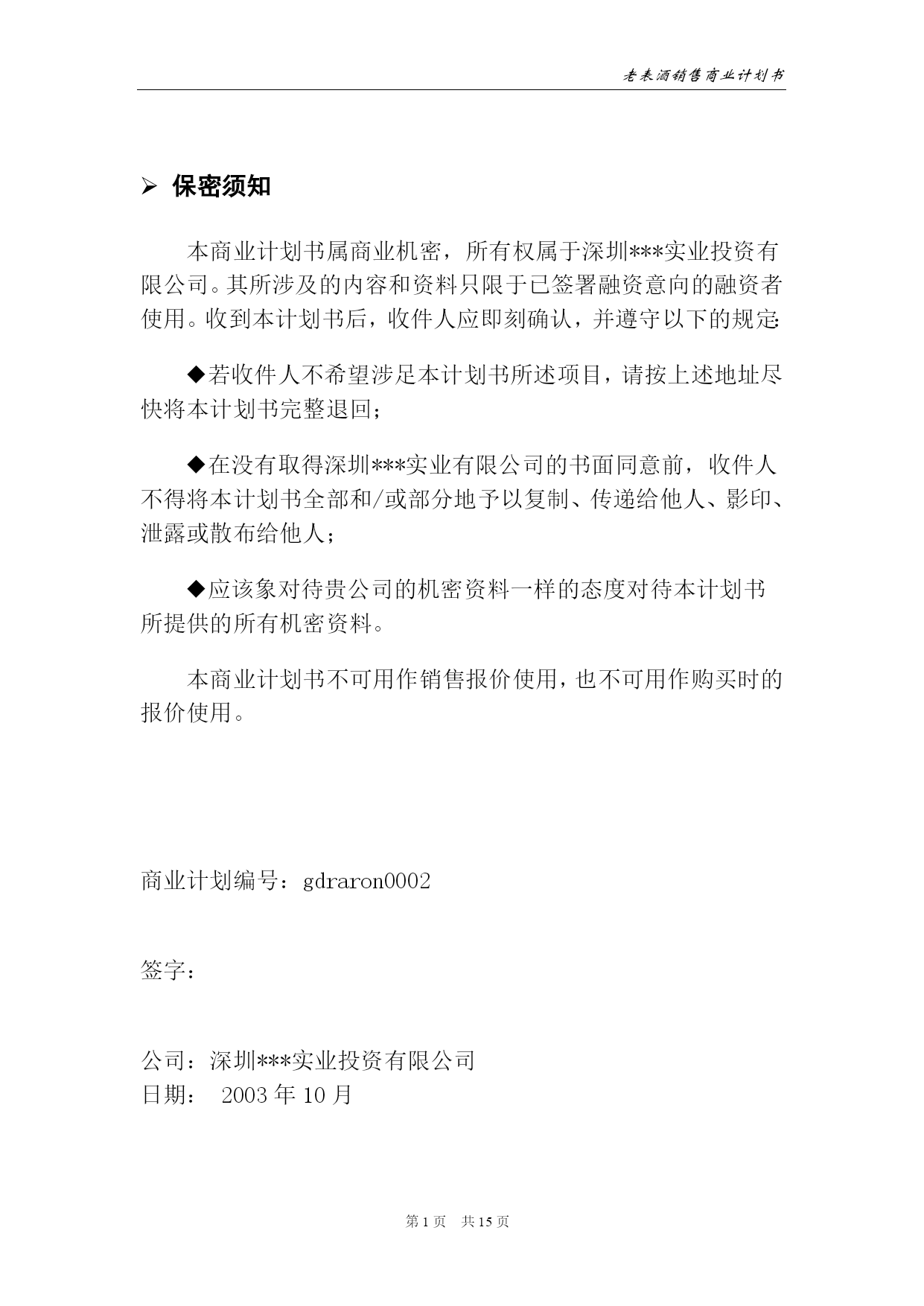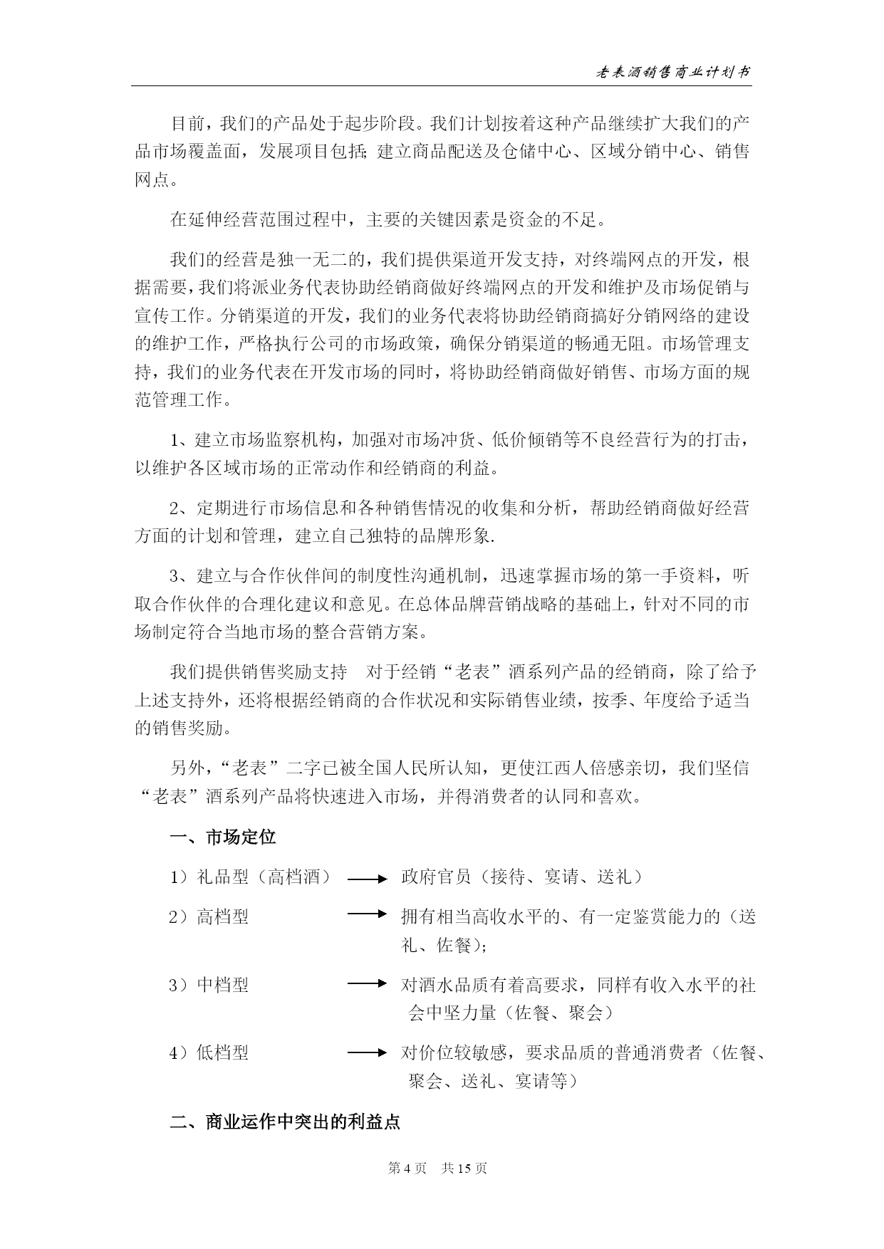 老表酒销售商业计划书PAGE第PAGE15页老表酒销售商业计划书目录第一章摘要………………………….………………...…...…….…....2一、公司简介及经营模式………………………………………………………………………….2第二章产品和服务………………..………...…….…………...……...3一、市场定位…………………………………………………………………………………..….4二、商业运作中突出的利益点…………………………………………………………….……..4三、产品特性………………………………………………………….…………………………..5四、产品线的规划与消费市场的对接……………………………………………………………5五、服务……………………………………………………………………………………………5第三章行业市场环境…….……….…………….………….…………6一、市场环境………..…………………………………………………………………………….6二、行业未来发展趋势……………………………………………………………………………7第四章营销计划与目标……………………………...……………….8一、销售区域………………………………………………………………………………………8二、市场运作方式…………………………………………………………………………………8三、渠道……………………………………………………………………………………………8四、销售目标………………………………………………………………………………………8五、主要业务关系…………………………………………………………………………………9第五章促销和市场渗透…………………………...….…………...….9一、主要促销方式…………………………………………………………………………………9二、关系营销………………………………………………………………………………………9三、口碑促销………………………………………………………………………………………9四、联合促销………………………………………………………………………………………9公司管理团队…………………………….………….…...10一、机构设置……………………………………………………………………………………..10二、经营团队……………………………………………………………………………………..10三、外部支持……………………………………………………………………………………..11风险分析……………………………….………….………11财务预算…………………………………….……………12一、销售背景……………………………………………………………………………………..12二、销售预算……………………………………………………………………………………..12三、成本预算……………………………………………………………………………………..12四、营业费用及管理费用预算…………………………………………………………………..13五、利润预算……………………………………………………………………………………..14融资计划…………………………………….……………14保密须知本商业计划书属商业机密,所有权属于深圳***实业投资有限公司。其所涉及的内容和资料只限于已签署融资意向的融资者使用。收到本计划书后,收件人应即刻确认,并遵守以下的规定:◆若收件人不希望涉足本计划书所述项目,请按上述地址尽快将本计划书完整退回;◆在没有取得深圳***实业有限公司的书面同意前,收件人不得将本计划书全部和/或部分地予以复制、传递给他人、影印、泄露或散布给他人;◆应该象对待贵公司的机密资料一样的态度对待本计划书所提供的所有机密资料。本商业计划书不可用作销售报价使用,也不可用作购买时的报价使用。商业计划编号:gdraron0002签字:公司:深圳***实业投资有限公司日期:2003年10月摘要一、公司简介及经营模式深圳***投资实业有限公司是一家具有独立法人资格的民营企业,主要股东及管理者具有多年的房地产投资和酒店管理经验,人力资源充足。2002年底在深圳市工商局注册成立(注册号:4403011102224,执照号:深宝司字S06048,注册资本1000万元人民币。办公场所:深圳市宝安区龙华镇人民路玉华花园玉粦阁201号),经营范围:投资房地产业;建材、机械电气设备、电子产品、照相器材、农副产品的购销。公司秉承“忠诚敬业勤奋勇敢”的企业宗旨,力求倾绵薄之力为深圳的经济发展做出贡献,目前各项工作进展迅速,已取得初步成果,发展前景非常良好。公司成立以来,在