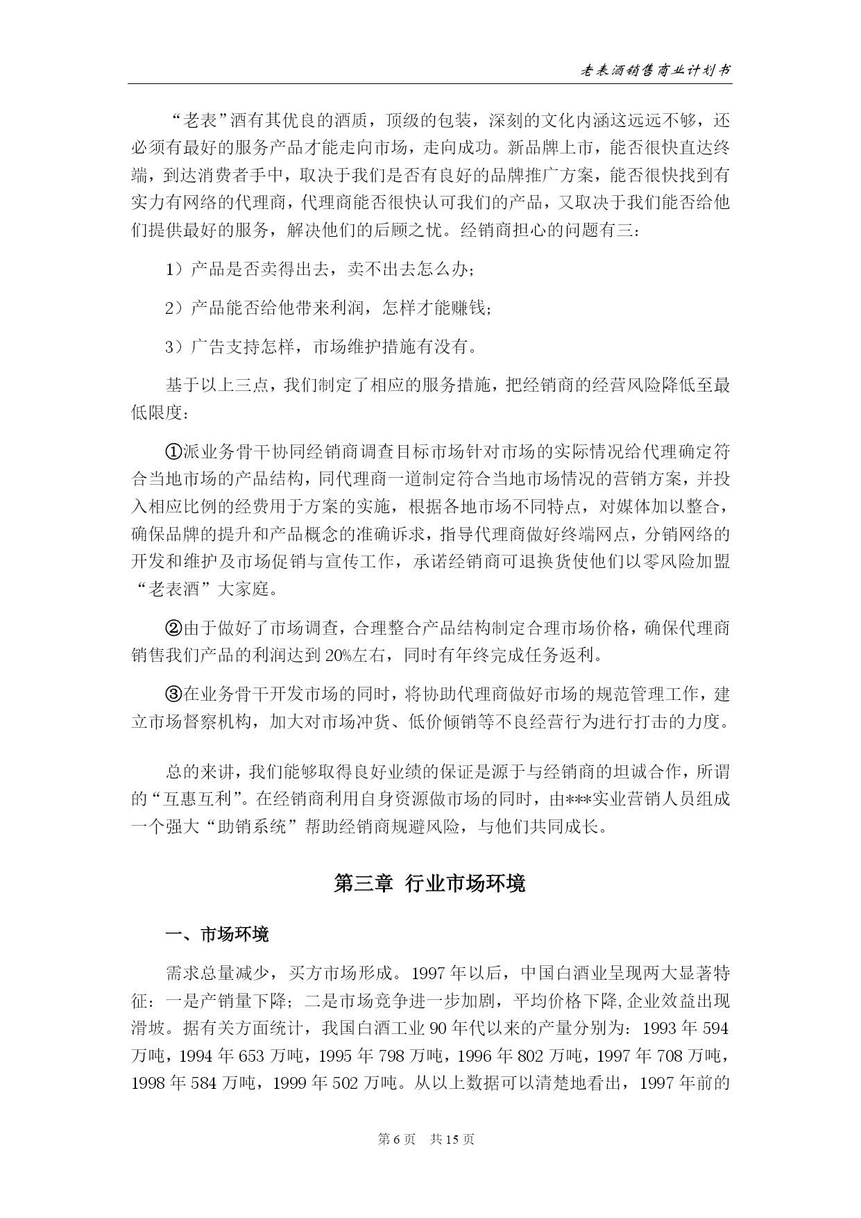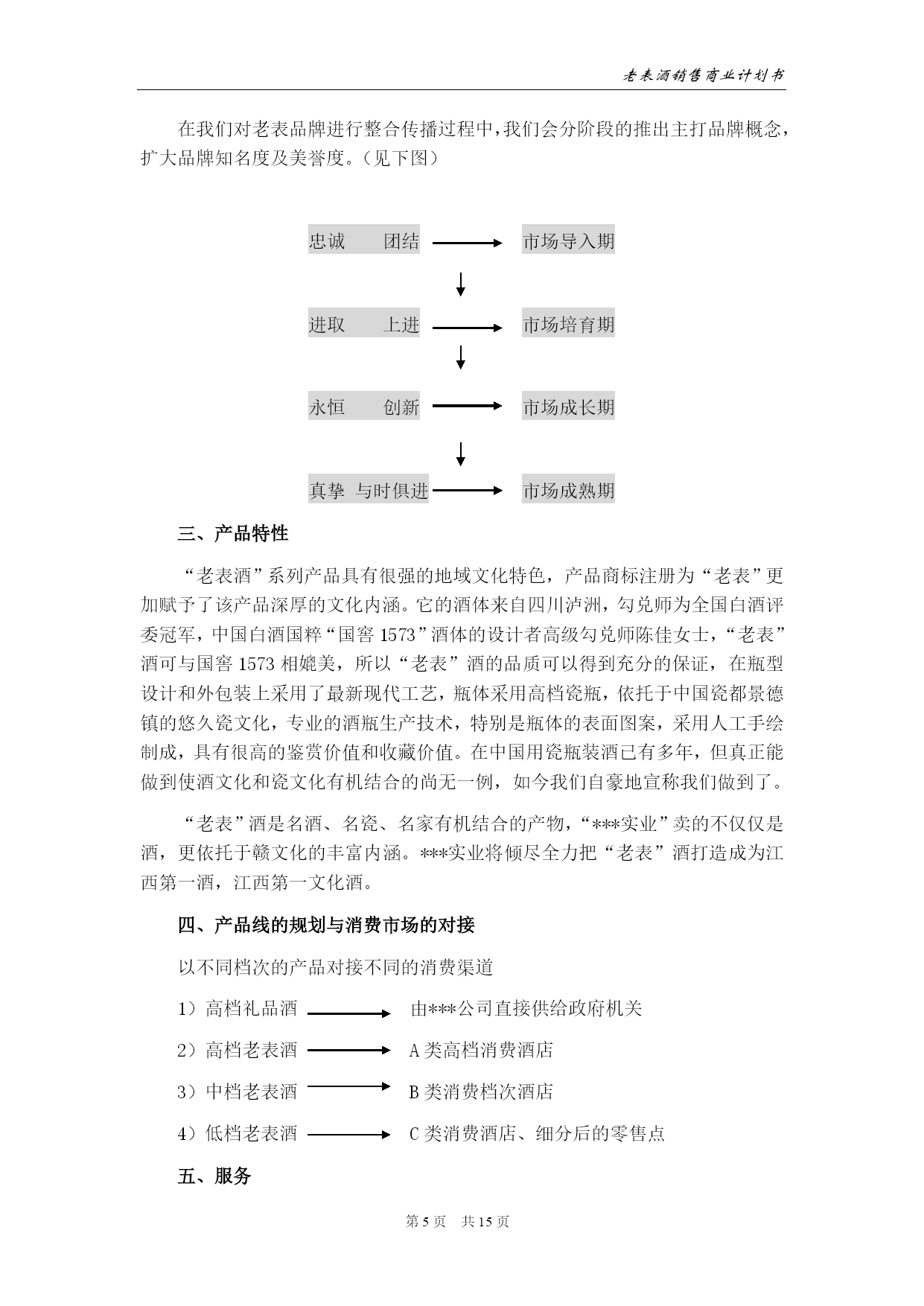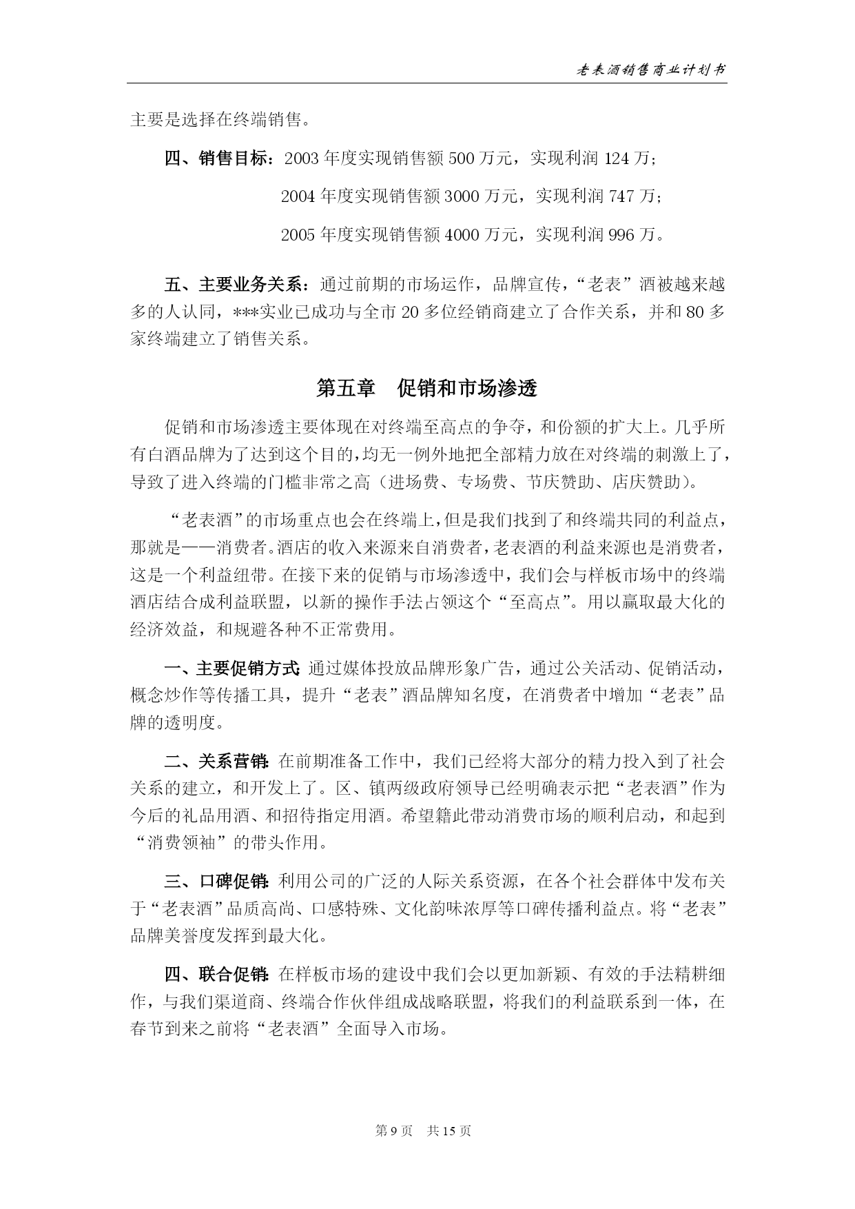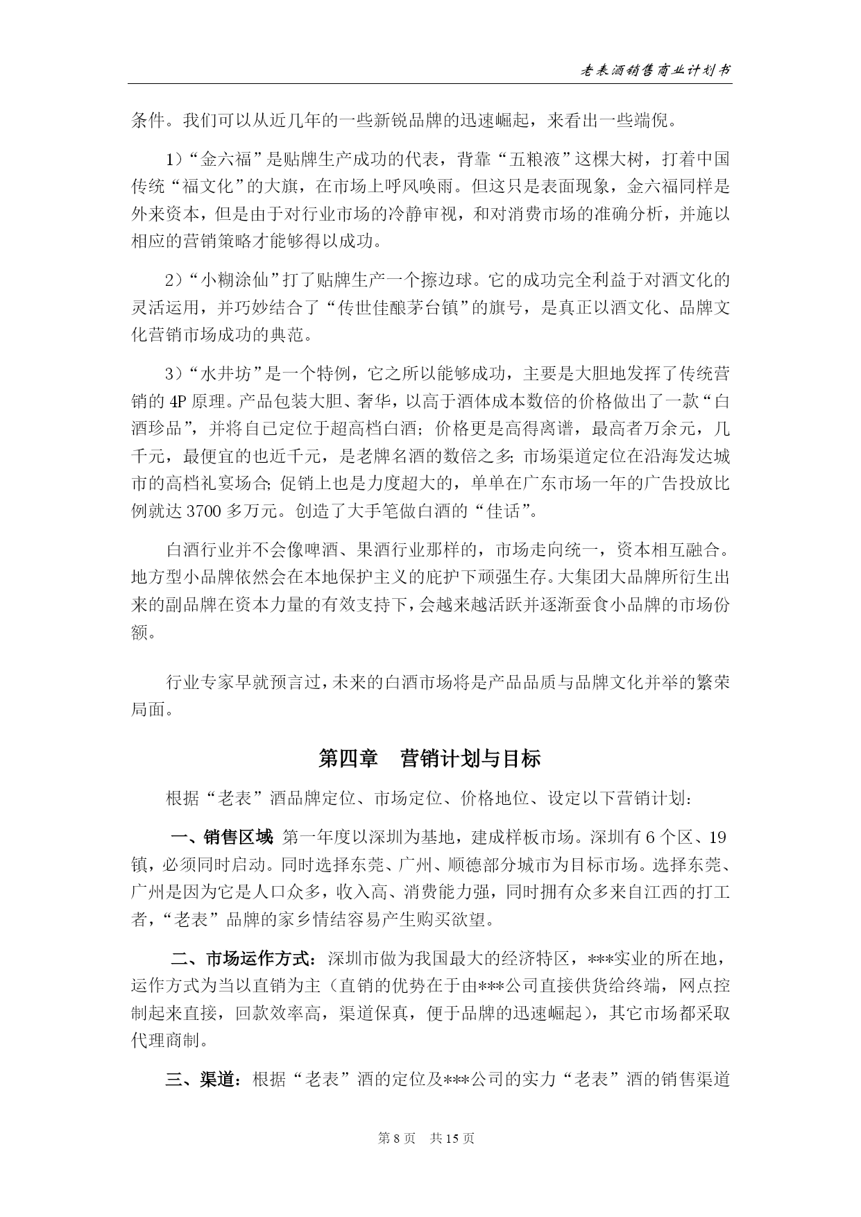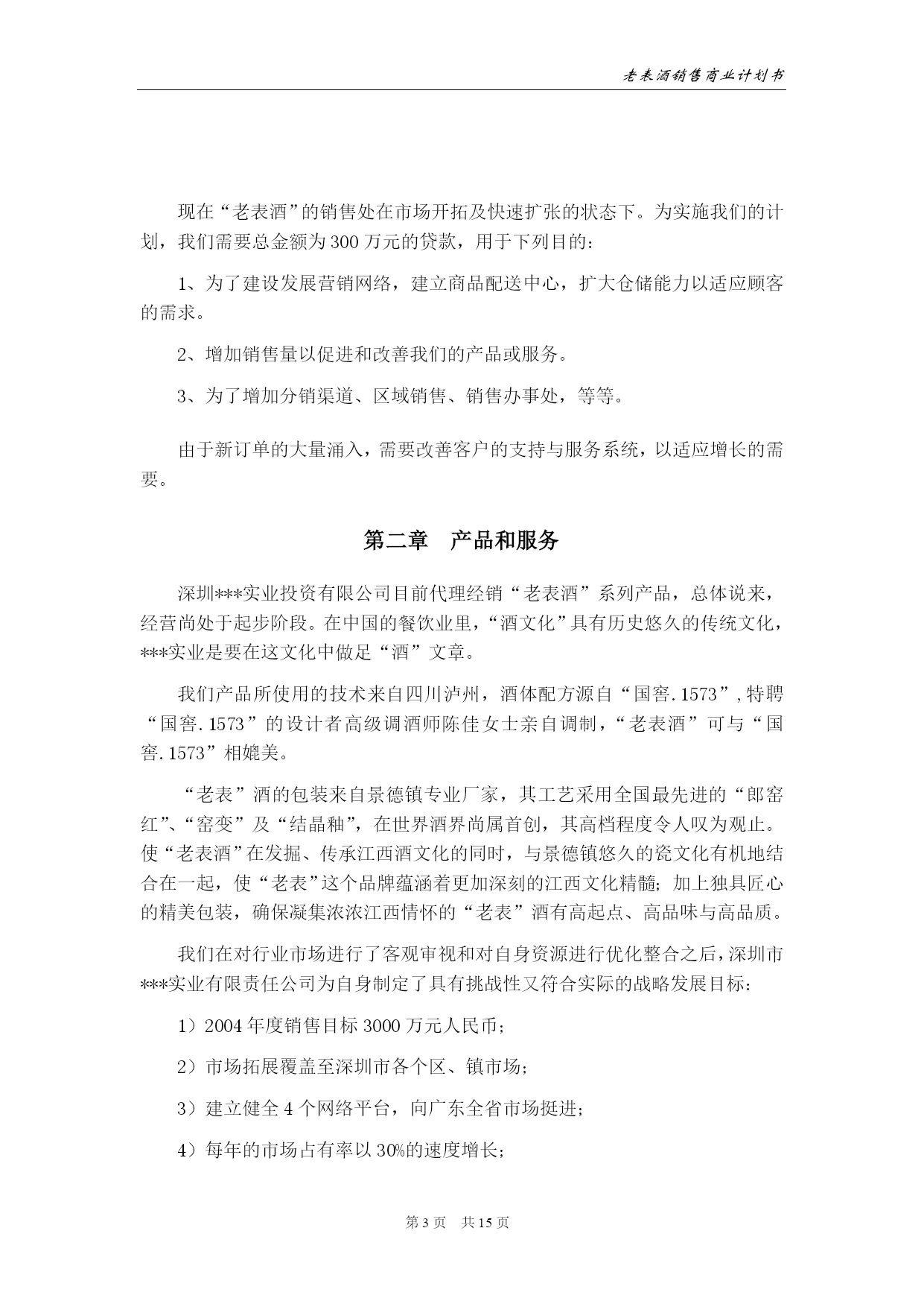 老表酒销售商业计划书PAGE第PAGE15页老表酒销售商业计划书目录第一章摘要………………………….………………...…...…….…....2一、公司简介及经营模式………………………………………………………………………….2第二章产品和服务………………..………...…….…………...……...3一、市场定位…………………………………………………………………………………..….4二、商业运作中突出的利益点…………………………………………………………….……..4三、产品特性………………………………………………………….…………………………..5四、产品线的规划与消费市场的对接……………………………………………………………5五、服务……………………………………………………………………………………………5第三章行业市场环境…….……….…………….………….…………6一、市场环境………..…………………………………………………………………………….6二、行业未来发展趋势……………………………………………………………………………7第四章营销计划与目标……………………………...……………….8一、销售区域………………………………………………………………………………………8二、市场运作方式…………………………………………………………………………………8三、渠道……………………………………………………………………………………………8四、销售目标………………………………………………………………………………………8五、主要业务关系…………………………………………………………………………………9第五章促销和市场渗透…………………………...….…………...….9一、主要促销方式…………………………………………………………………………………9二、关系营销………………………………………………………………………………………9三、口碑促销………………………………………………………………………………………9四、联合促销………………………………………………………………………………………9公司管理团队…………………………….………….…...10一、机构设置……………………………………………………………………………………..10二、经营团队……………………………………………………………………………………..10三、外部支持……………………………………………………………………………………..11风险分析……………………………….………….………11财务预算…………………………………….……………12一、销售背景……………………………………………………………………………………..12二、销售预算……………………………………………………………………………………..12三、成本预算……………………………………………………………………………………..12四、营业费用及管理费用预算…………………………………………………………………..13五、利润预算……………………………………………………………………………………..14融资计划…………………………………….……………14保密须知本商业计划书属商业机密,所有权属于深圳***实业投资有限公司。其所涉及的内容和资料只限于已签署融资意向的融资者使用。收到本计划书后,收件人应即刻确认,并遵守以下的规定:◆若收件人不希望涉足本计划书所述项目,请按上述地址尽快将本计划书完整退回;◆在没有取得深圳***实业有限公司的书面同意前,收件人不得将本计划书全部和/或部分地予以复制、传递给他人、影印、泄露或散布给他人;◆应该象对待贵公司的机密资料一样的态度对待本计划书所提供的所有机密资料。本商业计划书不可用作销售报价使用,也不可用作购买时的报价使用。商业计划编号:gdraron0002签字:公司:深圳***实业投资有限公司日期:2003年10月摘要一、公司简介及经营模式深圳***投资实业有限公司是一家具有独立法人资格的民营企业,主要股东及管理者具有多年的房地产投资和酒店管理经验,人力资源充足。2002年底在深圳市工商局注册成立(注册号:4403011102224,执照号:深宝司字S06048,注册资本1000万元人民币。办公场所:深圳市宝安区龙华镇人民路玉华花园玉粦阁201号),经营范围:投资房地产业;建材、机械电气设备、电子产品、照相器材、农副产品的购销。公司秉承“忠诚敬业勤奋勇敢”的企业宗旨,力求倾绵薄之力为深圳的经济发展做出贡献,目前各项工作进展迅速,已取得初步成果,发展前景非常良好。公司成立以来,在