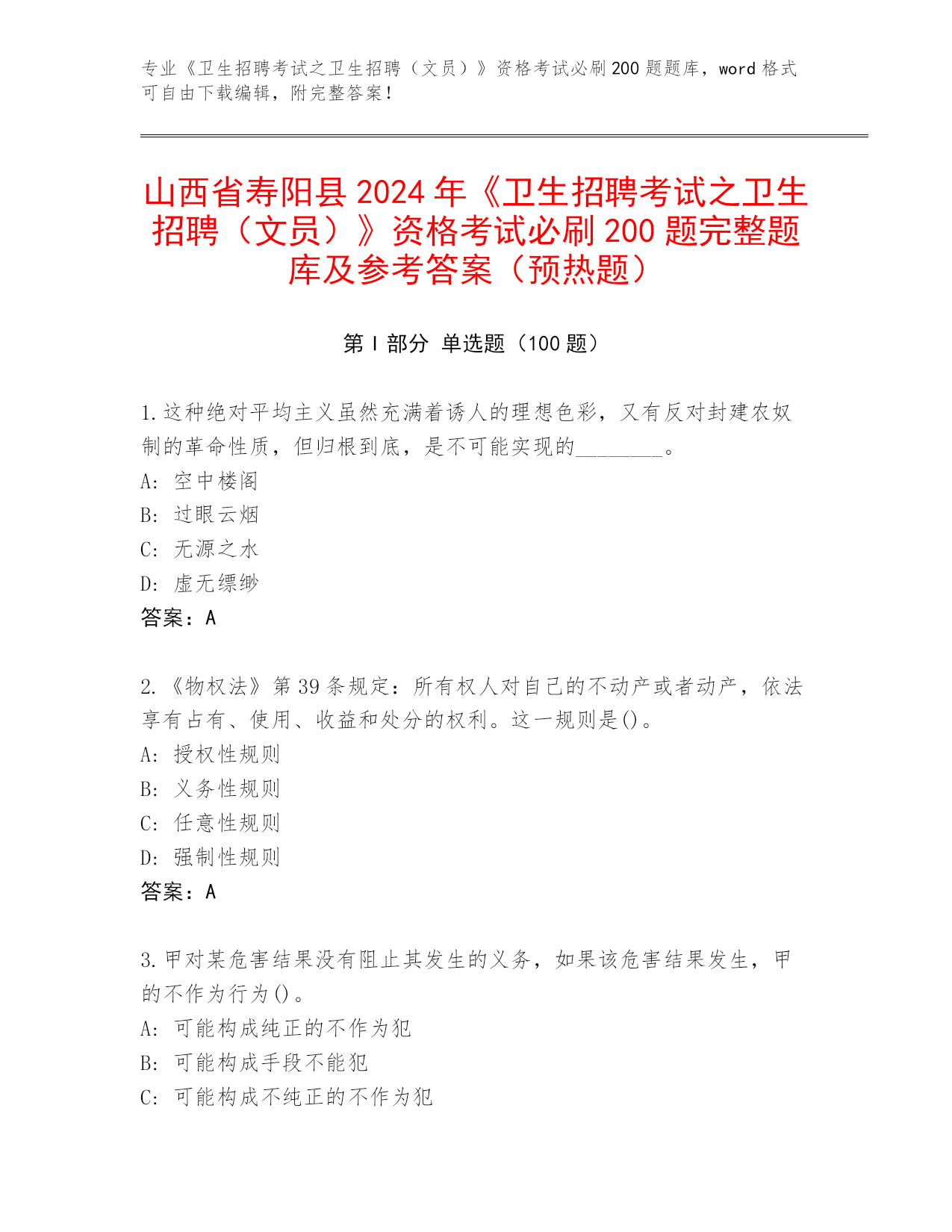 山西省寿阳县2024年《卫生招聘考试之卫生招聘(文员)》资格考试必刷200题完整题库及参考答案(预热题)