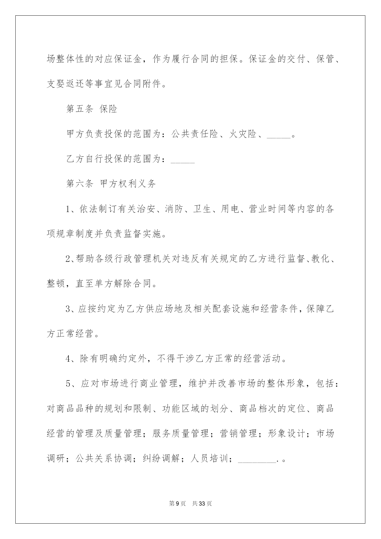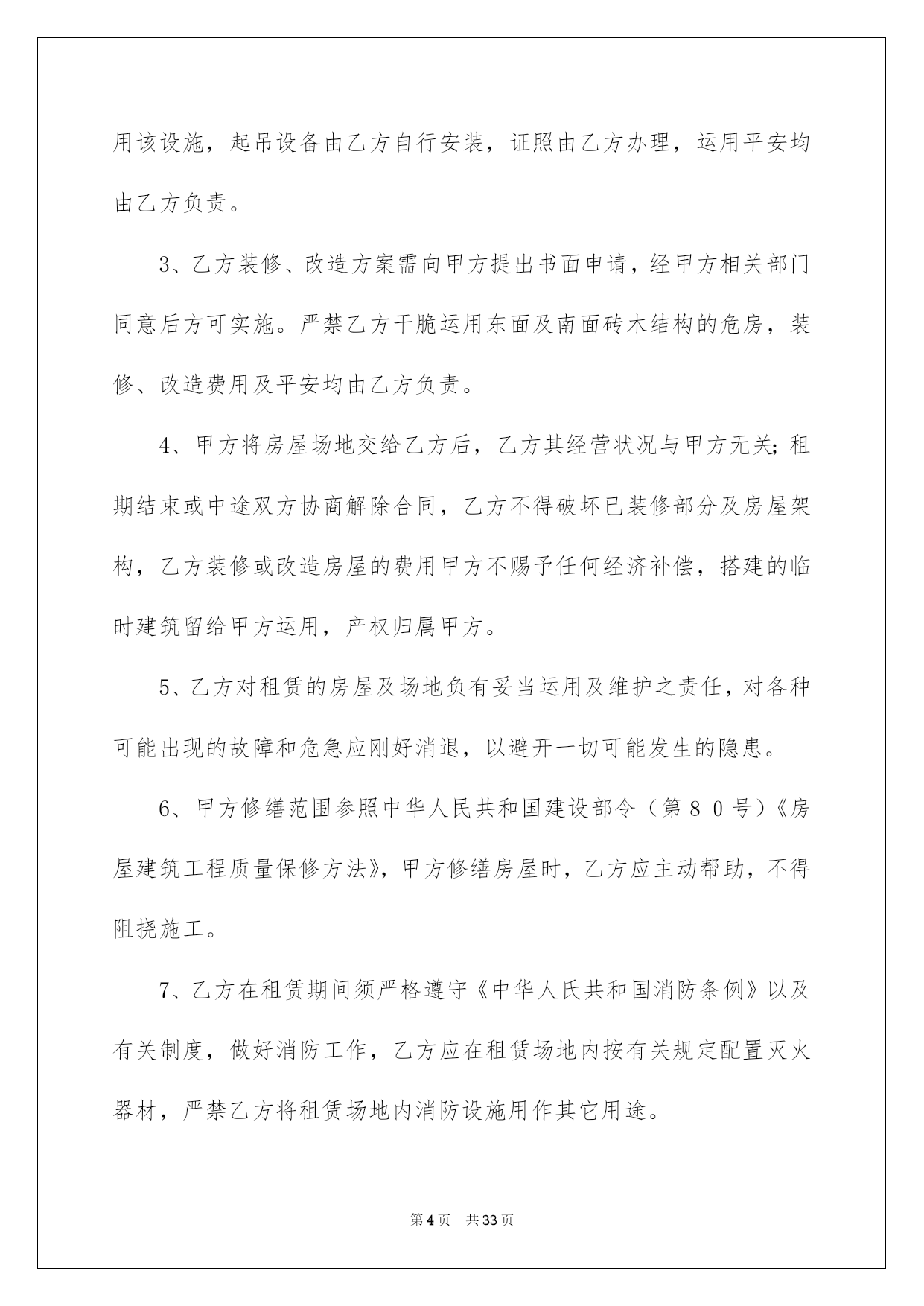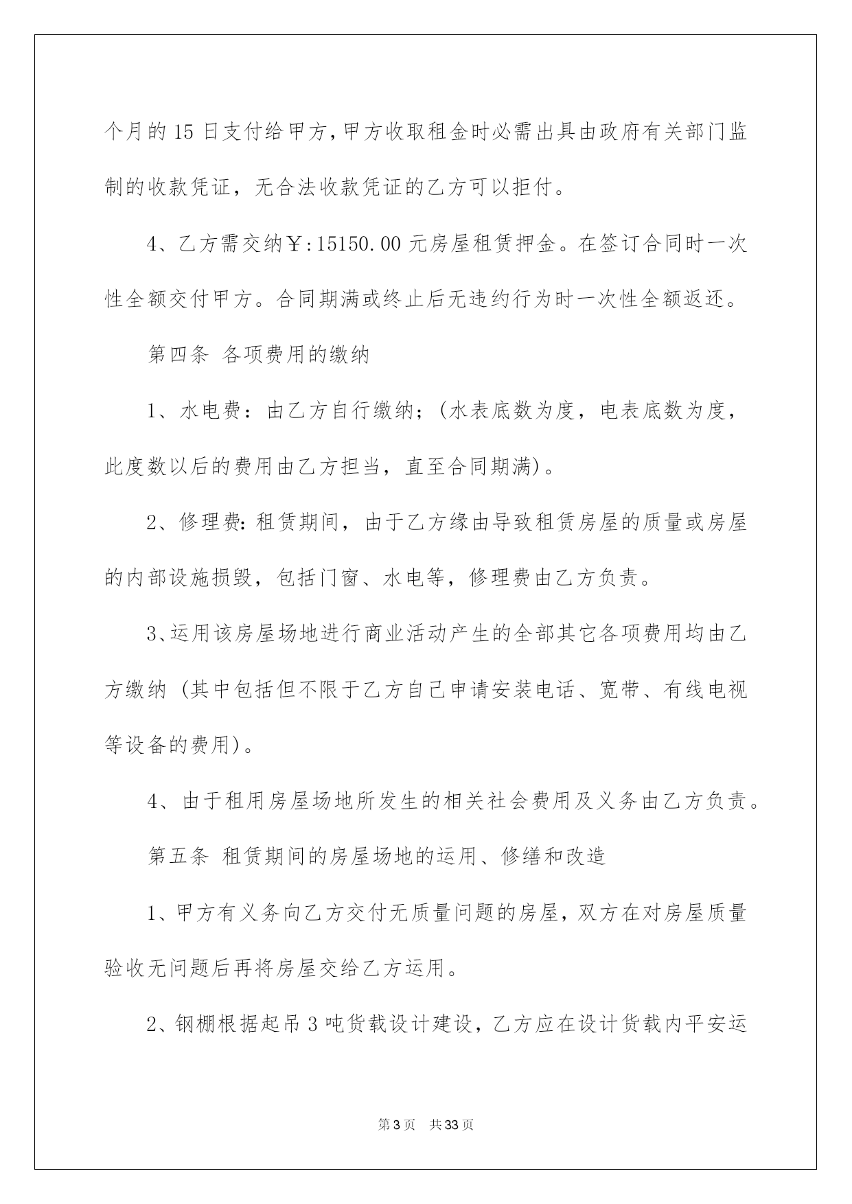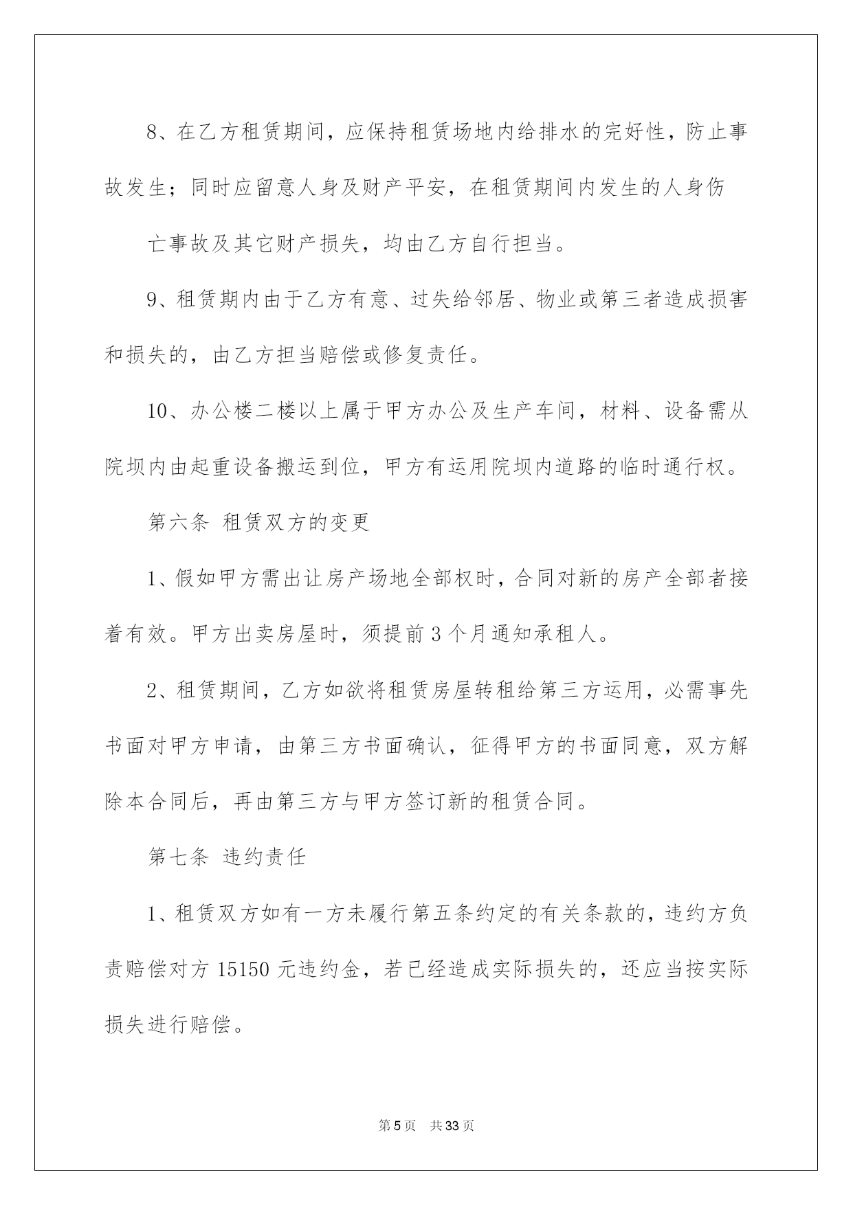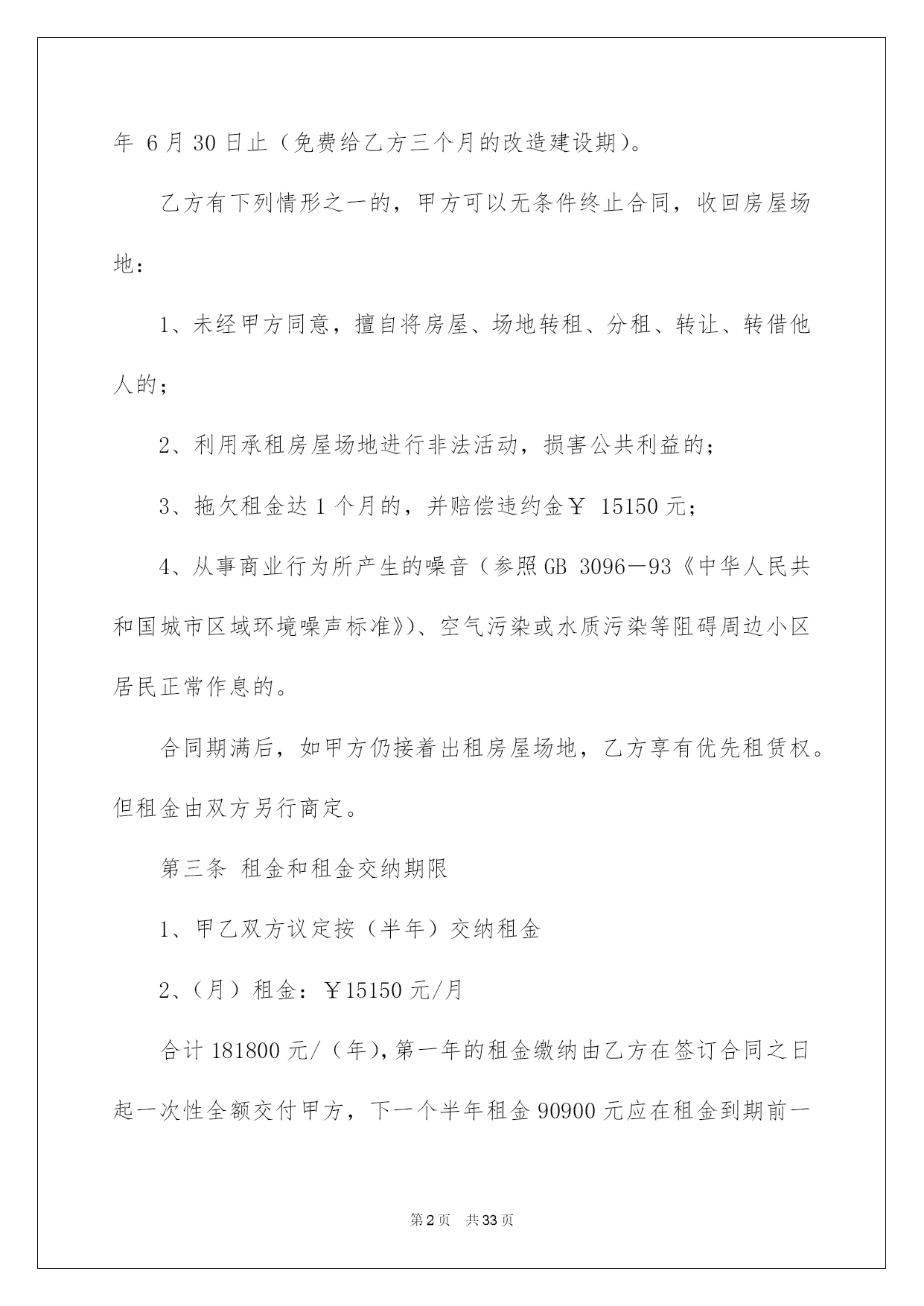 第PAGE\*Arabic\*MERGEFORMAT33页共NUMPAGES\*Arabic\*MERGEFORMAT33页第PAGE\*MERGEFORMAT33页共NUMPAGES\*MERGEFORMAT33页第PAGE\*MERGEFORMAT33页共NUMPAGES\*MERGEFORMAT33页第PAGE\*MERGEFORMAT33页共NUMPAGES\*MERGEFORMAT33页第PAGE\*MERGEFORMAT33页共NUMPAGES\*MERGEFORMAT33页第PAGE\*MERGEFORMAT33页共NUMPAGES\*MERGEFORMAT33页第PAGE\*MERGEFORMAT33页共NUMPAGES\*MERGEFORMAT33页第PAGE\*MERGEFORMAT33页共NUMPAGES\*MERGEFORMAT33页第PAGE\*MERGEFORMAT33页共NUMPAGES\*MERGEFORMAT33页第PAGE\*MERGEFORMAT33页共NUMPAGES\*MERGEFORMAT33页第PAGE\*MERGEFORMAT33页共NUMPAGES\*MERGEFORMAT33页2022场地租赁合同有关场地租赁合同5篇随着时间的推移,越来越多的人通过合同来调和民事关系,签订合同可以使我们的合法权益得到法律的保障。你所见过的合同是什么样的呢?下面是我为大家整理的场地租赁合同5篇,欢迎大家共享。场地租赁合同篇1甲方:开远一行电力有限责任公司(以下简称甲方)乙方:开远市联众汽车运输有限责任公司(以下简称乙方)依据《中华人民共和国合同法》及有关规定,为明确甲方与乙方的权利义务关系,双方在自愿、同等、等价有偿的原则下经过充分协商,特定立本合同。第一条甲方将自有的坐落在开远市西南路原一行建筑公司办公楼一层480平方米、北面新建宿舍楼350平方米及新建钢棚144平方米,及其余附属院内场地,出租给乙方运用。其次条租赁期限双方商定房屋场地租期为60个月,自20xx年4月1日起至20xx年6月30日止(免费给乙方三个月的改造建设期)。乙方有下列情形之一的,甲方可以无条件终止合同,收回房屋场地:1、未经甲方同意,擅自将房屋、场地转租、分租、转让、转借他人的;2、利用承租房屋场地进行非法活动,损害公共利益的;3、拖欠租金达1个月的,并赔偿违约金¥15150元;4、从事商业行为所产生的噪音(参照GB3096-93《中华人民共和国城市区域环境噪声标准》)、空气污染或水质污染等阻碍周边小区居民正常作息的。合同期满后,如甲方仍接着出租房屋场地,乙方享有优先租赁权。但租金由双方另行商定。第三条租金和租金交纳期限1、甲乙双方议定按(半年)交纳租金2、(月)租金:¥15150元/月合计181800元/(年),第一年的租金缴纳由乙方在签订合同之日起一次性全额交付甲方,下一个半年租金90900元应在租金到期前一个月的15日支付给甲方,甲方收取租金时必需出具由政府有关部门监制的收款凭证,无合法收款凭证的乙方可以拒付。4、乙方需交纳¥:15150.00元房屋租赁押金。在签订合同时一次性全额交付甲方。合同期满或终止后无违约行为时一次性全额返还。第四条各项费用的缴纳1、水电费:由乙方自行缴纳;(水表底数为度,电表底数为度,此度数以后的费用由乙方担当,直至合同期满)。2、修理费:租赁期间,由于乙方缘由导致租赁房屋的质量或房屋的内部设施损毁,包括门窗、水电等,修理费由乙方负责。3、运用该房屋场地进行商业活动产生的全部其它各项费用均由乙方缴纳(其中包括但不限于乙方自己申请安装电话、宽带、有线电视等设备的费用)。4、由于租用房屋场地所发生的相关社会费用及义务由乙方负责。第五条租赁期间的房屋场地的运用、修缮和改造1、甲方有义务向乙方交付无质量问题的房屋,双方在对房屋质量验收无问题后再将房屋交给乙方运用。2、钢棚根据起吊3吨货载设计建设,乙方应在设计货载内平安运用该设施,起吊设备由乙方自行安装,证照由乙方办理,运用平安均由乙方负责。3、乙方装修、改造方案需向甲方提出书面申请,经甲方相关部门同意后方可实施。严禁乙方干脆运用东面及南面砖木结构的危房,装修、改造费用及平安均由乙方负责。4、甲方将房屋场地交给乙方后,乙方其经营状况与甲方无关;租期结束或中途双方协商解除合同,乙方不得破坏已装修部分及房屋架构,乙方装修或改造房屋的费用甲方不赐予任何经济补偿,搭建的临时建筑留给甲方运用,产权归属甲方。5、乙方对租赁的房屋及场地负有妥当运用及维护之责任,对各种可能出现的故障和危急应刚好消退,以避开一