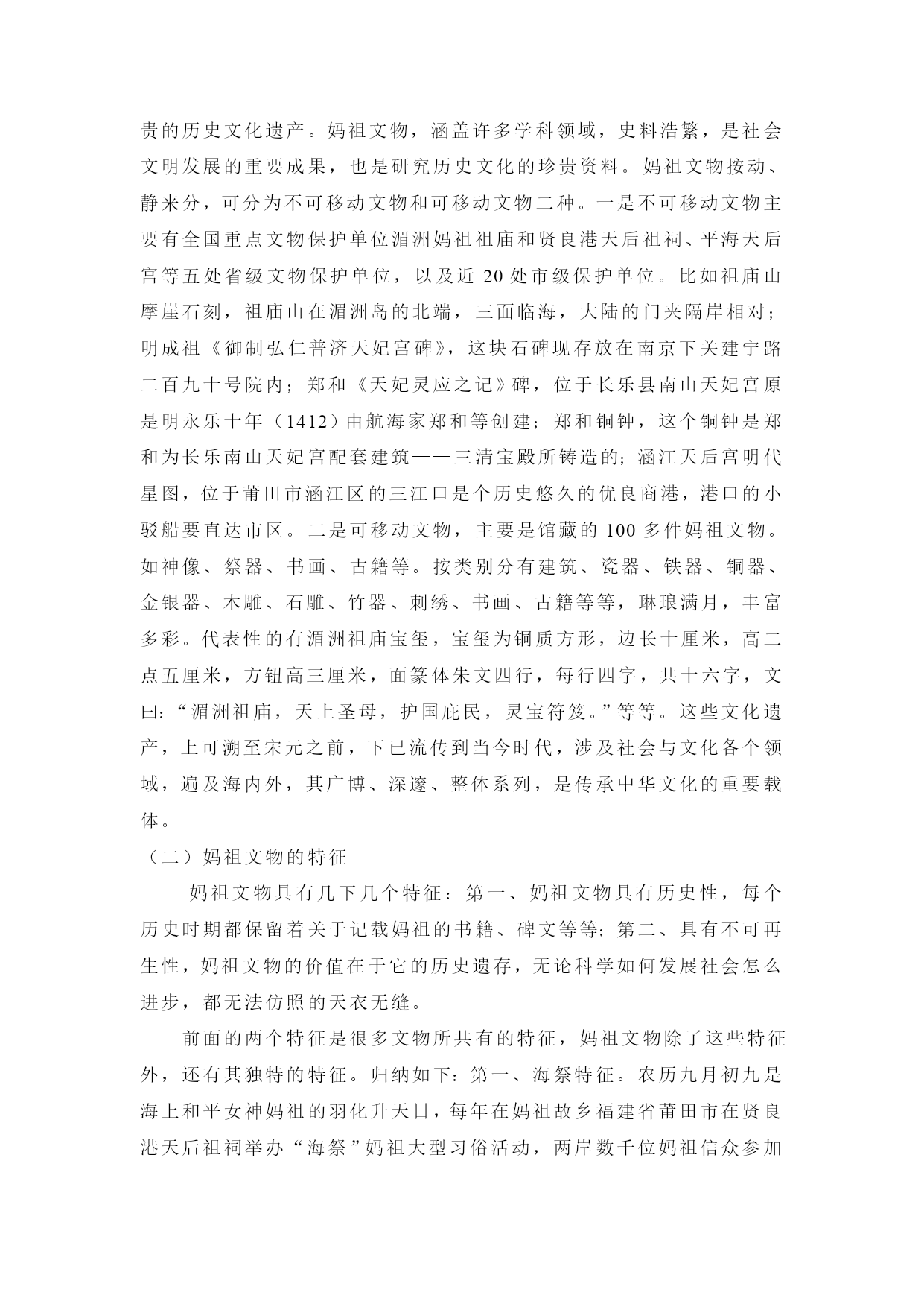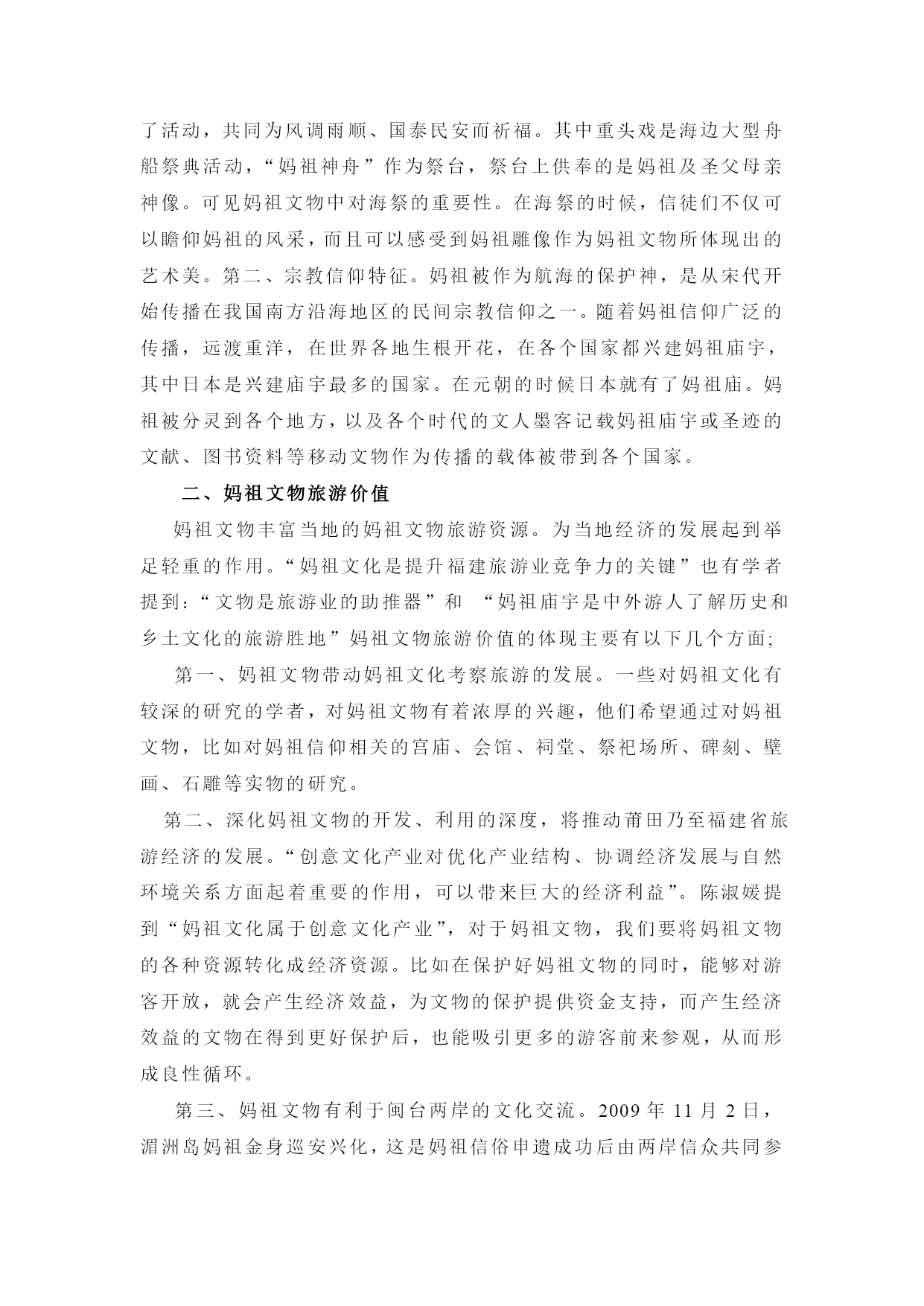 妈祖旅游文物赏析妈祖信仰发源于莆田,莆田保留了丰富的妈祖文物,为我们今天研究妈祖历史、信仰、习俗等提供了不少缺失的资料。随着旅游与HYPERLINK"http://www.homelunwen.com/a/jingjilunwen/"\t"_blank"经济挂钩,越来越多的学者研究妈祖文物的旅游价值。妈祖文化深厚的底蕴丰富了福建旅游内容,为福建旅游业的发展奠定了坚实的基础。妈祖庙内众多的物质文化遗产是古代社会HYPERLINK"http://www.homelunwen.com/a/jingjilunwen/"\t"_blank"经济、文化、HYPERLINK"http://www.homelunwen.com/a/yishulunwen/"\t"_blank"艺术、民俗、海外交往及贸易的等情况的物质载体。拥有研究历代经济史、海交史、民族学、民俗学的可靠原始资料,是妈祖文化考察旅游、修学旅游的理想目的地。妈祖庙宇是中外游人了解历史和乡土文化的旅游胜地,可见妈祖文物作为一种旅游资源,为旅游业所利用。文物旅游丰富了旅游的内容、旅游开发利用可以体现文物的价值、旅游为文物保护创造资金来源。对于妈祖文物的研究,我主要基于前人对妈祖文物的研究,比如李玉昆在《海内外学人论妈祖》提到“妈祖庙宇是中外游人了解历史和乡土文化的旅游胜地”。分析到妈祖庙宇一般选择建在江湖海边,风景优美,交通便捷。有的学者也提到了“文物是旅游业的助推器”深入了解并分析妈祖文物的旅游价值,比如它的美学价值、文化交流等等。通过对妈祖文物的旅游价值的分析来促进当地旅游业的发展。对于如何保护妈祖文物,柯凤梅提到要建立妈祖文物管理机构、设立专题的陈列馆、抢救和征集妈祖文物、深入开展研究工作。同时在面对妈祖文物旅游资源的现状,有的学者就提出了保护性开发策略。我们对妈祖文物旅游价值及其开发研究,一方面可以丰富当地的旅游价值。另一方面对妈祖文化的传承起到一定的作用。通过对妈祖文物旅游价值及其开发研究,是为了从多角度了解妈祖文物的旅游价值;运用保护性的开发策略,是为了在开发的过程中能够保护妈祖文物。妈祖旅游具有宗教色彩,开发妈祖文物的旅游价值有助于莆田发展妈祖宗教旅游。一、妈祖文物主要类型及其特征(一)妈祖文物主要类型文物是人类在历史发展过程中遗留下来的遗物、遗迹。它是人类宝贵的历史文化遗产。妈祖文物,涵盖许多学科领域,史料浩繁,是社会文明发展的重要成果,也是研究历史文化的珍贵资料。妈祖文物按动、静来分,可分为不可移动文物和可移动文物二种。一是不可移动文物主要有全国重点文物保护单位湄洲妈祖祖庙和贤良港天后祖祠、平海天后宫等五处省级文物保护单位,以及近20处市级保护单位。比如祖庙山摩崖石刻,祖庙山在湄洲岛的北端,三面临海,大陆的门夹隔岸相对;明成祖《御制弘仁普济天妃宫碑》,这块石碑现存放在南京下关建宁路二百九十号院内;郑和《天妃灵应之记》碑,位于长乐县南山天妃宫原是明永乐十年(1412)由航海家郑和等创建;郑和铜钟,这个铜钟是郑和为长乐南山天妃宫配套建筑——三清宝殿所铸造的;涵江天后宫明代星图,位于莆田市涵江区的三江口是个历史悠久的优良商港,港口的小驳船要直达市区。二是可移动文物,主要是馆藏的100多件妈祖文物。如神像、祭器、书画、古籍等。按类别分有建筑、瓷器、铁器、铜器、金银器、木雕、石雕、竹器、刺绣、书画、古籍等等,琳琅满月,丰富多彩。代表性的有湄洲祖庙宝玺,宝玺为铜质方形,边长十厘米,高二点五厘米,方钮高三厘米,面篆体朱文四行,每行四字,共十六字,文曰:“湄洲祖庙,天上圣母,护国庇民,灵宝符笈。”等等。这些文化遗产,上可溯至宋元之前,下已流传到当今时代,涉及社会与文化各个领域,遍及海内外,其广博、深邃、整体系列,是传承中华文化的重要载体。(二)妈祖文物的特征妈祖文物具有几下几个特征:第一、妈祖文物具有历史性,每个历史时期都保留着关于记载妈祖的书籍、碑文等等;第二、具有不可再生性,妈祖文物的价值在于它的历史遗存,无论科学如何发展社会怎么进步,都无法仿照的天衣无缝。前面的两个特征是很多文物所共有的特征,妈祖文物除了这些特征外,还有其独特的特征。归纳如下:第一、海祭特征。农历九月初九是海上和平女神妈祖的羽化升天日,每年在妈祖故乡福建省莆田市在贤良港天后祖祠举办“海祭”妈祖大型习俗活动,两岸数千位妈祖信众参加了活动,共同为风调雨顺、国泰民安而祈福。其中重头戏是海边大型舟船祭典活动,“妈祖神舟”作为祭台,祭台上供奉的是妈祖及圣父母亲神像。可见妈祖文物中对海祭的重要性。在海祭的时候,信徒们不仅可以瞻仰妈祖的风采,而且可以感受到妈祖雕像作为妈祖文物所体现出的艺术美。第二、宗教信仰特征。妈祖被作为航海的保护神,是从宋代开始传播在我国南方沿海地区的民间宗教信仰之一。随着妈祖信仰广