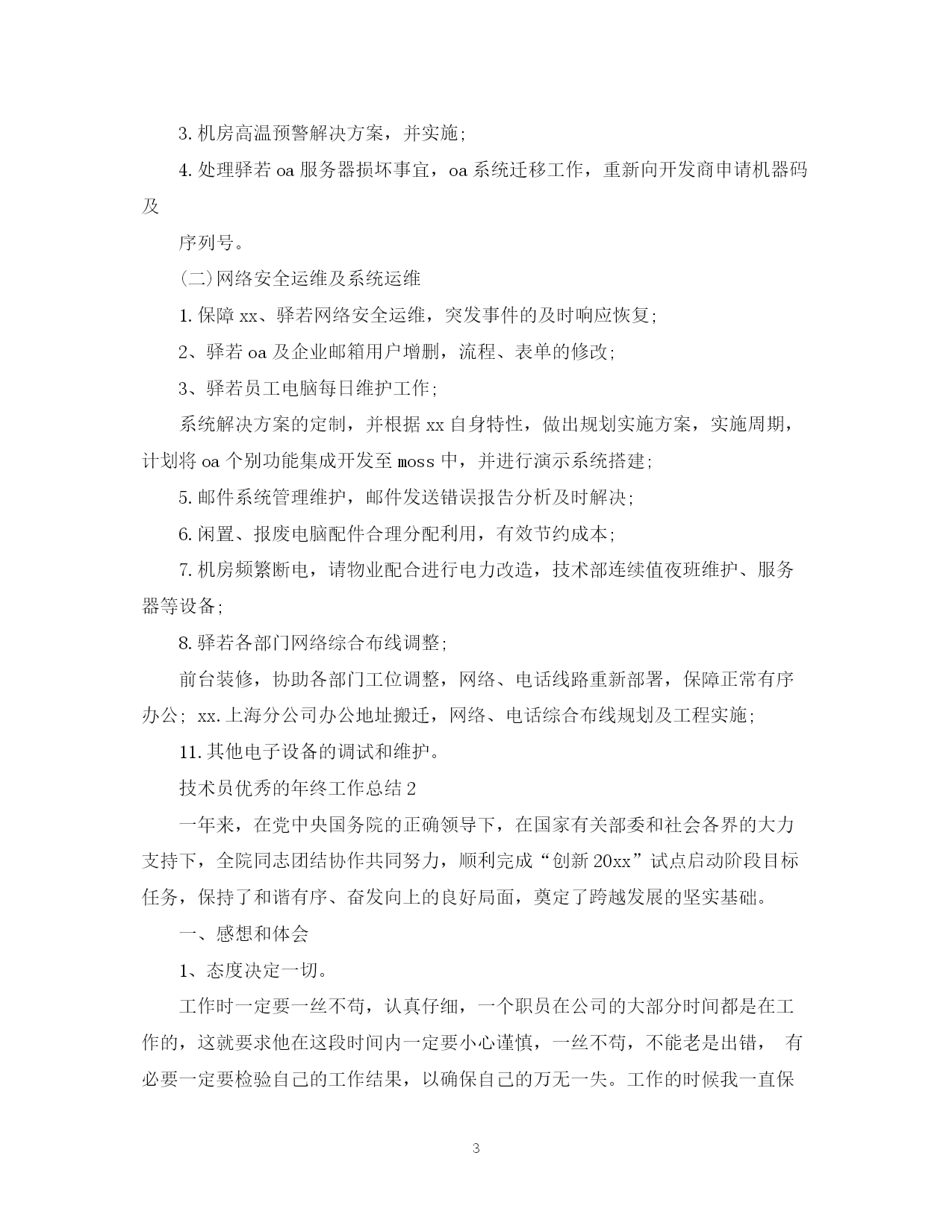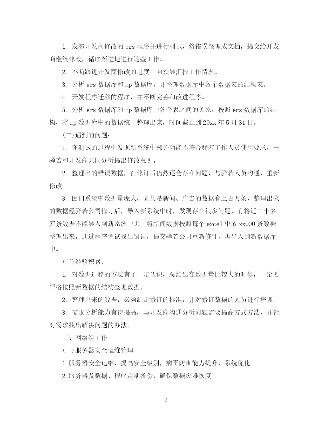 此资料由网络收集而来,如有侵权请告知上传者立即删除。资料共分享,我们负责传递知识。PAGEPAGE12技术员优秀的年终工作总结总结是对自身社会实践进行回顾的产物,它以自身工作实践为材料,采用的是第一人称写法,其中的成绩、做法、经验、教训等,都有自指性的特征。下面是范文网小编为您精心整理的技术员优秀的年终工作总结。技术员优秀的年终工作总结120xx年度是技术部快速、稳步、持续发展的一年。在公司各位领导大力支持下以服务作为技术部的工作重心,努力打造安全、稳定、高效的企业网络,在信息化建设、信息安全保障、系统研发等项目中,与各部门紧密配合,顺利完成了20xx年度的工作任务,发挥了技术部技术支持的工作职责。现将20xx年度的工作总结如下:一、年度大事件1、xx传播机构信息化建设,xxoa的功能修改,逐步完善业务、人力行政、财务等流程,使信息平台支撑公司的制度执行;2、ers系统前期自行开发,后续工作外包给开发商,与开发商的技术对接及进度跟进,测试修改程序,以及数据迁移工作;3、moss系统解决方案的定制,并根据xx自身特性,做出规划实施方案和实施周期,计划将oa个别功能集成开发至moss中;4、配合公司的种子计划提供技术支持;5、xx机房高温预警解决方案;6、保障总部、分支机构网络安全运维,突发事件的及时响应恢复;7、上海分公司办公地址搬迁,网络、电话综合布线规划及工程实施;8、企业域名续费及备案工作;9、部门人员流动,做好人员及时补充,避免工作衔接疏漏可能造成的工作停滞;xx、协助公司制作绿色办公宣传报,协调xx十周年庆活动筹备工作。二、开发组工作(一)ers系统开发工作:1.发布开发商修改的ers程序并进行测试,将错误整理成文档,提交给开发商继续修改,循序渐进地进行这些工作。2.不断跟进开发商修改的进度,向领导汇报工作情况。3.分析ers数据库和mp数据库,并整理数据库中各个数据表的结构表。4.开发程序迁移的程序,并不断完善和改进程序。5.分析ers数据库和mp数据库中各个表之间的关系,按照ers数据库的结构,将mp数据库中的数据统一整理出来,时间截止到20xx年5月31日。(二)遇到的问题:1.在测试的过程中发现新系统中部分功能不符合驿若工作人员使用要求,与驿若和开发商共同分析提出修改意见。2.整理出的错误数据,在修订后仍然还会存在问题,与驿若人员沟通,重新修改。3.因旧系统中数据量庞大,尤其是新闻、广告的数据有上百万条,整理出来的数据经驿若公司修订后,导入新系统中时,发现存在很多问题,有将近二十多万条数据不能导入到新系统中去。将新闻数据按照每个excel中放xx000条数据整理出来,通过程序调试找出错误,提交驿若公司重新修订,再导入到新数据库中。(三)经验积累:1.对数据迁移的方法有了一定认识,总结出在数据量比较大的时候,一定要严格按照新数据的结构整理数据。2.整理出来的数据,必须制定修订的标准,并对修订数据的人员进行培训。3.需求分析能力有待提高,与开发商沟通分析问题需要提高方式方法,并针对需求找出解决问题的办法。三、网络组工作(一)服务器安全运维管理1.服务器安全运维,提高安全级别,病毒防御能力提升,系统优化;2.服务器及数据、程序定期备份,确保数据灾难恢复;3.机房高温预警解决方案,并实施;4.处理驿若oa服务器损坏事宜,oa系统迁移工作,重新向开发商申请机器码及序列号。(二)网络安全运维及系统运维1.保障xx、驿若网络安全运维,突发事件的及时响应恢复;2、驿若oa及企业邮箱用户增删,流程、表单的修改;3、驿若员工电脑每日维护工作;系统解决方案的定制,并根据xx自身特性,做出规划实施方案,实施周期,计划将oa个别功能集成开发至moss中,并进行演示系统搭建;5.邮件系统管理维护,邮件发送错误报告分析及时解决;6.闲置、报废电脑配件合理分配利用,有效节约成本;7.机房频繁断电,请物业配合进行电力改造,技术部连续值夜班维护、服务器等设备;8.驿若各部门网络综合布线调整;前台装修,协助各部门工位调整,网络、电话线路重新部署,保障正常有序办公;xx.上海分公司办公地址搬迁,网络、电话综合布线规划及工程实施;11.其他电子设备的调试和维护。技术员优秀的年终工作总结2一年来,在党中央国务院的正确领导下,在国家有关部委和社会各界的大力支持下,全院同志团结协作共同努力,顺利完成“创新20xx”试点启动阶段目标任务,保持了和谐有序、奋发向上的良好局面,奠定了跨越发展的坚实基础。一、感想和体会1、态度决定一切。工作时一定要一丝不苟,认真仔细,一个职员在公司的大部分时间都是在工作的,这就要求他在这段时间内一定要小心谨慎