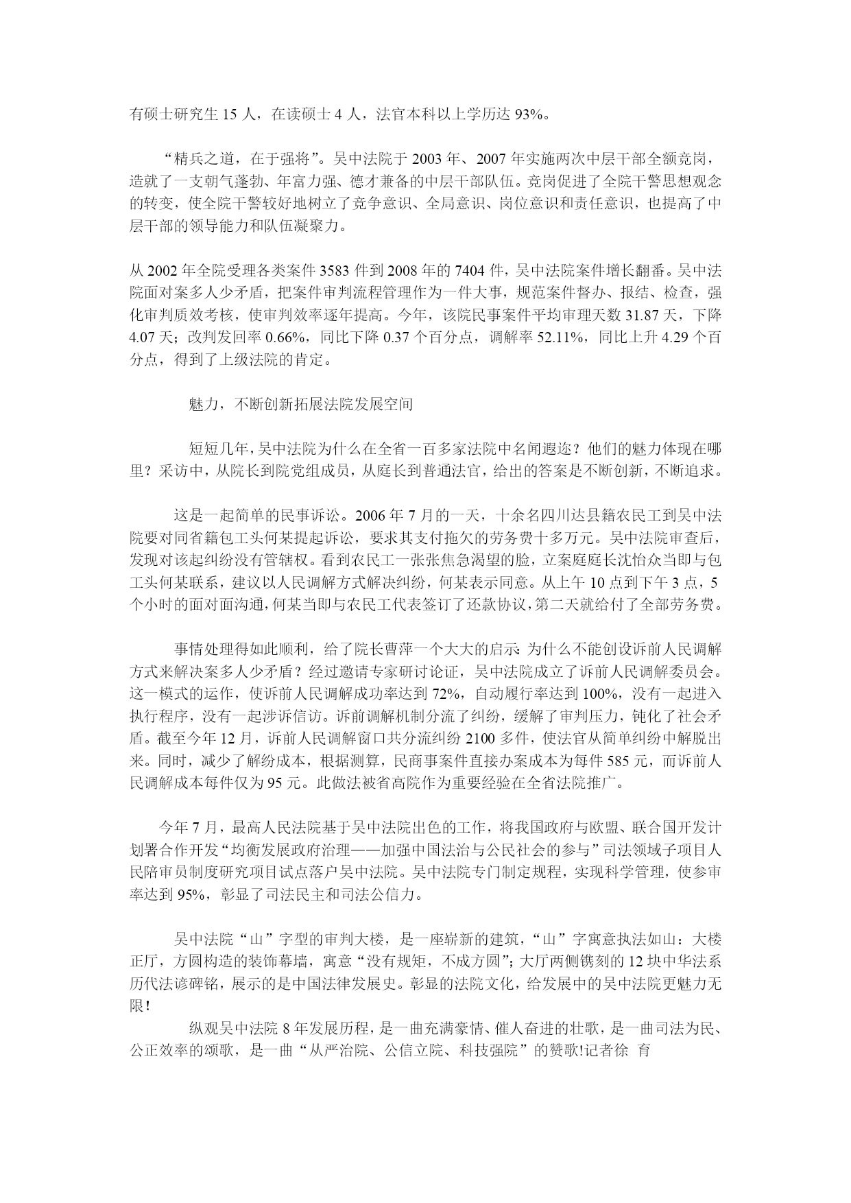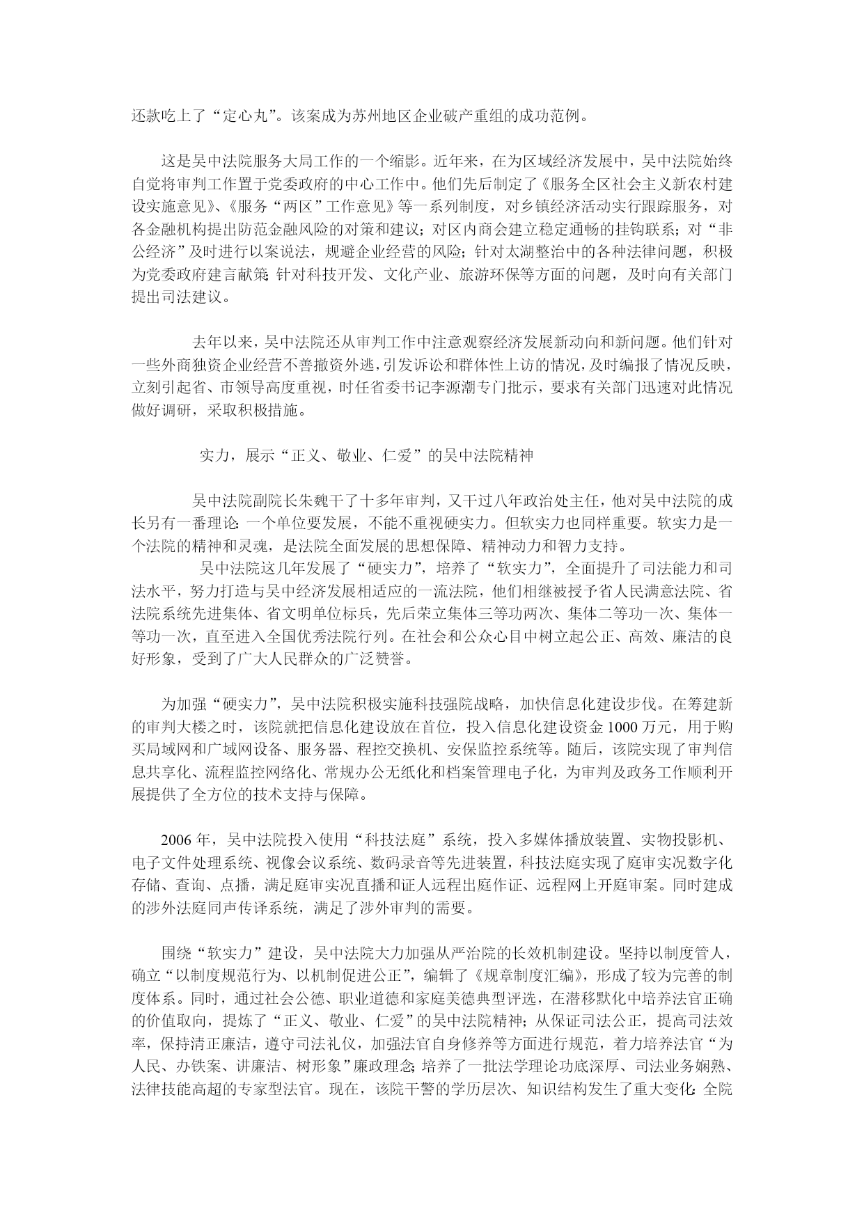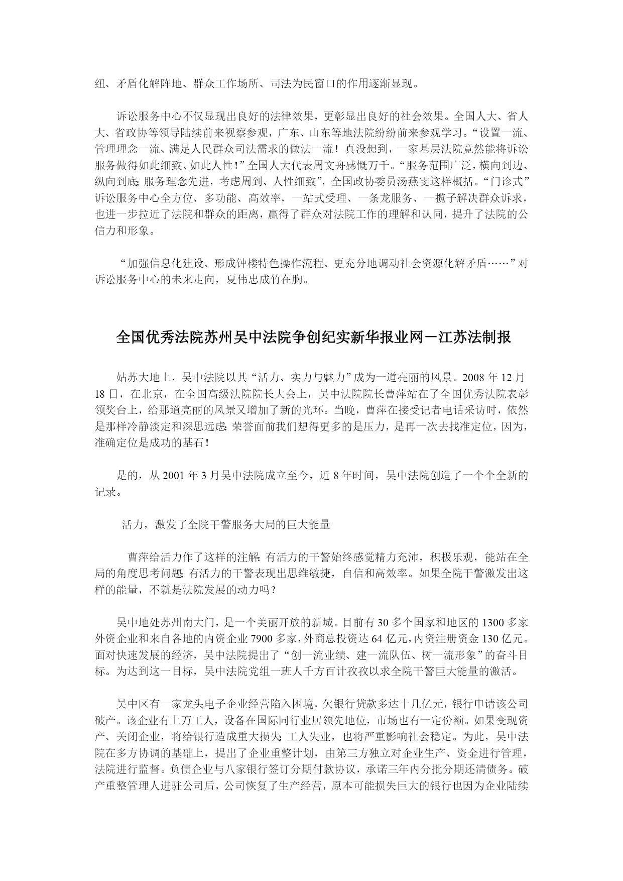 殷切温情凸显司法关怀常州市钟楼区法院创建“门诊式”诉讼服务中心纪实与时俱进,创先争优,情系群众。常州市钟楼区法院继2007年设立全省首家常驻法院的“民调窗口”工作机制,被誉为“钟楼模式”在全省法院推广并享誉全国之后,一系列成绩和荣誉也接踵而至:2008年到2010年,实现了全省法院系统集体三等功到一等功的“三级跳”;在常州市中级法院对基层法院审判质效考评中,连续5年名列前茅;今年上半年,又荣获全省法院“诉讼服务中心示范单位”“诉讼服务中心建设工作先进集体”“审判管理工作先进集体”等一系列殊荣。今年初率先在全省打造的“门诊式”诉讼服务中心也取得了令人瞩目的成效。5月31日,省法院组织全国、省人大代表、政协委员到该院视察并充分肯定。常州中院院长姜洪鲁则用24个字评价该院“门诊式”诉讼服务中心“环境优美、功能齐全、运行良好、便利百姓、一站解纷、成效显著”。“钟楼法院为更好地满足人民群众的司法需求,以简易案件‘门诊式’高效化解、疑难案件‘住院’精细化管理、提供全方位司法服务为导向,全面创建有自身特色的‘门诊式’诉讼服务中心,努力惠及人民群众。”7月6日,该院诉讼服务中心建设的经验做法又被省高院转发,供各地法院学习参鉴。服务:从简约粗放到细致人性究竟是什么样的手笔成就了钟楼法院司法为民征程上的高歌猛进?记者来到钟楼法院一探究竟。一走进该院诉讼服务中心大厅,感受到的是从内而外的阵阵清凉。“诉讼服务中心着眼于服务,服务就是法院放下身段,让群众感觉宾至如归。医院门诊式管理和酒店人性化服务的结合是我们的追求。”这是钟楼法院院长夏伟忠对诉讼服务中心职能的定位。理念是行动的先导。在推进诉讼服务中心建设的实践中,钟楼法院以打造人民群众欢迎、司法形象提升的群众工作场所为目标,通过优化服务、完善功能、创新机制,将“服务、分流、解纷”三大功能集于一身,将诉讼服务、诉调对接、诉前调解、立案受理、案件速裁(执)五大机制融为一体,通过不断改造基础设施、拓展服务职能、创新服务方式,实现了诉讼服务从简约粗放到细致人性的转化。一枝一叶总关情。钟楼法院将服务与关怀渗入到每一个角落,原来700多平方的立案大厅被拓展成2000多平方的诉讼服务中心,设立了纠纷分流区、诉(执)前事务办理区、简案快审(执)办理区三大分区,环环相扣、提供一站式服务;原来的立案窗口被增加为集立案审查、诉讼指导、材料收转、执行督促等八大职能为一体的综合服务平台,添置了资料查询系统、电子叫号系统、满意度评价系统、身份识别系统四大系统,交相呼应、实现全方位便民。除了笔墨纸张、便民雨伞等常规项目,还新增了专职导诉处、放置无声电视和书报杂志的休息等候处、88891114电话咨询人工答复处等等便民内容。为满足离婚等案件当事人保护隐私的需要,专门设置了用透明玻璃隔断的“私密谈话工作室”;为免去当事人携带大额现金保管不便,专门添置POS机刷卡缴费室……优质、周到、便捷、温馨的诉讼服务最大限度地满足了人民群众的需求。功能:从偏重程序到实体并重今年初,姜洪鲁提出打造法院“门诊大楼”,并指名钟楼区法院为全市诉讼服务中心建设试点单位。“简易案件‘门诊’速裁、疑难复杂案件移送审判业务庭‘住院治疗’、重大群体性纠纷及矛盾易激化的纠纷诉前多元联调‘会诊’、根据纠纷特点深入社区街道开展‘巡诊’。”姜洪鲁对钟楼法院诉讼服务中心解纷功能的比喻很是形象生动。南京来的陈律师是一起民间借贷纠纷的原告代理人,考虑到他是从外地过来的,为避免其往返之累,立案法官在收案后立刻将案件转交速裁中心法官,速裁法官又立即联系了被告,并即刻展开了调解。经过数轮晓之以理、动之以情的沟通协调,最终双方达成了调解协议。“真是想不到,原以为至少要跑三四趟,没想到两小时就解决了。”这就是诉讼服务中心法官工作的常态。按照“便利、有效、低成本”的工作要求,钟楼法院在对诉讼服务中心进行扩建的基础上,以提供全方位的司法为民服务为导向,对中心功能进行了调整,从注重诉讼程序便利,向既注重程序更注重提供便利的纠纷解决方式、实现矛盾的实体化解转变。本着关口前移、下沉中心,实现“现代、低碳、可持续”解决纷争的目标,钟楼法院合理分工,统筹安排,整合资源,优化配置,从各部门抽调审判经验丰富的法官和优秀青年干警配置到诉讼服务中心,在简案快审(执)办理区设立速裁法庭、特聘调解员工作室、快速执行工作室等,完善工作制度和工作流程,规范服务行为和工作作风,着重从实体上快速解决当事人的纷争。一方面,继续充分发挥驻法院“民调窗口”、驻街道“诉前(涉诉)矛盾纠纷调解室”、驻社区“涉诉矛盾纠纷调解点”三级调解网络和“派驻法官”作用,加强诉前调解,对追索赡养及抚养(育)费案件、继承与收养等案件,争取诉前解决。另一方面,对业已立案的民商案件实行繁简分流,其中事实清楚
