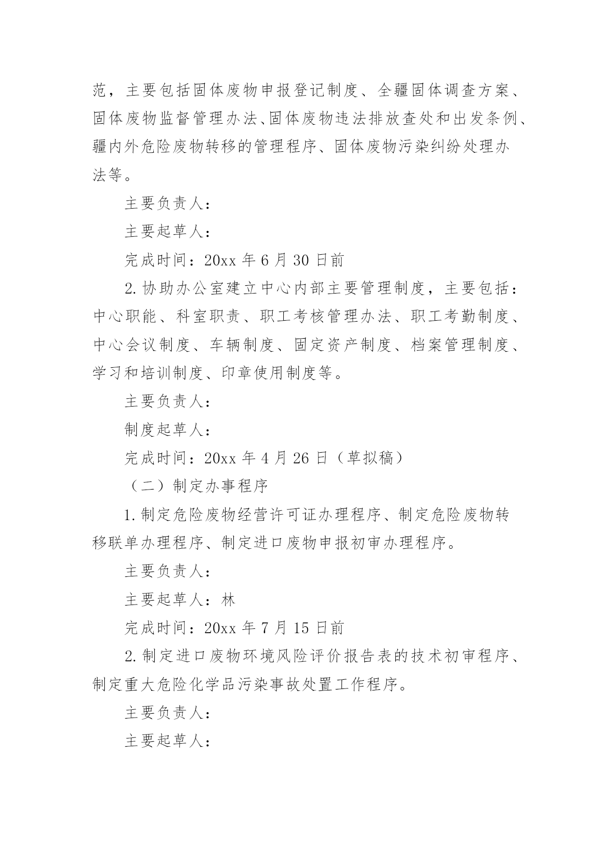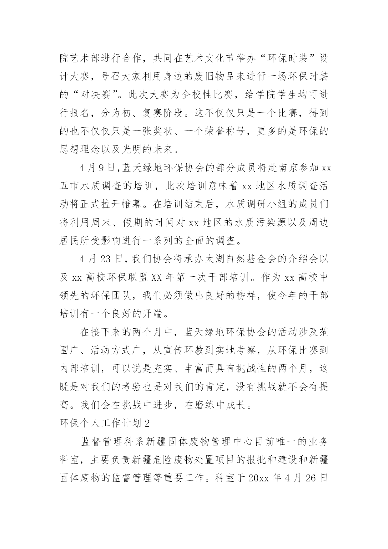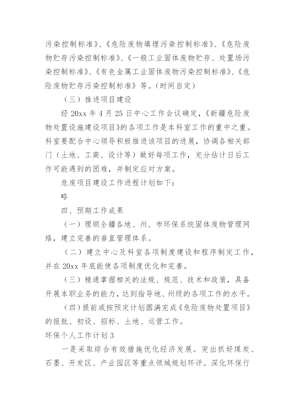环保个人工作计划环保个人工作计划时间的脚步是无声的,它在不经意间流逝,我们又将接触新的知识,学习新的技能,积累新的经验,此时此刻我们需要开始制定一个计划。你所接触过的计划都是什么样子的呢?以下是小编帮大家整理的环保个人工作计划,供大家参考借鉴,希望可以帮助到有需要的朋友。环保个人工作计划1四月悄悄走近,随着3月26日“地球一小时”活动圆满落幕,4月22日“世界地球日”又将悄然而至。今年的“世界地球日”活动准备分为校内、校外两块进行:校内:我们将再次和学校后勤服务处进行合作,在“世界地球日”那天举行绿色校园的启动仪式。绿色校园的主要内容为号召大家以个人或者班级的名义领养校园内的植物以及绿化带,保护我们自己的家园。而我们协会则起到中间枢纽的'作用,在同学们和后勤服务处之间进行沟通和交流,将校园绿化状况得到很好改善。校外:基于我们协会和花园西村良好合作的关系,我们将在4月21日下午于花园西村进行“世界地球日”的宣传活动,使环保深入民心。此外,我们蓝天绿地环保协会也将与化学与环境工程学院艺术部进行合作,共同在艺术文化节举办“环保时装”设计大赛,号召大家利用身边的废旧物品来进行一场环保时装的“对决赛”。此次大赛为全校性比赛,给学院学生均可进行报名,分为初、复赛阶段。这不仅仅只是一个比赛,得到的也不仅仅只是一张奖状、一个荣誉称号,更多的是环保的思想理念以及光明的未来。4月9日,蓝天绿地环保协会的部分成员将赴南京参加xx五市水质调查的培训,此次培训意味着xx地区水质调查活动将正式拉开帷幕。在培训结束后,水质调研小组的成员们将利用周末、假期的时间对xx地区的水质污染源以及周边居民所受影响进行一系列的全面的调查。4月23日,我们协会将承办太湖自然基金会的介绍会以及xx高校环保联盟XX年第一次干部培训。作为xx高校中领先的环保团队,我们必须做出良好的榜样,使今年的干部培训有一个良好的开端。在接下来的两个月中,蓝天绿地环保协会的活动涉及范围广、活动方式广,从宣传环教到实地考察,从环保比赛到内部培训,可以说是充实、丰富而具有挑战性的两个月,这既是对我们的考验也是对我们的肯定,没有挑战就不会有提高。我们会在挑战中进步,在磨练中成长。环保个人工作计划2监督管理科系新疆固体废物管理中心目前唯一的业务科室,主要负责新疆危险废物处置项目的报批和建设和新疆固体废物的监督管理等重要工作。科室于20xx年4月26日宣布成立,现有职员2名,科长、科员各1名。为能结合中心目前面临的实际情况,很好的配合中心领导启动进新业务,建立健全中心管理制度、全疆固体废物监管工作的制度、程序和规范;快速推进危险废物处置建设项目的进程,特制定20xx年监管科科室工作计划,以确保科室各项工作的开展能快速度、高效率、有条不紊地展开,成功完成中心领导交办的所有任务。一、工作指导思想监督管理科各项业务的开展必须坚持马克思主义的哲学思想,遵循“抓主要矛盾”、“动态的看待和解决问题”、辩证地处理工作中遇到地困难和障碍。在新业务的开展上,既要借鉴和学习同行业(如内地固体废物管理业务的开展情况)的经验,又要结合我中心的实际情况,在此基础上实现发展和创新,大事小事追求最好,实现人无我有、人有我新,极力打造实力派业务科室,为树立固废中心良好形象做贡献。二、工作实施原则确立《新疆危险废物处置设施建设项目》的前期工作为下半年工作重点,同时开展制度建立、业务学习、固废调研、工作程序等业务。坚持每项工作没有不重要,只有最重要的原则;在重点工作上投入更大精力的同时,不轻视其他工作的重要性。三、工作内容和进度(一)建立工作制度1.制定新疆固体废物监管工作制度、办事程序和技术规范,主要包括固体废物申报登记制度、全疆固体调查方案、固体废物监督管理办法、固体废物违法排放查处和出发条例、疆内外危险废物转移的管理程序、固体废物污染纠纷处理办法等。主要负责人:主要起草人:完成时间:20xx年6月30日前2.协助办公室建立中心内部主要管理制度,主要包括:中心职能、科室职责、职工考核管理办法、职工考勤制度、中心会议制度、车辆制度、固定资产制度、档案管理制度、学习和培训制度、印章使用制度等。主要负责人:制度起草人:完成时间:20xx年4月26日(草拟稿)(二)制定办事程序1.制定危险废物经营许可证办理程序、制定危险废物转移联单办理程序、制定进口废物申报初审办理程序。主要负责人:主要起草人:林完成时间:20xx年7月15日前2.制定进口废物环境风险评价报告表的技术初审程序、制定重大危险化学品污染事故处置工作程序。主要负责人:主要起草人:完成时间:20xx年10月30日前(三)开展业务学习1.法律法规学习,主要包括《中华人民共和国固体废物污染防治法》(20xx版)。学习方式:自学+交流相关人员:全部截止时间:20xx年5月1日前2.固体