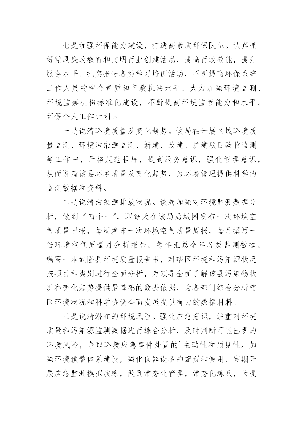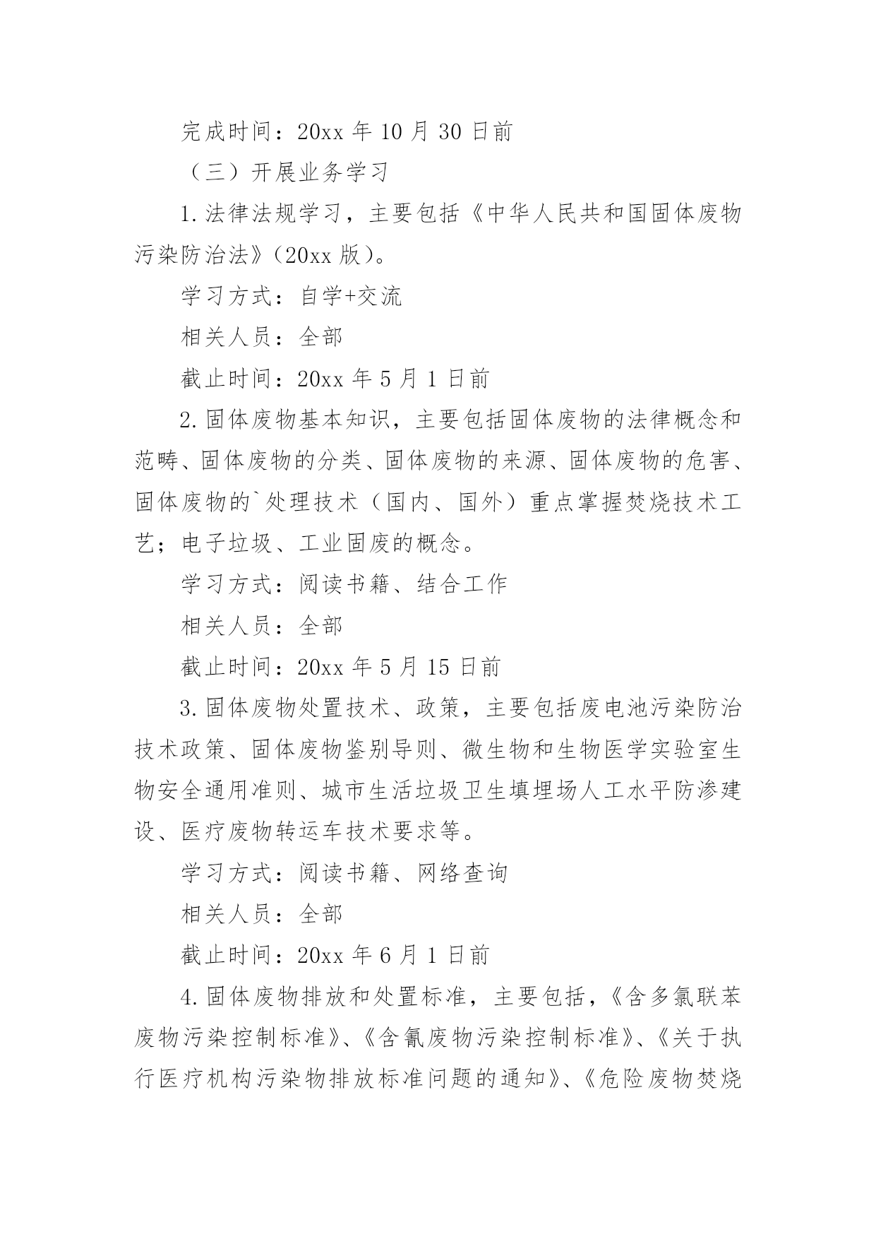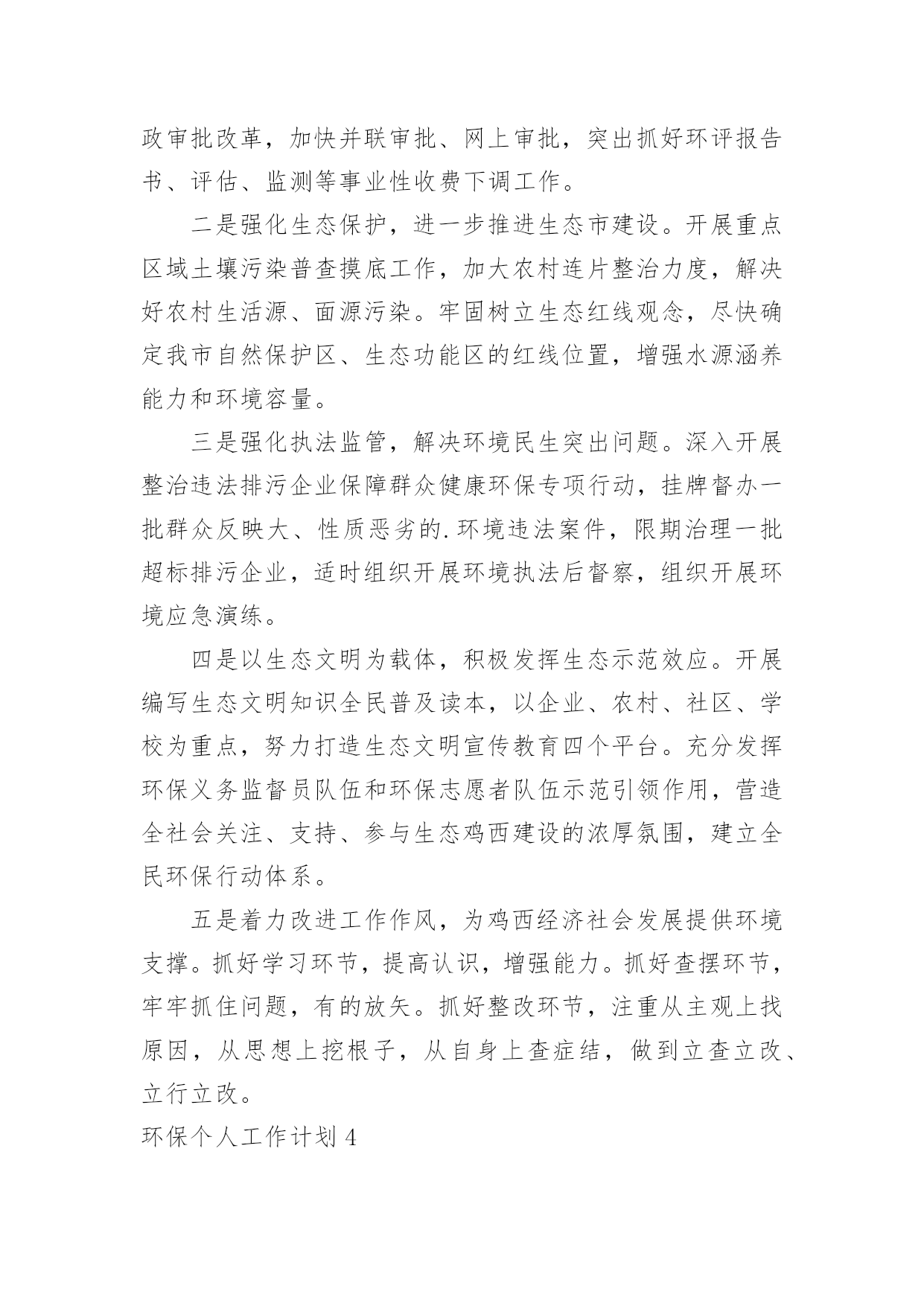 环保个人工作计划环保个人工作计划时间的脚步是无声的,它在不经意间流逝,我们又将接触新的知识,学习新的技能,积累新的经验,此时此刻我们需要开始制定一个计划。你所接触过的计划都是什么样子的呢?以下是小编帮大家整理的环保个人工作计划,供大家参考借鉴,希望可以帮助到有需要的朋友。环保个人工作计划1四月悄悄走近,随着3月26日“地球一小时”活动圆满落幕,4月22日“世界地球日”又将悄然而至。今年的“世界地球日”活动准备分为校内、校外两块进行:校内:我们将再次和学校后勤服务处进行合作,在“世界地球日”那天举行绿色校园的启动仪式。绿色校园的主要内容为号召大家以个人或者班级的名义领养校园内的植物以及绿化带,保护我们自己的家园。而我们协会则起到中间枢纽的'作用,在同学们和后勤服务处之间进行沟通和交流,将校园绿化状况得到很好改善。校外:基于我们协会和花园西村良好合作的关系,我们将在4月21日下午于花园西村进行“世界地球日”的宣传活动,使环保深入民心。此外,我们蓝天绿地环保协会也将与化学与环境工程学院艺术部进行合作,共同在艺术文化节举办“环保时装”设计大赛,号召大家利用身边的废旧物品来进行一场环保时装的“对决赛”。此次大赛为全校性比赛,给学院学生均可进行报名,分为初、复赛阶段。这不仅仅只是一个比赛,得到的也不仅仅只是一张奖状、一个荣誉称号,更多的是环保的思想理念以及光明的未来。4月9日,蓝天绿地环保协会的部分成员将赴南京参加xx五市水质调查的培训,此次培训意味着xx地区水质调查活动将正式拉开帷幕。在培训结束后,水质调研小组的成员们将利用周末、假期的时间对xx地区的水质污染源以及周边居民所受影响进行一系列的全面的调查。4月23日,我们协会将承办太湖自然基金会的介绍会以及xx高校环保联盟XX年第一次干部培训。作为xx高校中领先的环保团队,我们必须做出良好的榜样,使今年的干部培训有一个良好的开端。在接下来的两个月中,蓝天绿地环保协会的活动涉及范围广、活动方式广,从宣传环教到实地考察,从环保比赛到内部培训,可以说是充实、丰富而具有挑战性的两个月,这既是对我们的考验也是对我们的肯定,没有挑战就不会有提高。我们会在挑战中进步,在磨练中成长。环保个人工作计划2监督管理科系新疆固体废物管理中心目前唯一的业务科室,主要负责新疆危险废物处置项目的报批和建设和新疆固体废物的监督管理等重要工作。科室于20xx年4月26日宣布成立,现有职员2名,科长、科员各1名。为能结合中心目前面临的实际情况,很好的配合中心领导启动进新业务,建立健全中心管理制度、全疆固体废物监管工作的制度、程序和规范;快速推进危险废物处置建设项目的进程,特制定20xx年监管科科室工作计划,以确保科室各项工作的开展能快速度、高效率、有条不紊地展开,成功完成中心领导交办的所有任务。一、工作指导思想监督管理科各项业务的开展必须坚持马克思主义的哲学思想,遵循“抓主要矛盾”、“动态的看待和解决问题”、辩证地处理工作中遇到地困难和障碍。在新业务的开展上,既要借鉴和学习同行业(如内地固体废物管理业务的开展情况)的经验,又要结合我中心的实际情况,在此基础上实现发展和创新,大事小事追求最好,实现人无我有、人有我新,极力打造实力派业务科室,为树立固废中心良好形象做贡献。二、工作实施原则确立《新疆危险废物处置设施建设项目》的前期工作为下半年工作重点,同时开展制度建立、业务学习、固废调研、工作程序等业务。坚持每项工作没有不重要,只有最重要的原则;在重点工作上投入更大精力的同时,不轻视其他工作的重要性。三、工作内容和进度(一)建立工作制度1.制定新疆固体废物监管工作制度、办事程序和技术规范,主要包括固体废物申报登记制度、全疆固体调查方案、固体废物监督管理办法、固体废物违法排放查处和出发条例、疆内外危险废物转移的管理程序、固体废物污染纠纷处理办法等。主要负责人:主要起草人:完成时间:20xx年6月30日前2.协助办公室建立中心内部主要管理制度,主要包括:中心职能、科室职责、职工考核管理办法、职工考勤制度、中心会议制度、车辆制度、固定资产制度、档案管理制度、学习和培训制度、印章使用制度等。主要负责人:制度起草人:完成时间:20xx年4月26日(草拟稿)(二)制定办事程序1.制定危险废物经营许可证办理程序、制定危险废物转移联单办理程序、制定进口废物申报初审办理程序。主要负责人:主要起草人:林完成时间:20xx年7月15日前2.制定进口废物环境风险评价报告表的技术初审程序、制定重大危险化学品污染事故处置工作程序。主要负责人:主要起草人:完成时间:20xx年10月30日前(三)开展业务学习1.法律法规学习,主要包括《中华人民共和国固体废物污染防治法》(20xx版)。学习方式:自学+交流相关人员:全部截止时间:20xx年5月1日前2.固体