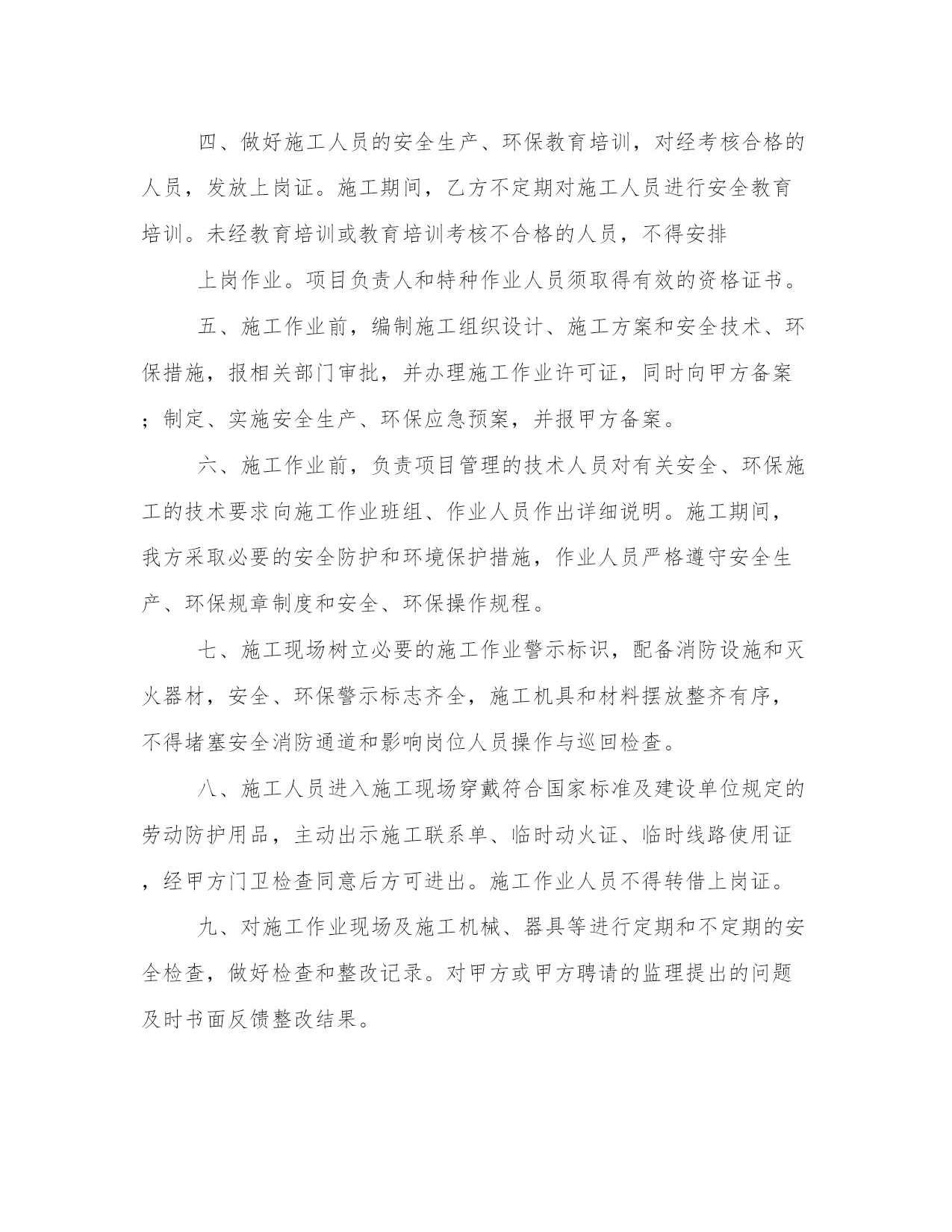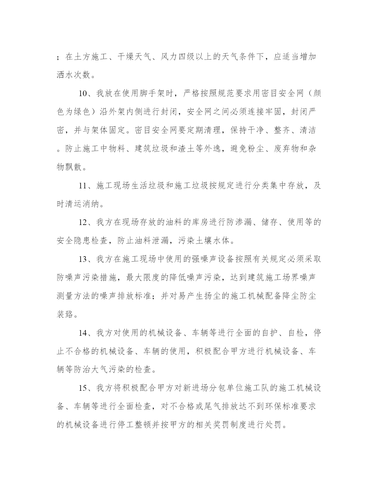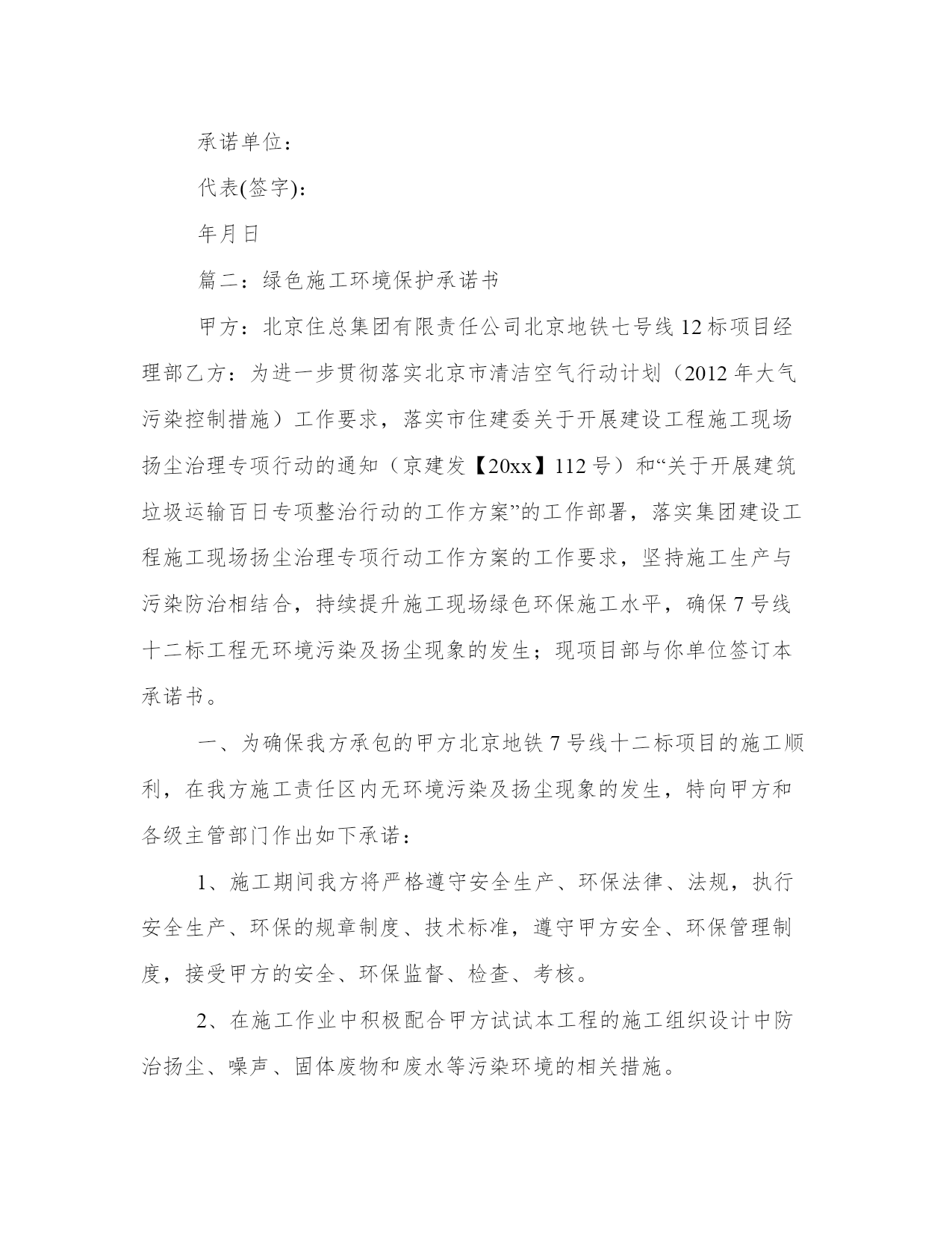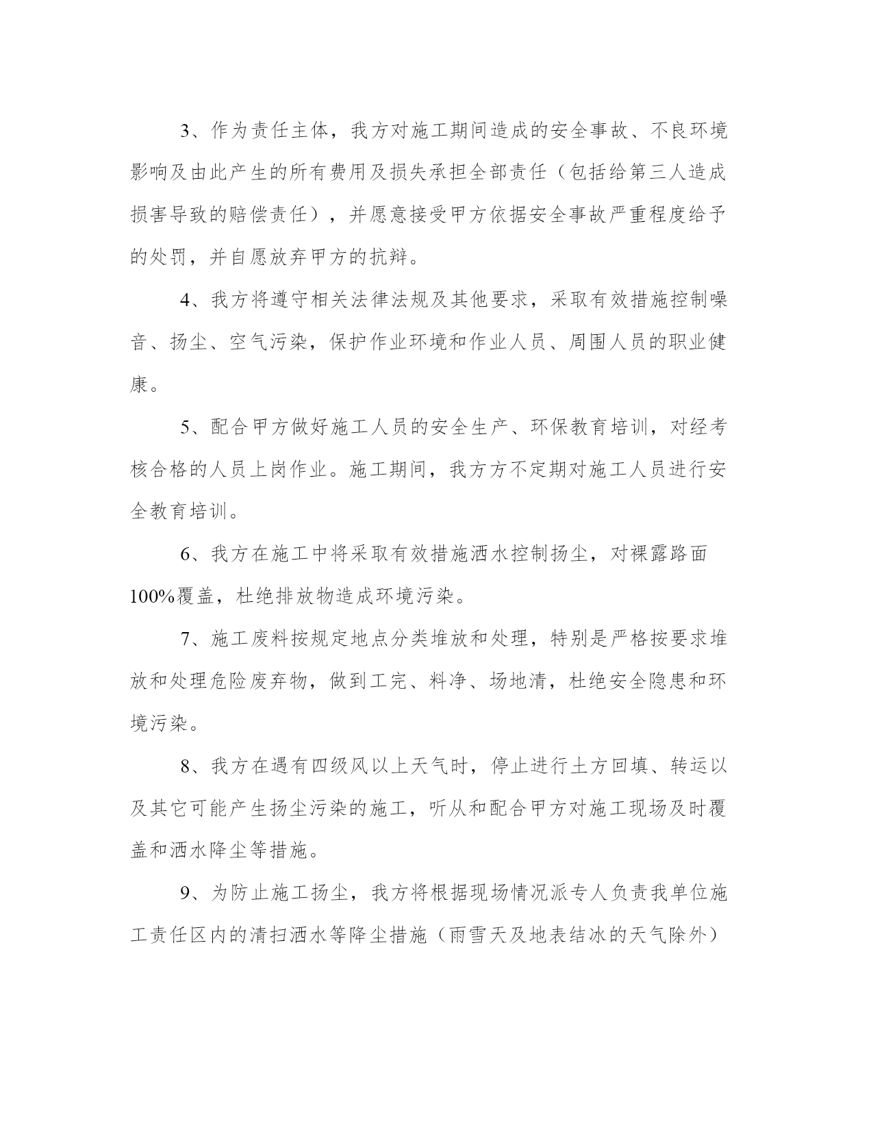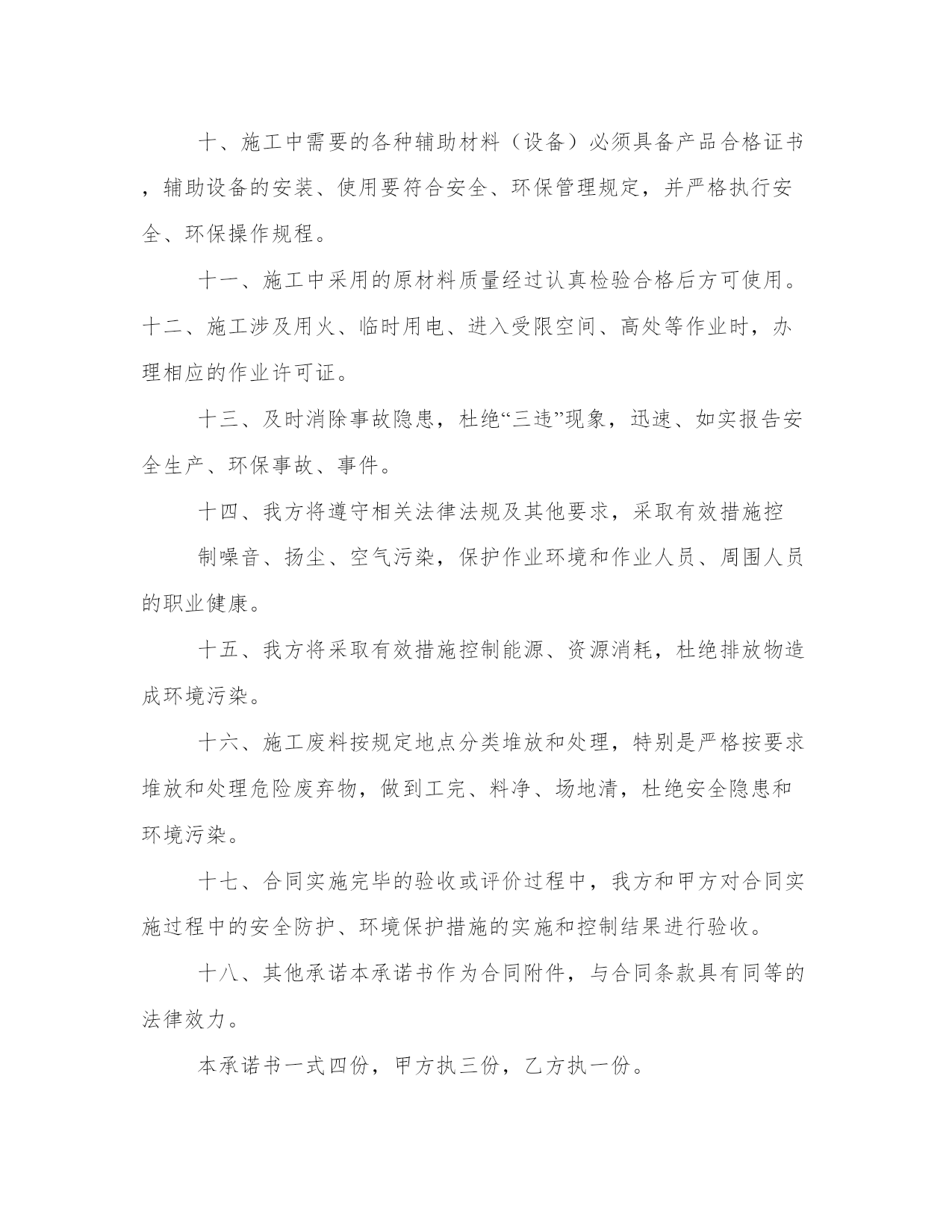 工程环保承诺书例文工程名称:工程地址:承包范围:承包方式:工程施工合同编号:工程项目期限:年月日起开工至年月日完工为确保我方承包的甲方项目的顺利实施,特向甲方和各级主管部门作出如下承诺:一、施工期间我方将严格遵守安全生产、环保法律、法规,执行安全生产、环保的规章制度、技术标准,遵守甲方安全、环保管理制度,接受甲方的安全、环保监督、检查、考核。二、作为责任主体,我方对施工期间及施工内容投入使用后造成的安全事故、不良环境影响及由此产生的所有费用及损失承担全部责任(包括给第三人造成损害导致的赔偿责任),并愿意接受甲方依据安全事故严重程度给予的处罚,并自愿放弃甲方的抗辩。三、建立健全我方的安全生产、环保责任制度和安全、环保教育培训制度,制定相应的操作规程;我方委派作为本施工项目的安全责任人,保证安全、文明施工所需资金的投入。向施工人员提供安全防护用具和安全防护服装,并书面告知安全、环保风险高的岗位的安全、环保风险内容及各岗位的有关安全、环保的操作规程、违章操作的危害。四、做好施工人员的安全生产、环保教育培训,对经考核合格的人员,发放上岗证。施工期间,乙方不定期对施工人员进行安全教育培训。未经教育培训或教育培训考核不合格的人员,不得安排上岗作业。项目负责人和特种作业人员须取得有效的资格证书。五、施工作业前,编制施工组织设计、施工方案和安全技术、环保措施,报相关部门审批,并办理施工作业许可证,同时向甲方备案;制定、实施安全生产、环保应急预案,并报甲方备案。六、施工作业前,负责项目管理的技术人员对有关安全、环保施工的技术要求向施工作业班组、作业人员作出详细说明。施工期间,我方采取必要的安全防护和环境保护措施,作业人员严格遵守安全生产、环保规章制度和安全、环保操作规程。七、施工现场树立必要的施工作业警示标识,配备消防设施和灭火器材,安全、环保警示标志齐全,施工机具和材料摆放整齐有序,不得堵塞安全消防通道和影响岗位人员操作与巡回检查。八、施工人员进入施工现场穿戴符合国家标准及建设单位规定的劳动防护用品,主动出示施工联系单、临时动火证、临时线路使用证,经甲方门卫检查同意后方可进出。施工作业人员不得转借上岗证。九、对施工作业现场及施工机械、器具等进行定期和不定期的安全检查,做好检查和整改记录。对甲方或甲方聘请的监理提出的问题及时书面反馈整改结果。十、施工中需要的各种辅助材料(设备)必须具备产品合格证书,辅助设备的安装、使用要符合安全、环保管理规定,并严格执行安全、环保操作规程。十一、施工中采用的原材料质量经过认真检验合格后方可使用。十二、施工涉及用火、临时用电、进入受限空间、高处等作业时,办理相应的作业许可证。十三、及时消除事故隐患,杜绝“三违”现象,迅速、如实报告安全生产、环保事故、事件。十四、我方将遵守相关法律法规及其他要求,采取有效措施控制噪音、扬尘、空气污染,保护作业环境和作业人员、周围人员的职业健康。十五、我方将采取有效措施控制能源、资源消耗,杜绝排放物造成环境污染。十六、施工废料按规定地点分类堆放和处理,特别是严格按要求堆放和处理危险废弃物,做到工完、料净、场地清,杜绝安全隐患和环境污染。十七、合同实施完毕的验收或评价过程中,我方和甲方对合同实施过程中的安全防护、环境保护措施的实施和控制结果进行验收。十八、其他承诺本承诺书作为合同附件,与合同条款具有同等的法律效力。本承诺书一式四份,甲方执三份,乙方执一份。承诺单位:代表(签字):年月日篇二:绿色施工环境保护承诺书甲方:北京住总集团有限责任公司北京地铁七号线12标项目经理部乙方:为进一步贯彻落实北京市清洁空气行动计划(2012年大气污染控制措施)工作要求,落实市住建委关于开展建设工程施工现场扬尘治理专项行动的通知(京建发【20xx】112号)和“关于开展建筑垃圾运输百日专项整治行动的工作方案”的工作部署,落实集团建设工程施工现场扬尘治理专项行动工作方案的工作要求,坚持施工生产与污染防治相结合,持续提升施工现场绿色环保施工水平,确保7号线十二标工程无环境污染及扬尘现象的发生;现项目部与你单位签订本承诺书。一、为确保我方承包的甲方北京地铁7号线十二标项目的施工顺利,在我方施工责任区内无环境污染及扬尘现象的发生,特向甲方和各级主管部门作出如下承诺:1、施工期间我方将严格遵守安全生产、环保法律、法规,执行安全生产、环保的规章制度、技术标准,遵守甲方安全、环保管理制度,接受甲方的安全、环保监督、检查、考核。2、在施工作业中积极配合甲方试试本工程的施工组织设计中防治扬尘、噪声、固体废物和废水等污染环境的相关措施。3、作为责任主体,我方对施工期间造成的安全事故、不良环境影响及由此产生的所有费用及损失承担全部责任(包括给第三人造成损害导致