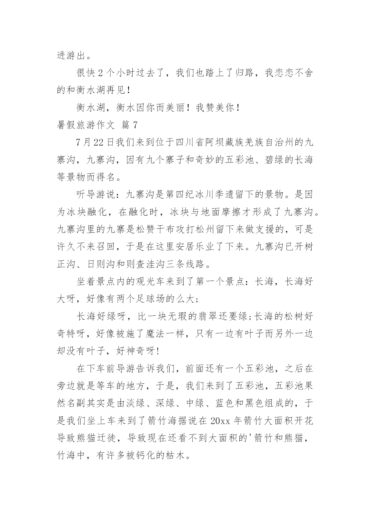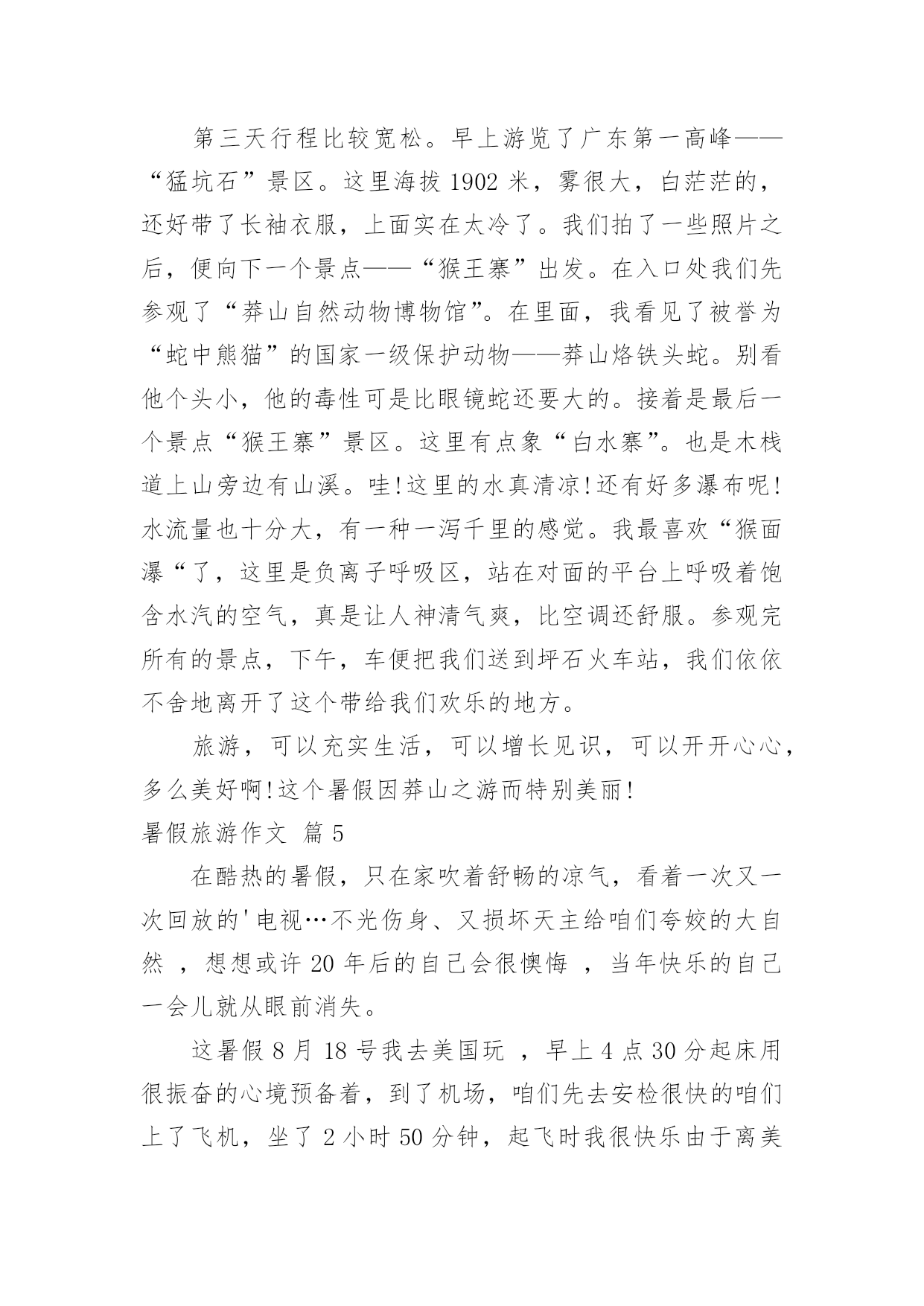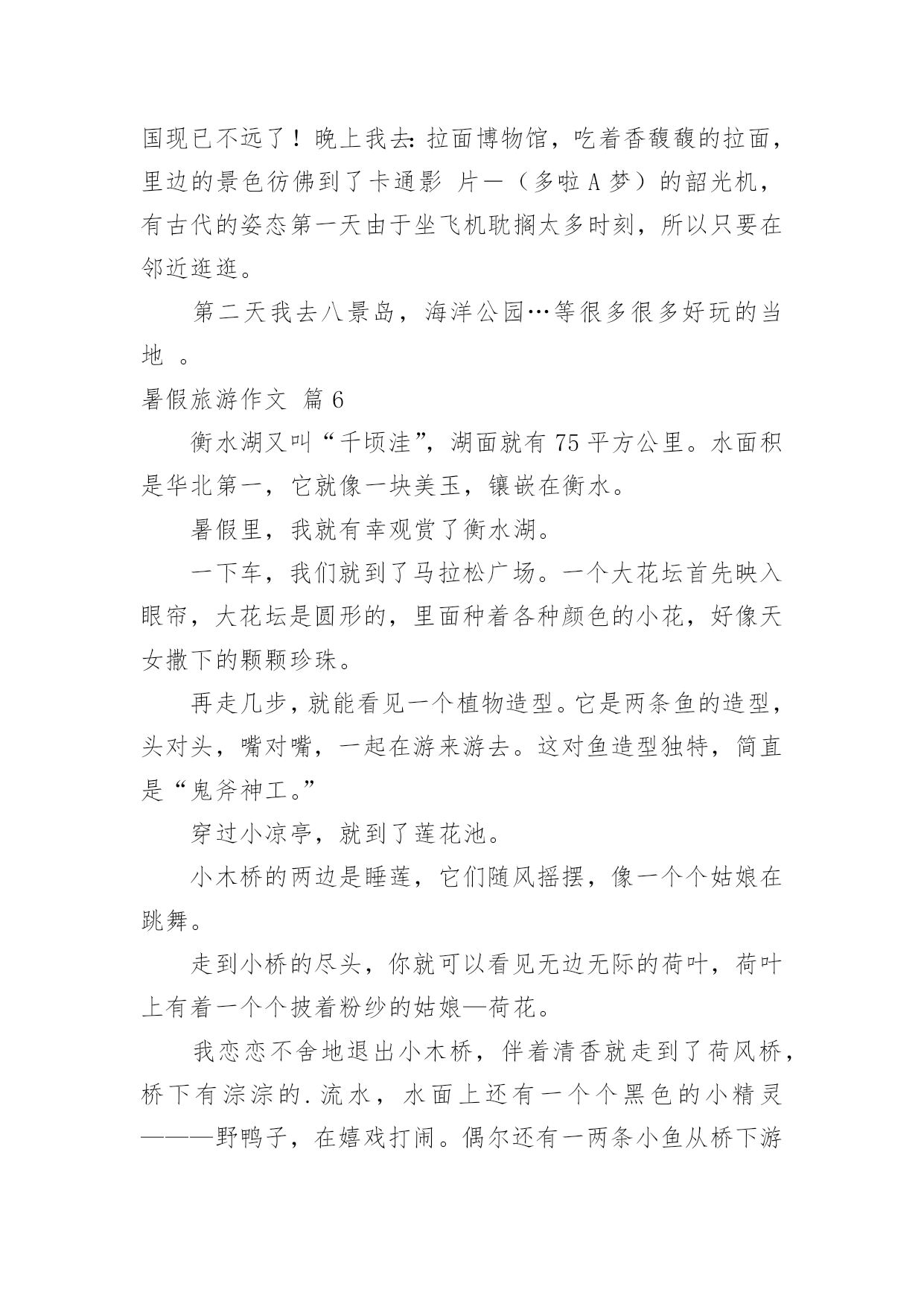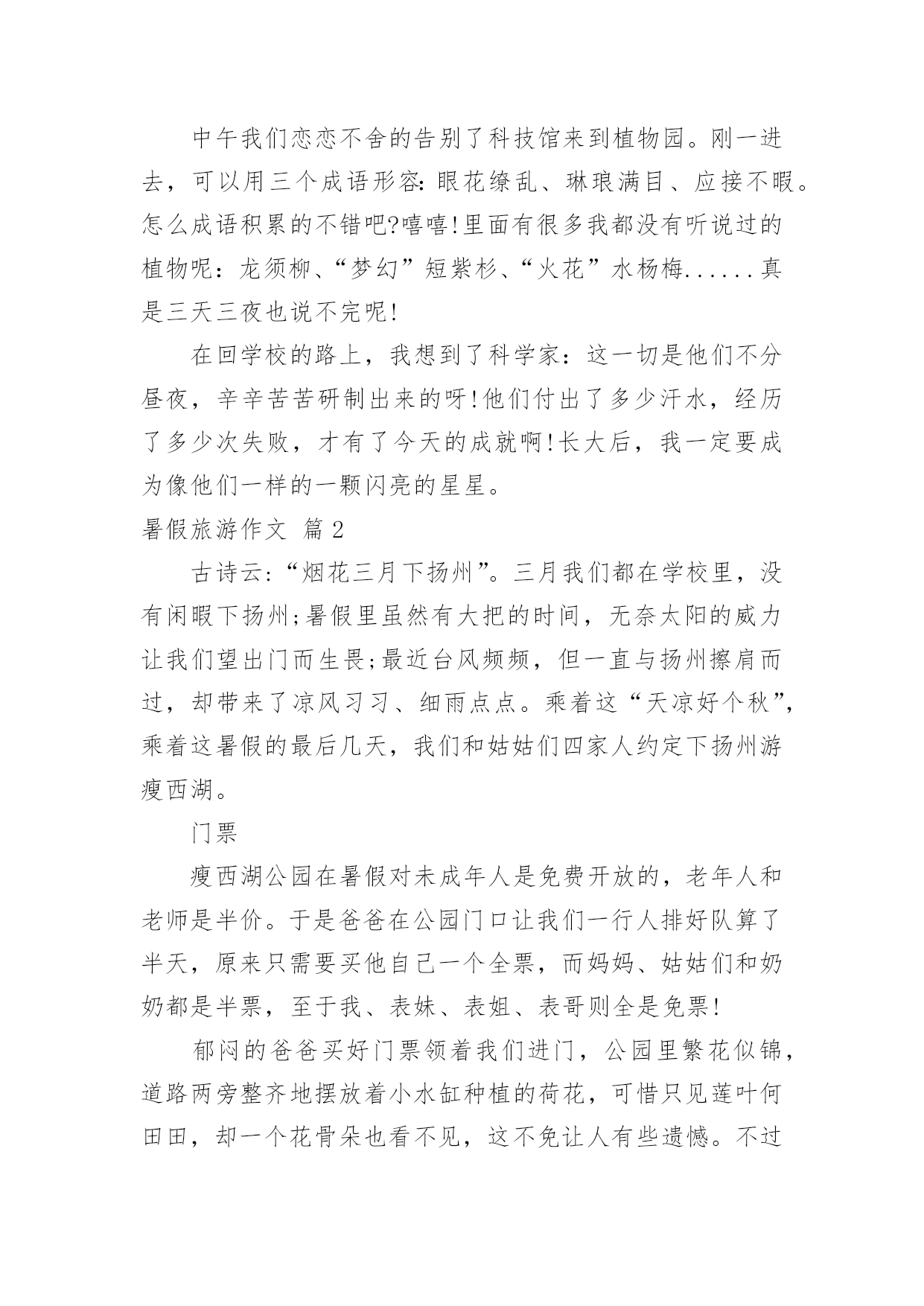 暑假旅游作文【精选】暑假旅游作文7篇在学习、工作、生活中,大家都跟作文打过交道吧,借助作文人们可以实现文化交流的目的。你知道作文怎样写才规范吗?下面是小编整理的暑假旅游作文7篇,欢迎阅读与收藏。暑假旅游作文篇1旅游,是很多人的真是令你流连往返爱好,就连我也不例外。因为它带给人的感受是:自由自在,随心所欲。每当有好玩或美丽的景点时那景色真是令你流连忘返。这不,教委组织了一次“社会实践大课堂”的活动,我们个个一蹦三尺高,有两个原因:1、不用上课了(嘻嘻,开玩笑了啦)。2、可以观赏美丽的景色和新奇的发明了。首先来到科技馆,一个气球阵首先映入眼帘,它由很多白气球组成白球随节奏此起彼伏,组成各式各样的.形状,让我们赞叹不已。我们先来到四层,可以看到一个恐龙化石,三层楼那么高,真壮观啊!三层是有关于模型汽车之类的科技品,我们去体验了一番。由组长田博先开,可是小汽车不是撞到树就是撞到其他的车。我还开玩笑地说:“就组长这技术,长大了考一百回驾照,也就三个字:不及格。”对了,差点忘了告诉你们:“其实,我们也稍稍捣了一下乱哦!”中午我们恋恋不舍的告别了科技馆来到植物园。刚一进去,可以用三个成语形容:眼花缭乱、琳琅满目、应接不暇。怎么成语积累的不错吧?嘻嘻!里面有很多我都没有听说过的植物呢:龙须柳、“梦幻”短紫杉、“火花”水杨梅......真是三天三夜也说不完呢!在回学校的路上,我想到了科学家:这一切是他们不分昼夜,辛辛苦苦研制出来的呀!他们付出了多少汗水,经历了多少次失败,才有了今天的成就啊!长大后,我一定要成为像他们一样的一颗闪亮的星星。暑假旅游作文篇2古诗云:“烟花三月下扬州”。三月我们都在学校里,没有闲暇下扬州;暑假里虽然有大把的时间,无奈太阳的威力让我们望出门而生畏;最近台风频频,但一直与扬州擦肩而过,却带来了凉风习习、细雨点点。乘着这“天凉好个秋”,乘着这暑假的最后几天,我们和姑姑们四家人约定下扬州游瘦西湖。门票瘦西湖公园在暑假对未成年人是免费开放的,老年人和老师是半价。于是爸爸在公园门口让我们一行人排好队算了半天,原来只需要买他自己一个全票,而妈妈、姑姑们和奶奶都是半票,至于我、表妹、表姐、表哥则全是免票!郁闷的爸爸买好门票领着我们进门,公园里繁花似锦,道路两旁整齐地摆放着小水缸种植的荷花,可惜只见莲叶何田田,却一个花骨朵也看不见,这不免让人有些遗憾。不过很快惊喜出现了,我们看到了一大群洁白可爱的鸽子。鸽子瘦西湖的鸽子白白胖胖的,它们非常贪吃,人们只要把手伸出,手心向上,它们就会飞过来看看有什么好吃的,如果没有就飞走,如果有就停到手心上开始大吃一顿。我和表妹玩得不亦乐乎,我问表妹:“你觉得这些鸽子可爱吗?”表妹说:“不可爱,它们简直就像是自动送上门的美味!”可我一点都不觉的它们是自动送上门的,因为我每次引诱鸽子停在我手心后都想摸摸它们的羽毛,可一次也没摸到。当我手上的最后一粒玉米被吃掉时,我忍不住顺手一抓,意外地抓住了一只“呆鸽”。表哥看着那只倒霉的鸽子感叹道:“珍爱生命,远离吴迪!”妈妈则命令我把鸽子放开:“以后这只鸽子会有心理阴影,不敢停到人们的手上,我们就不能享受与鸽子亲密接触的乐趣了!”我放走了鸽子,说声对不起后继续前行,不久就脚酸了,幸好湖边停着很多代步工具——船。游船瘦西湖里有两种船:电动船和人工大船。本来我们有10个人应该坐大船的',可表妹一再坚持要坐电动船,还宣布说如果坐大船的话她就宁愿不坐船了。我们没有办法说服这个有主见的小妹,就只好“如妹所愿”了。在确定上船人选时表哥和表姐坚决拒绝和我们同船,我妈妈也认为让大孩子照顾小孩子是最糟糕的选择,最后决定让我、表妹、小姑姑、爸爸组合上船。我和表妹争着想做船长去开船,但表妹先下手为强,第一个第一时间占领了驾驶座,我只好在副驾驶位置上耐心等待。小姑姑和爸爸做乘客,不会游泳的小姑姑一上船就穿上了橙色的救生衣,这成了我们这艘船的醒目标志,因为这可是唯一一件当时湖面上被穿在身上的救生衣啊!湖面上清风徐来,水波不兴,在湖面上的小船来回穿梭,你追我赶,我们玩得不亦乐乎。忽然迎面驶来一艘人工大船,眼看就要一头撞在一起了,大船上的船工大叫:“转弯!”岸上妈妈她们惊叫:“不好啦!不好啦!快撞了!……”可表妹早就手足无措,也不知该向哪个方向逃了,我爸爸理直气壮地对大船上的船工嚷道:“你让我们!”惊险中,两船擦肩而过,这下轮到我开船啦!哈哈镜下船后由于体力原因我们开始往出口走,看到了一个小小游乐场,因为台风下雨里面的设施基本停用了,只有几面哈哈镜前围着不少游客。我听到游客们不停的欢笑声,忍不住前去一探究竟。第一面:嘻!我变得矮矮的,像白雪公主里的小矮人,表哥看了直笑,可他1米83的个子竟然在镜子里和我一样高。第二面:呵!我变得胖胖的,像一个被惹恼的河豚,表妹把我挤到一旁,于是两只鼓气河豚出现了