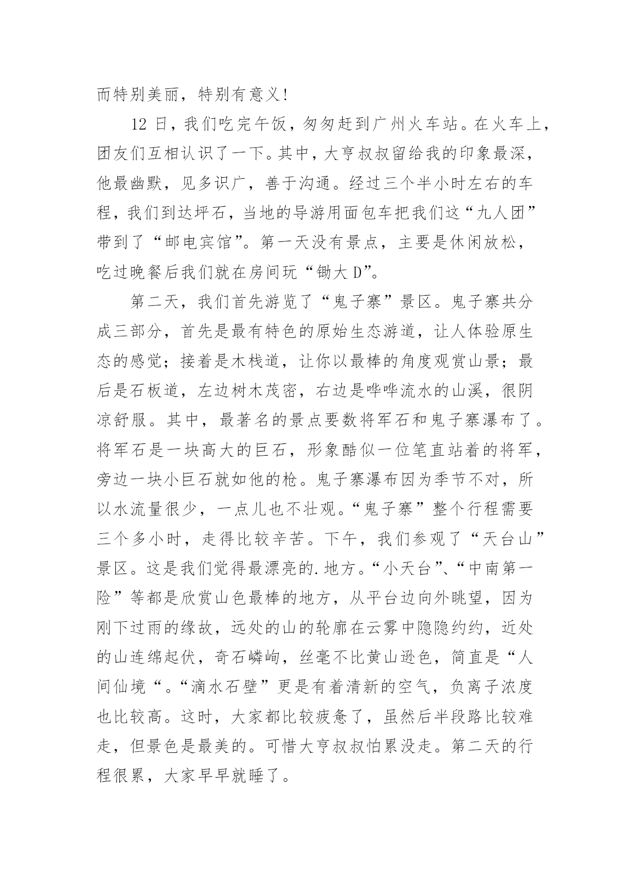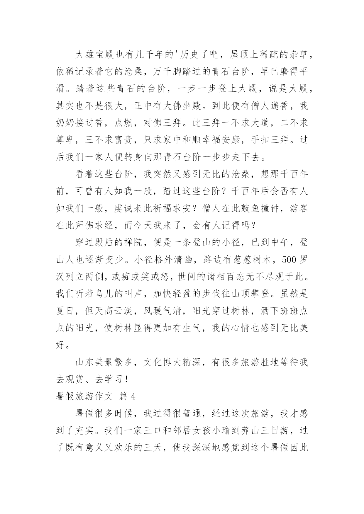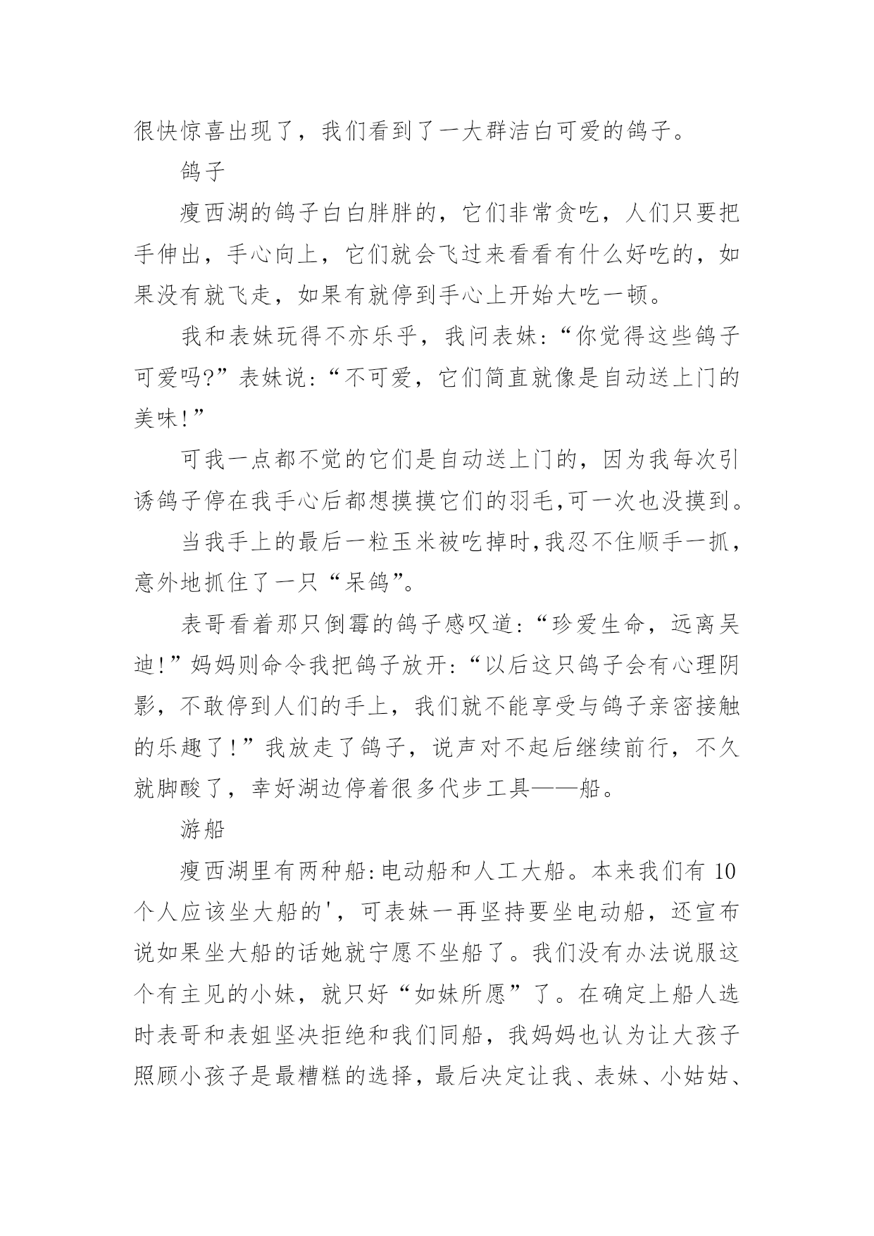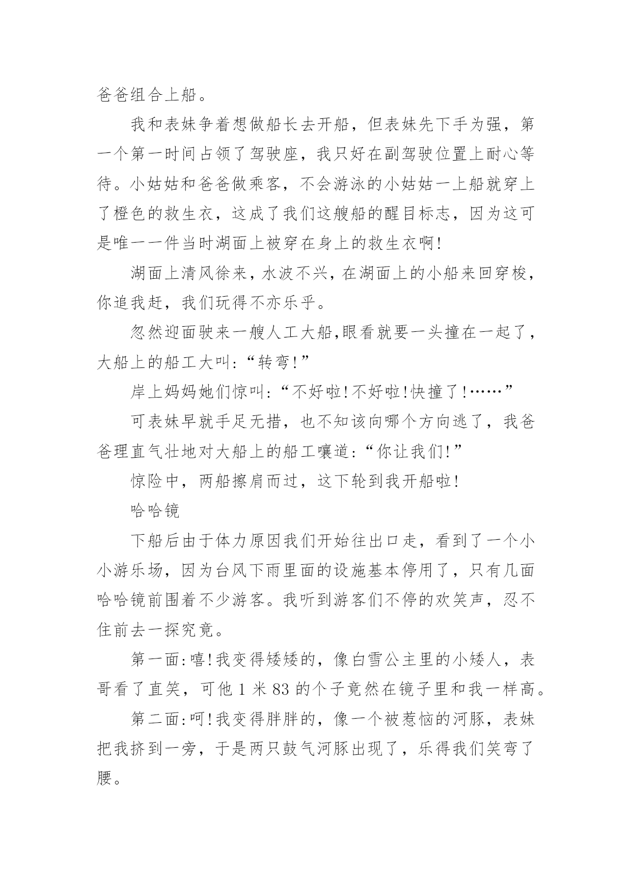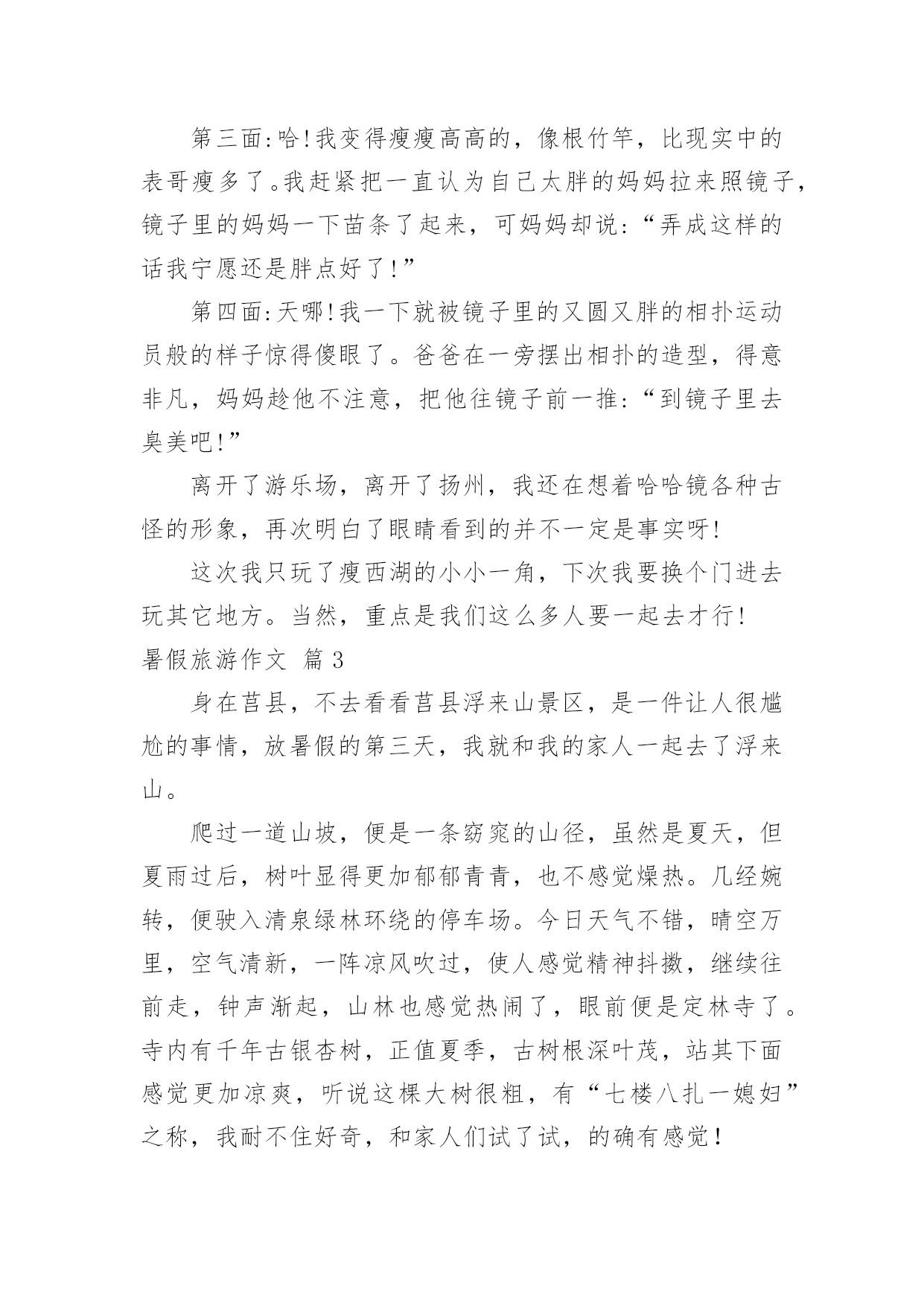 暑假旅游作文【精选】暑假旅游作文7篇在学习、工作、生活中,大家都跟作文打过交道吧,借助作文人们可以实现文化交流的目的。你知道作文怎样写才规范吗?下面是小编整理的暑假旅游作文7篇,欢迎阅读与收藏。暑假旅游作文篇1旅游,是很多人的真是令你流连往返爱好,就连我也不例外。因为它带给人的感受是:自由自在,随心所欲。每当有好玩或美丽的景点时那景色真是令你流连忘返。这不,教委组织了一次“社会实践大课堂”的活动,我们个个一蹦三尺高,有两个原因:1、不用上课了(嘻嘻,开玩笑了啦)。2、可以观赏美丽的景色和新奇的发明了。首先来到科技馆,一个气球阵首先映入眼帘,它由很多白气球组成白球随节奏此起彼伏,组成各式各样的.形状,让我们赞叹不已。我们先来到四层,可以看到一个恐龙化石,三层楼那么高,真壮观啊!三层是有关于模型汽车之类的科技品,我们去体验了一番。由组长田博先开,可是小汽车不是撞到树就是撞到其他的车。我还开玩笑地说:“就组长这技术,长大了考一百回驾照,也就三个字:不及格。”对了,差点忘了告诉你们:“其实,我们也稍稍捣了一下乱哦!”中午我们恋恋不舍的告别了科技馆来到植物园。刚一进去,可以用三个成语形容:眼花缭乱、琳琅满目、应接不暇。怎么成语积累的不错吧?嘻嘻!里面有很多我都没有听说过的植物呢:龙须柳、“梦幻”短紫杉、“火花”水杨梅......真是三天三夜也说不完呢!在回学校的路上,我想到了科学家:这一切是他们不分昼夜,辛辛苦苦研制出来的呀!他们付出了多少汗水,经历了多少次失败,才有了今天的成就啊!长大后,我一定要成为像他们一样的一颗闪亮的星星。暑假旅游作文篇2古诗云:“烟花三月下扬州”。三月我们都在学校里,没有闲暇下扬州;暑假里虽然有大把的时间,无奈太阳的威力让我们望出门而生畏;最近台风频频,但一直与扬州擦肩而过,却带来了凉风习习、细雨点点。乘着这“天凉好个秋”,乘着这暑假的最后几天,我们和姑姑们四家人约定下扬州游瘦西湖。门票瘦西湖公园在暑假对未成年人是免费开放的,老年人和老师是半价。于是爸爸在公园门口让我们一行人排好队算了半天,原来只需要买他自己一个全票,而妈妈、姑姑们和奶奶都是半票,至于我、表妹、表姐、表哥则全是免票!郁闷的爸爸买好门票领着我们进门,公园里繁花似锦,道路两旁整齐地摆放着小水缸种植的荷花,可惜只见莲叶何田田,却一个花骨朵也看不见,这不免让人有些遗憾。不过很快惊喜出现了,我们看到了一大群洁白可爱的鸽子。鸽子瘦西湖的鸽子白白胖胖的,它们非常贪吃,人们只要把手伸出,手心向上,它们就会飞过来看看有什么好吃的,如果没有就飞走,如果有就停到手心上开始大吃一顿。我和表妹玩得不亦乐乎,我问表妹:“你觉得这些鸽子可爱吗?”表妹说:“不可爱,它们简直就像是自动送上门的美味!”可我一点都不觉的它们是自动送上门的,因为我每次引诱鸽子停在我手心后都想摸摸它们的羽毛,可一次也没摸到。当我手上的最后一粒玉米被吃掉时,我忍不住顺手一抓,意外地抓住了一只“呆鸽”。表哥看着那只倒霉的鸽子感叹道:“珍爱生命,远离吴迪!”妈妈则命令我把鸽子放开:“以后这只鸽子会有心理阴影,不敢停到人们的手上,我们就不能享受与鸽子亲密接触的乐趣了!”我放走了鸽子,说声对不起后继续前行,不久就脚酸了,幸好湖边停着很多代步工具——船。游船瘦西湖里有两种船:电动船和人工大船。本来我们有10个人应该坐大船的',可表妹一再坚持要坐电动船,还宣布说如果坐大船的话她就宁愿不坐船了。我们没有办法说服这个有主见的小妹,就只好“如妹所愿”了。在确定上船人选时表哥和表姐坚决拒绝和我们同船,我妈妈也认为让大孩子照顾小孩子是最糟糕的选择,最后决定让我、表妹、小姑姑、爸爸组合上船。我和表妹争着想做船长去开船,但表妹先下手为强,第一个第一时间占领了驾驶座,我只好在副驾驶位置上耐心等待。小姑姑和爸爸做乘客,不会游泳的小姑姑一上船就穿上了橙色的救生衣,这成了我们这艘船的醒目标志,因为这可是唯一一件当时湖面上被穿在身上的救生衣啊!湖面上清风徐来,水波不兴,在湖面上的小船来回穿梭,你追我赶,我们玩得不亦乐乎。忽然迎面驶来一艘人工大船,眼看就要一头撞在一起了,大船上的船工大叫:“转弯!”岸上妈妈她们惊叫:“不好啦!不好啦!快撞了!……”可表妹早就手足无措,也不知该向哪个方向逃了,我爸爸理直气壮地对大船上的船工嚷道:“你让我们!”惊险中,两船擦肩而过,这下轮到我开船啦!哈哈镜下船后由于体力原因我们开始往出口走,看到了一个小小游乐场,因为台风下雨里面的设施基本停用了,只有几面哈哈镜前围着不少游客。我听到游客们不停的欢笑声,忍不住前去一探究竟。第一面:嘻!我变得矮矮的,像白雪公主里的小矮人,表哥看了直笑,可他1米83的个子竟然在镜子里和我一样高。第二面:呵!我变得胖胖的,像一个被惹恼的河豚,表妹把我挤到一旁,于是两只鼓气河豚出现了