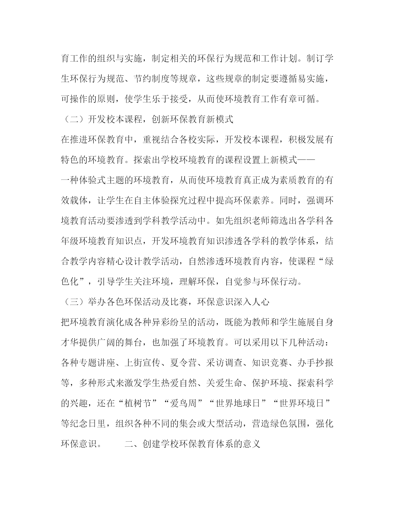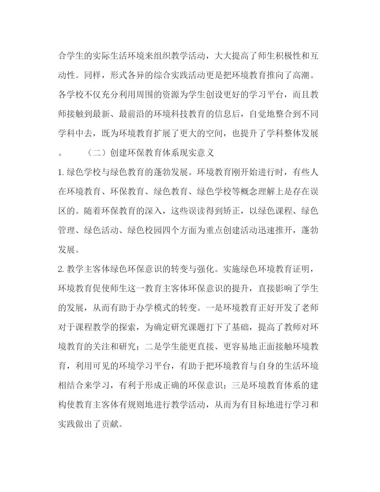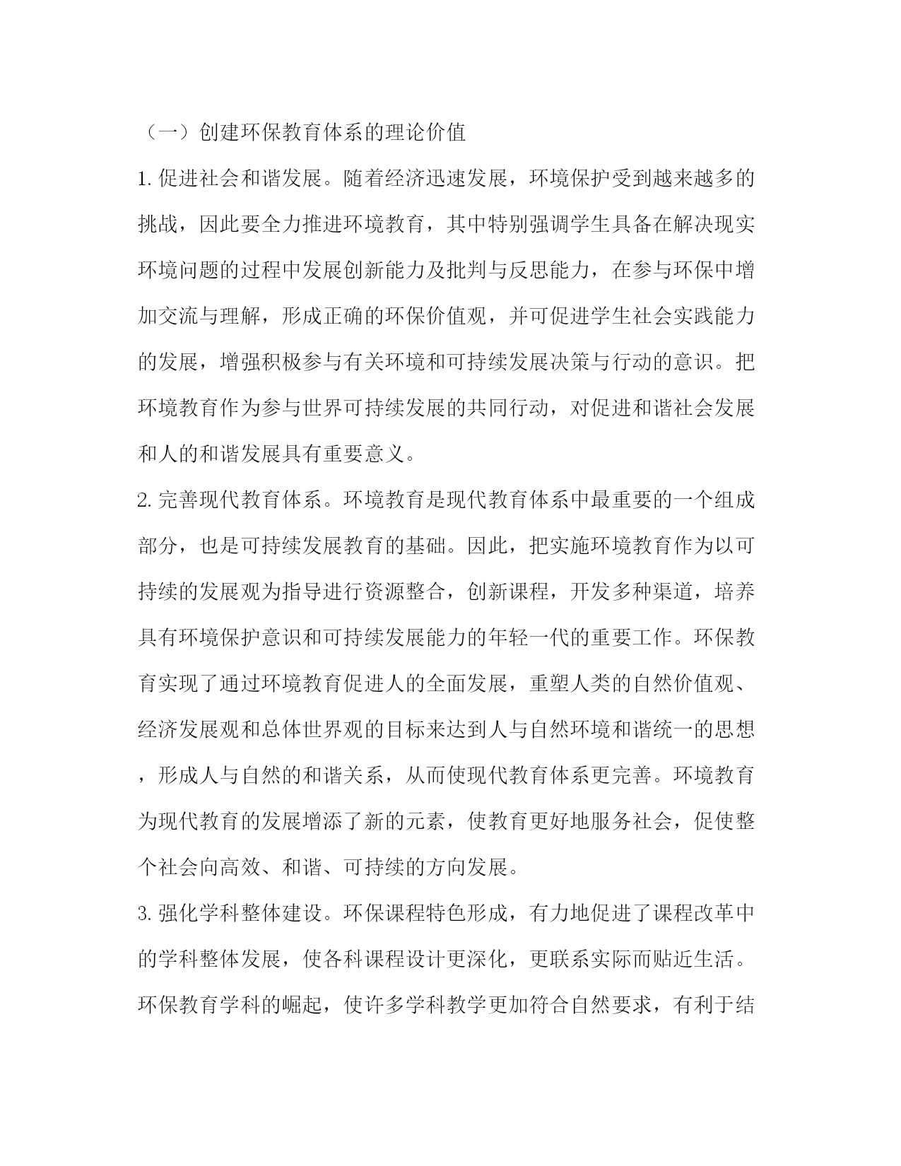 PAGE此资料由网络收集而来,如有侵权请告知上传者立即删除。资料共分享,我们负责传递知识。浅议绿色学校环保教育[摘要]在日益强化环境保护的科学发展理念引领下,绿色环保教育已经成为颇受欢迎的一种学校特色教育,本文简要介绍了绿色学校环保教育的主要做法及创建学校环保教育体系的意义。[关键词]绿色学校环保教育[中图分类号]G410[文献标识码]A[文章编号]1009-5349(2020)04-0174-01经过改革开放三十多年的迅猛发展,我国已经步入了工业化中期阶段,发达国家上百年工业化过程中分阶段出现的环境问题在我国集中出现,环境污染导致健康损害问题近年来频繁发生。为此,国家“十二五”规划纲要指出,必须增强危机意识,树立绿色、低碳发展理念,以节能减排为重点,加快构建资源节约、环境友好的生产方式和消费模式,增强可持续发展能力,提高生态文明水平。这就需要依托各级环保和有关部门组织开展环境与健康宣传教育活动,对我国公民进行环境教育,尤其要对青少年开展环境道德教育。而创建绿色学校活动将对于提高青少年的环境意识,树立良好的环境道德观念和行为规范有重要意义。一、绿色学校环保教育的主要做法(一)完善机构制度,规范行为管理根据学校自身情况和条件组建环境教育领导小组,全面的负责环境教育工作的组织与实施,制定相关的环保行为规范和工作计划。制订学生环保行为规范、节约制度等规章,这些规章的制定要遵循易实施,可操作的原则,使学生乐于接受,从而使环境教育工作有章可循。(二)开发校本课程,创新环保教育新模式在推进环保教育中,重视结合各校实际,开发校本课程,积极发展有特色的环境教育。探索出学校环境教育的课程设置上新模式——一种体验式主题的环境教育,从而使环境教育真正成为素质教育的有效载体,让学生在自主体验探究过程中提高环保素养。同时,强调环境教育活动要渗透到学科教学活动中。如先组织老师筛选出各学科各年级环境教育知识点,开发环境教育知识渗透各学科的教学体系,结合教学内容精心设计教学活动,自然渗透环境教育内容,使课程“绿色化”,引导学生关注环境,理解环保,自觉参与环保行动。(三)举办各色环保活动及比赛,环保意识深入人心把环境教育演化成各种异彩纷呈的活动,既能为教师和学生施展自身才华提供广阔的舞台,也加强了环境教育。可以采用以下几种活动:各种专题讲座、上街宣传、夏令营、采访调查、知识竞赛、办手抄报等,多种形式来激发学生热爱自然、关爱生命、保护环境、探索科学的兴趣,还在“植树节”“爱鸟周”“世界地球日”“世界环境日”等纪念日里,组织各种不同的集会或大型活动,营造绿色氛围,强化环保意识。二、创建学校环保教育体系的意义(一)创建环保教育体系的理论价值1.促进社会和谐发展。随着经济迅速发展,环境保护受到越来越多的挑战,因此要全力推进环境教育,其中特别强调学生具备在解决现实环境问题的过程中发展创新能力及批判与反思能力,在参与环保中增加交流与理解,形成正确的环保价值观,并可促进学生社会实践能力的发展,增强积极参与有关环境和可持续发展决策与行动的意识。把环境教育作为参与世界可持续发展的共同行动,对促进和谐社会发展和人的和谐发展具有重要意义。2.完善现代教育体系。环境教育是现代教育体系中最重要的一个组成部分,也是可持续发展教育的基础。因此,把实施环境教育作为以可持续的发展观为指导进行资源整合,创新课程,开发多种渠道,培养具有环境保护意识和可持续发展能力的年轻一代的重要工作。环保教育实现了通过环境教育促进人的全面发展,重塑人类的自然价值观、经济发展观和总体世界观的目标来达到人与自然环境和谐统一的思想,形成人与自然的和谐关系,从而使现代教育体系更完善。环境教育为现代教育的发展增添了新的元素,使教育更好地服务社会,促使整个社会向高效、和谐、可持续的方向发展。3.强化学科整体建设。环保课程特色形成,有力地促进了课程改革中的学科整体发展,使各科课程设计更深化,更联系实际而贴近生活。环保教育学科的崛起,使许多学科教学更加符合自然要求,有利于结合学生的实际生活环境来组织教学活动,大大提高了师生积极性和互动性。同样,形式各异的综合实践活动更是把环境教育推向了高潮。各学校不仅充分利用周围的资源为学生创设更好的学习平台,而且教师接触到最新、最前沿的环境科技教育的信息后,自觉地整合到不同学科中去,既为环境教育扩展了更大的空间,也提升了学科整体发展。(二)创建环保教育体系现实意义1.绿色学校与绿色教育的蓬勃发展。环境教育刚开始进行时,有些人在环境教育、环保教育、绿色教育、绿色学校等概念理解上是存在误区的。随着环保教育的深入,这些误读得到矫正,以绿色课程、绿色管理、绿色活动、绿色校园四个方面为重点创建活动迅速推开,蓬勃发展。2.教学主客体绿色环保意识的转变与强化。实施绿色环境教育证明,环境教育