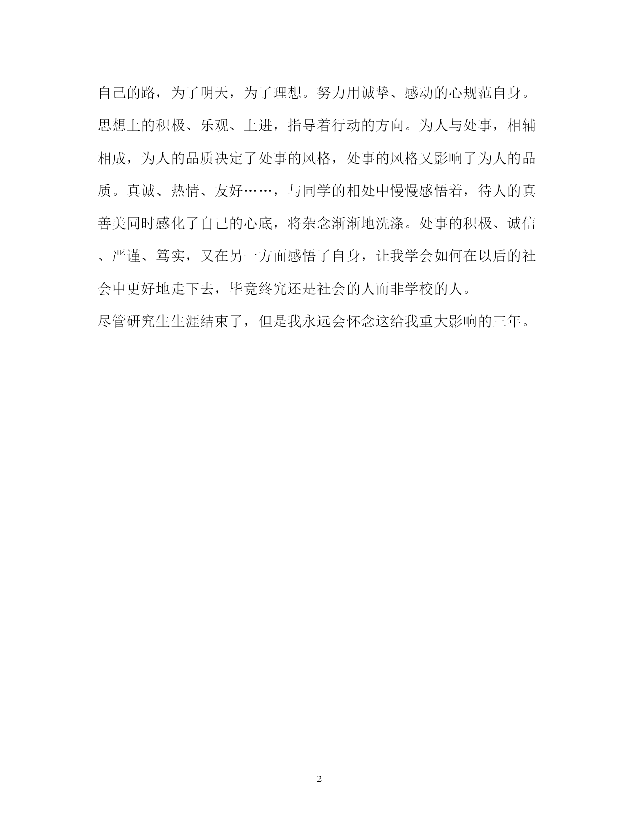 此资料由网络收集而来,如有侵权请告知上传者立即删除。资料共分享,我们负责传递知识。PAGEPAGE2土木工程研究生自我鉴定土木工程研究生自我鉴定我是土木工程专业的研究毕业生,我非常热爱这个专业。研究生三年,岁月如梭,时光匆匆在你我身上留下了深深的烙印,这耐人寻思的烙印必将陪伴我们余生,必将在以后的学习、生活和工作中无时无刻感染着你、激励着你,三年,受益匪浅的三年,叫人回味的三年。曾记否,初入大学的我们,稚嫩欲动的心怀揣着美好的憧憬与理想,每个人都为着心中的那个目标奋斗拼搏,在大学的课堂里汲取无限的知识,在与同学的交往中学到为人的品格,在各类活动中感悟处事的精神。而今,即将踏上工作的征途,不禁感慨,大学的磨练与学习会在今后的工作生活中熠熠生辉的,因为所有的这些都见证了一个人的成长过程,所有的`这些都改变了甚至培育了一个人,所有的这些都将在潜移默化中继续影响着你,直到永远。大学的大课堂里,我学会了怎样用一颗热情真挚的心,去追寻心中的梦想,如何用辛勤的双手、苦涩的汗水去耕耘属于自己天空。艰苦朴素、实事求是、严格要求、勇于探索,按着校训的轨迹,踏实地走好自己的路,为了明天,为了理想。努力用诚挚、感动的心规范自身。思想上的积极、乐观、上进,指导着行动的方向。为人与处事,相辅相成,为人的品质决定了处事的风格,处事的风格又影响了为人的品质。真诚、热情、友好……,与同学的相处中慢慢感悟着,待人的真善美同时感化了自己的心底,将杂念渐渐地洗涤。处事的积极、诚信、严谨、笃实,又在另一方面感悟了自身,让我学会如何在以后的社会中更好地走下去,毕竟终究还是社会的人而非学校的人。尽管研究生生涯结束了,但是我永远会怀念这给我重大影响的三年。