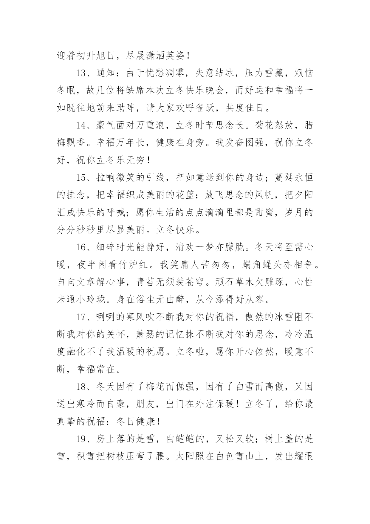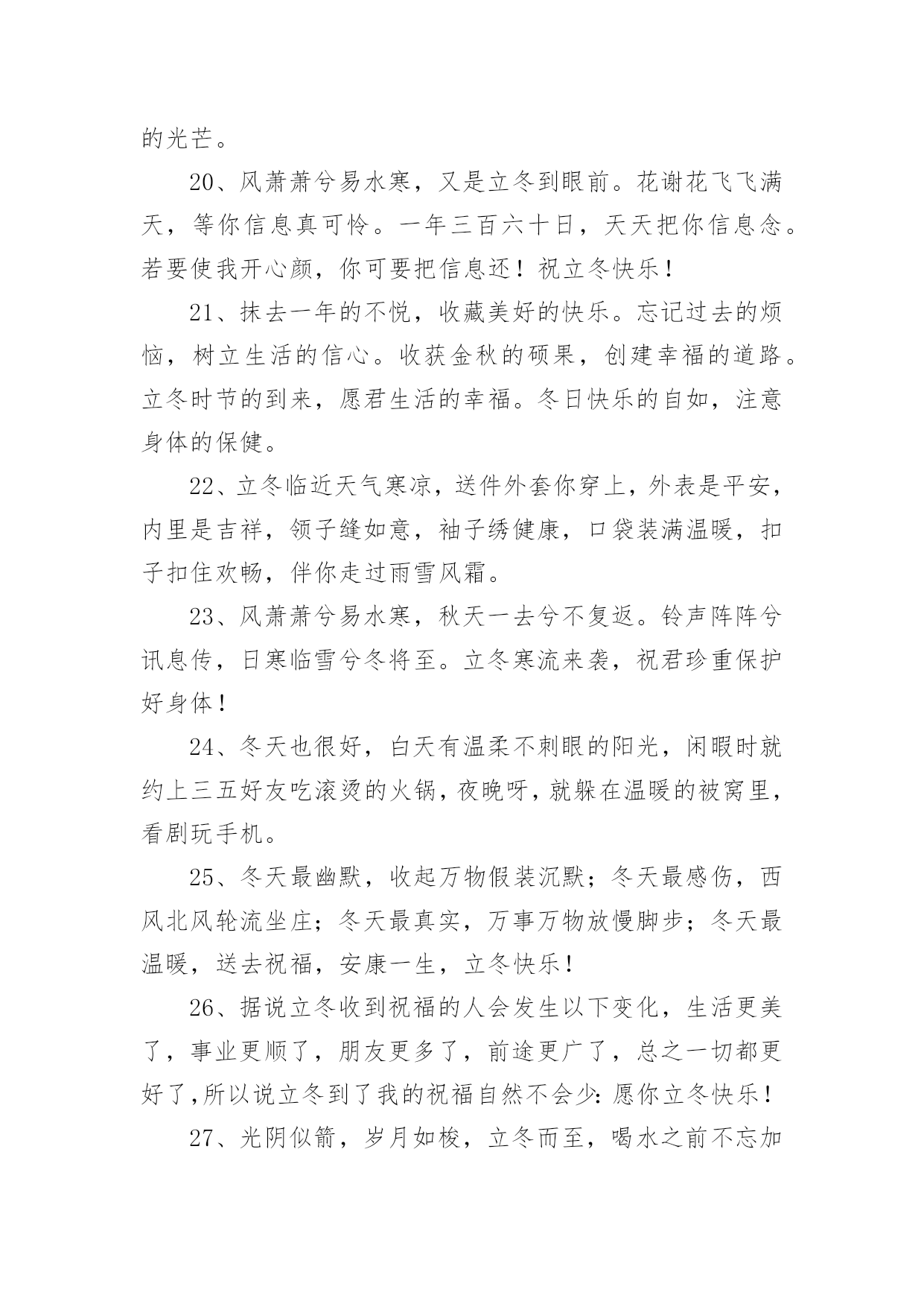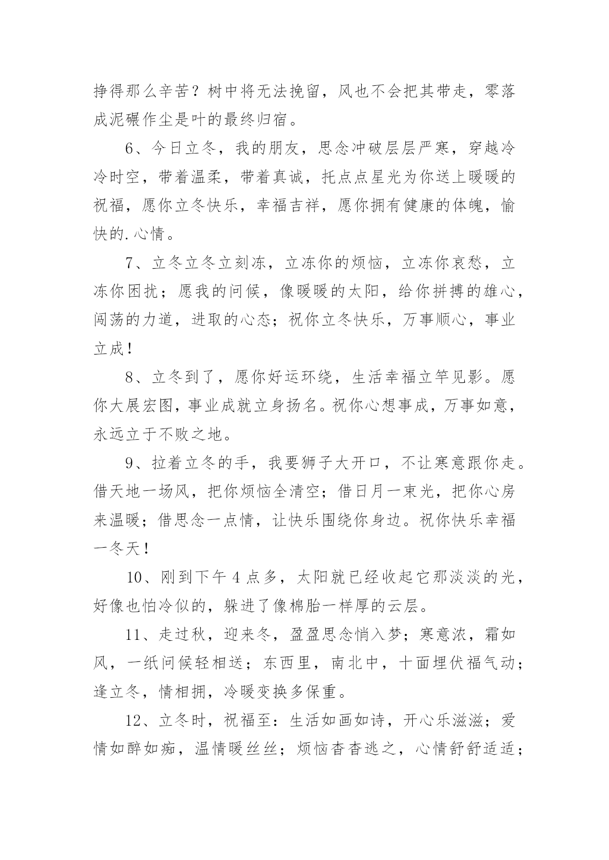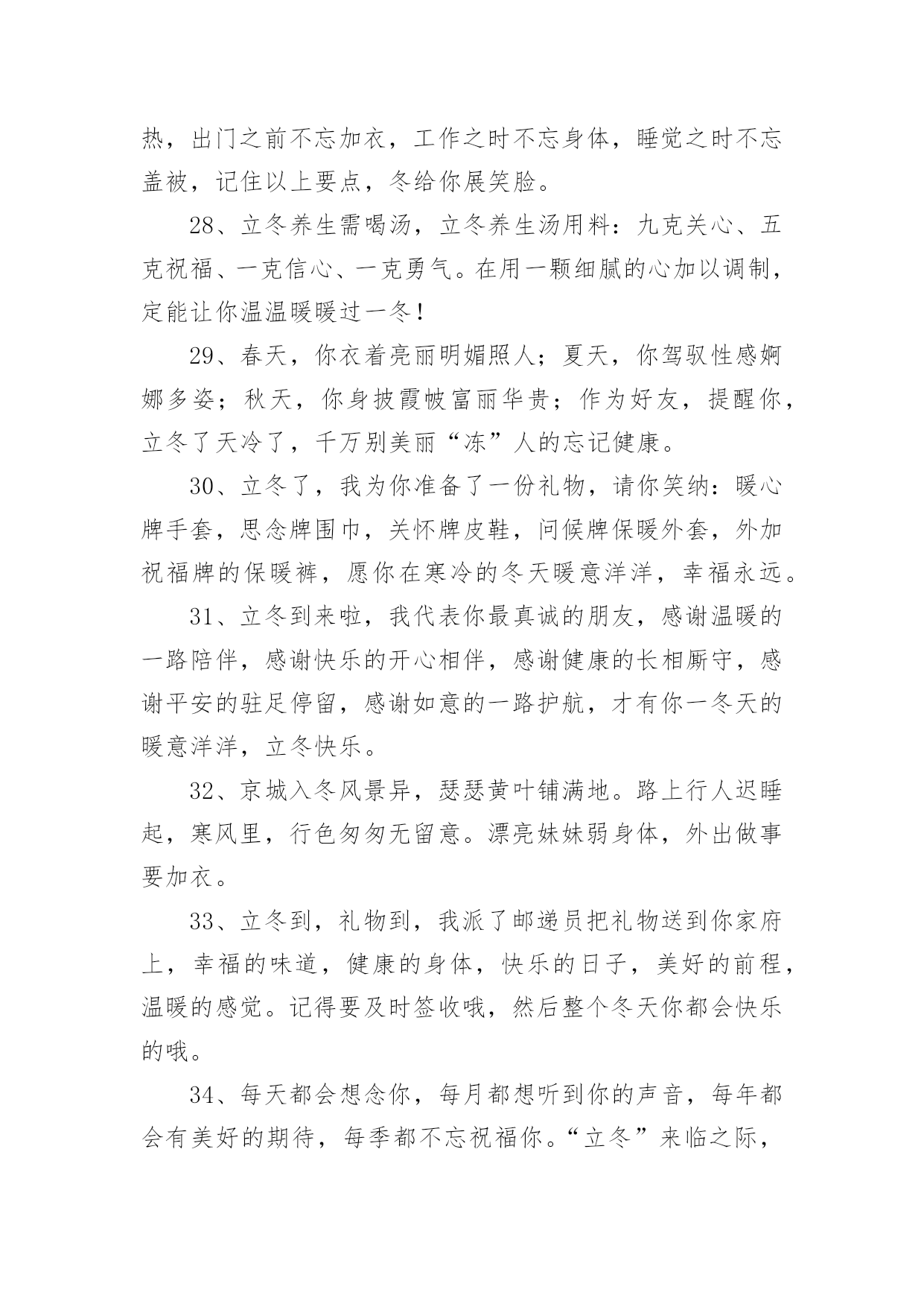 今日立冬朋友圈文案在学习、工作或生活中,大家都看到过文案吧,文案用于跟亲朋好友分享个人生活情况。那什么样的文案才算得上是经典呢?下面是小编帮大家整理的今日立冬朋友圈文案,希望能够帮助到大家。1、不要总是外出约会啦,躲在屋里取暖吧;不要继续咬牙减肥啦,留些脂肪抗寒吧;不要衣衫单薄耍酷啦,添上厚装保暖吧;不要瞪着眼睛傻看啦,赶紧给我回信息吧。朋友,立冬来临,注意身体!2、今天立冬了,泉州的朋友要记得多喝水,毕竟大冬天的都要到30度了,别中暑了!3、冬天像个魔术师,它用“雪“这个道具装扮了整个世界。雪落在地上,像是给大地铺上一张银白色的地毯;落在屋顶,像是给屋顶盖上一层厚厚的棉被;落在树枝上,像是给树枝镶嵌了一根根美丽的银条;落在小朋友的身上,像是一个个会跳舞的小精灵。在阳光的照射下,显得格外晶莹耀眼。4、立冬到了:愿你把忧愁,苦闷,烦恼,封在冰霜里;愿你把快乐,开心,逍遥,放在阳光里;愿你把顺利,健康,美好,抱在心怀里;祝你立冬一切安好,美妙时时伴绕!5、落叶,是因为风的追求,还是因为树的不挽留?展现在我眼前的是另一重景象,风在狂热的追求,树在拼命的挽留,看来双方竞夺的时间还得持久。结局早已清楚,何必挣得那么辛苦?树中将无法挽留,风也不会把其带走,零落成泥碾作尘是叶的最终归宿。6、今日立冬,我的朋友,思念冲破层层严寒,穿越冷冷时空,带着温柔,带着真诚,托点点星光为你送上暖暖的祝福,愿你立冬快乐,幸福吉祥,愿你拥有健康的体魄,愉快的.心情。7、立冬立冬立刻冻,立冻你的烦恼,立冻你哀愁,立冻你困扰;愿我的问候,像暖暖的太阳,给你拼搏的雄心,闯荡的力道,进取的心态;祝你立冬快乐,万事顺心,事业立成!8、立冬到了,愿你好运环绕,生活幸福立竿见影。愿你大展宏图,事业成就立身扬名。祝你心想事成,万事如意,永远立于不败之地。9、拉着立冬的手,我要狮子大开口,不让寒意跟你走。借天地一场风,把你烦恼全清空;借日月一束光,把你心房来温暖;借思念一点情,让快乐围绕你身边。祝你快乐幸福一冬天!10、刚到下午4点多,太阳就已经收起它那淡淡的光,好像也怕冷似的,躲进了像棉胎一样厚的云层。11、走过秋,迎来冬,盈盈思念悄入梦;寒意浓,霜如风,一纸问候轻相送;东西里,南北中,十面埋伏福气动;逢立冬,情相拥,冷暖变换多保重。12、立冬时,祝福至:生活如画如诗,开心乐滋滋;爱情如醉如痴,温情暖丝丝;烦恼杳杳逃之,心情舒舒适适;迎着初升旭日,尽展潇洒英姿!13、通知:由于忧愁凋零,失意结冰,压力雪藏,烦恼冬眠,故几位将缺席本次立冬快乐晚会,而好运和幸福将一如既往地前来助阵,请大家欢呼雀跃,共度佳日。14、豪气面对万重浪,立冬时节思念长。菊花怒放,腊梅飘香。幸福万年长,健康在身旁。我发奋图强,祝你立冬好,祝你立冬乐无穷!15、拉响微笑的引线,把如意送到你的身边;蔓延永恒的挂念,把幸福织成美丽的花篮;放飞思念的风帆,把夕阳汇成快乐的呼喊;愿你生活的点点滴滴里都是甜蜜,岁月的分分秒秒里尽显美丽。立冬快乐。16、细碎时光能静好,清欢一梦亦朦胧。冬天将至需心暖,夜半闲看竹炉红。我笑庸人苦匆匆,蜗角蝇头亦相争。自向文章解心事,青苔无须羡苍穹。顽石草木欠雕琢,心性未通小玲珑。身在俗尘无由醉,从今添得好从容。17、咧咧的寒风吹不断我对你的祝福,傲然的冰雪阻不断我对你的关怀,萧瑟的记忆抹不断我对你的思念,冷冷温度融化不了我温暖的祝愿。立冬啦,愿你开心依然,暖意不断,幸福常在。18、冬天因有了梅花而倔强,因有了白雪而高傲,又因送出寒冷而自豪,朋友,出门在外注保暖!立冬了,给你最真挚的祝福:冬日健康!19、房上落的是雪,白皑皑的,又松又软;树上盖的是雪,积雪把树枝压弯了腰。太阳照在白色雪山上,发出耀眼的光芒。20、风萧萧兮易水寒,又是立冬到眼前。花谢花飞飞满天,等你信息真可怜。一年三百六十日,天天把你信息念。若要使我开心颜,你可要把信息还!祝立冬快乐!21、抹去一年的不悦,收藏美好的快乐。忘记过去的烦恼,树立生活的信心。收获金秋的硕果,创建幸福的道路。立冬时节的到来,愿君生活的幸福。冬日快乐的自如,注意身体的保健。22、立冬临近天气寒凉,送件外套你穿上,外表是平安,内里是吉祥,领子缝如意,袖子绣健康,口袋装满温暖,扣子扣住欢畅,伴你走过雨雪风霜。23、风萧萧兮易水寒,秋天一去兮不复返。铃声阵阵兮讯息传,日寒临雪兮冬将至。立冬寒流来袭,祝君珍重保护好身体!24、冬天也很好,白天有温柔不刺眼的阳光,闲暇时就约上三五好友吃滚烫的火锅,夜晚呀,就躲在温暖的被窝里,看剧玩手机。25、冬天最幽默,收起万物假装沉默;冬天最感伤,西风北风轮流坐庄;冬天最真实,万事万物放慢脚步;冬天最温暖,送去祝福,安康一生,立冬快乐!26、据说立冬收到祝福的人会发生以下变化,生活更美了,事业更顺了,朋友更多了,前途更