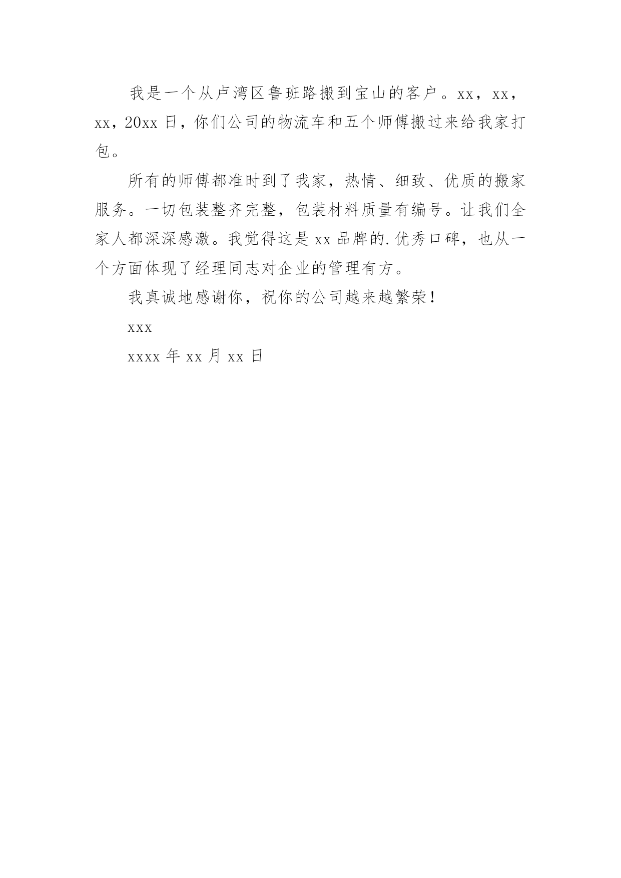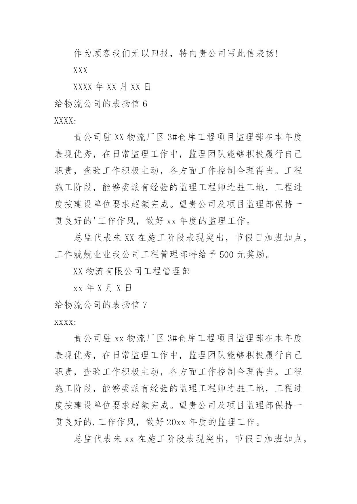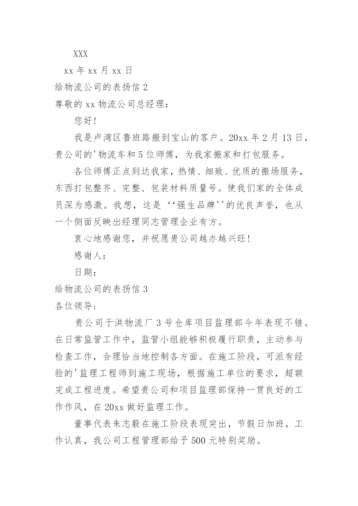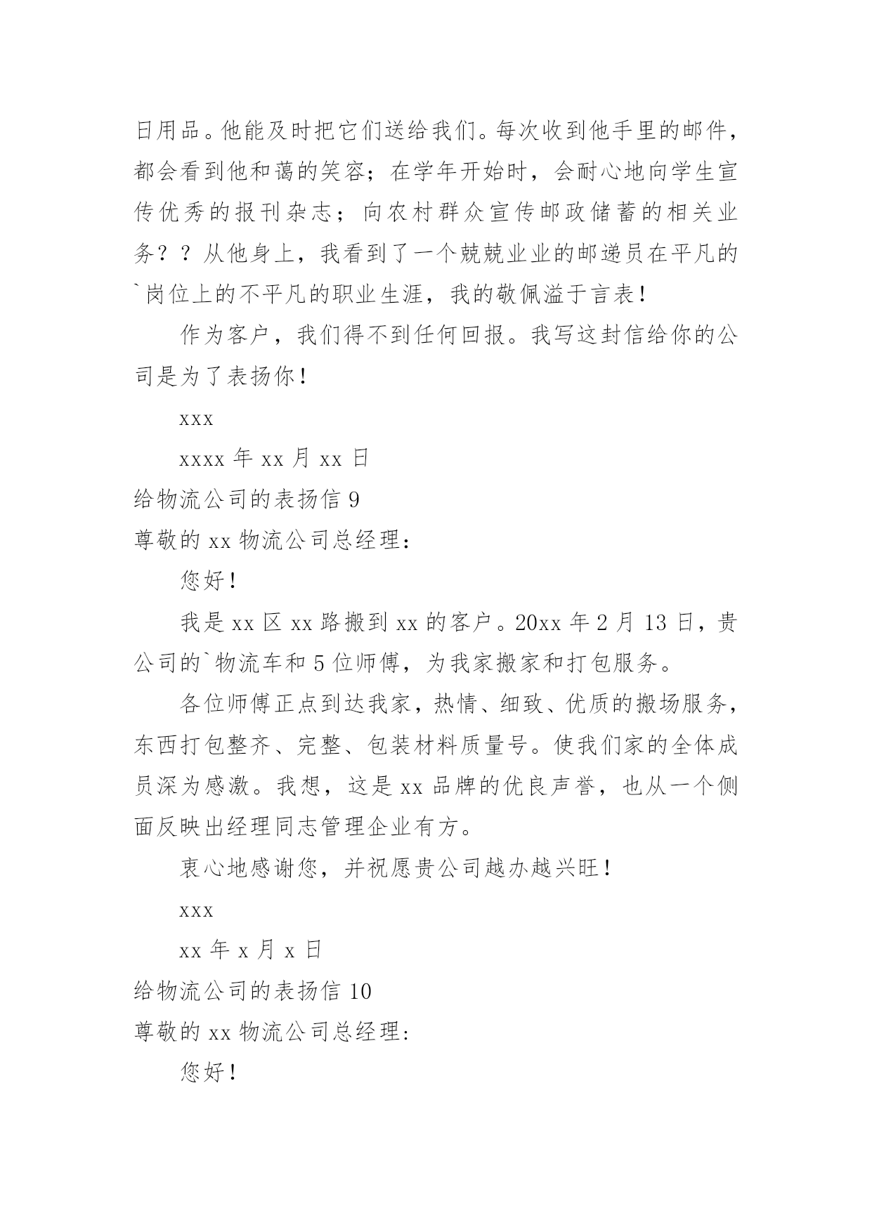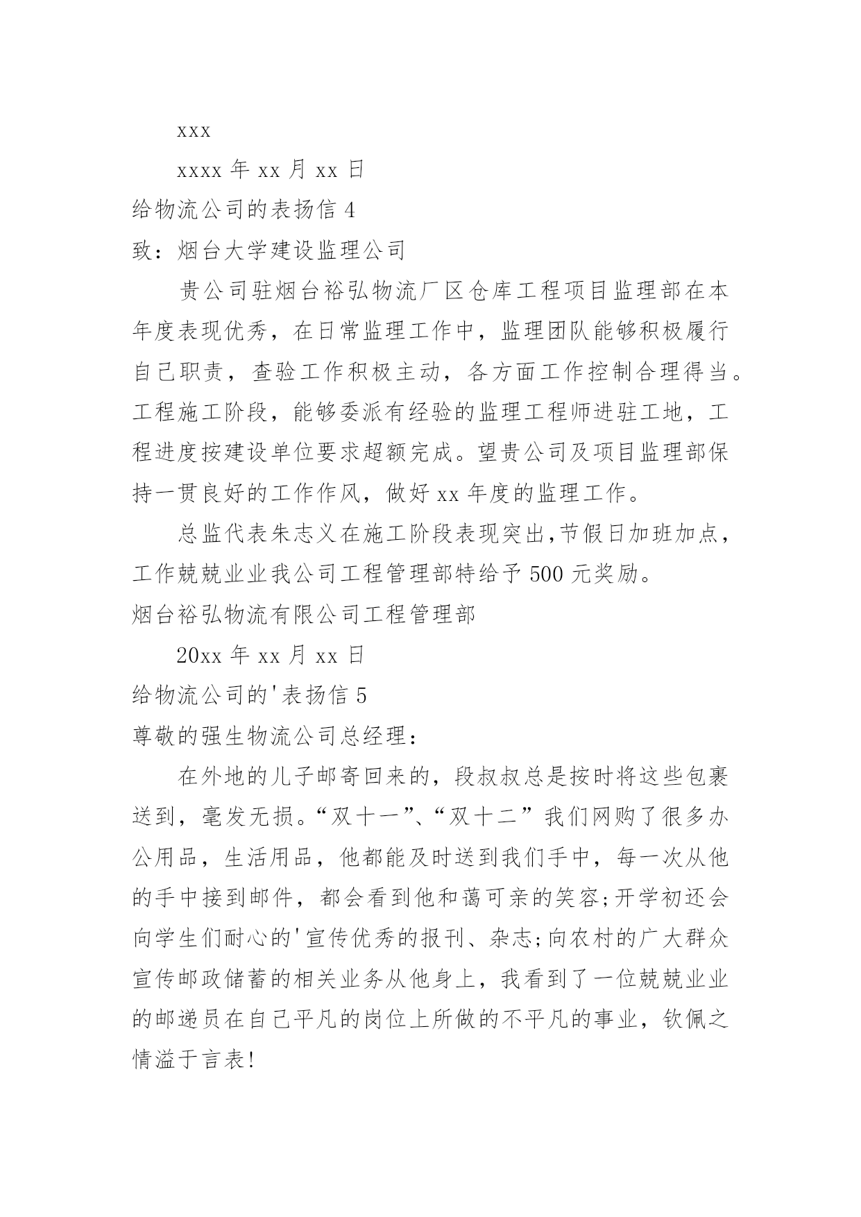 给物流公司的表扬信给物流公司的表扬信在不断进步的时代,表扬信应用范围愈来愈广泛,通过表扬信,可以对一些好人好事或是有传播意义的事迹进行表彰。怎么写表扬信才能避免踩雷呢?下面是小编帮大家整理的给物流公司的表扬信,欢迎大家分享。给物流公司的表扬信1尊敬的XX:我要表扬XX快递XX的送货员王XX电话是63XXXXX的一位胖乎乎的小伙子。他说话礼貌而且很亲切,记得那天刚刚下完雪天气很冷,他到我家门口时我出来接件,他连忙说:“不用出来了姐,天太冷了,我给你送门口去。”我听了很感动,说实话接过这么多快递件,第一次遇见这么积极认真工作的快递员。我以前遇见的快递员总是一副牛气哄哄的样子,就好像谁都欠他们钱似的,一到天气不好了,就晚一天再送,打电话给他们,还没等说完话就挂电话了,很不礼貌。就这个带眼睛的小胖哥(王XX)真的是对工作很负责,看着他把快件送到客户手中时,睁大眼睛认真仔细的确认货单,给我一种很信任很放心的`感觉,我要好好的表扬他!XXXxx年xx月xx日给物流公司的表扬信2尊敬的xx物流公司总经理:您好!我是卢湾区鲁班路搬到宝山的客户。20xx年2月13日,贵公司的'物流车和5位师傅,为我家搬家和打包服务。各位师傅正点到达我家,热情、细致、优质的搬场服务,东西打包整齐、完整、包装材料质量号。使我们家的全体成员深为感激。我想,这是‘‘强生品牌''的优良声誉,也从一个侧面反映出经理同志管理企业有方。衷心地感谢您,并祝愿贵公司越办越兴旺!感谢人:日期:给物流公司的表扬信3各位领导:贵公司于洪物流厂3号仓库项目监理部今年表现不错。在日常监管工作中,监管小组能够积极履行职责,主动参与检查工作,合理恰当地控制各方面。在施工阶段,可派有经验的'监理工程师到施工现场,根据施工单位的要求,超额完成工程进度。希望贵公司和项目监理部保持一贯良好的工作作风,在20xx做好监理工作。董事代表朱志毅在施工阶段表现突出,节假日加班,工作认真,我公司工程管理部给予500元特别奖励。xxxxxxx年xx月xx日给物流公司的表扬信4致:烟台大学建设监理公司贵公司驻烟台裕弘物流厂区仓库工程项目监理部在本年度表现优秀,在日常监理工作中,监理团队能够积极履行自己职责,查验工作积极主动,各方面工作控制合理得当。工程施工阶段,能够委派有经验的监理工程师进驻工地,工程进度按建设单位要求超额完成。望贵公司及项目监理部保持一贯良好的工作作风,做好xx年度的监理工作。总监代表朱志义在施工阶段表现突出,节假日加班加点,工作兢兢业业我公司工程管理部特给予500元奖励。烟台裕弘物流有限公司工程管理部20xx年xx月xx日给物流公司的'表扬信5尊敬的强生物流公司总经理:在外地的儿子邮寄回来的,段叔叔总是按时将这些包裹送到,毫发无损。“双十一”、“双十二”我们网购了很多办公用品,生活用品,他都能及时送到我们手中,每一次从他的手中接到邮件,都会看到他和蔼可亲的笑容;开学初还会向学生们耐心的'宣传优秀的报刊、杂志;向农村的广大群众宣传邮政储蓄的相关业务从他身上,我看到了一位兢兢业业的邮递员在自己平凡的岗位上所做的不平凡的事业,钦佩之情溢于言表!作为顾客我们无以回报,特向贵公司写此信表扬!XXXXXXX年XX月XX日给物流公司的表扬信6XXXX:贵公司驻XX物流厂区3#仓库工程项目监理部在本年度表现优秀,在日常监理工作中,监理团队能够积极履行自己职责,查验工作积极主动,各方面工作控制合理得当。工程施工阶段,能够委派有经验的监理工程师进驻工地,工程进度按建设单位要求超额完成。望贵公司及项目监理部保持一贯良好的'工作作风,做好xx年度的监理工作。总监代表朱XX在施工阶段表现突出,节假日加班加点,工作兢兢业业我公司工程管理部特给予500元奖励。XX物流有限公司工程管理部xx年X月X日给物流公司的表扬信7xxxx:贵公司驻xx物流厂区3#仓库工程项目监理部在本年度表现优秀,在日常监理工作中,监理团队能够积极履行自己职责,查验工作积极主动,各方面工作控制合理得当。工程施工阶段,能够委派有经验的监理工程师进驻工地,工程进度按建设单位要求超额完成。望贵公司及项目监理部保持一贯良好的.工作作风,做好20xx年度的监理工作。总监代表朱xx在施工阶段表现突出,节假日加班加点,工作兢兢业业我公司工程管理部特给予500元奖励。xx物流有限公司工程管理部20xx年x月x日给物流公司的表扬信8陕西邮政公司:我代表xxx给贵公司写一封表扬信,表彰你们xxx30多年来的奉献精神。xxx给我们学校发的报纸、期刊、杂志、信件和包裹,没有错误,风雨无阻,热情,奉献给人民,礼貌,负责。过去交通不便,交通工具落后。段叔叔骑自行车是为了纪念。他来的时候,车后座两边的绿色袋子里全是信件和出版物。他回来的时候,后座两边依然坐满了人,这是村民与外界