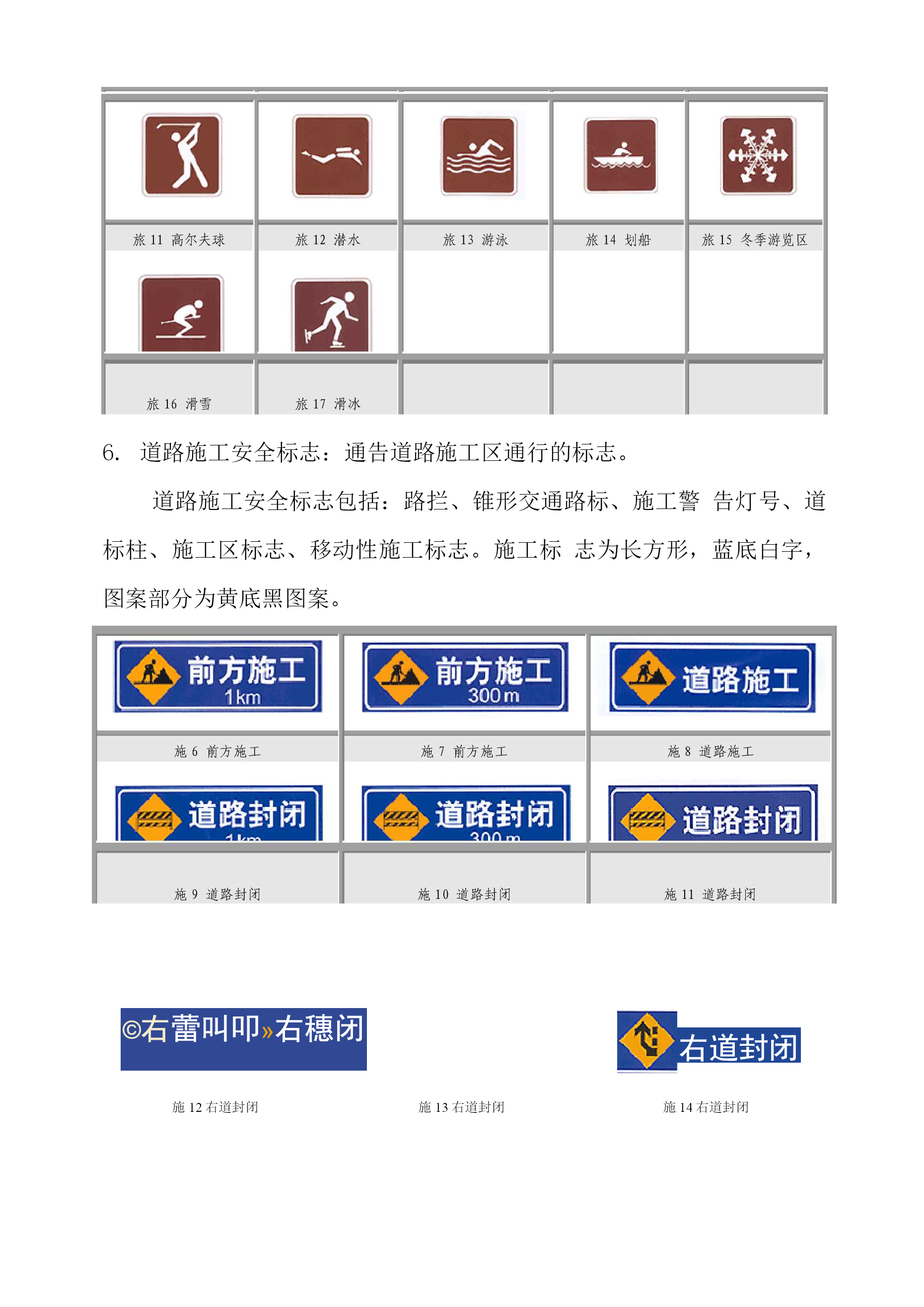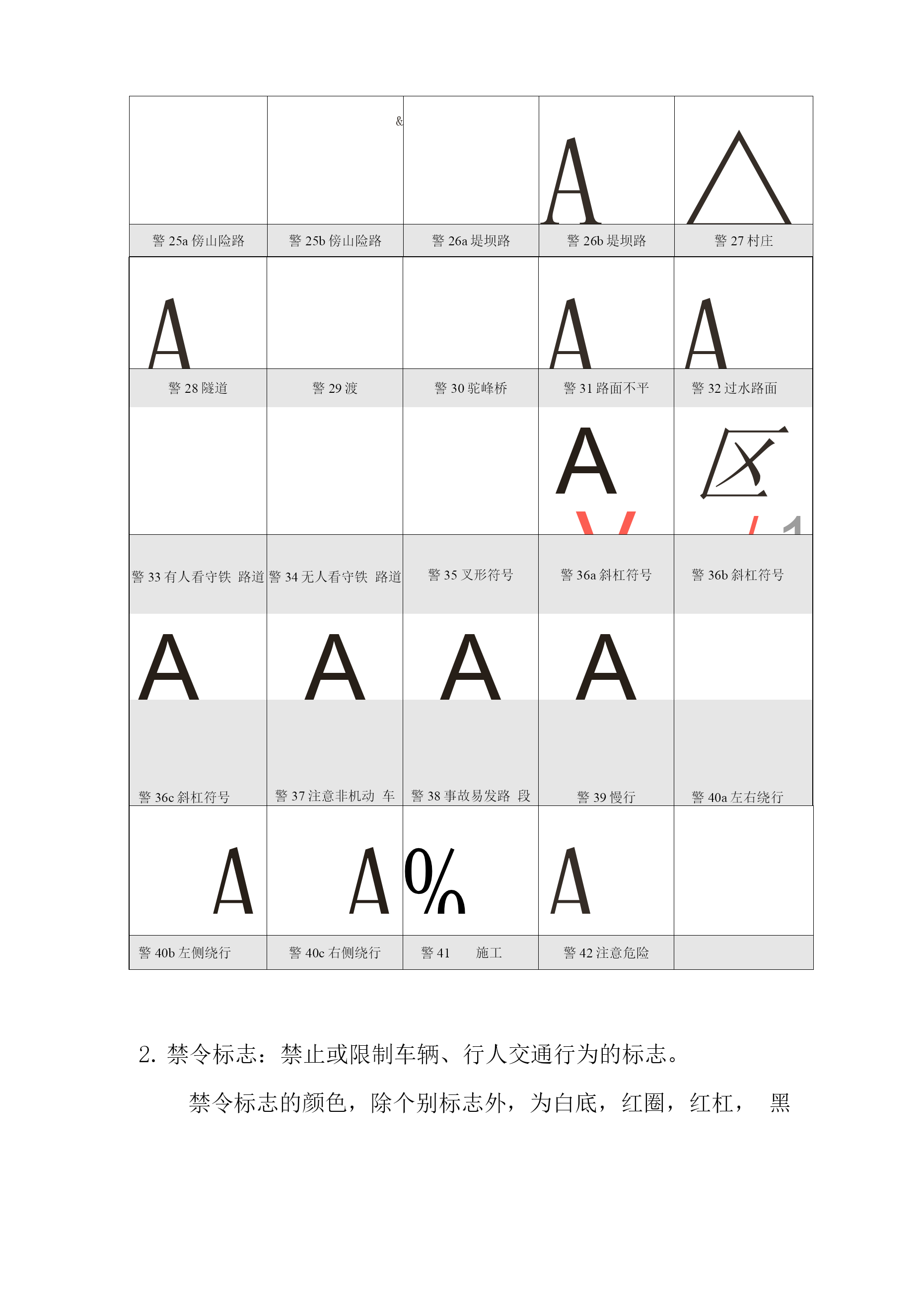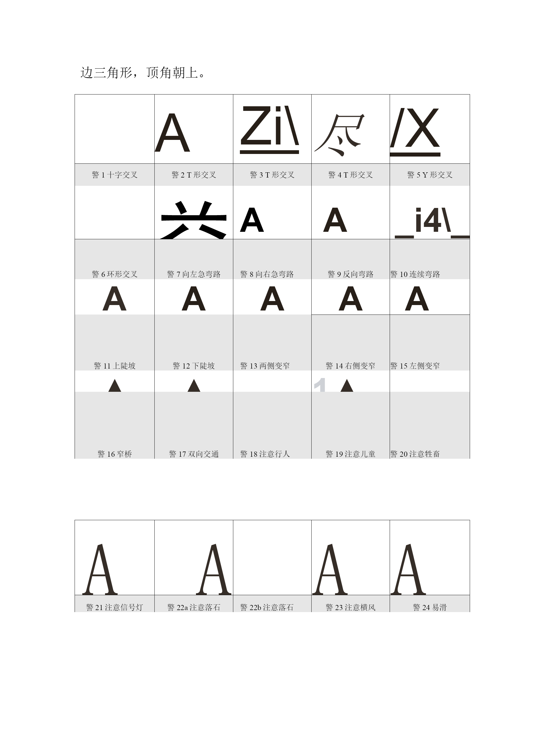 道路交通标志和标线目录TOC\o"1-5"\h\zHYPERLINK"h"\l"bookmark13"\o"CurrentDocument"第一篇道路交通标志2警告标志2禁令标志4指示标志5指路标志6旅游区标志8道路施工安全标志9HYPERLINK"h"\l"bookmark40"\o"CurrentDocument"第二篇道路交通标线101指示标线102禁止标线143警告标线16第一篇道路交通标志道路交通标志是用图形符号、颜色和文字向交通参与者传递特定信息,用于管理交通的设施。当标志上采用中英两种文字时,地名用汉语拼音,专用名词用英文。警告标志:警告车辆、行人注意危险地点的标志。警告标志的颜色为黄底、黑边、黑图案。警告标志的形状为等边三角形,顶角朝上。AZi\尽/X警1十字交叉警2T形交叉警3T形交叉警4T形交叉警5Y形交叉益AA_i4\_警6环形交叉警7向左急弯路警8向右急弯路警9反向弯路警10连续弯路AAAAA警11上陡坡警12下陡坡警13两侧变窄警14右侧变窄警15左侧变窄▲▲1▲.警16窄桥警17双向交通警18注意行人警19注意儿童警20注意牲畜AAAA警21注意信号灯警22a注意落石警22b注意落石警23注意横风警24易滑&A△警25a傍山险路警25b傍山险路警26a堤坝路警26b堤坝路警27村庄AAA警28隧道警29渡警30驼峰桥警31路面不平警32过水路面AV区/1警33有人看守铁路道警34无人看守铁路道警35叉形符号警36a斜杠符号警36b斜杠符号AAAA警36c斜杠符号警37注意非机动车警38事故易发路段警39慢行警40a左右绕行AA%A警40b左侧绕行警40c右侧绕行警41施工警42注意危险禁令标志:禁止或限制车辆、行人交通行为的标志。禁令标志的颜色,除个别标志外,为白底,红圈,红杠,黑图案。图案压杠。禁令标志的形状为圆形、八角形、顶角向下的等边三角形。右转弯向左转弯弯弯禁26禁止直行和向右转弯禁27禁止掉头禁28禁止超车禁29解除禁止超车禁30禁止车辆临时或长时停放禁31禁止车辆长时停放亶禁32禁止鸣喇叭祖禁33限制宽度禁34限制高度小禁35限制质量G禁36限制轴重禁37限制速度禁38解除限制速度禁39停车检查禁40停车让行禁41减速让行禁42会车让行指示标志:指示车辆、行人进行的标志。指示标志的颜色为蓝底、白图案。指示标志的形状分为圆形、长方形和正方形。示1直行示2向左转弯示3向右转弯示4直行和向左转弯示5直行和向右转弯示11环岛行驶示12单行路(向左或向右)示15鸣喇叭示16最低限速示18会车先行示21直行车道示17干路先行示22直行和右转合用车道示23分向行驶车道示14步行示19人行横道示24公交线路专用车道示20右转车道示25机动车行驶指路标志:传递道路方向、地点、距离信息的标志。指路标志的颜色,一般道路为蓝底白图案,高速公路为绿底白图案。指路标志的形状,除地点识别标志、里程碑、分合流标志外,为长方形和正方形。路11b丁字交叉路路11C丁字交叉路路11d丁字交叉路路12环字交叉路路13a互通式立交路13b互通式立交路13c互通式立交路13d互通式立交路14分岔处路15地点距离旅游区标志:提供旅游景点方向、距离的标志。旅游区标志分为:a)指引标志,b)旅游符号两大类。旅游区标志的颜色为棕色底白色字符。道路施工安全标志:通告道路施工区通行的标志。道路施工安全标志包括:路拦、锥形交通路标、施工警告灯号、道标柱、施工区标志、移动性施工标志。施工标志为长方形,蓝底白字,图案部分为黄底黑图案。©右蕾叫叩»右穗闭右道封闭施12右道封闭施13右道封闭施14右道封闭第二篇道路交通标线道路交通标线是由标划于路面上的各种线条、箭头、文字、立面标记、突起路标和轮廓标等所构成的交通安全设施。它的作用是管制和引导交通。可以与标志配合使用,也可单独使用。指示标线:指示车行道、行车方向、路面边缘、人行道等设施的标线。线1双向两车道路面中心线1线7左弯待转区线IV-A:线10人行横道(斜交)线13车距确认线禁止标线:告示道路交通的遵行、禁止、限制等特殊规定,车辆驾驶人及行人需严格遵守的标