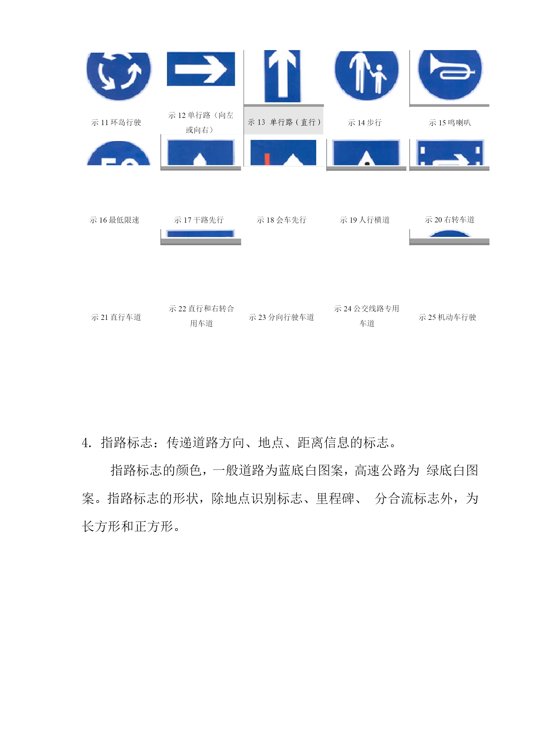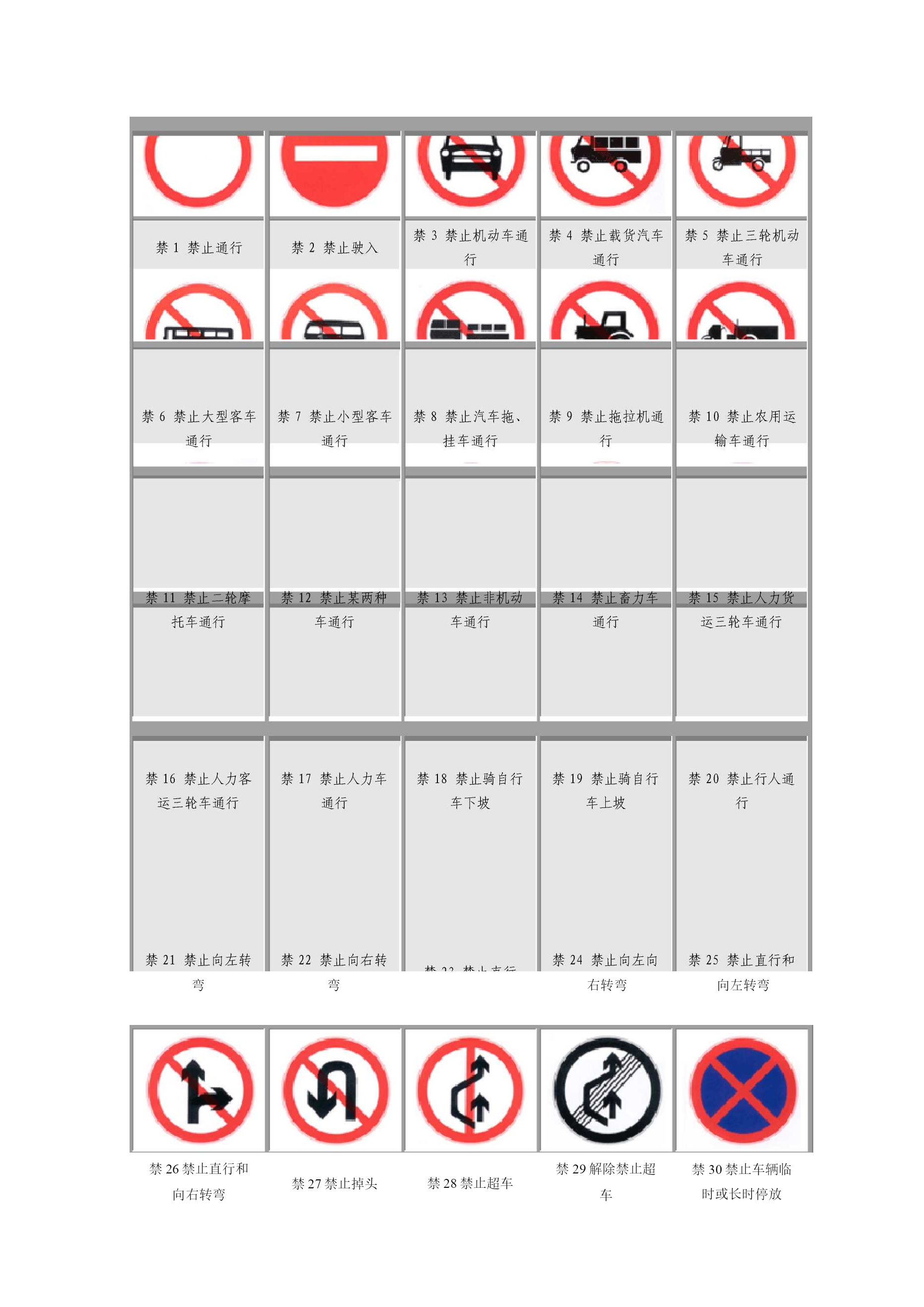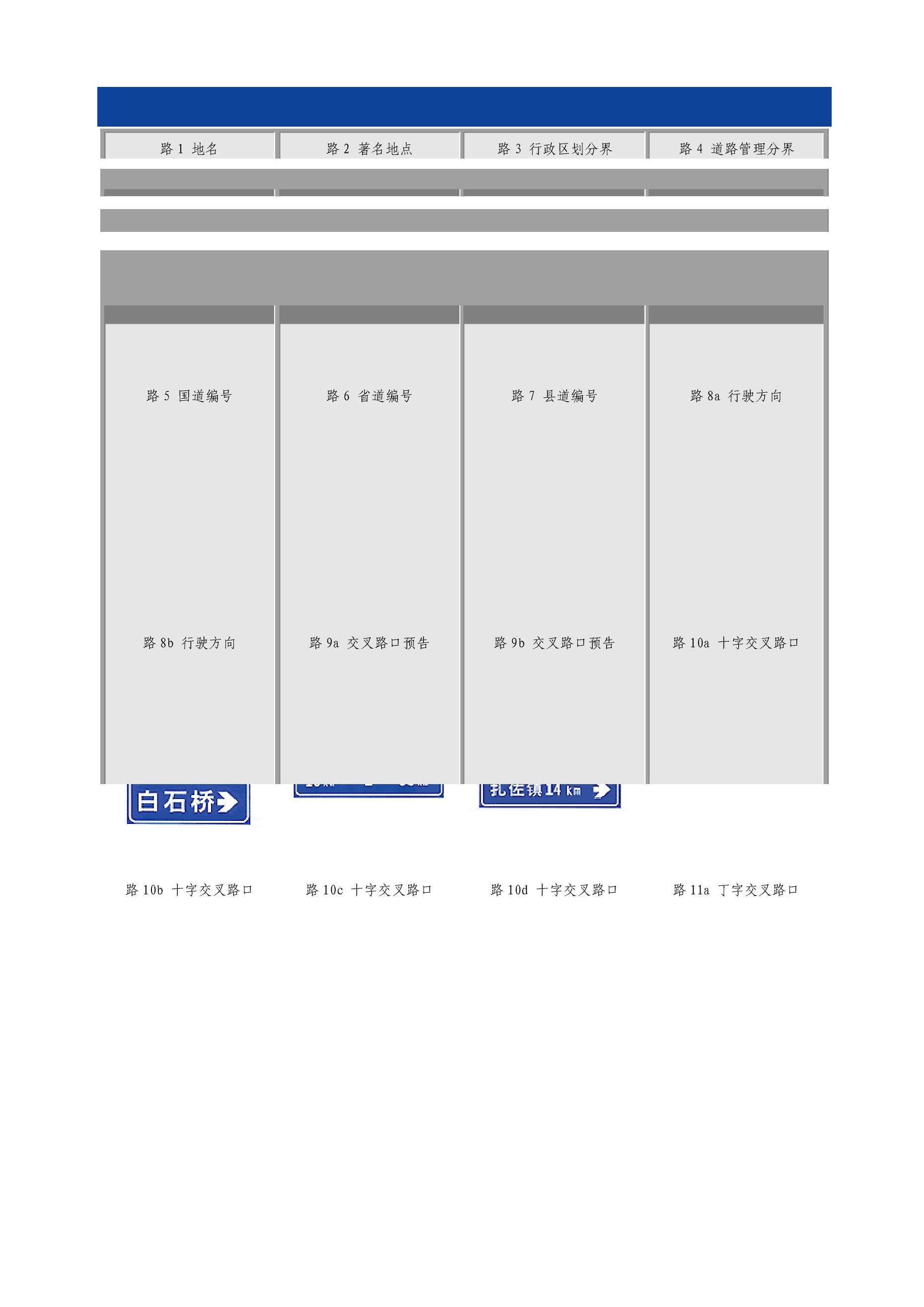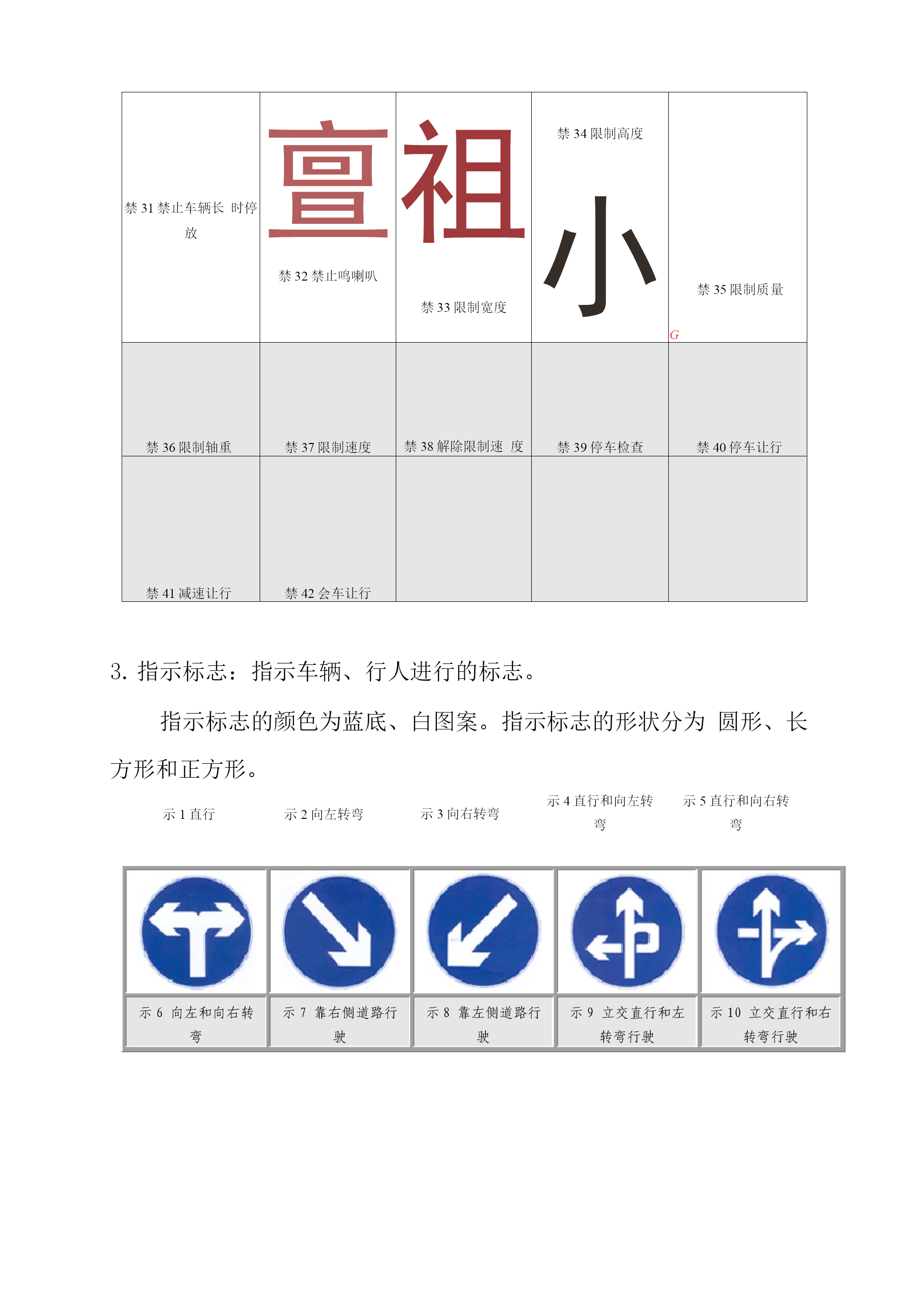 道路交通标志和标线目录TOC\o"1-5"\h\zHYPERLINK"h"\l"bookmark13"\o"CurrentDocument"第一篇道路交通标志2警告标志2禁令标志4指示标志5指路标志6旅游区标志8道路施工安全标志9HYPERLINK"h"\l"bookmark40"\o"CurrentDocument"第二篇道路交通标线101指示标线102禁止标线143警告标线16第一篇道路交通标志道路交通标志是用图形符号、颜色和文字向交通参与者传递特定信息,用于管理交通的设施。当标志上采用中英两种文字时,地名用汉语拼音,专用名词用英文。警告标志:警告车辆、行人注意危险地点的标志。警告标志的颜色为黄底、黑边、黑图案。警告标志的形状为等边三角形,顶角朝上。AZi\尽/X警1十字交叉警2T形交叉警3T形交叉警4T形交叉警5Y形交叉益AA_i4\_警6环形交叉警7向左急弯路警8向右急弯路警9反向弯路警10连续弯路AAAAA警11上陡坡警12下陡坡警13两侧变窄警14右侧变窄警15左侧变窄▲▲1▲.警16窄桥警17双向交通警18注意行人警19注意儿童警20注意牲畜AAAA警21注意信号灯警22a注意落石警22b注意落石警23注意横风警24易滑&A△警25a傍山险路警25b傍山险路警26a堤坝路警26b堤坝路警27村庄AAA警28隧道警29渡警30驼峰桥警31路面不平警32过水路面AV区/1警33有人看守铁路道警34无人看守铁路道警35叉形符号警36a斜杠符号警36b斜杠符号AAAA警36c斜杠符号警37注意非机动车警38事故易发路段警39慢行警40a左右绕行AA%A警40b左侧绕行警40c右侧绕行警41施工警42注意危险禁令标志:禁止或限制车辆、行人交通行为的标志。禁令标志的颜色,除个别标志外,为白底,红圈,红杠,黑图案。图案压杠。禁令标志的形状为圆形、八角形、顶角向下的等边三角形。右转弯向左转弯弯弯禁26禁止直行和向右转弯禁27禁止掉头禁28禁止超车禁29解除禁止超车禁30禁止车辆临时或长时停放禁31禁止车辆长时停放亶禁32禁止鸣喇叭祖禁33限制宽度禁34限制高度小禁35限制质量G禁36限制轴重禁37限制速度禁38解除限制速度禁39停车检查禁40停车让行禁41减速让行禁42会车让行指示标志:指示车辆、行人进行的标志。指示标志的颜色为蓝底、白图案。指示标志的形状分为圆形、长方形和正方形。示1直行示2向左转弯示3向右转弯示4直行和向左转弯示5直行和向右转弯示11环岛行驶示12单行路(向左或向右)示15鸣喇叭示16最低限速示18会车先行示21直行车道示17干路先行示22直行和右转合用车道示23分向行驶车道示14步行示19人行横道示24公交线路专用车道示20右转车道示25机动车行驶指路标志:传递道路方向、地点、距离信息的标志。指路标志的颜色,一般道路为蓝底白图案,高速公路为绿底白图案。指路标志的形状,除地点识别标志、里程碑、分合流标志外,为长方形和正方形。路11b丁字交叉路路11C丁字交叉路路11d丁字交叉路路12环字交叉路路13a互通式立交路13b互通式立交路13c互通式立交路13d互通式立交路14分岔处路15地点距离旅游区标志:提供旅游景点方向、距离的标志。旅游区标志分为:a)指引标志,b)旅游符号两大类。旅游区标志的颜色为棕色底白色字符。道路施工安全标志:通告道路施工区通行的标志。道路施工安全标志包括:路拦、锥形交通路标、施工警告灯号、道标柱、施工区标志、移动性施工标志。施工标志为长方形,蓝底白字,图案部分为黄底黑图案。©右蕾叫叩»右穗闭右道封闭施12右道封闭施13右道封闭施14右道封闭第二篇道路交通标线道路交通标线是由标划于路面上的各种线条、箭头、文字、立面标记、突起路标和轮廓标等所构成的交通安全设施。它的作用是管制和引导交通。可以与标志配合使用,也可单独使用。指示标线:指示车行道、行车方向、路面边缘、人行道等设施的标线。线1双向两车道路面中心线1线7左弯待转区线IV-A:线10人行横道(斜交)线13车距确认线禁止标线:告示道路交通的遵行、禁止、限制等特殊规定,车辆驾驶人及行人需严格遵守的标