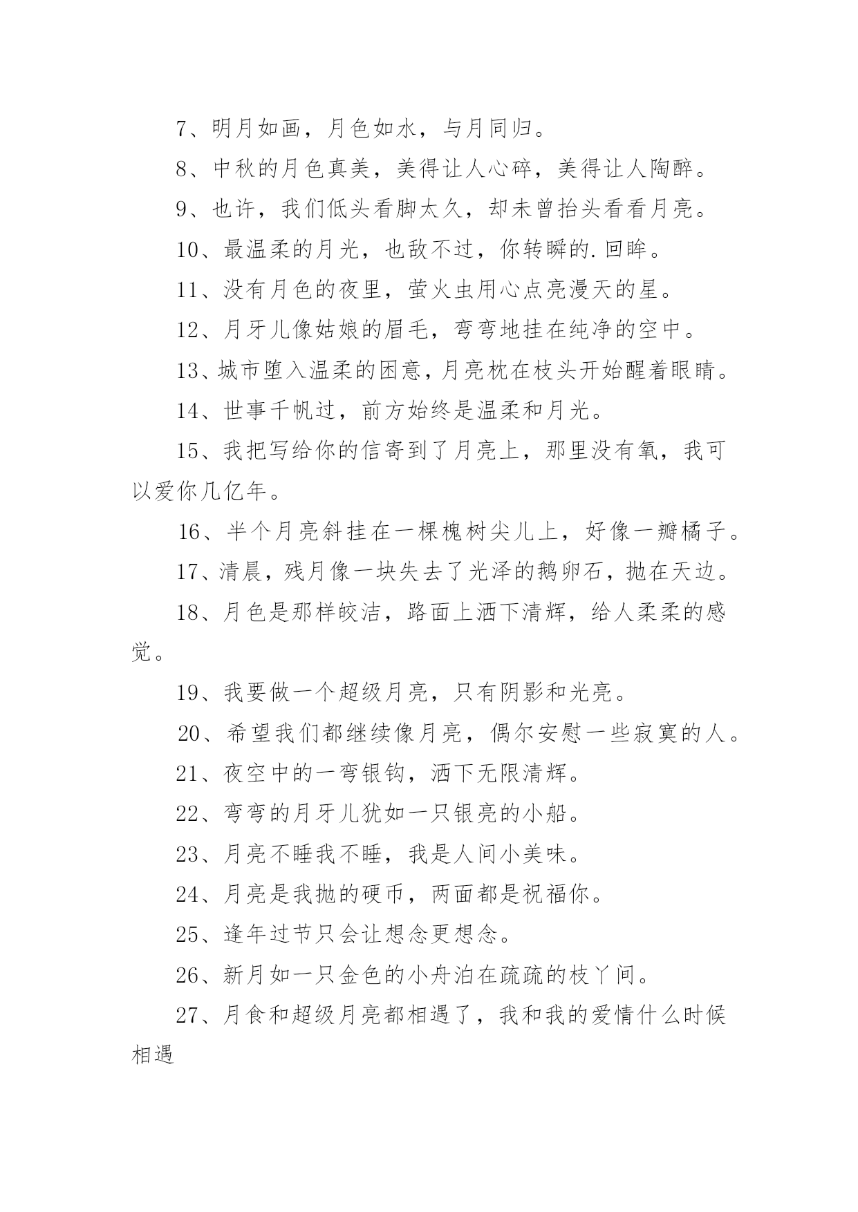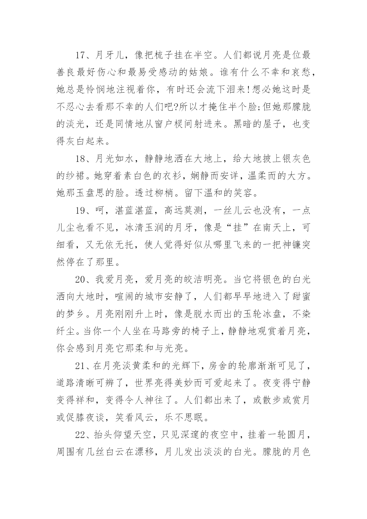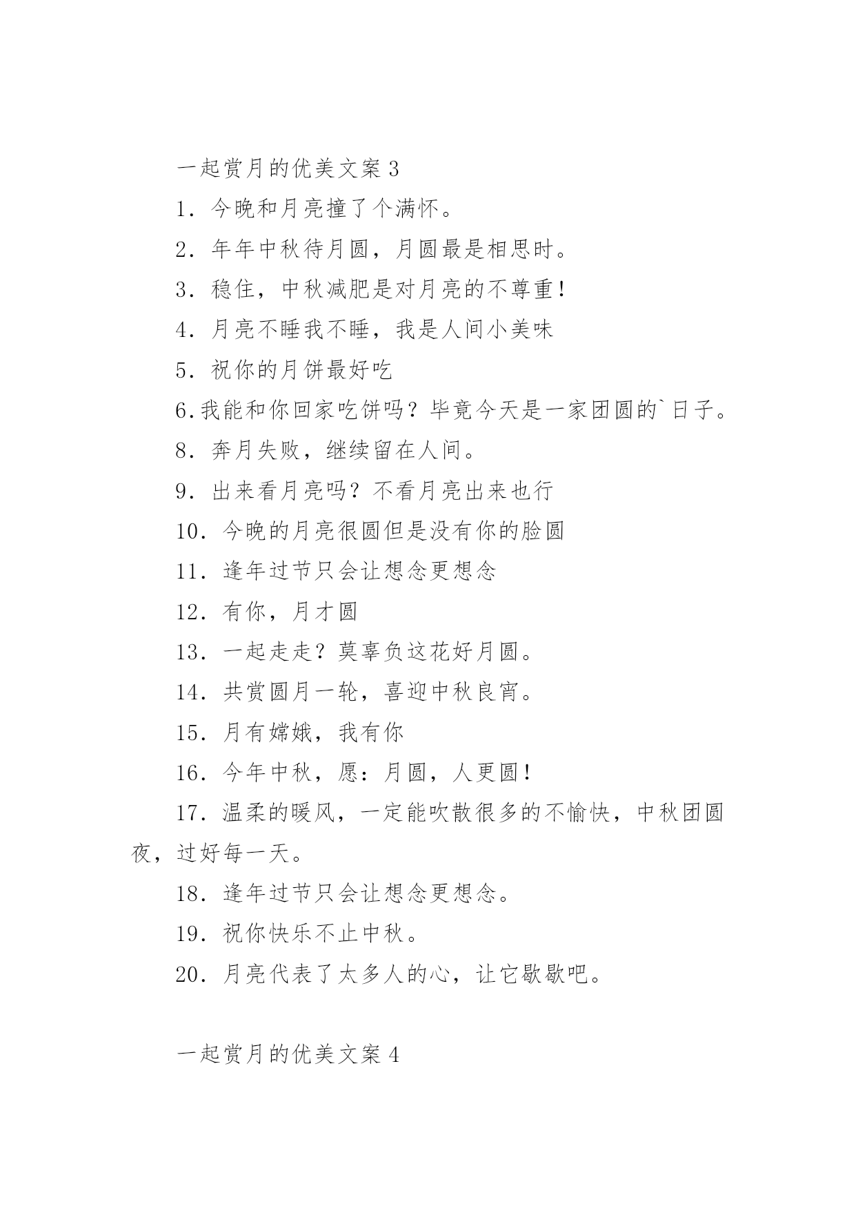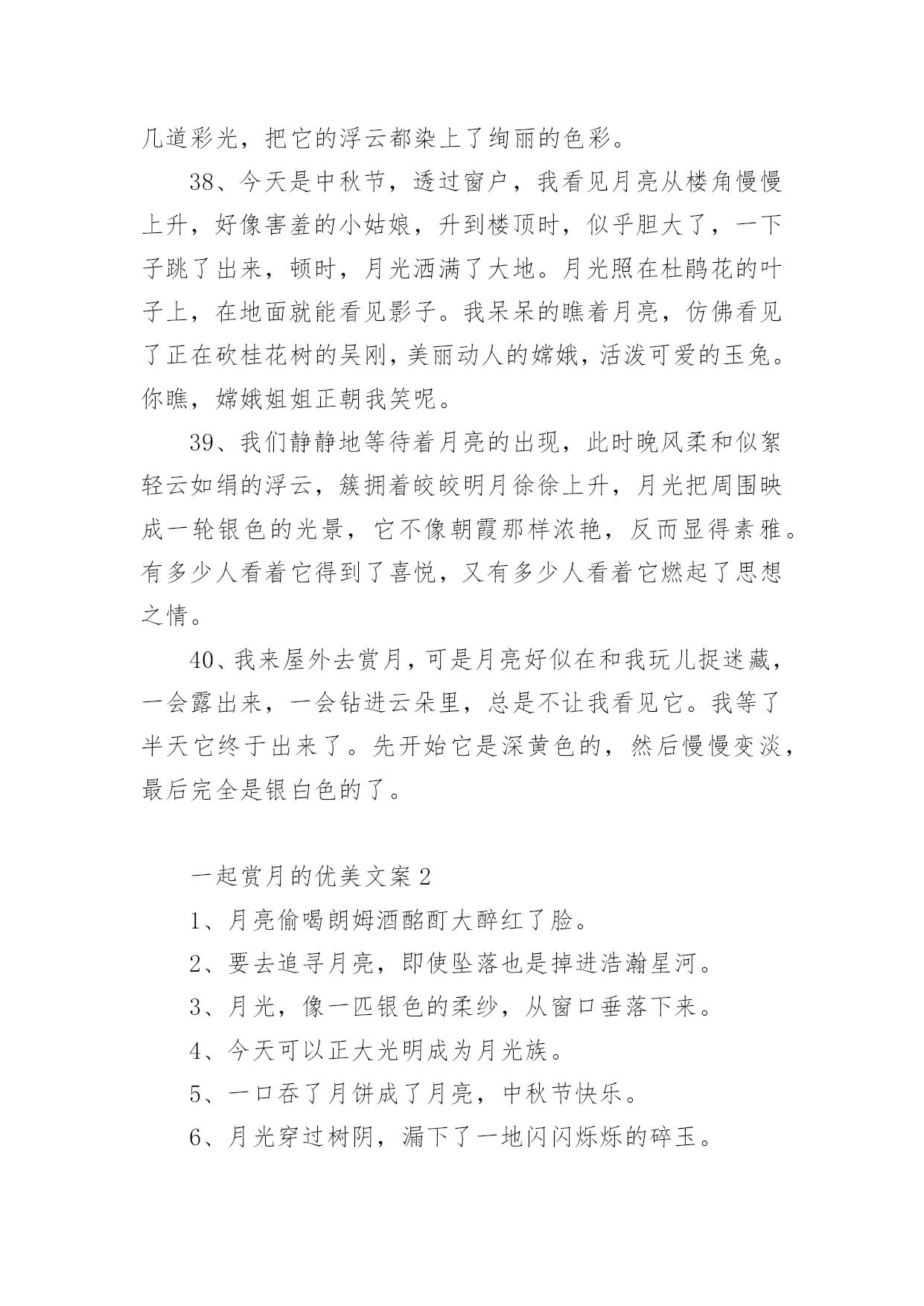 一起赏月的优美文案在日常生活或是工作学习中,越来越多人钟情于在朋友圈发布文案,文案用以记录每天的生活,写作和思考。究竟什么样的文案才是好的文案呢?以下是小编整理的一起赏月的优美文案,仅供参考,大家一起来看看吧。一起赏月的优美文案11、十五的月亮,又升上了天空。看,一轮明月在深蓝色的天空中微笑着看着大地,大地上一片洁白,好似笼着轻纱。2、细细密密的月光就像一封封飘飞的“星际特快专递”,那是嫦娥姐姐邀请地球上的小朋友去月宫分享她亲手制作的桂花糕。3、这时,天色逐渐暗下来了,大地笼罩着一片朦胧的夜色。月亮姑娘悄悄地露出了那圆圆的笑脸,俯视着辽阔的大地。村庄山川田野,好象一座逼真的玉雕,庄严而美丽。奔腾一天的小河,在皎洁的月光下慢慢的流淌。晚风吹来,波光粼粼,就像无数小鱼在水面追逐跳跃欢腾。河边有许多人在那里乘凉,轻松而闲适。孩子们在这月白风清的夜晚下捉迷藏……连歌声笑声说话声也像月亮那样轻柔和谐。4、晚上,闲来无事,实在无聊,于是一个人就漫步学校后面的小树林中,独自去享受那夜色之美。抬头望着寂静的夜空,可爱的月亮从树梢后慢慢地爬上半空,光亮圆润,像一块玉琢的盘子。温柔的月光如流水般倾泻而下,仿佛滑过一曲悦耳的琴声。5、中秋节的月在新江桥显得格外宁静。没有汽车的桥上安静极了,桥下江水滔滔,游船往来,月光照在水面,洒下一片银辉。对面繁华的街道上传来时隐时现的越剧声。月亮是那么亮,使五彩的霓虹都黯然失色。6、淡淡的月光下,几位小孩在玩耍,那月光照在头发上,使头发好象镀了一层银色的花边。7、深邃的夜,有了月亮的存在,星星都变得暗淡了。多少人都赞美月亮的美好,而旁边的星星,却总被人忽视和遗忘。的确,一颗星星的光芒,又怎能比得上月亮的光辉呢?在月亮的旁边,星星显得好渺小,微不足道。8、皎洁的月光像银色的轻纱披在大地上,乌云不再唱独角戏,早已羞得躲到一边去了,没有了踪影……9、适逢中秋之夜,我仰望天空,望见一轮圆月,但不是我们常说的一轮皎洁的圆月,天空中有层层清云,如烟似雾,弥蒙在月光下。月晕恰恰是这圆月与清云的红娘,牵于二者之间,淡淡的点上一圈,既不喧宾夺主,又有万般娇态。10、月亮像弯弯的银钩挂在树梢上,朦胧的夜色给大地罩上了一层轻纱,屋内的点点灯火映出的光线与天际的星光连成一片,朦胧中仿佛置身于浩瀚无垠的天空中。11、柔和似絮,轻均如绢的浮云,簇拥着盈盈的皓月冉冉上升,清辉把周围映成一轮彩色的光圈,有深而浅,若有若无。不像晚霞那样浓艳,因而更显得素雅,没有夕照那样灿烂,只给你点淡淡的喜悦,一点淡淡的哀愁。12、今年中秋节,恰逢农历八月十五,黄昏的傍晚,玉兔东升,皎洁的月亮正照耀着一轮圆月,天空中有几朵洁白的云彩飘荡在云朵中间,微风飒飒,徐徐地吹着小风,月光下的葡萄架上有几串沉甸甸的葡萄,正挂在葡萄架上,几只萤火虫飞来飞去,又飞去飞来,是那么的有情调,这情调又是那么的迷人。13、青烟一般的新月的光辉,到处倾泻起来,倾泻到悬岩断壁上山坡上白岩角上,倾泻到像手臂一样伸展着的树枝上,或者是被裂缝侵蚀成的断岩上。一切都分明清晰,一切都成了活生生的了。14、一弯新月高高地挂在天空,在水面上投下淡淡的银光,增加了水的凉意。对面的晚香楼冷清清地耸立在银光下面,楼前是一片白灿灿的花朵。还有山,石壁,桃树,柳树,各有各的颜色和形态,在银白的月光下,似乎都含着一种不可告人的秘密。15、中秋的月儿散发光芒,撒下皎洁的月光,那么温柔,如轻纱一般,映出了我惨白的笑脸。人们说太阳火热,我说月儿幽美;人们说太阳生机,我说月儿恬静;人们说太阳光芒万丈,我说月儿月色柔和;人们说太阳金光四溢,我说月儿满月生辉;人们说太阳灿若锦绣,我说月儿清辉四射!16、今天的月亮好大呀!我走到小河边,那倒映在水中的月亮,是那样的清晰,那样的完美无缺。那轮冰清玉洁的皓月慢悠悠地在水中伏游着,泛着柔美的金光。17、月牙儿,像把梳子挂在半空。人们都说月亮是位最善良最好伤心和最易受感动的姑娘。谁有什么不幸和哀愁,她总是怜悯地注视着你,有时还会流下泪来!想必她这时是不忍心去看那不幸的人们吧?所以才掩住半个脸;但她那朦胧的淡光,还是同情地从窗户棂间射进来。黑暗的屋子,也变得灰白起来。18、月光如水,静静地洒在大地上,给大地披上银灰色的纱裙。她穿着素白色的衣衫,娴静而安详,温柔而的大方。她那玉盘思的脸。透过柳梢。留下温和的笑容。19、呵,湛蓝湛蓝,高远莫测,一丝儿云也没有,一点儿尘也看不见,冰清玉润的月牙,像是“挂”在南天上,可细看,又无依无托,使人觉得好似从哪里飞来的一把神镰突然停在了那里。20、我爱月亮,爱月亮的皎洁明亮。当它将银色的白光洒向大地时,喧闹的城市安静了,人们都早早地进入了甜蜜的梦乡。月亮刚刚升上时,像是脱水而出的玉轮冰盘,不染纤尘。当你一个人坐在马路旁的椅子上,静静地观赏着月亮,你会感
