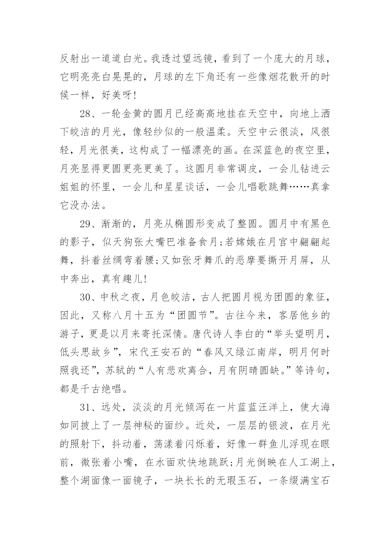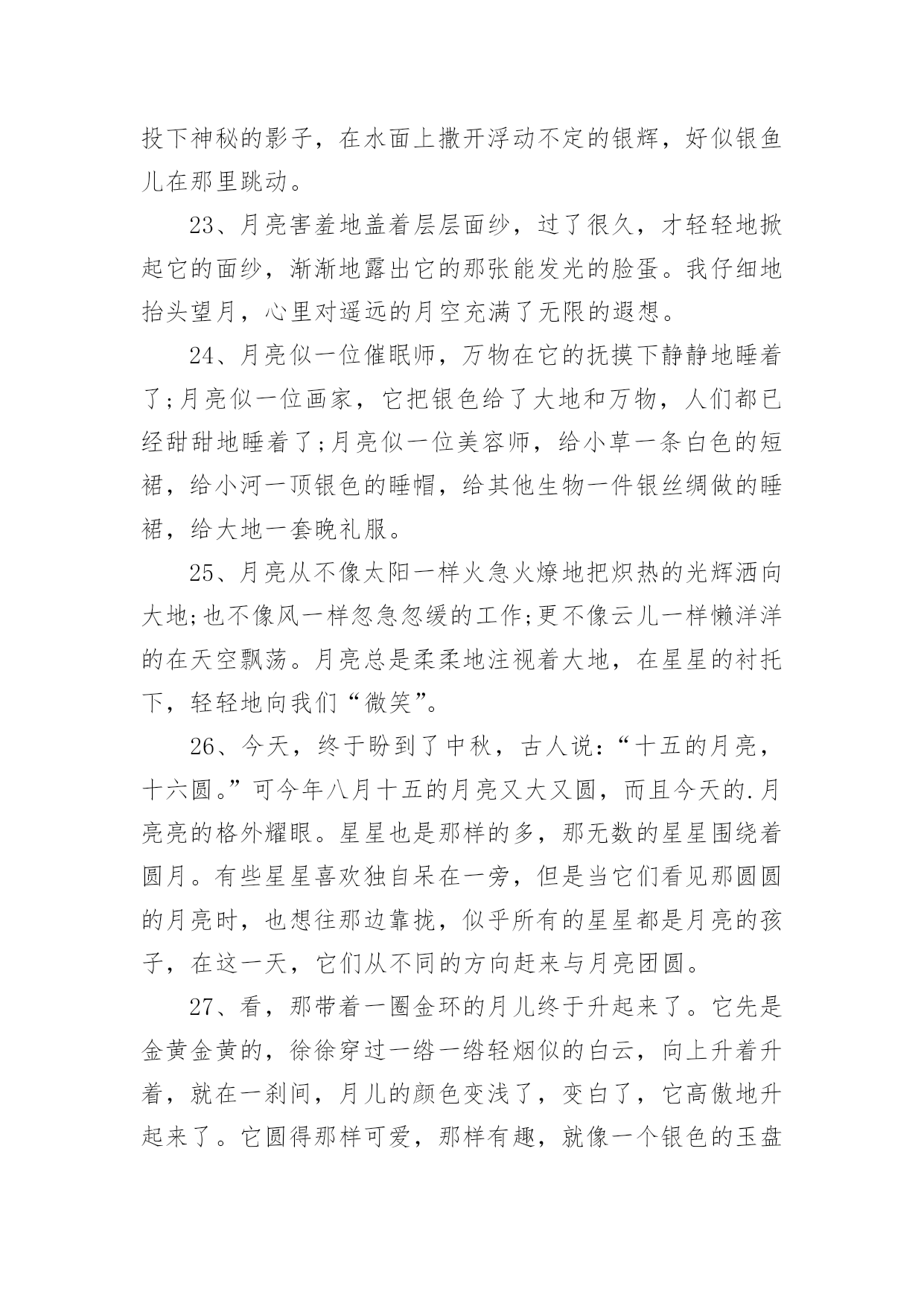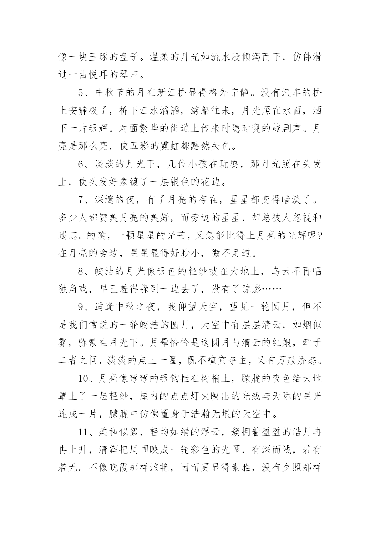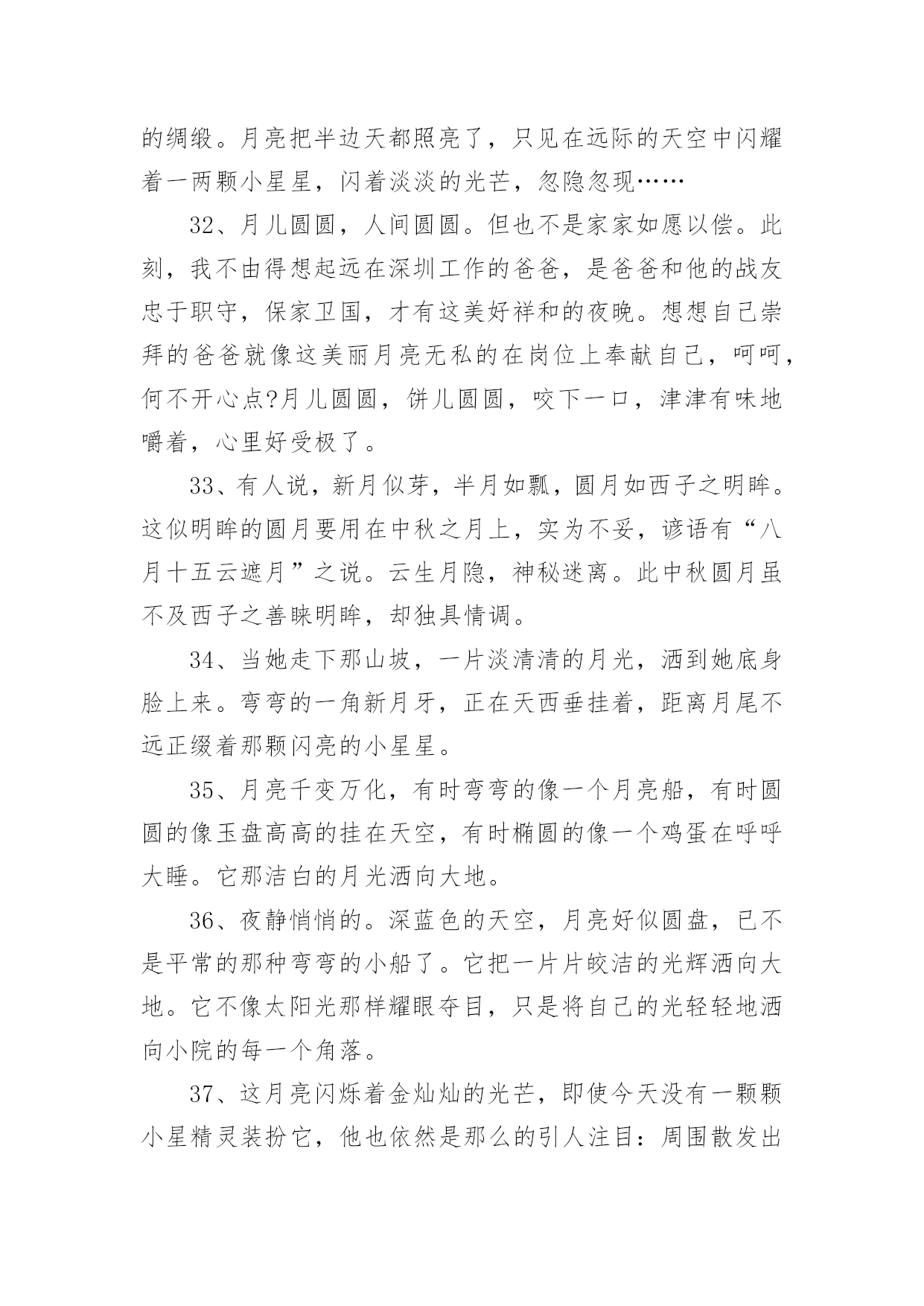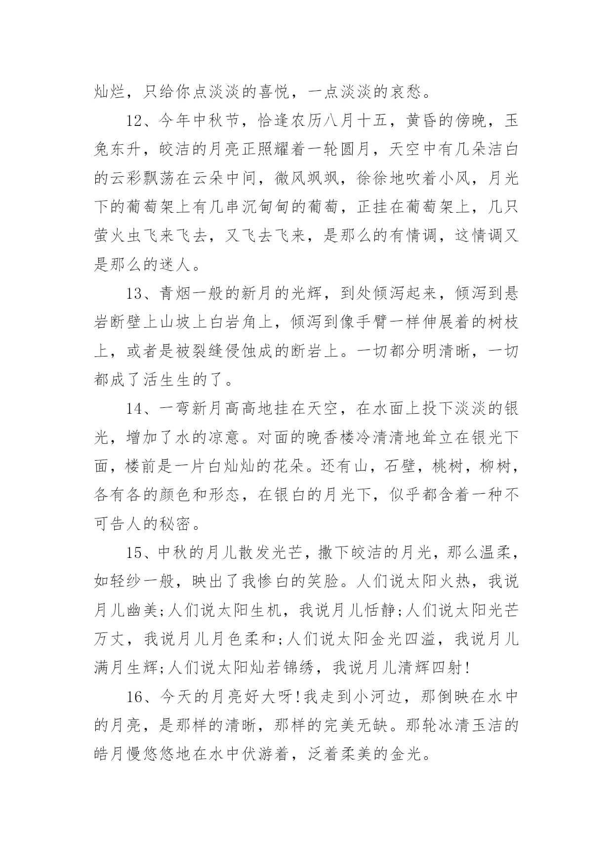 一起赏月的优美文案在日常生活或是工作学习中,越来越多人钟情于在朋友圈发布文案,文案用以记录每天的生活,写作和思考。究竟什么样的文案才是好的文案呢?以下是小编整理的一起赏月的优美文案,仅供参考,大家一起来看看吧。一起赏月的优美文案11、十五的月亮,又升上了天空。看,一轮明月在深蓝色的天空中微笑着看着大地,大地上一片洁白,好似笼着轻纱。2、细细密密的月光就像一封封飘飞的“星际特快专递”,那是嫦娥姐姐邀请地球上的小朋友去月宫分享她亲手制作的桂花糕。3、这时,天色逐渐暗下来了,大地笼罩着一片朦胧的夜色。月亮姑娘悄悄地露出了那圆圆的笑脸,俯视着辽阔的大地。村庄山川田野,好象一座逼真的玉雕,庄严而美丽。奔腾一天的小河,在皎洁的月光下慢慢的流淌。晚风吹来,波光粼粼,就像无数小鱼在水面追逐跳跃欢腾。河边有许多人在那里乘凉,轻松而闲适。孩子们在这月白风清的夜晚下捉迷藏……连歌声笑声说话声也像月亮那样轻柔和谐。4、晚上,闲来无事,实在无聊,于是一个人就漫步学校后面的小树林中,独自去享受那夜色之美。抬头望着寂静的夜空,可爱的月亮从树梢后慢慢地爬上半空,光亮圆润,像一块玉琢的盘子。温柔的月光如流水般倾泻而下,仿佛滑过一曲悦耳的琴声。5、中秋节的月在新江桥显得格外宁静。没有汽车的桥上安静极了,桥下江水滔滔,游船往来,月光照在水面,洒下一片银辉。对面繁华的街道上传来时隐时现的越剧声。月亮是那么亮,使五彩的霓虹都黯然失色。6、淡淡的月光下,几位小孩在玩耍,那月光照在头发上,使头发好象镀了一层银色的花边。7、深邃的夜,有了月亮的存在,星星都变得暗淡了。多少人都赞美月亮的美好,而旁边的星星,却总被人忽视和遗忘。的确,一颗星星的光芒,又怎能比得上月亮的光辉呢?在月亮的旁边,星星显得好渺小,微不足道。8、皎洁的月光像银色的轻纱披在大地上,乌云不再唱独角戏,早已羞得躲到一边去了,没有了踪影……9、适逢中秋之夜,我仰望天空,望见一轮圆月,但不是我们常说的一轮皎洁的圆月,天空中有层层清云,如烟似雾,弥蒙在月光下。月晕恰恰是这圆月与清云的红娘,牵于二者之间,淡淡的点上一圈,既不喧宾夺主,又有万般娇态。10、月亮像弯弯的银钩挂在树梢上,朦胧的夜色给大地罩上了一层轻纱,屋内的点点灯火映出的光线与天际的星光连成一片,朦胧中仿佛置身于浩瀚无垠的天空中。11、柔和似絮,轻均如绢的浮云,簇拥着盈盈的皓月冉冉上升,清辉把周围映成一轮彩色的光圈,有深而浅,若有若无。不像晚霞那样浓艳,因而更显得素雅,没有夕照那样灿烂,只给你点淡淡的喜悦,一点淡淡的哀愁。12、今年中秋节,恰逢农历八月十五,黄昏的傍晚,玉兔东升,皎洁的月亮正照耀着一轮圆月,天空中有几朵洁白的云彩飘荡在云朵中间,微风飒飒,徐徐地吹着小风,月光下的葡萄架上有几串沉甸甸的葡萄,正挂在葡萄架上,几只萤火虫飞来飞去,又飞去飞来,是那么的有情调,这情调又是那么的迷人。13、青烟一般的新月的光辉,到处倾泻起来,倾泻到悬岩断壁上山坡上白岩角上,倾泻到像手臂一样伸展着的树枝上,或者是被裂缝侵蚀成的断岩上。一切都分明清晰,一切都成了活生生的了。14、一弯新月高高地挂在天空,在水面上投下淡淡的银光,增加了水的凉意。对面的晚香楼冷清清地耸立在银光下面,楼前是一片白灿灿的花朵。还有山,石壁,桃树,柳树,各有各的颜色和形态,在银白的月光下,似乎都含着一种不可告人的秘密。15、中秋的月儿散发光芒,撒下皎洁的月光,那么温柔,如轻纱一般,映出了我惨白的笑脸。人们说太阳火热,我说月儿幽美;人们说太阳生机,我说月儿恬静;人们说太阳光芒万丈,我说月儿月色柔和;人们说太阳金光四溢,我说月儿满月生辉;人们说太阳灿若锦绣,我说月儿清辉四射!16、今天的月亮好大呀!我走到小河边,那倒映在水中的月亮,是那样的清晰,那样的完美无缺。那轮冰清玉洁的皓月慢悠悠地在水中伏游着,泛着柔美的金光。17、月牙儿,像把梳子挂在半空。人们都说月亮是位最善良最好伤心和最易受感动的姑娘。谁有什么不幸和哀愁,她总是怜悯地注视着你,有时还会流下泪来!想必她这时是不忍心去看那不幸的人们吧?所以才掩住半个脸;但她那朦胧的淡光,还是同情地从窗户棂间射进来。黑暗的屋子,也变得灰白起来。18、月光如水,静静地洒在大地上,给大地披上银灰色的纱裙。她穿着素白色的衣衫,娴静而安详,温柔而的大方。她那玉盘思的脸。透过柳梢。留下温和的笑容。19、呵,湛蓝湛蓝,高远莫测,一丝儿云也没有,一点儿尘也看不见,冰清玉润的月牙,像是“挂”在南天上,可细看,又无依无托,使人觉得好似从哪里飞来的一把神镰突然停在了那里。20、我爱月亮,爱月亮的皎洁明亮。当它将银色的白光洒向大地时,喧闹的城市安静了,人们都早早地进入了甜蜜的梦乡。月亮刚刚升上时,像是脱水而出的玉轮冰盘,不染纤尘。当你一个人坐在马路旁的椅子上,静静地观赏着月亮,你会感