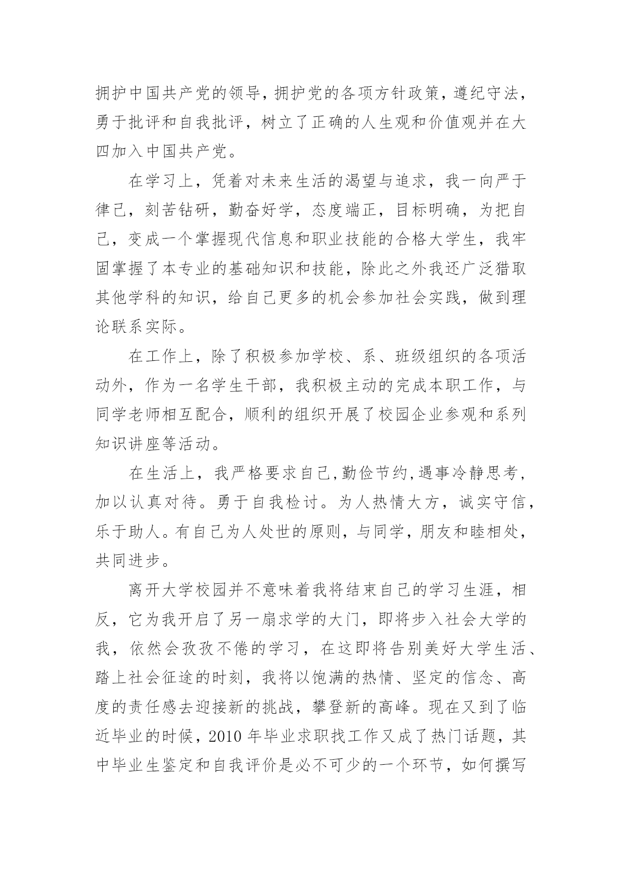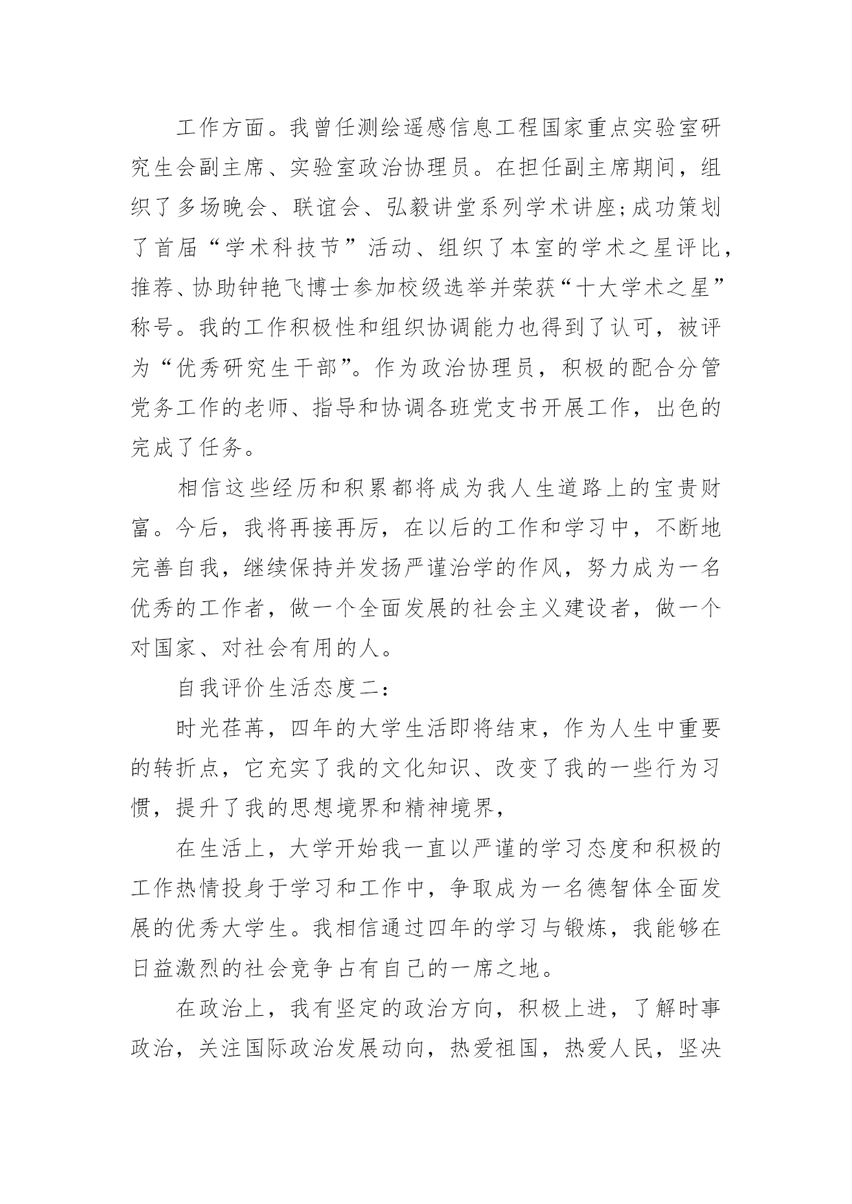 自我评价生活态度自我评价生活态度一:光阴似箭,日月如梭,四年的大学时光和两年半的研究生学习生活转眼就要成为过去,十多年寒窗苦读的生活将随着研究生生活的结束而暂时告一段落。回首那些拼搏的历程,酸甜苦辣,成败得失一齐袭来,使我不得不静坐下来,用足够的时间整理自己这些年学习生活中的得与失。学业方面。我的研究方向为虚拟现实和仿真技术,主要研究兴趣为三维模型的简化与网络传输。学术思想活跃、学习目的明确,态度端正、学风良好,勤奋学习,刻苦钻研,成绩优秀。在所选的研究生课程中,成绩全部为优良;在国际会议发表了学术论文两篇;在导师的指导下,参与了两个科研项目并在项目中独立负责一个模块,使自己的理论知识与实践水平得到了进一步的增强和提高。思想方面。我认真学习马克思列宁主义、“三个代表”重要思想;关心时事政治,关心学校的改革与发展;拥护党的路线、方针和政策,能认真执行学校、实验室的决议;尊敬导师、团结同学、乐于助人、勇于奉献,具有良好的道德品质和思想修养;能遵守国家法律、法令和学校各项规章制度。作为一名中共党员和一名学生干部,我始终努力学习、积极工作,在自己进步的同时还不忘帮助别人进步,先后担任了几位同志的入党介绍人、充分发挥党员学生干部的模范带头作用。工作方面。我曾任测绘遥感信息工程国家重点实验室研究生会副主席、实验室政治协理员。在担任副主席期间,组织了多场晚会、联谊会、弘毅讲堂系列学术讲座;成功策划了首届“学术科技节”活动、组织了本室的学术之星评比,推荐、协助钟艳飞博士参加校级选举并荣获“十大学术之星”称号。我的工作积极性和组织协调能力也得到了认可,被评为“优秀研究生干部”。作为政治协理员,积极的配合分管党务工作的老师、指导和协调各班党支书开展工作,出色的完成了任务。相信这些经历和积累都将成为我人生道路上的宝贵财富。今后,我将再接再厉,在以后的工作和学习中,不断地完善自我,继续保持并发扬严谨治学的作风,努力成为一名优秀的工作者,做一个全面发展的社会主义建设者,做一个对国家、对社会有用的人。自我评价生活态度二:时光荏苒,四年的大学生活即将结束,作为人生中重要的转折点,它充实了我的文化知识、改变了我的一些行为习惯,提升了我的思想境界和精神境界,在生活上,大学开始我一直以严谨的学习态度和积极的工作热情投身于学习和工作中,争取成为一名德智体全面发展的优秀大学生。我相信通过四年的学习与锻炼,我能够在日益激烈的社会竞争占有自己的一席之地。在政治上,我有坚定的政治方向,积极上进,了解时事政治,关注国际政治发展动向,热爱祖国,热爱人民,坚决拥护中国共产党的领导,拥护党的各项方针政策,遵纪守法,勇于批评和自我批评,树立了正确的人生观和价值观并在大四加入中国共产党。在学习上,凭着对未来生活的渴望与追求,我一向严于律己,刻苦钻研,勤奋好学,态度端正,目标明确,为把自己,变成一个掌握现代信息和职业技能的合格大学生,我牢固掌握了本专业的基础知识和技能,除此之外我还广泛猎取其他学科的知识,给自己更多的机会参加社会实践,做到理论联系实际。在工作上,除了积极参加学校、系、班级组织的各项活动外,作为一名学生干部,我积极主动的完成本职工作,与同学老师相互配合,顺利的组织开展了校园企业参观和系列知识讲座等活动。在生活上,我严格要求自己,勤俭节约,遇事冷静思考,加以认真对待。勇于自我检讨。为人热情大方,诚实守信,乐于助人。有自己为人处世的原则,与同学,朋友和睦相处,共同进步。离开大学校园并不意味着我将结束自己的学习生涯,相反,它为我开启了另一扇求学的大门,即将步入社会大学的我,依然会孜孜不倦的学习,在这即将告别美好大学生活、踏上社会征途的时刻,我将以饱满的热情、坚定的信念、高度的责任感去迎接新的挑战,攀登新的高峰。现在又到了临近毕业的时候,2010年毕业求职找工作又成了热门话题,其中毕业生鉴定和自我评价是必不可少的一个环节,如何撰写毕业鉴定和自我评价呢?我们选择了不同学历的本科生、研究生、技校生、大学生毕业自我鉴定四篇供君参考,以飨各位简历客,