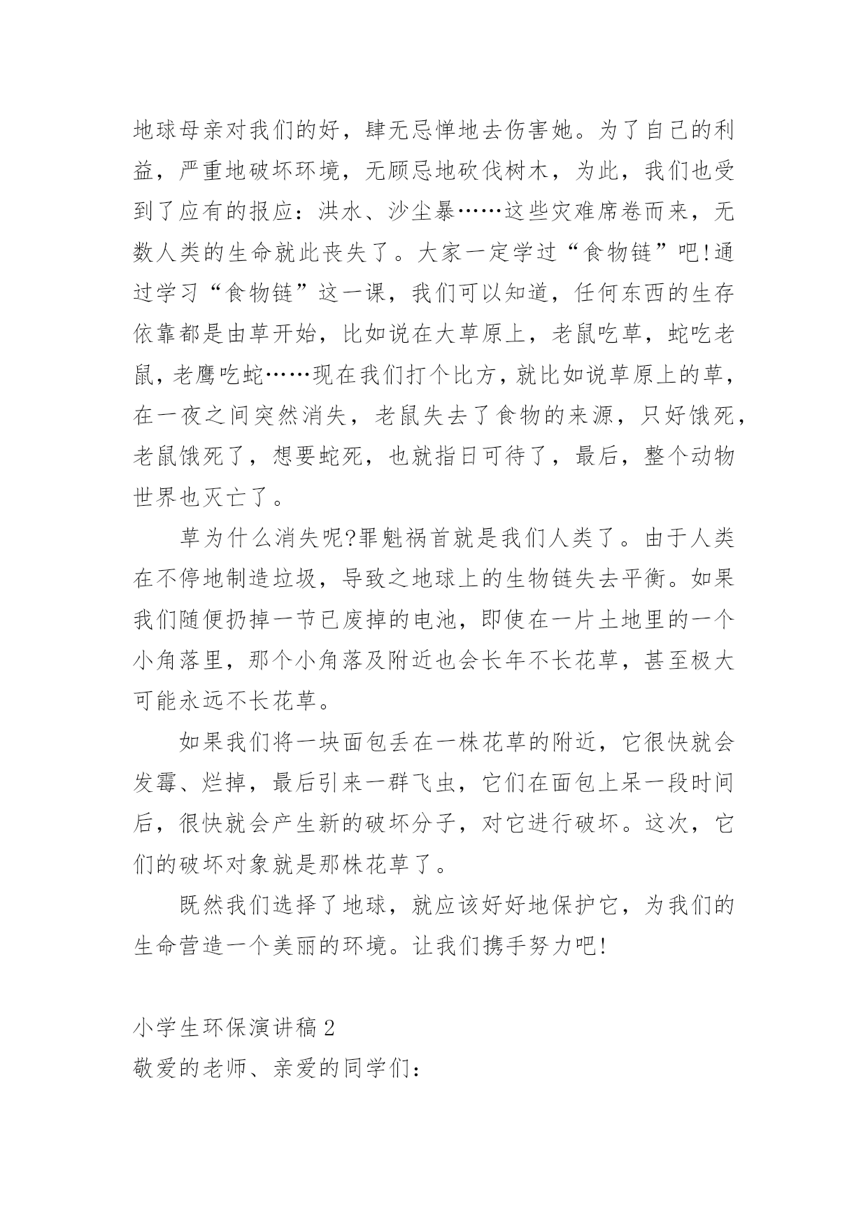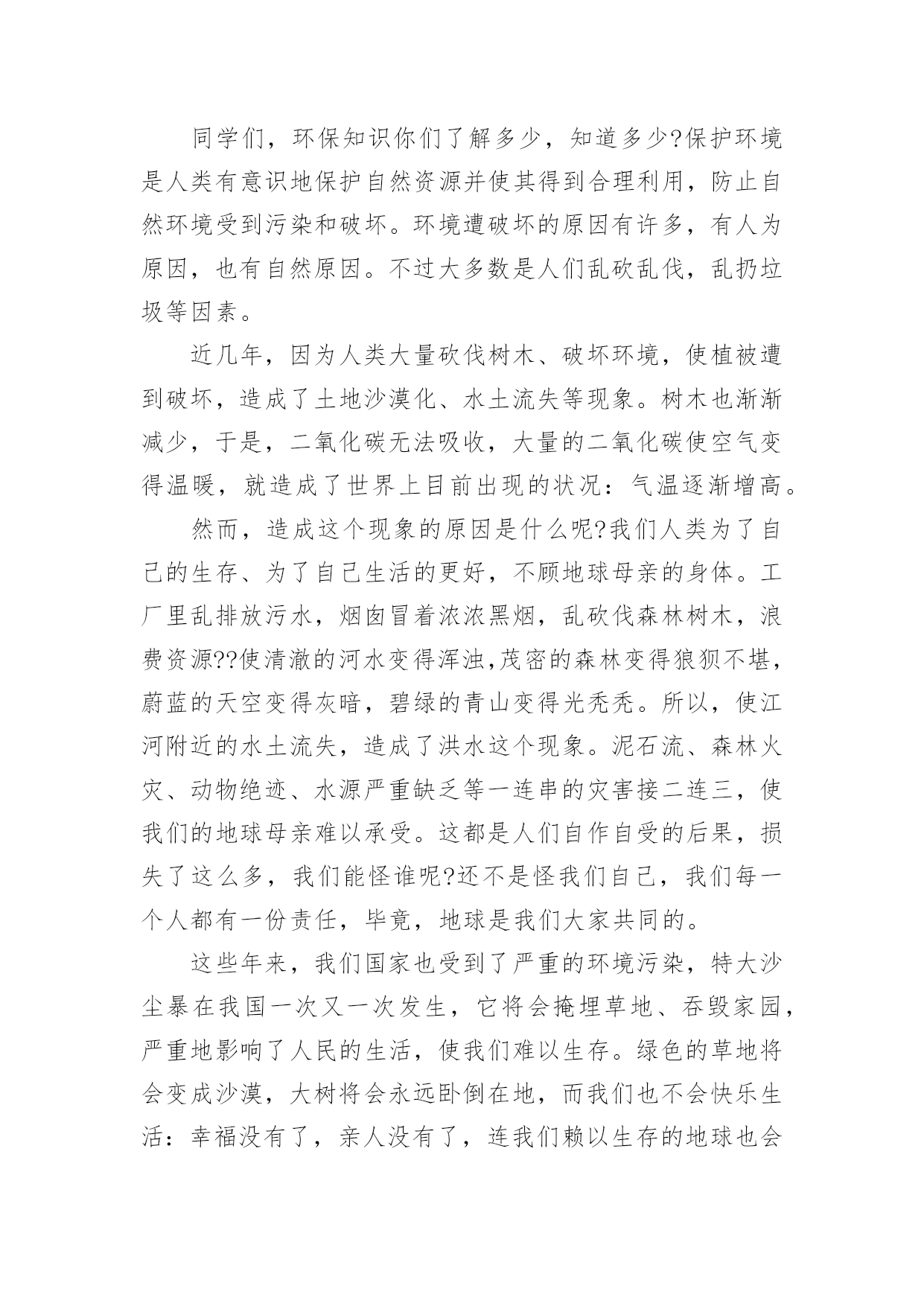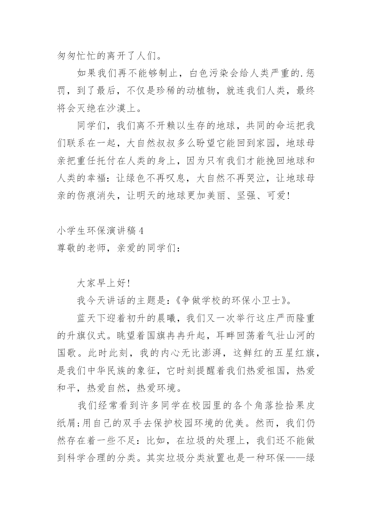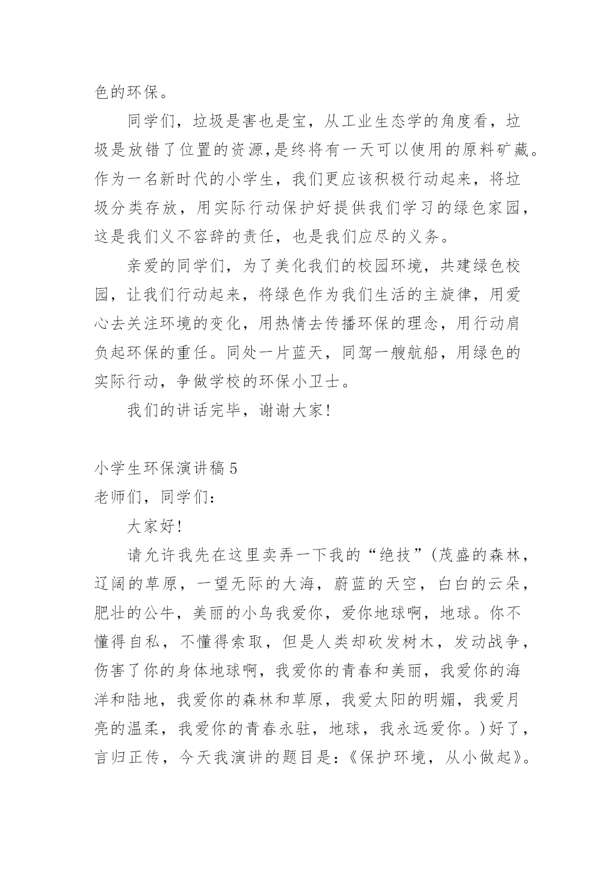 小学生环保演讲稿演讲稿可以按照用途、性质等来划分,是演讲上一个重要的准备工作。在不断进步的社会中,我们都可能会用到演讲稿,相信写演讲稿是一个让许多人都头痛的问题,下面是小编为大家收集的小学生环保演讲稿,仅供参考,希望能够帮助到大家。小学生环保演讲稿1尊敬的老师,亲爱的同学们:大家好!今天我演讲的题目是《环保与生命,紧紧相连》。浩瀚美丽的宇宙中,一颗新星的诞生让新的生命有了一个归宿。绿油油的草原,幽静的丛林,湛蓝的海洋……都是如此的美丽,那就是我们居住的地方——地球。地球居住着的人们,有着不同的种族,不同的样子,不同的交流方式,但相同的就是我们都是地球的儿女,都一脉相连,心心相映。早在数亿年前,恐龙出现在这块肥沃的土地上,呼吸着新鲜的空气;数万年前,恐龙灭绝了,又出现了新的动植物,轮到它们吸允新鲜的空气了;数千年前,我么的祖先出现了,他们以各种方式来生存,他们用自己的方法来保护美丽的大自然,大自然变得更加生气勃勃。从远古时代到了经济发展速度极快的现代。人们遗忘了地球母亲对我们的好,肆无忌惮地去伤害她。为了自己的利益,严重地破坏环境,无顾忌地砍伐树木,为此,我们也受到了应有的报应:洪水、沙尘暴……这些灾难席卷而来,无数人类的生命就此丧失了。大家一定学过“食物链”吧!通过学习“食物链”这一课,我们可以知道,任何东西的生存依靠都是由草开始,比如说在大草原上,老鼠吃草,蛇吃老鼠,老鹰吃蛇……现在我们打个比方,就比如说草原上的草,在一夜之间突然消失,老鼠失去了食物的来源,只好饿死,老鼠饿死了,想要蛇死,也就指日可待了,最后,整个动物世界也灭亡了。草为什么消失呢?罪魁祸首就是我们人类了。由于人类在不停地制造垃圾,导致之地球上的生物链失去平衡。如果我们随便扔掉一节已废掉的电池,即使在一片土地里的一个小角落里,那个小角落及附近也会长年不长花草,甚至极大可能永远不长花草。如果我们将一块面包丢在一株花草的附近,它很快就会发霉、烂掉,最后引来一群飞虫,它们在面包上呆一段时间后,很快就会产生新的破坏分子,对它进行破坏。这次,它们的破坏对象就是那株花草了。既然我们选择了地球,就应该好好地保护它,为我们的生命营造一个美丽的环境。让我们携手努力吧!小学生环保演讲稿2敬爱的老师、亲爱的同学们:大家好!今天我演讲的题目是《xxxxx》。当我们从繁忙的的学习中抽身投入到大自然的怀抱,才蓦然发现我们的大自然母亲已经变得沧桑,失去了昔日的美丼与光彩------群山不再那么葱郁了,溪水不再那么清澈了,鸟儿的歌声也渐渐单调了,连我们美丼的校园也不再那么洁净了。我们经常看到一些同学在校园里的各个角落捡拾果皮纸屑;用自己的双手去保护校园环境的优美。但是,我们仍然存在着很多不足:仍然有人乱丢纸屑、食品袋废弃物;仍然有人在草坪上肆意践踏;仍然有人在雪白的墙壁上乱涂乱画、在课桌上乱刻乱画;在学校的绿化带中,不时发现有深深的脚印、有的地方甚至走成了小道。看到这些作为一个受到高等教育的你的感受是怎样的?在这样的校园环境里学习能使你身心快乐吗?每当看到这样的情景,我们的心情总是非常的沉重,悄悄的拾起垃圾,但是,一个人拾,十个人丢,我们能拾得起吗?当你见到废纸、食品袋、废弃物,你弯弯腰就可以做件好事了。当你要丢垃圾的时候,你应该想到,你这么随意的一丢,是不是符合一个大学生应有的素质呢?我们既然是校园的主人,就应当树立起我们的责任,坚守我们的岗位,着眼身边,立足校园,从我做起,从小事做起,从现在做起,从爱护我们的校园环境做起:一片纸,我们捡起;一滴水,我们节约;一堆垃圾,我们打扫;一朵花,我们珍惜;一棵草,我们爱护。我们要用自己的实际行动保护环境,培养绿色校园意识,让绿色生命激发我们热爱生活,热爱学习。让我们携起手来,共同营造文明、整洁、优雅的校园环境吧!让我们在校园这片圣洁的天空、心灵的净土中放飞希望!那么美丼的校园一定会因我们的文明而春风长驻,锦上添花。小学生环保演讲稿3同学们,两年前,我们学校提出“师生与学校共同成长”的目标,回顾过去的两年,目睹学校环境的变化,看到我们的同学的点滴进步,我们全校师生应该倍感骄傲和自豪。特别是伴随我们学校走过了两个多年头的老师和初三、高三级的同学,相信大家会有更深的感触。还记得你们到学校注册时学校的样子吗?你还记得为了让大家活动,我们把篮球架放在校道上吗?你还记得那只见建筑废土不见一棵树的校园吗?两年过去了,如今的校容校貌已非昨日,昔日杂草丛生的荒地已经变成了现在师生们活动的四个篮球场;两年前光秃秃的校道两旁的绿化带树木正在茁壮成长;坑坑洼洼的单车场已经铺上了青红相间的地砖;礼堂与教学楼间的黄土地如今是令人心情舒畅的草坪,成为我们同学休闲的好去处;教学楼上的红色大标示着学校的校训和文化依托。今天,当我们走进校园,花香鸟语,绿意盎然,树木虽小,已形成了