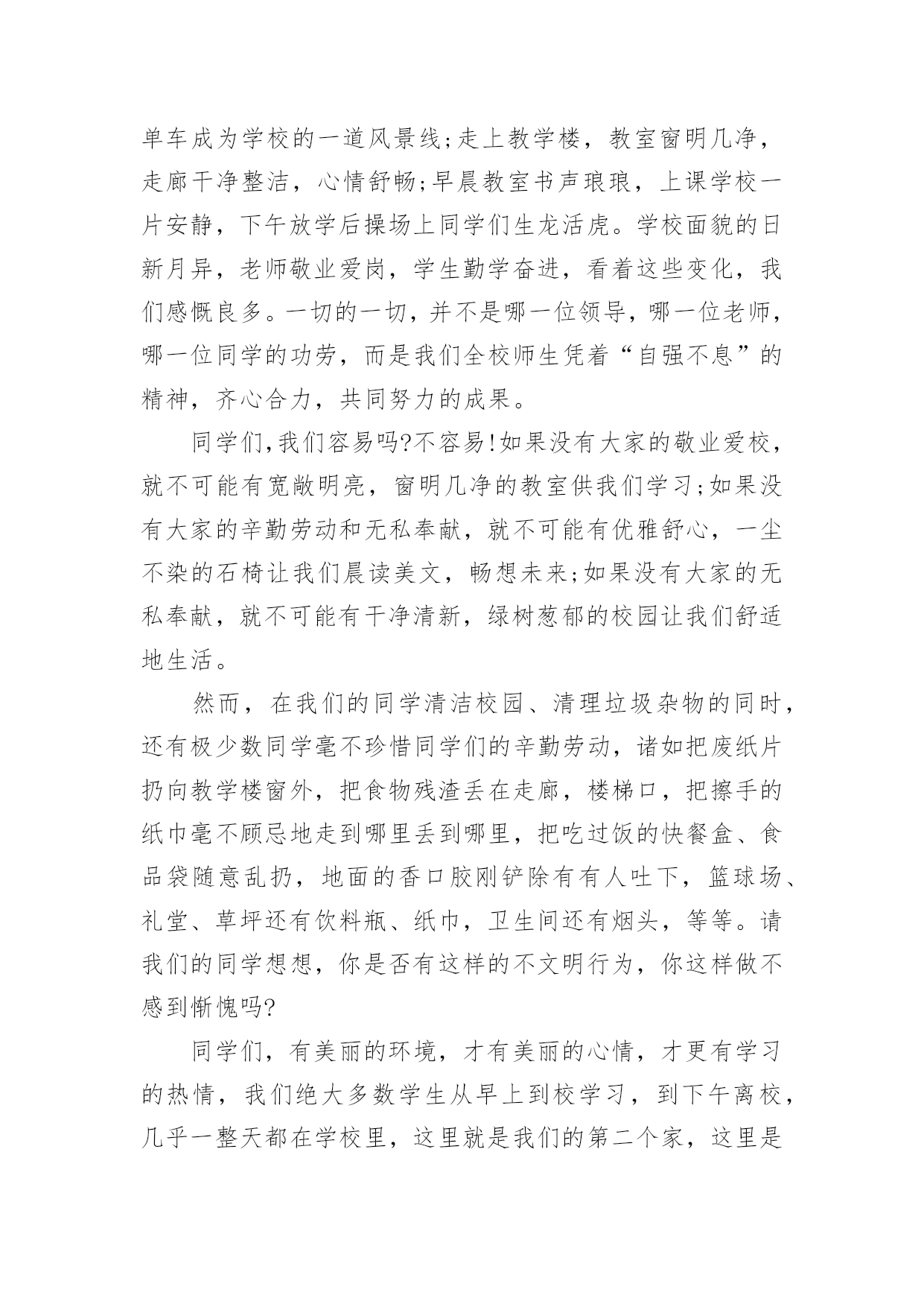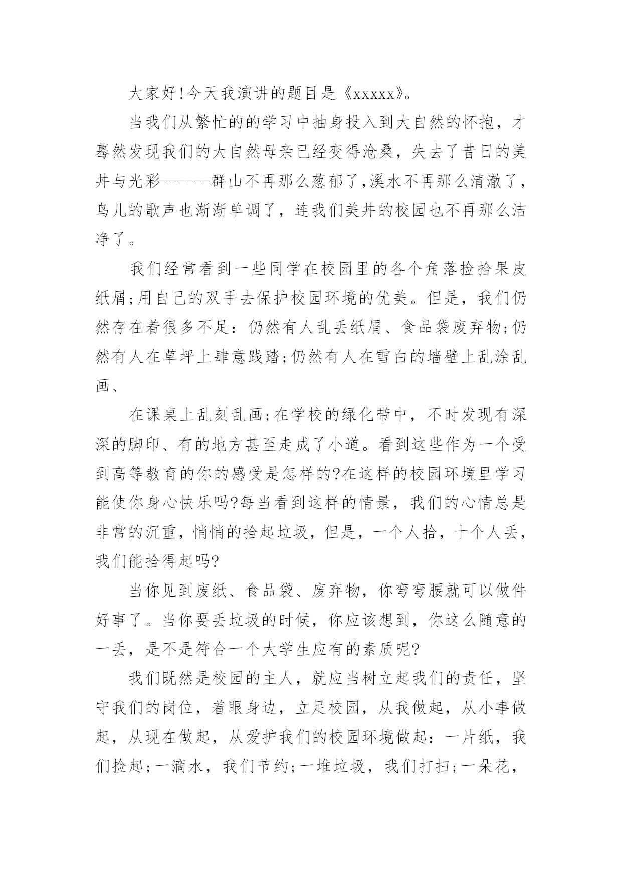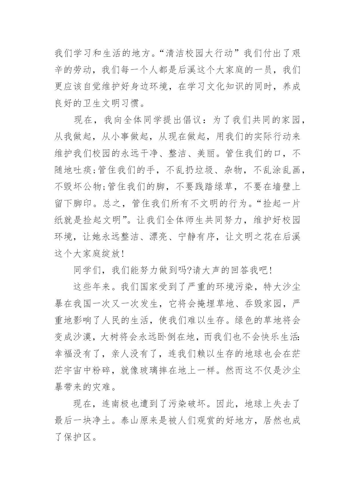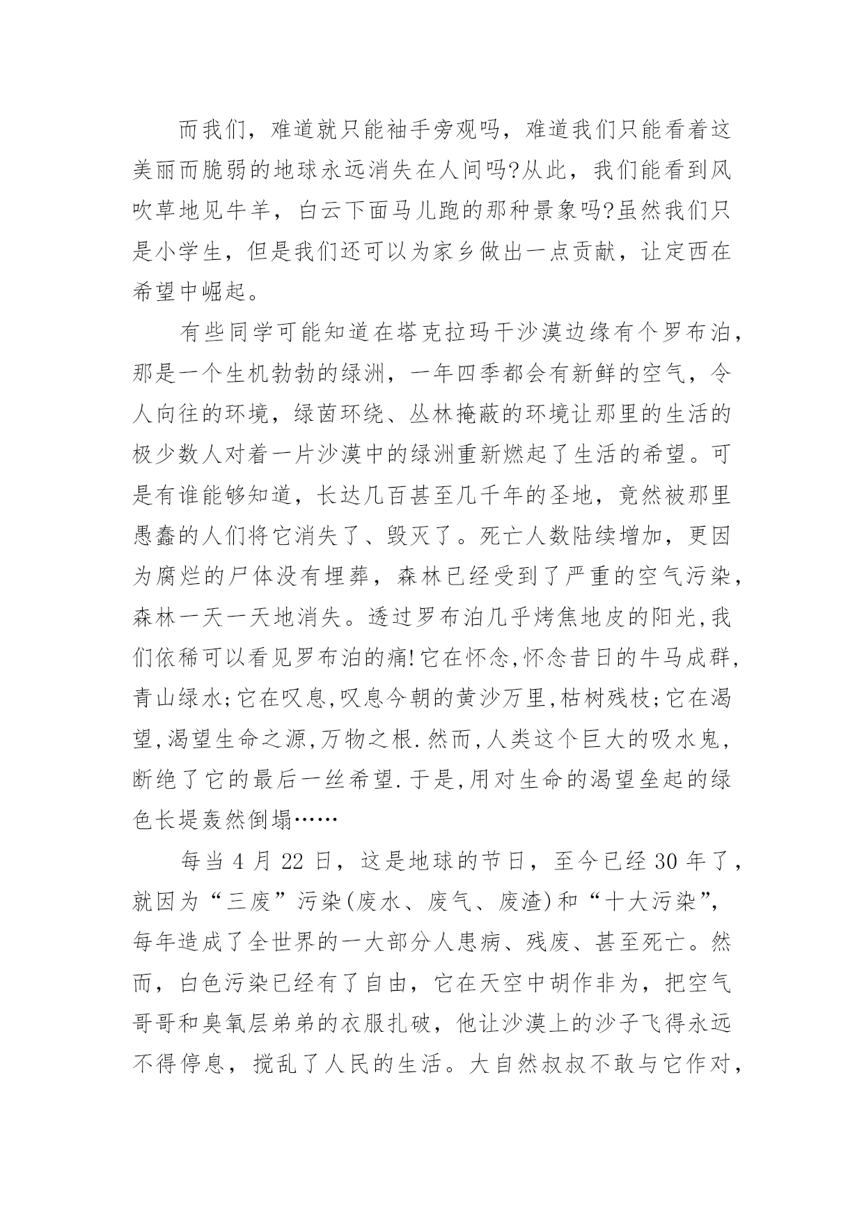 小学生环保演讲稿演讲稿可以按照用途、性质等来划分,是演讲上一个重要的准备工作。在不断进步的社会中,我们都可能会用到演讲稿,相信写演讲稿是一个让许多人都头痛的问题,下面是小编为大家收集的小学生环保演讲稿,仅供参考,希望能够帮助到大家。小学生环保演讲稿1尊敬的老师,亲爱的同学们:大家好!今天我演讲的题目是《环保与生命,紧紧相连》。浩瀚美丽的宇宙中,一颗新星的诞生让新的生命有了一个归宿。绿油油的草原,幽静的丛林,湛蓝的海洋……都是如此的美丽,那就是我们居住的地方——地球。地球居住着的人们,有着不同的种族,不同的样子,不同的交流方式,但相同的就是我们都是地球的儿女,都一脉相连,心心相映。早在数亿年前,恐龙出现在这块肥沃的土地上,呼吸着新鲜的空气;数万年前,恐龙灭绝了,又出现了新的动植物,轮到它们吸允新鲜的空气了;数千年前,我么的祖先出现了,他们以各种方式来生存,他们用自己的方法来保护美丽的大自然,大自然变得更加生气勃勃。从远古时代到了经济发展速度极快的现代。人们遗忘了地球母亲对我们的好,肆无忌惮地去伤害她。为了自己的利益,严重地破坏环境,无顾忌地砍伐树木,为此,我们也受到了应有的报应:洪水、沙尘暴……这些灾难席卷而来,无数人类的生命就此丧失了。大家一定学过“食物链”吧!通过学习“食物链”这一课,我们可以知道,任何东西的生存依靠都是由草开始,比如说在大草原上,老鼠吃草,蛇吃老鼠,老鹰吃蛇……现在我们打个比方,就比如说草原上的草,在一夜之间突然消失,老鼠失去了食物的来源,只好饿死,老鼠饿死了,想要蛇死,也就指日可待了,最后,整个动物世界也灭亡了。草为什么消失呢?罪魁祸首就是我们人类了。由于人类在不停地制造垃圾,导致之地球上的生物链失去平衡。如果我们随便扔掉一节已废掉的电池,即使在一片土地里的一个小角落里,那个小角落及附近也会长年不长花草,甚至极大可能永远不长花草。如果我们将一块面包丢在一株花草的附近,它很快就会发霉、烂掉,最后引来一群飞虫,它们在面包上呆一段时间后,很快就会产生新的破坏分子,对它进行破坏。这次,它们的破坏对象就是那株花草了。既然我们选择了地球,就应该好好地保护它,为我们的生命营造一个美丽的环境。让我们携手努力吧!小学生环保演讲稿2敬爱的老师、亲爱的同学们:大家好!今天我演讲的题目是《xxxxx》。当我们从繁忙的的学习中抽身投入到大自然的怀抱,才蓦然发现我们的大自然母亲已经变得沧桑,失去了昔日的美丼与光彩------群山不再那么葱郁了,溪水不再那么清澈了,鸟儿的歌声也渐渐单调了,连我们美丼的校园也不再那么洁净了。我们经常看到一些同学在校园里的各个角落捡拾果皮纸屑;用自己的双手去保护校园环境的优美。但是,我们仍然存在着很多不足:仍然有人乱丢纸屑、食品袋废弃物;仍然有人在草坪上肆意践踏;仍然有人在雪白的墙壁上乱涂乱画、在课桌上乱刻乱画;在学校的绿化带中,不时发现有深深的脚印、有的地方甚至走成了小道。看到这些作为一个受到高等教育的你的感受是怎样的?在这样的校园环境里学习能使你身心快乐吗?每当看到这样的情景,我们的心情总是非常的沉重,悄悄的拾起垃圾,但是,一个人拾,十个人丢,我们能拾得起吗?当你见到废纸、食品袋、废弃物,你弯弯腰就可以做件好事了。当你要丢垃圾的时候,你应该想到,你这么随意的一丢,是不是符合一个大学生应有的素质呢?我们既然是校园的主人,就应当树立起我们的责任,坚守我们的岗位,着眼身边,立足校园,从我做起,从小事做起,从现在做起,从爱护我们的校园环境做起:一片纸,我们捡起;一滴水,我们节约;一堆垃圾,我们打扫;一朵花,我们珍惜;一棵草,我们爱护。我们要用自己的实际行动保护环境,培养绿色校园意识,让绿色生命激发我们热爱生活,热爱学习。让我们携起手来,共同营造文明、整洁、优雅的校园环境吧!让我们在校园这片圣洁的天空、心灵的净土中放飞希望!那么美丼的校园一定会因我们的文明而春风长驻,锦上添花。小学生环保演讲稿3同学们,两年前,我们学校提出“师生与学校共同成长”的目标,回顾过去的两年,目睹学校环境的变化,看到我们的同学的点滴进步,我们全校师生应该倍感骄傲和自豪。特别是伴随我们学校走过了两个多年头的老师和初三、高三级的同学,相信大家会有更深的感触。还记得你们到学校注册时学校的样子吗?你还记得为了让大家活动,我们把篮球架放在校道上吗?你还记得那只见建筑废土不见一棵树的校园吗?两年过去了,如今的校容校貌已非昨日,昔日杂草丛生的荒地已经变成了现在师生们活动的四个篮球场;两年前光秃秃的校道两旁的绿化带树木正在茁壮成长;坑坑洼洼的单车场已经铺上了青红相间的地砖;礼堂与教学楼间的黄土地如今是令人心情舒畅的草坪,成为我们同学休闲的好去处;教学楼上的红色大标示着学校的校训和文化依托。今天,当我们走进校园,花香鸟语,绿意盎然,树木虽小,已形成了