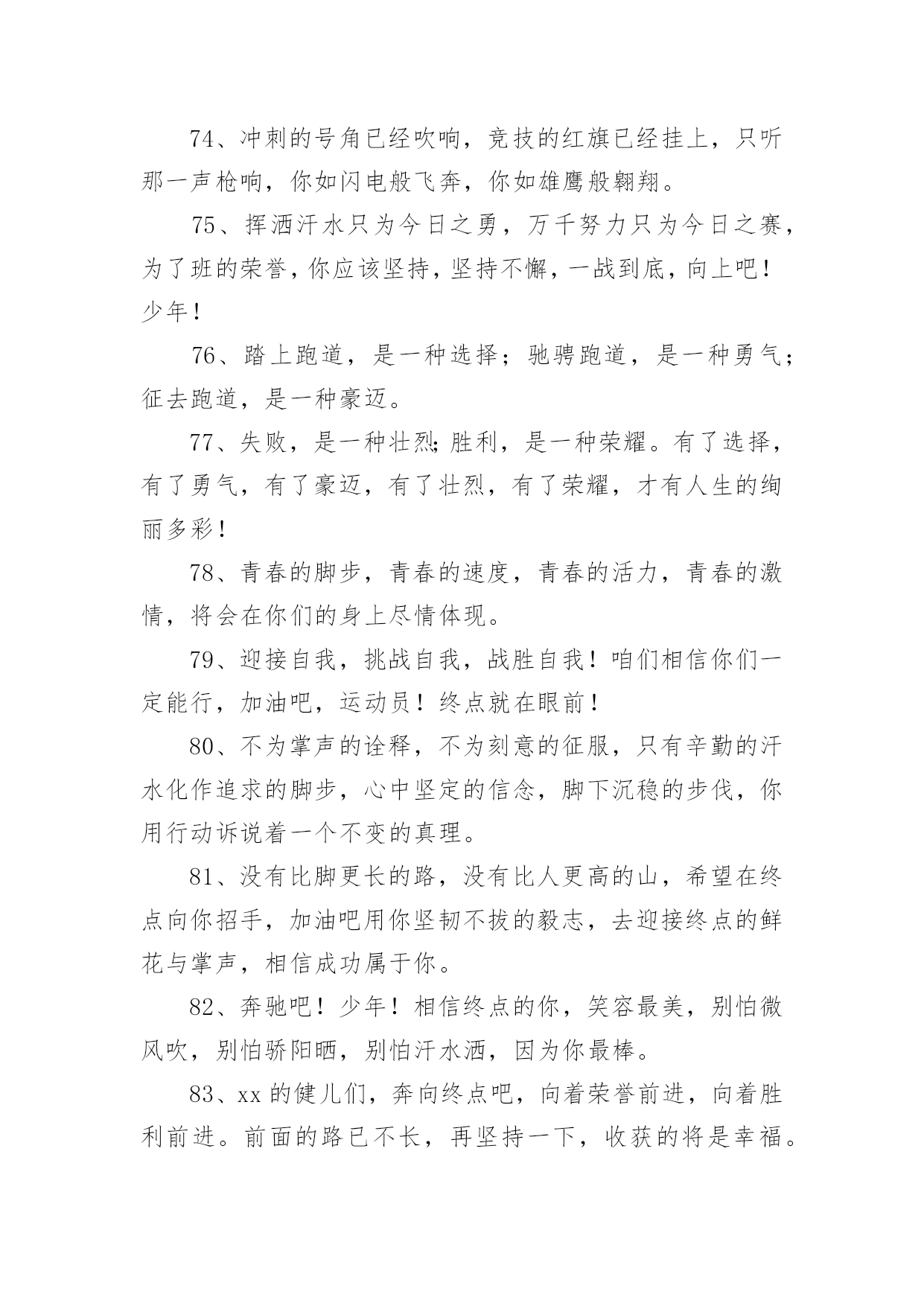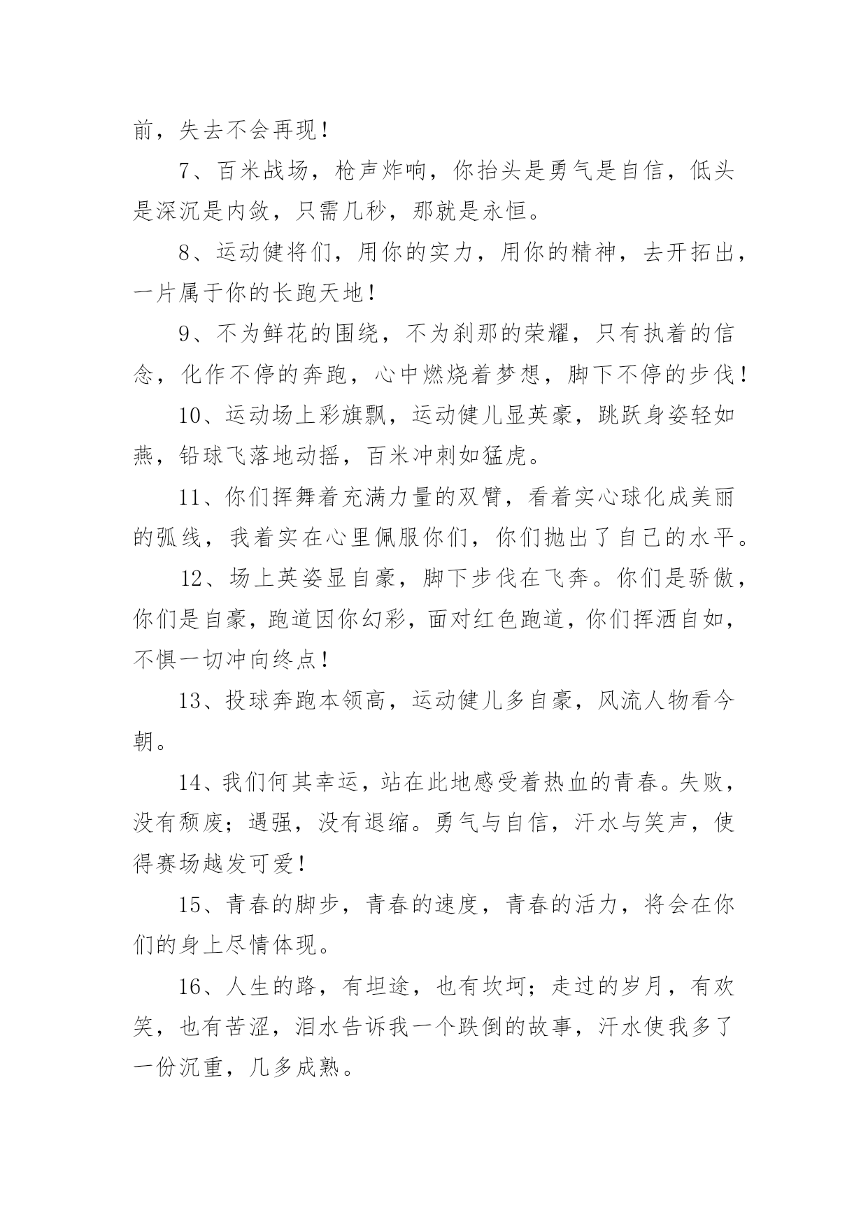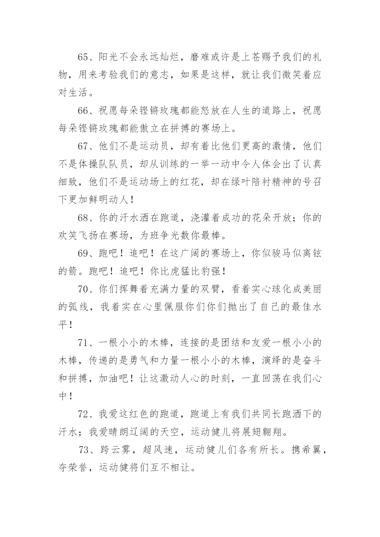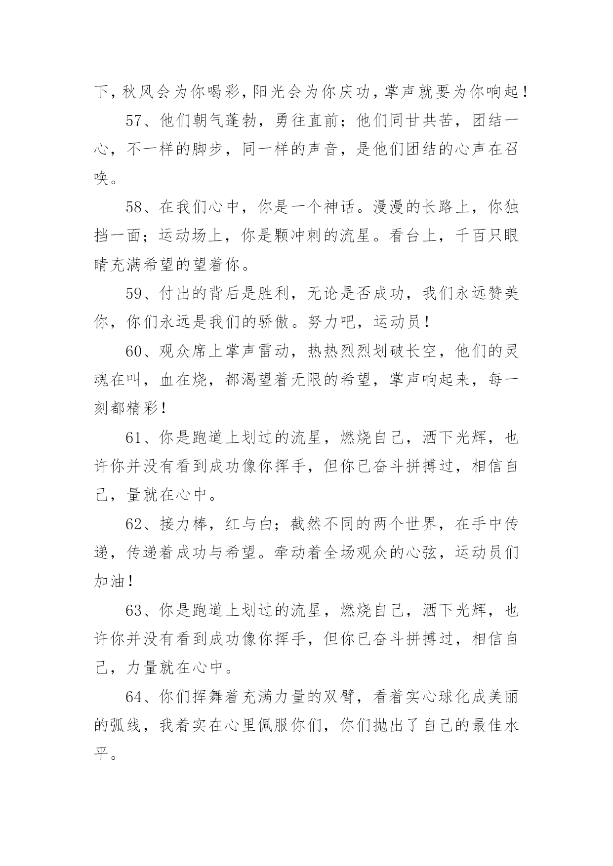 运动会广播稿短句运动会广播稿短句一、什么是广播稿广播稿就是为了广播需要而准备的草稿,通过无线电波或导线传送声音。广播稿的特点为口语化,内容生动,结构简洁、主题集中。二、运动会广播稿短句(精选120句)有在广播站锻炼的学生,大家广播前都会提前做好广播稿,广播稿写得优秀才会有更好的节目效果,那么大家知道正规的广播稿怎么写吗?下面是小编收集整理的运动会广播稿短句(精选120句),仅供参考,欢迎大家阅读。1、时间在流逝,赛道在延伸,成功在你面前展现心脏的跳动,热血在沸腾,辉煌在你脚下铸就加油吧,健儿们。2、虽然你们在场上的时间很短暂,但你们的身影依然停留在人们的脑海里,因为你们是赛场上最可爱的人!3、不为掌声的注释不为刻意的征服不为失败的痛苦只有辛勤的汗水化作成功的脚步。4、枪声响起,冲刺向前,一马当先,咫尺天涯,永恒之巅,冲吧,向着未来冲刺,向着胜利冲刺。5、这是意志的拼搏,这是速度的挑战,胜利在向你们招手,胜利在向你们呼唤!6、努力吧!加油啊!时间短暂并不代表你活力短暂,距离不长却表示你成功不远,相信自己,冲啊!胜利就在眼前,失去不会再现!7、百米战场,枪声炸响,你抬头是勇气是自信,低头是深沉是内敛,只需几秒,那就是永恒。8、运动健将们,用你的实力,用你的精神,去开拓出,一片属于你的长跑天地!9、不为鲜花的围绕,不为刹那的荣耀,只有执着的信念,化作不停的奔跑,心中燃烧着梦想,脚下不停的步伐!10、运动场上彩旗飘,运动健儿显英豪,跳跃身姿轻如燕,铅球飞落地动摇,百米冲刺如猛虎。11、你们挥舞着充满力量的双臂,看着实心球化成美丽的弧线,我着实在心里佩服你们,你们抛出了自己的水平。12、场上英姿显自豪,脚下步伐在飞奔。你们是骄傲,你们是自豪,跑道因你幻彩,面对红色跑道,你们挥洒自如,不惧一切冲向终点!13、投球奔跑本领高,运动健儿多自豪,风流人物看今朝。14、我们何其幸运,站在此地感受着热血的青春。失败,没有颓废;遇强,没有退缩。勇气与自信,汗水与笑声,使得赛场越发可爱!15、青春的脚步,青春的速度,青春的活力,将会在你们的身上尽情体现。16、人生的路,有坦途,也有坎坷;走过的岁月,有欢笑,也有苦涩,泪水告诉我一个跌倒的故事,汗水使我多了一份沉重,几多成熟。17、夸夫迫日惊华夏,平步青云塔黄沙。毓文男儿集力聚,气贯神州傲中华。百米跑道虽不长,运动健儿志气高,摩拳擦掌跃欲试。18、没有获得荣誉的喜悦,我仍一脸灿烂的微笑,因为这样的天气,这样好的憧憬。19、啊!冠军,又是冠军,不要给其他学院任何机会,伟大的运动员加油!20、青春的学校是你活力的舞台,加油吧,亲爱的同学,胜利就在你前方。胜利是用汗水换来的,唯有拼搏才是赢的终点。21、时间在流逝,赛道在延伸,成功在你面前展现。心脏在跳动,热血在沸腾,辉煌在你脚下铸就。加油吧,健儿们!22、在竞技场上,你付出汗水,释放光芒;辛勤耕耘,收获成果;为别人喝彩,以努力拼搏激励自我,感动他人。23、时间在流逝,赛道在延伸,成功在你面前展现,心脏在跳动,热血在沸腾,辉煌在你脚下铸就。加油吧,健儿们!24、冬季运动场上,看,终点就在眼前;听,同学为你呼喊。鼓起勇气奋力向前,用你的荣誉带给我们期望。25、虽然你们在场上的时间很短暂,但你们的身影依然停留在人们的脑海里,因为你们是赛场上最可爱的人!26、不为掌声的注释,不为刻意的征服,不为失败的痛苦,仅有辛勤的汗水化作成功的脚步。27、你们挥舞着充满力量的双臂,看着实心球化成美丽的身影,我着实在心里佩服你们,你们抛出了自我的水平。28、接力棒带着你摩擦出的火光,暖了我的手。在一瞬间,我们的眼光传递的是永恒,是团结,是友爱。29、时间在流逝,赛道在延伸,成功在你面前展现,心脏在跳动,热血在沸腾,辉煌在你脚下铸就,加油吧,健儿们!30、萧瑟的秋风,挡不住你们破竹的锐气,广阔的绿茵场,是为你们搭建的舞台。张扬吧,年轻的心,我们将为你永远喝彩!31、快去追赶对手,快去夺取胜利!相信你会送给我们一个汗水浸湿的微笑!32、踏上跑道,是一种选择。离开起点,是一种勇气。驰骋赛场,是一种胜利。33、看,终点就在眼前;听,同学为你呼喊。鼓起勇气奋力向前,用你的荣誉带给我们期望。34、参加秋季运动会的运动健将们,用你的实力,用你的精神,去开拓出,一片属于你的长跑天地!35、有多少次挥汗如雨,伤痛曾添满记忆,只因为始终相信,去拼搏才能胜利。总是在鼓舞自己,要成功就得努力。36、赛场上叱咤风光,风云下你们挥汗如雨,看台上呐喊声震天,呐喊中饱含期望,期望成功,期望胜利!37、看,终点就在眼前,听,同学为你呼喊。鼓起勇气奋力向前,用你的`荣誉带给我们期望。38、场上英姿显自豪,脚下步伐在飞奔。你们是骄傲,你们是自豪,跑道因你幻彩,应对红色跑道,你们挥洒自如,不惧一切冲向终点!39、你们挥
