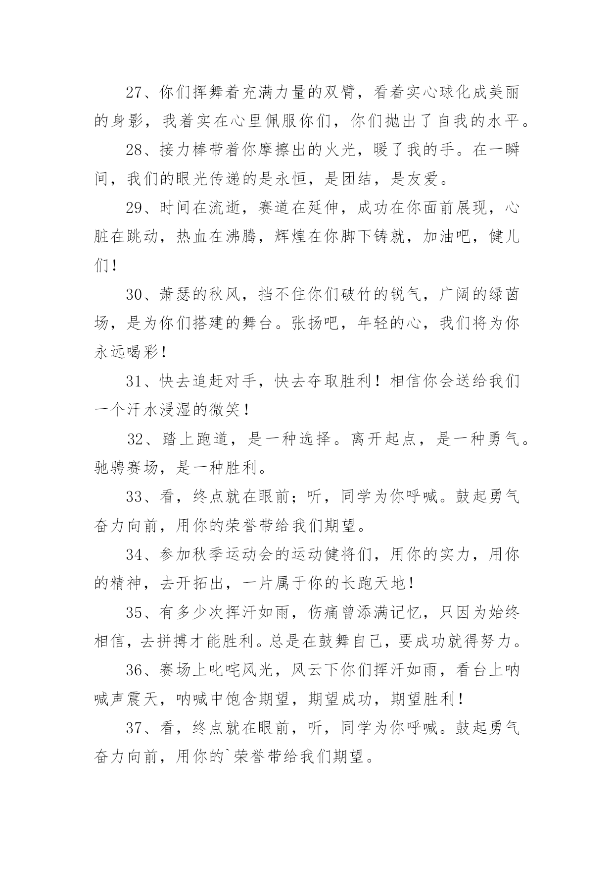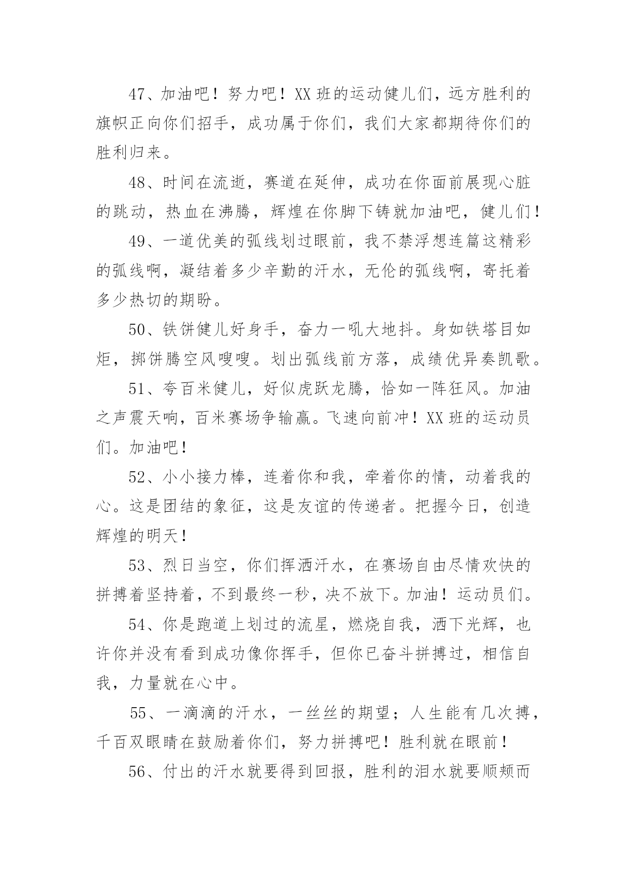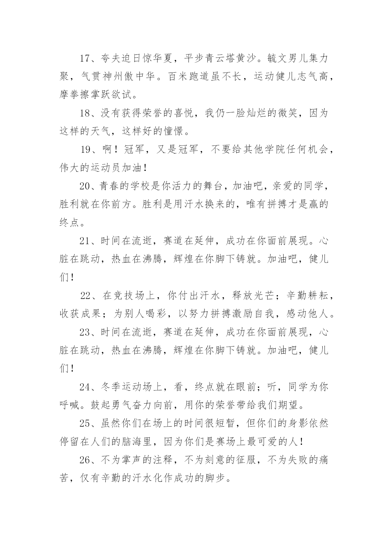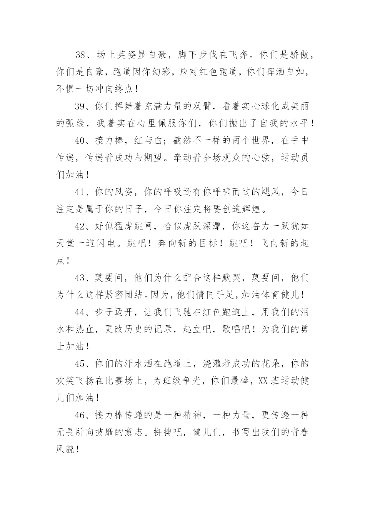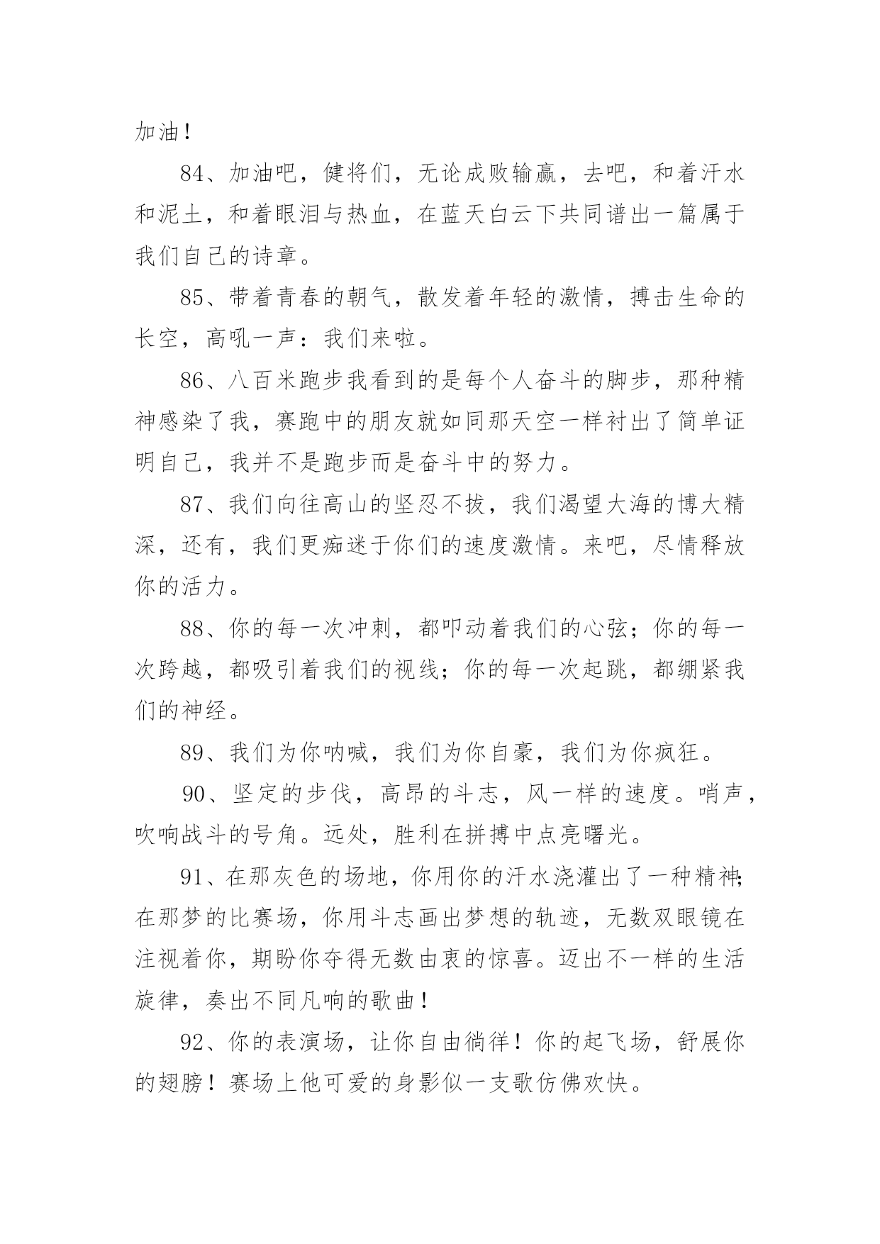 运动会广播稿短句运动会广播稿短句一、什么是广播稿广播稿就是为了广播需要而准备的草稿,通过无线电波或导线传送声音。广播稿的特点为口语化,内容生动,结构简洁、主题集中。二、运动会广播稿短句(精选120句)有在广播站锻炼的学生,大家广播前都会提前做好广播稿,广播稿写得优秀才会有更好的节目效果,那么大家知道正规的广播稿怎么写吗?下面是小编收集整理的运动会广播稿短句(精选120句),仅供参考,欢迎大家阅读。1、时间在流逝,赛道在延伸,成功在你面前展现心脏的跳动,热血在沸腾,辉煌在你脚下铸就加油吧,健儿们。2、虽然你们在场上的时间很短暂,但你们的身影依然停留在人们的脑海里,因为你们是赛场上最可爱的人!3、不为掌声的注释不为刻意的征服不为失败的痛苦只有辛勤的汗水化作成功的脚步。4、枪声响起,冲刺向前,一马当先,咫尺天涯,永恒之巅,冲吧,向着未来冲刺,向着胜利冲刺。5、这是意志的拼搏,这是速度的挑战,胜利在向你们招手,胜利在向你们呼唤!6、努力吧!加油啊!时间短暂并不代表你活力短暂,距离不长却表示你成功不远,相信自己,冲啊!胜利就在眼前,失去不会再现!7、百米战场,枪声炸响,你抬头是勇气是自信,低头是深沉是内敛,只需几秒,那就是永恒。8、运动健将们,用你的实力,用你的精神,去开拓出,一片属于你的长跑天地!9、不为鲜花的围绕,不为刹那的荣耀,只有执着的信念,化作不停的奔跑,心中燃烧着梦想,脚下不停的步伐!10、运动场上彩旗飘,运动健儿显英豪,跳跃身姿轻如燕,铅球飞落地动摇,百米冲刺如猛虎。11、你们挥舞着充满力量的双臂,看着实心球化成美丽的弧线,我着实在心里佩服你们,你们抛出了自己的水平。12、场上英姿显自豪,脚下步伐在飞奔。你们是骄傲,你们是自豪,跑道因你幻彩,面对红色跑道,你们挥洒自如,不惧一切冲向终点!13、投球奔跑本领高,运动健儿多自豪,风流人物看今朝。14、我们何其幸运,站在此地感受着热血的青春。失败,没有颓废;遇强,没有退缩。勇气与自信,汗水与笑声,使得赛场越发可爱!15、青春的脚步,青春的速度,青春的活力,将会在你们的身上尽情体现。16、人生的路,有坦途,也有坎坷;走过的岁月,有欢笑,也有苦涩,泪水告诉我一个跌倒的故事,汗水使我多了一份沉重,几多成熟。17、夸夫迫日惊华夏,平步青云塔黄沙。毓文男儿集力聚,气贯神州傲中华。百米跑道虽不长,运动健儿志气高,摩拳擦掌跃欲试。18、没有获得荣誉的喜悦,我仍一脸灿烂的微笑,因为这样的天气,这样好的憧憬。19、啊!冠军,又是冠军,不要给其他学院任何机会,伟大的运动员加油!20、青春的学校是你活力的舞台,加油吧,亲爱的同学,胜利就在你前方。胜利是用汗水换来的,唯有拼搏才是赢的终点。21、时间在流逝,赛道在延伸,成功在你面前展现。心脏在跳动,热血在沸腾,辉煌在你脚下铸就。加油吧,健儿们!22、在竞技场上,你付出汗水,释放光芒;辛勤耕耘,收获成果;为别人喝彩,以努力拼搏激励自我,感动他人。23、时间在流逝,赛道在延伸,成功在你面前展现,心脏在跳动,热血在沸腾,辉煌在你脚下铸就。加油吧,健儿们!24、冬季运动场上,看,终点就在眼前;听,同学为你呼喊。鼓起勇气奋力向前,用你的荣誉带给我们期望。25、虽然你们在场上的时间很短暂,但你们的身影依然停留在人们的脑海里,因为你们是赛场上最可爱的人!26、不为掌声的注释,不为刻意的征服,不为失败的痛苦,仅有辛勤的汗水化作成功的脚步。27、你们挥舞着充满力量的双臂,看着实心球化成美丽的身影,我着实在心里佩服你们,你们抛出了自我的水平。28、接力棒带着你摩擦出的火光,暖了我的手。在一瞬间,我们的眼光传递的是永恒,是团结,是友爱。29、时间在流逝,赛道在延伸,成功在你面前展现,心脏在跳动,热血在沸腾,辉煌在你脚下铸就,加油吧,健儿们!30、萧瑟的秋风,挡不住你们破竹的锐气,广阔的绿茵场,是为你们搭建的舞台。张扬吧,年轻的心,我们将为你永远喝彩!31、快去追赶对手,快去夺取胜利!相信你会送给我们一个汗水浸湿的微笑!32、踏上跑道,是一种选择。离开起点,是一种勇气。驰骋赛场,是一种胜利。33、看,终点就在眼前;听,同学为你呼喊。鼓起勇气奋力向前,用你的荣誉带给我们期望。34、参加秋季运动会的运动健将们,用你的实力,用你的精神,去开拓出,一片属于你的长跑天地!35、有多少次挥汗如雨,伤痛曾添满记忆,只因为始终相信,去拼搏才能胜利。总是在鼓舞自己,要成功就得努力。36、赛场上叱咤风光,风云下你们挥汗如雨,看台上呐喊声震天,呐喊中饱含期望,期望成功,期望胜利!37、看,终点就在眼前,听,同学为你呼喊。鼓起勇气奋力向前,用你的`荣誉带给我们期望。38、场上英姿显自豪,脚下步伐在飞奔。你们是骄傲,你们是自豪,跑道因你幻彩,应对红色跑道,你们挥洒自如,不惧一切冲向终点!39、你们挥