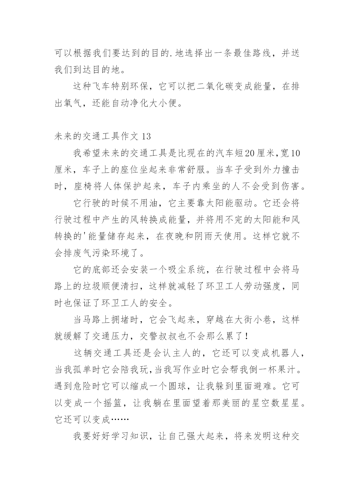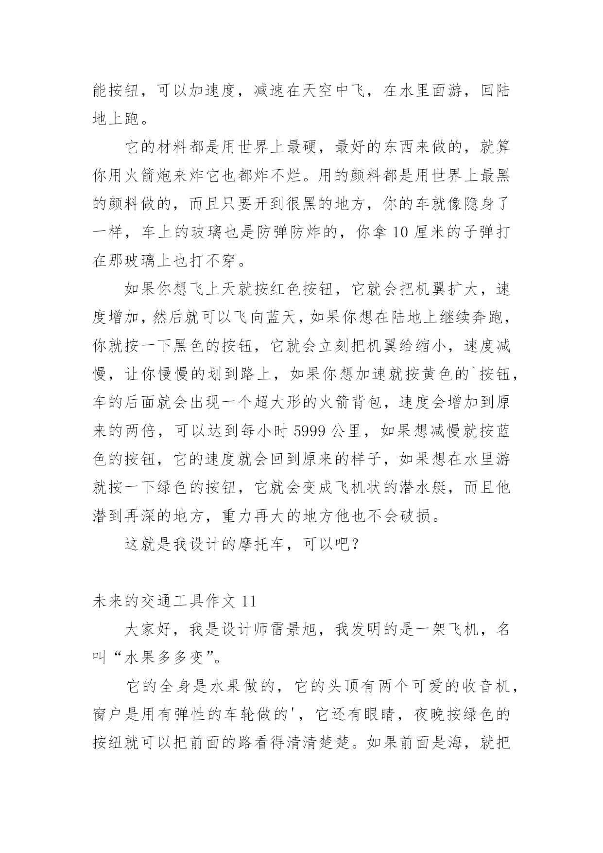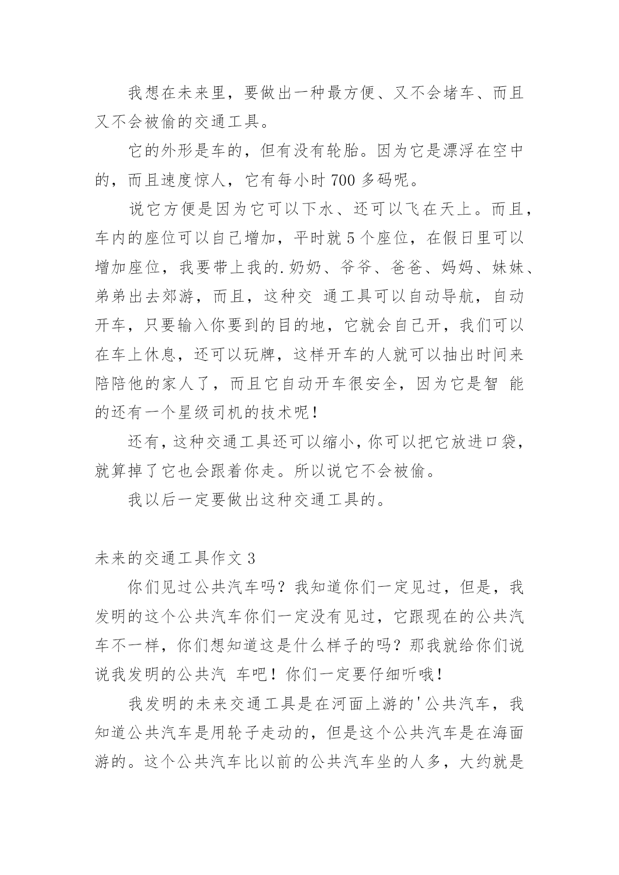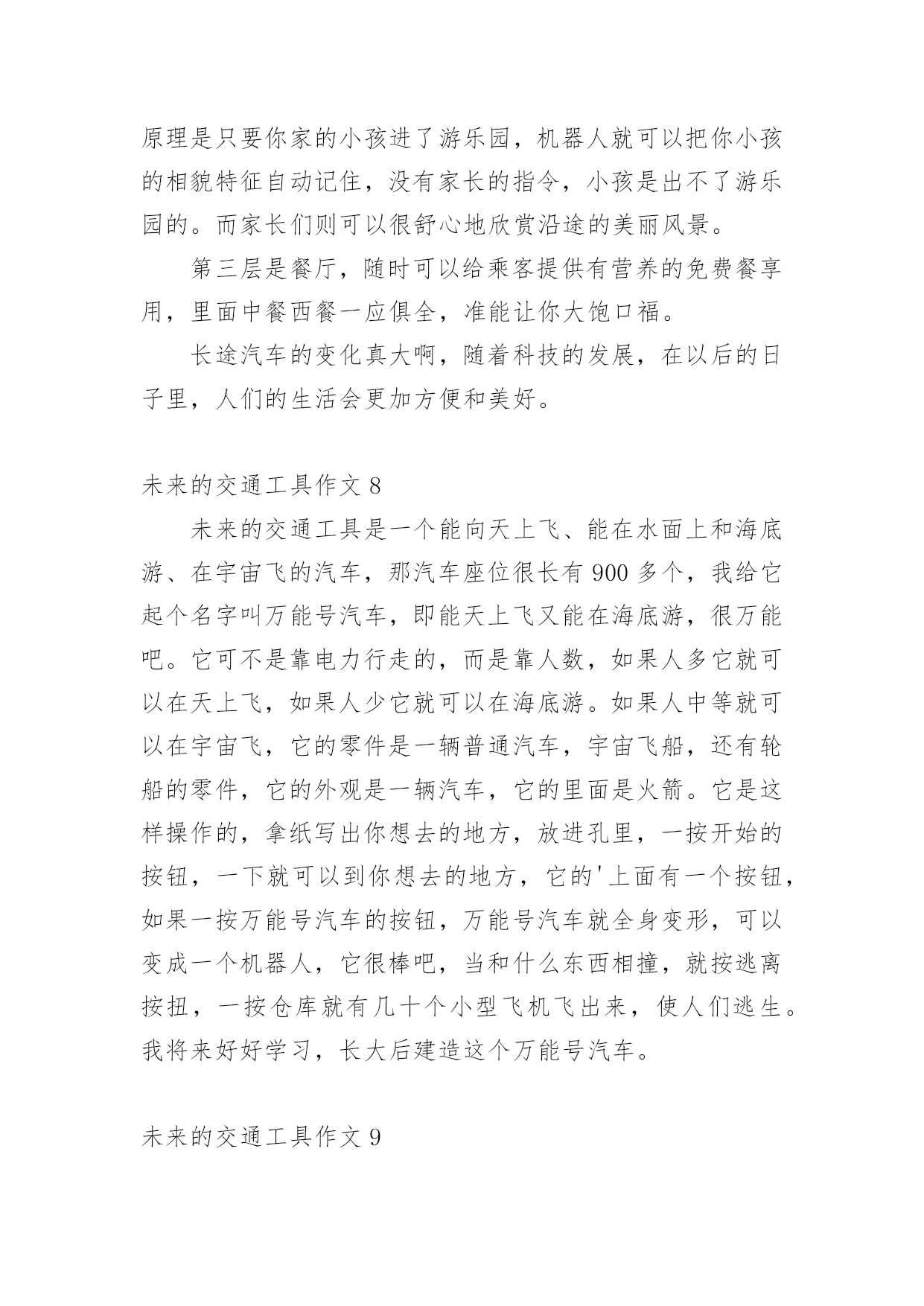 未来的交通工具作文未来的交通工具作文【荐】在生活、工作和学习中,大家都接触过作文吧,作文可分为小学作文、中学作文、大学作文(论文)。你所见过的作文是什么样的呢?以下是小编整理的未来的交通工具作文,仅供参考,欢迎大家阅读。未来的交通工具作文1未来,我希望有一种交通工具,它可以在陆地上跑,还能在天上飞,在河里游,我给这辆交通工具取名为未来号。未来号的形状是长方体,前面有一双大眼睛,它是无人驾驶的,你只要对它说一声去哪里,它就会立刻带你去那边,假如车子里坐不下人了,它会变长,座位也会变多,窗子是电视机,是用太阳光来转电,车子的能量是用风来转化成能量,它的`颜色是五颜六色的,随着声音的大小可以改变自己的颜色。如果想飞上天,它就会自动伸出两个翅膀,假如未来号觉得热,它就会自动伸起隔热防护罩,在大海里,如果太冷,它就会自动伸起隔冷防护罩,假如打雷的话,就会自动伸起避雷防护罩,雷劈在这上面,未来号还是安然无恙。未来号真是全世界独一无二的,真希望它早点诞生。未来的交通工具作文2我想在未来里,要做出一种最方便、又不会堵车、而且又不会被偷的交通工具。它的外形是车的,但有没有轮胎。因为它是漂浮在空中的,而且速度惊人,它有每小时700多码呢。说它方便是因为它可以下水、还可以飞在天上。而且,车内的座位可以自己增加,平时就5个座位,在假日里可以增加座位,我要带上我的.奶奶、爷爷、爸爸、妈妈、妹妹、弟弟出去郊游,而且,这种交通工具可以自动导航,自动开车,只要输入你要到的目的地,它就会自己开,我们可以在车上休息,还可以玩牌,这样开车的人就可以抽出时间来陪陪他的家人了,而且它自动开车很安全,因为它是智能的还有一个星级司机的技术呢!还有,这种交通工具还可以缩小,你可以把它放进口袋,就算掉了它也会跟着你走。所以说它不会被偷。我以后一定要做出这种交通工具的。未来的交通工具作文3你们见过公共汽车吗?我知道你们一定见过,但是,我发明的这个公共汽车你们一定没有见过,它跟现在的公共汽车不一样,你们想知道这是什么样子的吗?那我就给你们说说我发明的公共汽车吧!你们一定要仔细听哦!我发明的未来交通工具是在河面上游的'公共汽车,我知道公共汽车是用轮子走动的,但是这个公共汽车是在海面游的。这个公共汽车比以前的公共汽车坐的人多,大约就是900人,比以前的公共汽车大多了。我还给它起了一个名字叫:海面遨游汽车。这个汽车游得很快,所以我给它起了一个名字:海面遨游汽车。海面遨游汽车可以把你带到很多你没去过的地方,它有很多功能,有时候游得慢,有时候游得快,如果它游得快,就像一只兔子在跑,如果它游得慢,就像乌龟在爬,我非常喜欢这辆海面遨游汽车,也很喜欢这个名字,这可是我第一次发明的海面遨游汽车,很有想象力吧!未来的交通工具作文4滴滴、滴滴……又堵车了,唉!看电影就要迟到了。盯着这些在马路上还没有步行快的车流,我的脑海里种种联想。想象着未来的汽车如果能带上一对翅膀,在交通拥挤的时候能展开翅膀飞行至目的地那该多好呀。在科技飞速发展的时代,在不久的将来或许我们用的交通工具可以海、陆、空三用,而且体积小停放方便。我的想象在陆地上未来的.交通工具,不用汽油和柴油用光能,不产生污染空气的尾气,把无限的光能源储藏起来,用到人类的生活中。连钥匙也不用车主直接刷脸开门、打火。在天晴的时候自动的敞篷呼吸新鲜空气,在下雨的时候自动的打开防护罩。在泊车的时候会占用很小的地方直接倒立竖起,节约在陆地上的占地面积。未来的交通工具不仅能在陆地上行驶,还能在海上行驶,遇到深水自动展开轮机潜入水中前行。在陆地上,海上能行驶之后肯定也能在天空里飞行了,交通工具上肯定还有装上翅膀,以备在需要远行时或堵车时打开飞行功能就地起飞。相信在不久的将来肯定能实现这样的理想,而且我要好好学习长大了也要参与这个项目的科研。未来的交通工具作文5未来的交通工具是怎样的?让我来告诉你:汽车将不再只能在地上跑,还能在天上飞,海里游;火车将不是在铁轨上跑,而是漂浮在磁力轨道上滑行。未来的交通工具不再需要“喝”汽油、柴油,而是利用太阳能和风能来提供动力。它们速度超快、接近光速,它们将代替现在的汽车、飞机和轮船,成为人类生活中不可少的朋友。驾驶这样的交通工具,你不需要认路,也不用担心会堵车。因为车上有最先进的“GPS”系统、雷达系统和语音声控系统,你只要告诉它要去哪里,它就会以最快的速度、最短的路程把你送到目的地,它还能自动调节车速,避开障碍物。在未来的.交通工具上,你可以闭着眼睛听音乐,两首歌的时间,就从北京到上海啦!哈哈,未来的交通工具真的很不错吧?未来的交通工具作文6最近,有很多上班族及学生都有个苦恼,自己的时间明明很充分,就因为堵车而迟到被老师、领导批评。这是我设计的飞行器,可以帮助人们解决迟到的问题。它是一种便捷交通工具。长得像一双布鞋,儿童的上面